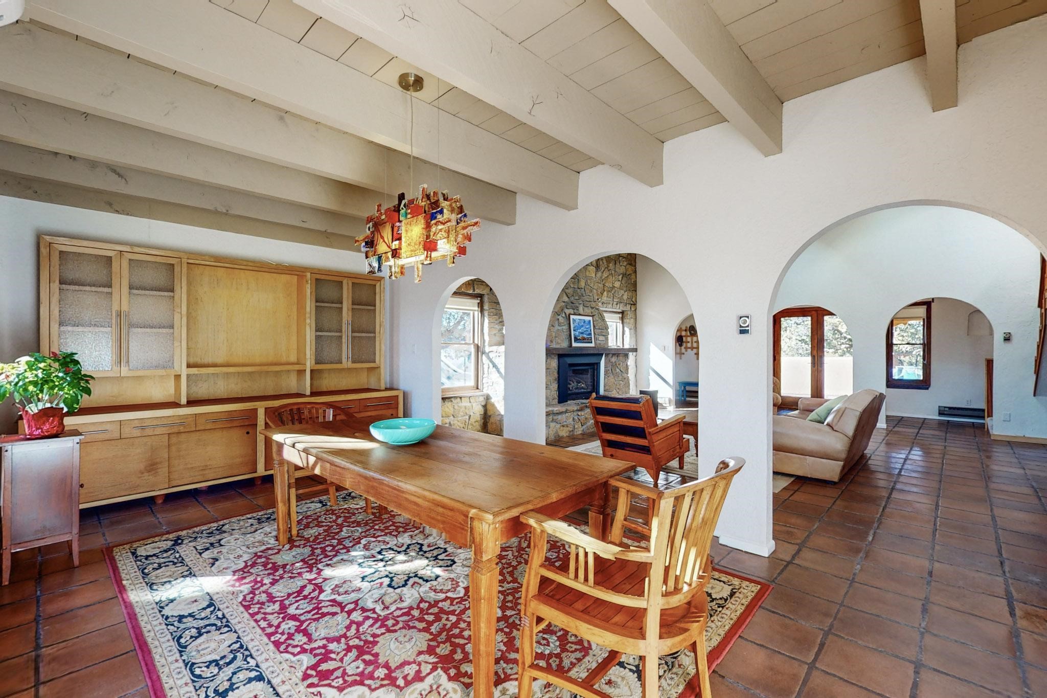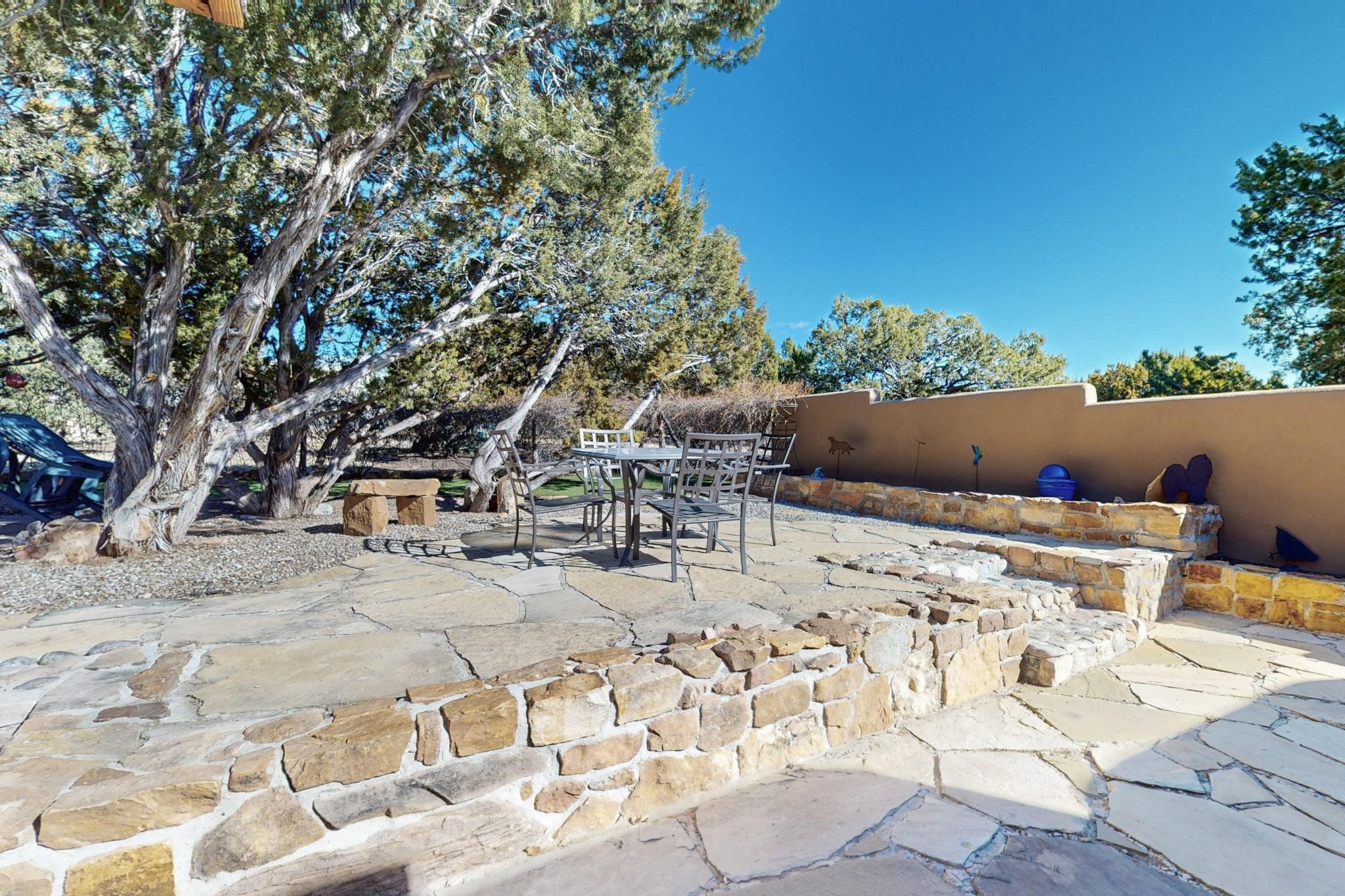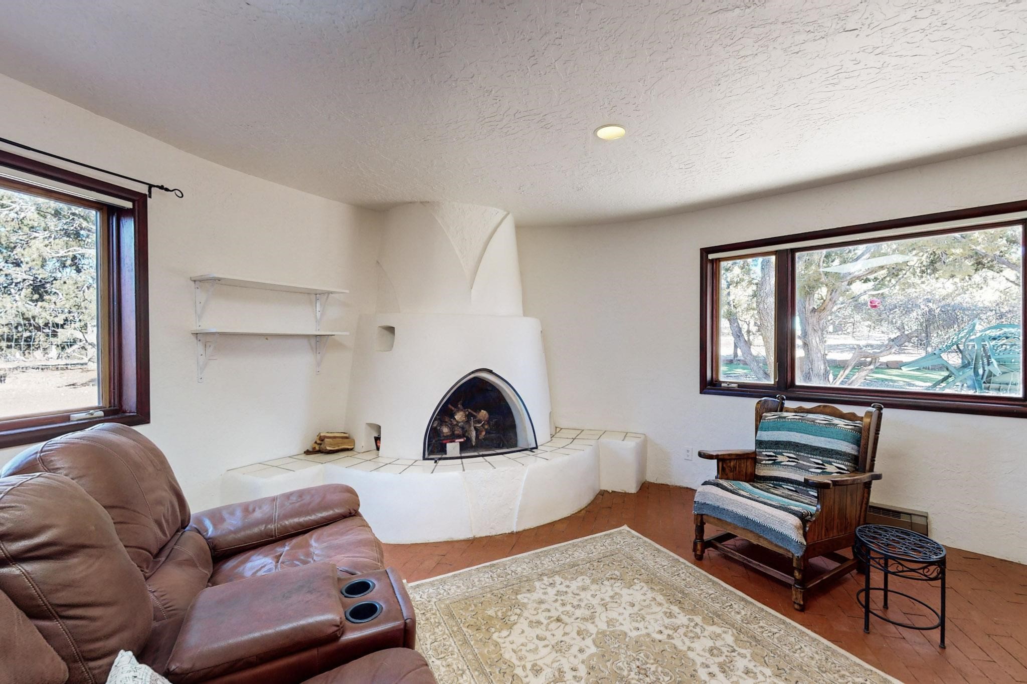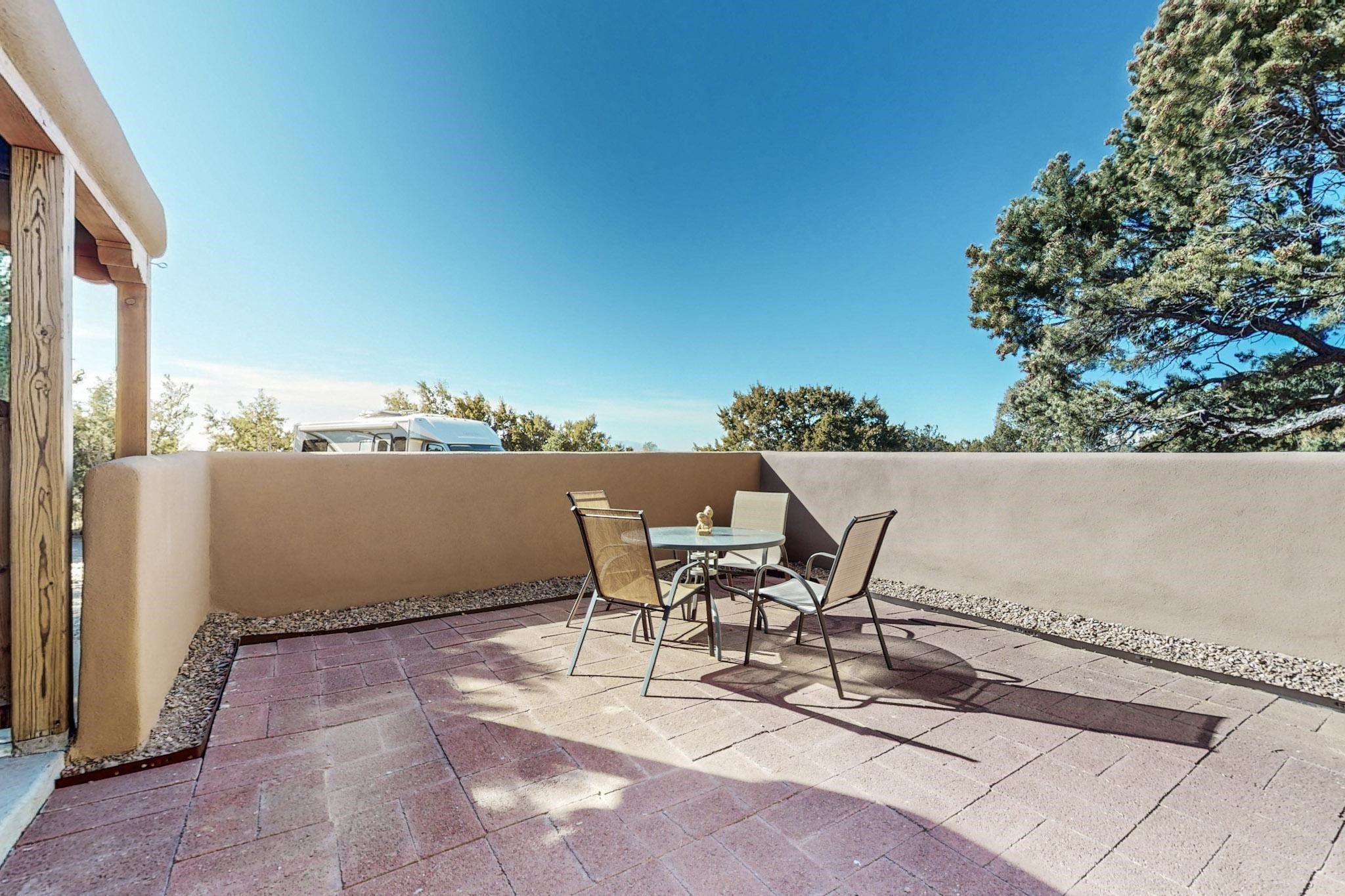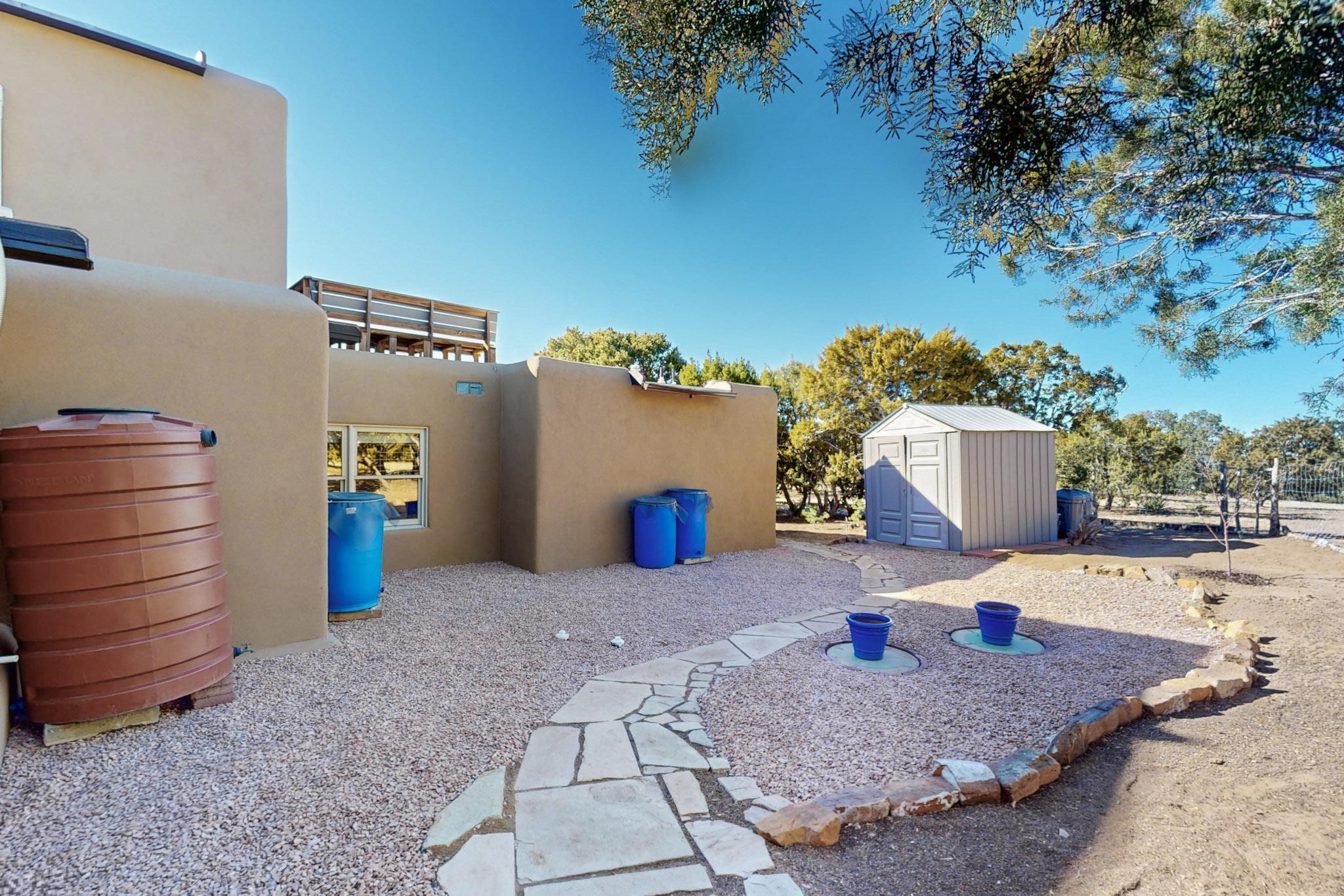 New roof, new stucco including the walls in 2023, new 4 Minisplits, a new total house filter system and new hot water heater in 2023. 22 owned solar panels seriously minimize the electric bills.On a cul de sac in a remarkably private setting stands this romantic pueblo/spanish style hacienda. If you saw it before, just wait til you see it now! Fabulously refreshed throughout this flexible 2 story floor plan accommodates 4 bedrooms, 4 baths. The owners suite and an extra bedroom are on the main floor with two additional guest bedrooms and bath upstairs. The large Kiva room has an additional office/den area and ideal for many purposes-studio, work, playroom or music. An ideal large entertainers kitchen with a central cooking island, large walk in pantry and separate laundry with sink. The dramatic great room with central massive stone gas fireplace flows to the elegant party dining room. There is a mountain view deck for sunsets and two private patios and garden. The 2 car garage is accessed by a paved driveway with loads of extra parking. Even the grounds have been carefully groomed against fire yet maintaining the rural wildlife refuge. Easy paved road access to both Eldorado amenities and local shopping and services, only minutes into Santa Fe. Wow, a must see!