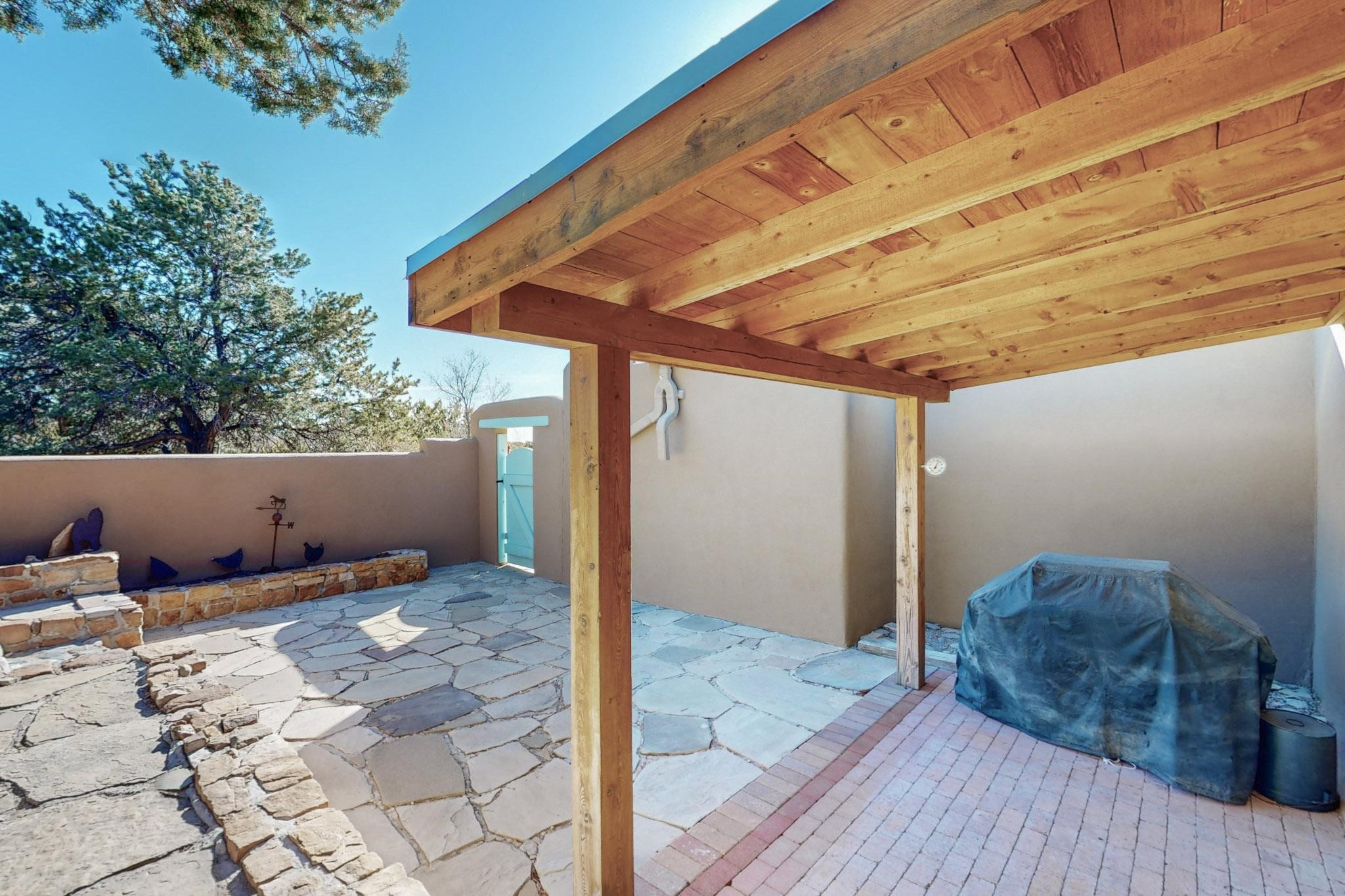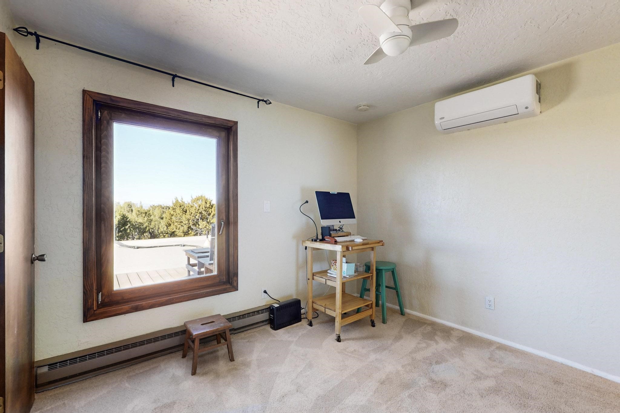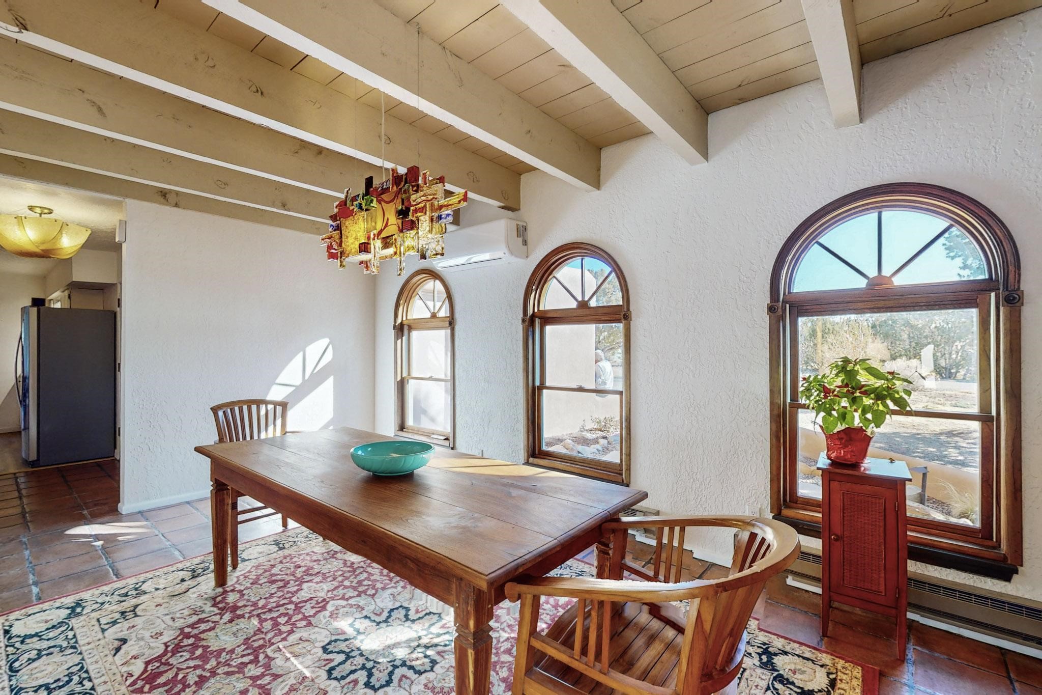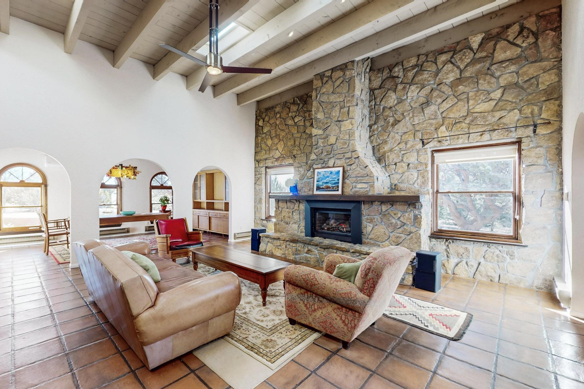 New roof, new stucco including the walls in 2023, new 4 Minisplits, a new total house filter system and new hot water heater in 2023. 22 owned solar panels seriously minimize the electric bills.On a cul de sac in a remarkably private setting stands this romantic pueblo/spanish style hacienda. If you saw it before, just wait til you see it now! Fabulously refreshed throughout this flexible 2 story floor plan accommodates 4 bedrooms, 4 baths. The owners suite and an extra bedroom are on the main floor with two additional guest bedrooms and bath upstairs. The large Kiva room has an additional office/den area and ideal for many purposes-studio, work, playroom or music. An ideal large entertainers kitchen with a central cooking island, large walk in pantry and separate laundry with sink. The dramatic great room with central massive stone gas fireplace flows to the elegant party dining room. There is a mountain view deck for sunsets and two private patios and garden. The 2 car garage is accessed by a paved driveway with loads of extra parking. Even the grounds have been carefully groomed against fire yet maintaining the rural wildlife refuge. Easy paved road access to both Eldorado amenities and local shopping and services, only minutes into Santa Fe. Wow, a must see!