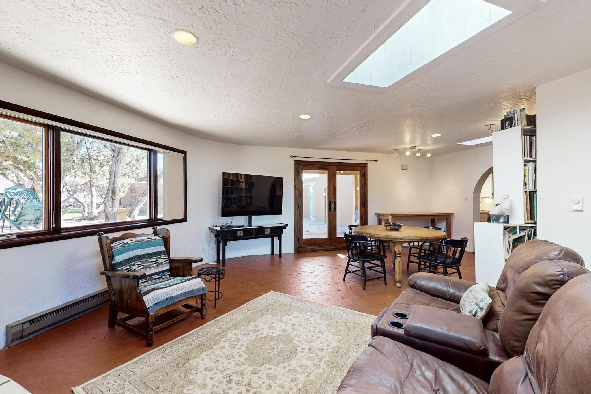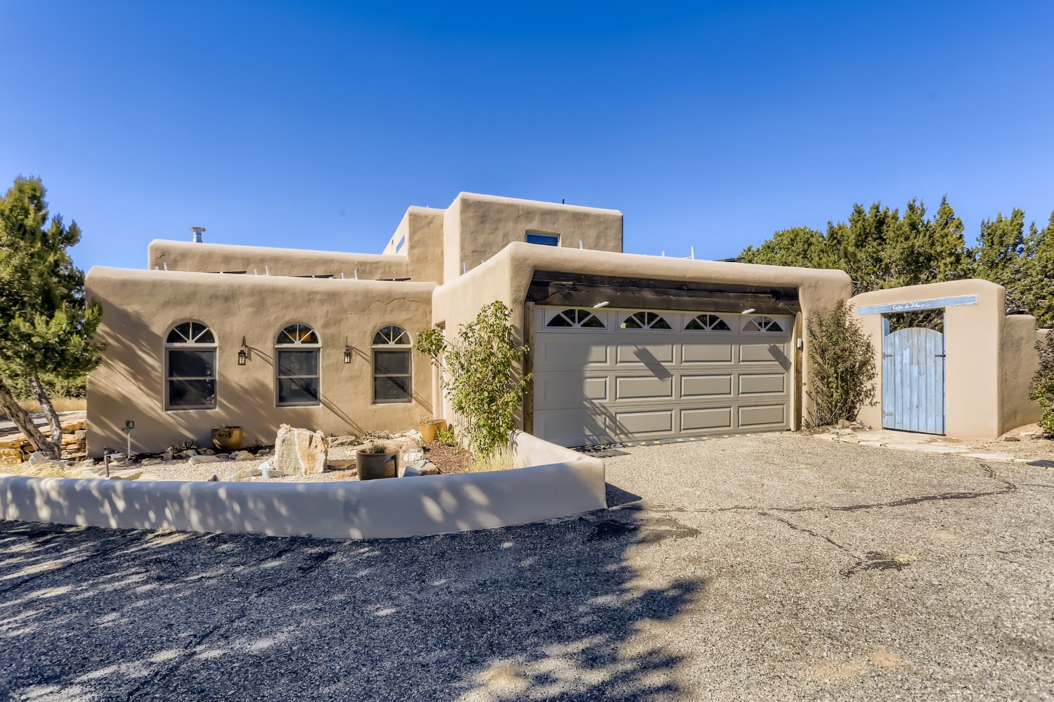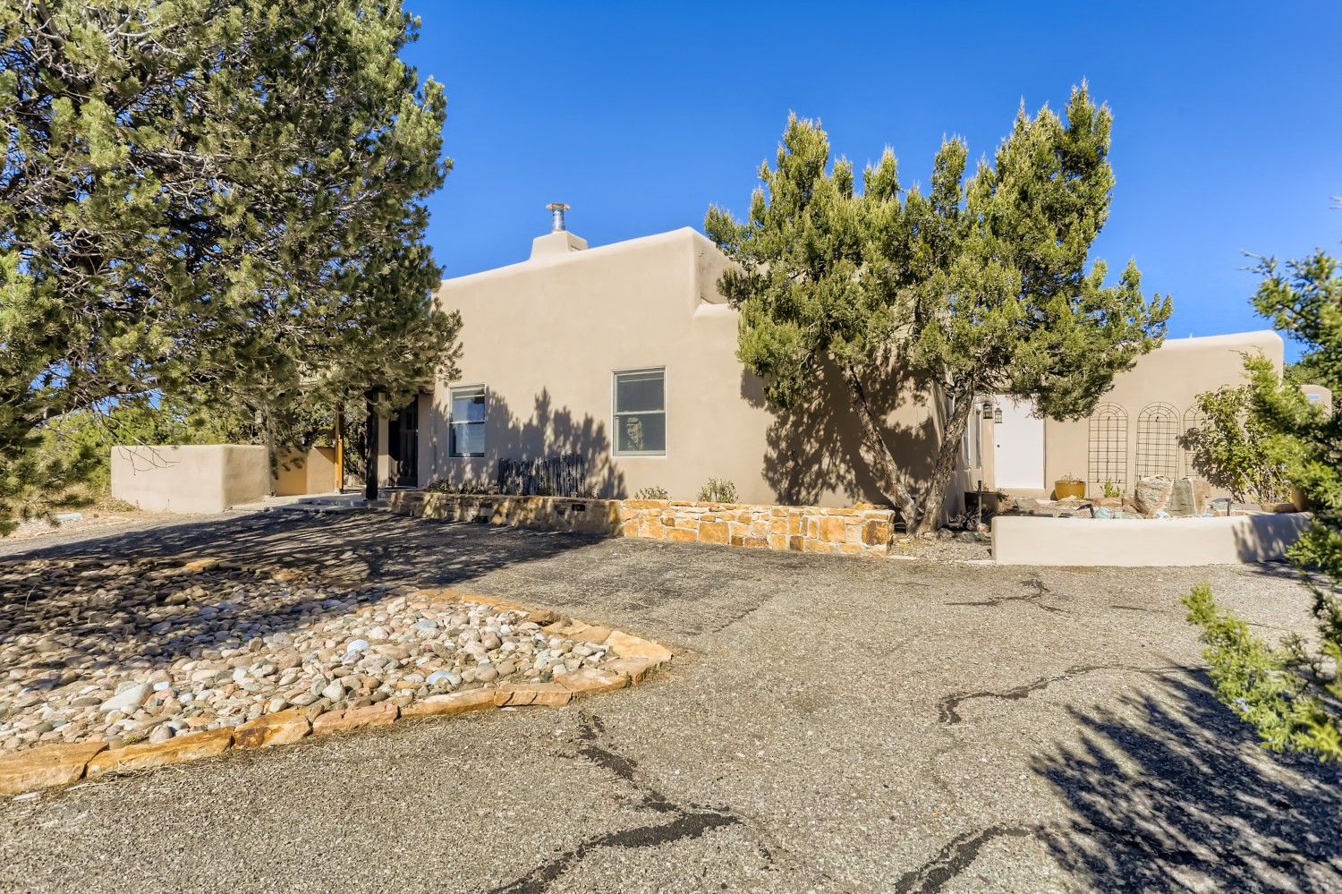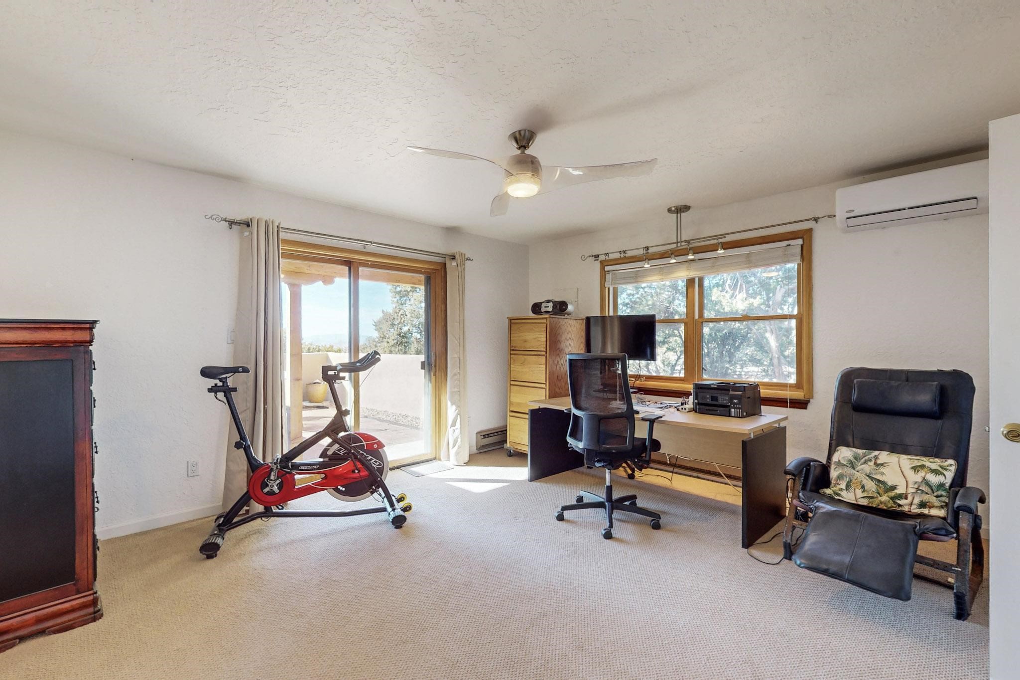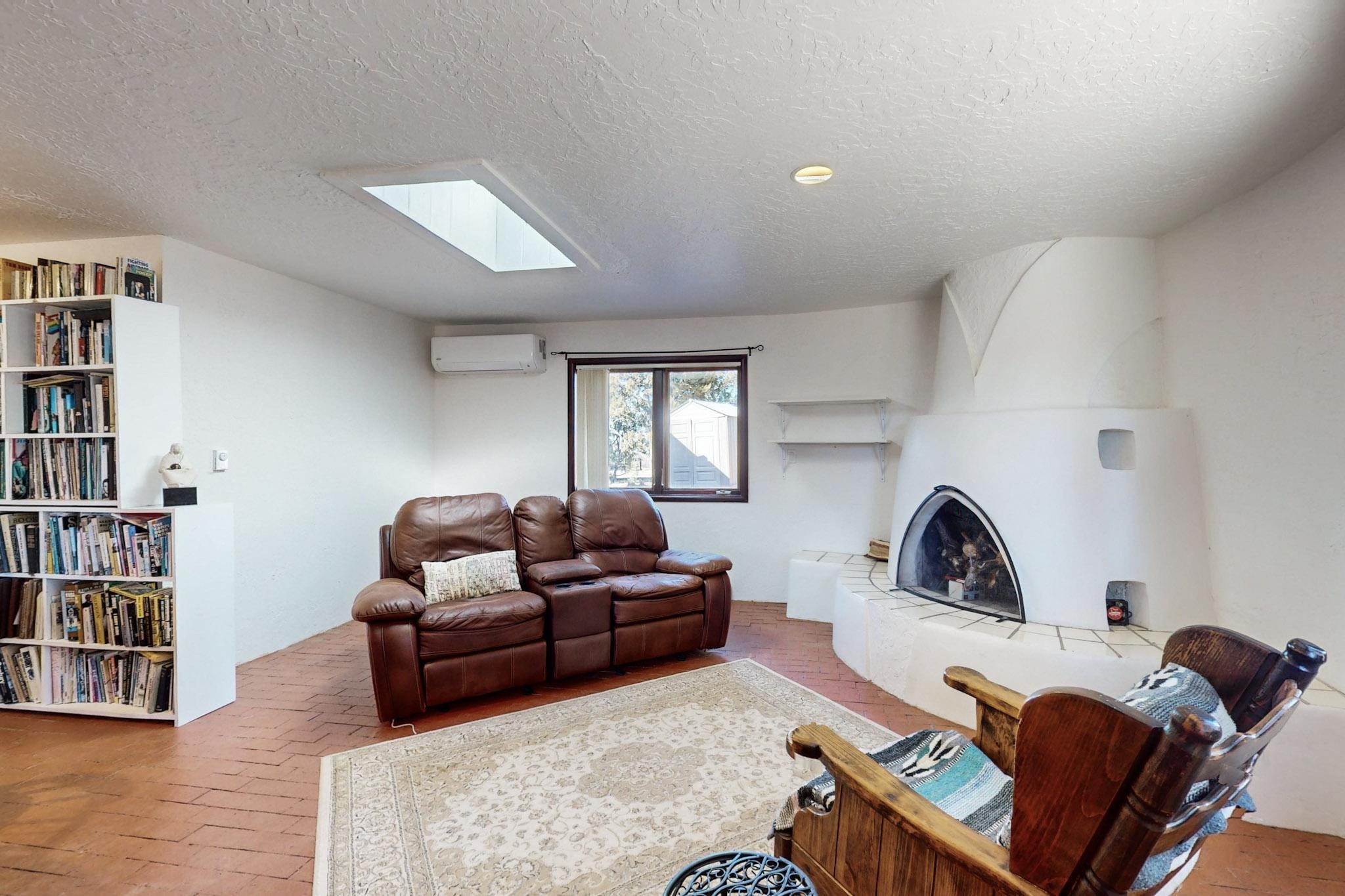 New roof, new stucco including the walls in 2023, new 4 Minisplits, a new total house filter system and new hot water heater in 2023. 22 owned solar panels seriously minimize the electric bills.On a cul de sac in a remarkably private setting stands this romantic pueblo/spanish style hacienda. If you saw it before, just wait til you see it now! Fabulously refreshed throughout this flexible 2 story floor plan accommodates 4 bedrooms, 4 baths. The owners suite and an extra bedroom are on the main floor with two additional guest bedrooms and bath upstairs. The large Kiva room has an additional office/den area and ideal for many purposes-studio, work, playroom or music. An ideal large entertainers kitchen with a central cooking island, large walk in pantry and separate laundry with sink. The dramatic great room with central massive stone gas fireplace flows to the elegant party dining room. There is a mountain view deck for sunsets and two private patios and garden. The 2 car garage is accessed by a paved driveway with loads of extra parking. Even the grounds have been carefully groomed against fire yet maintaining the rural wildlife refuge. Easy paved road access to both Eldorado amenities and local shopping and services, only minutes into Santa Fe. Wow, a must see!