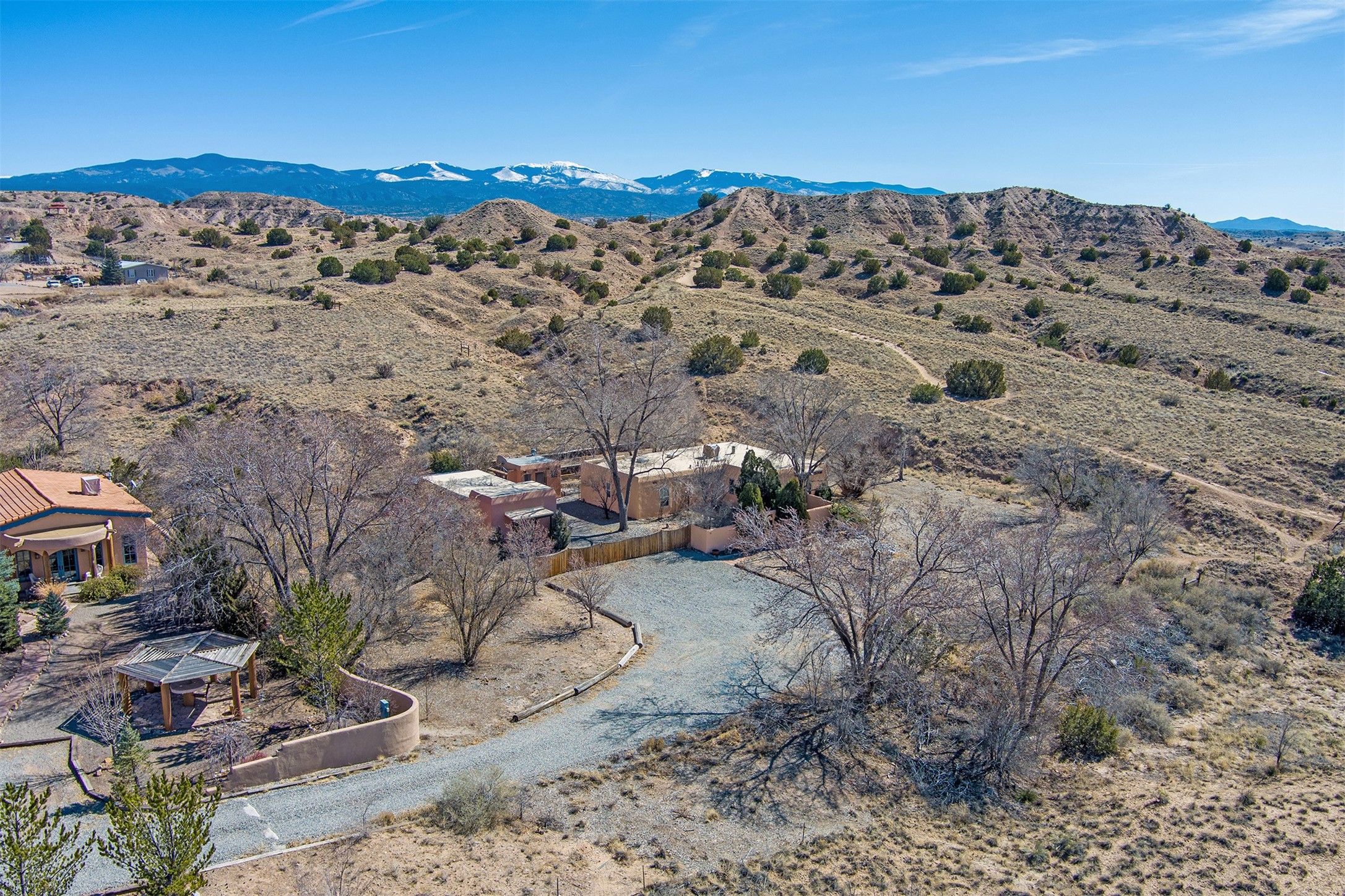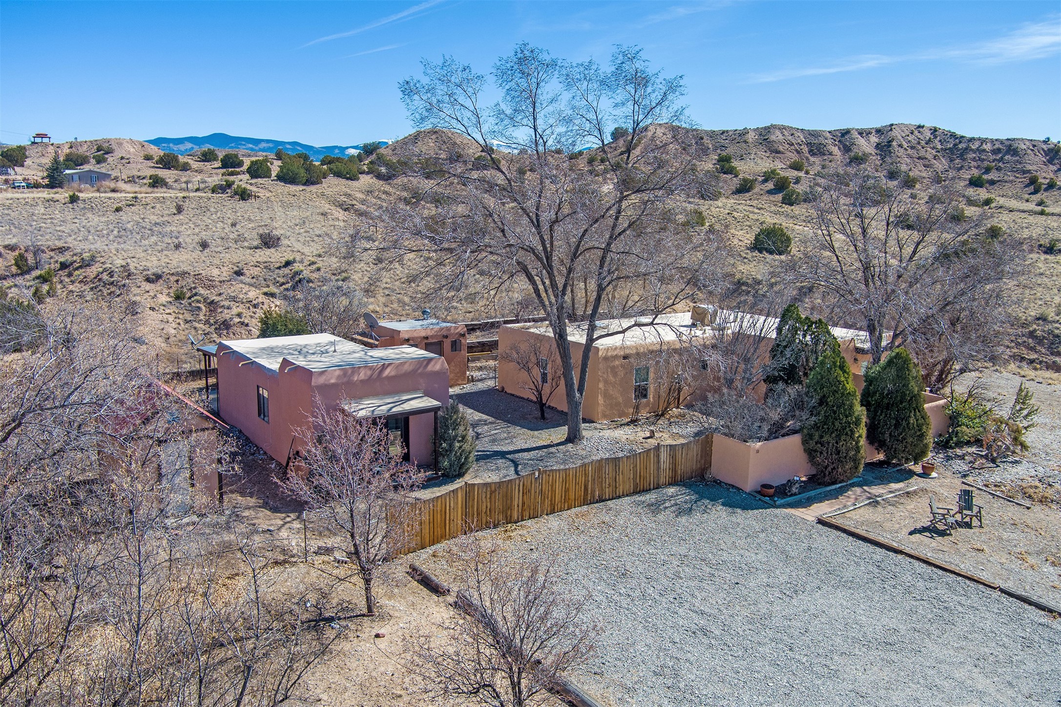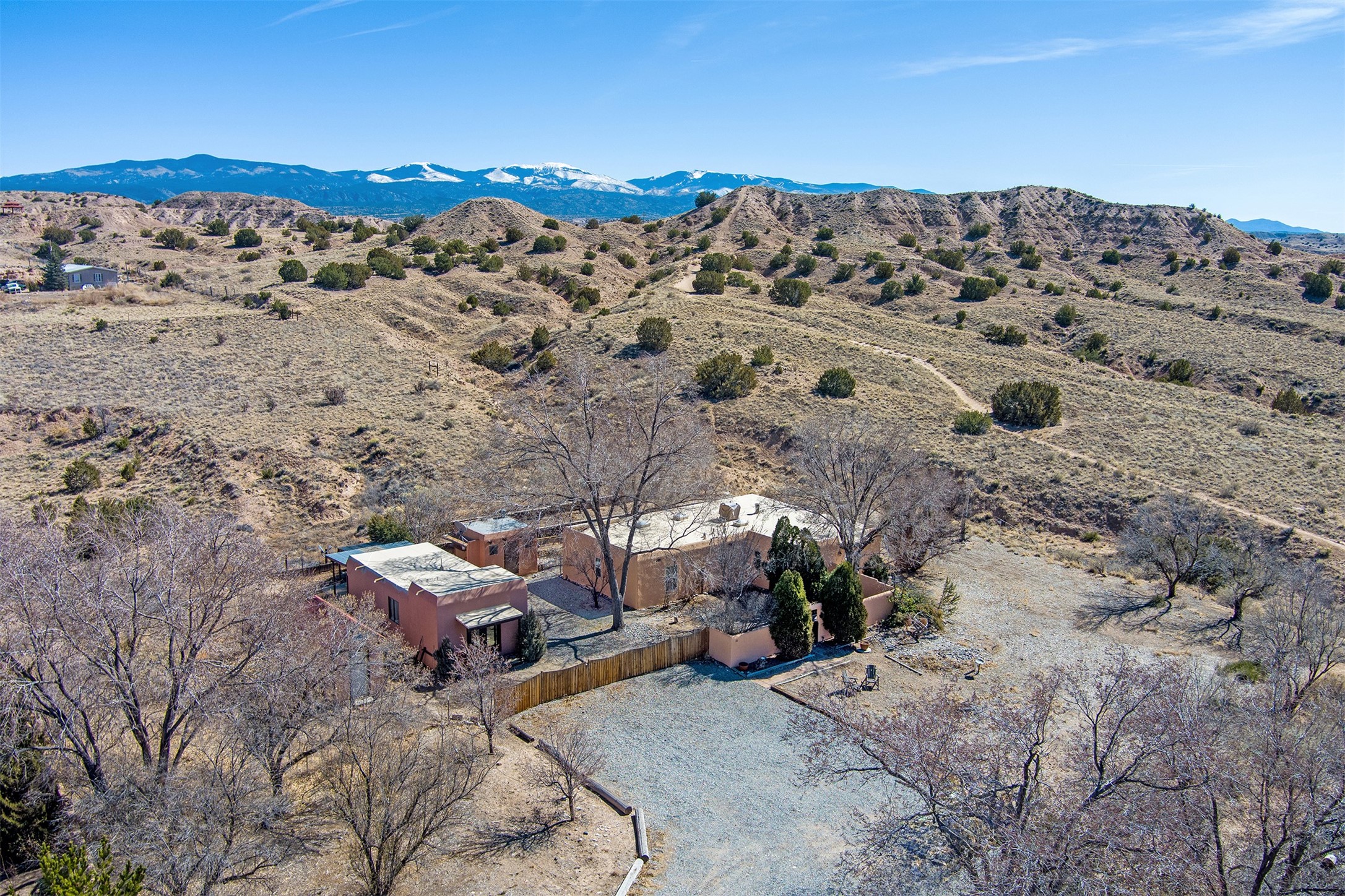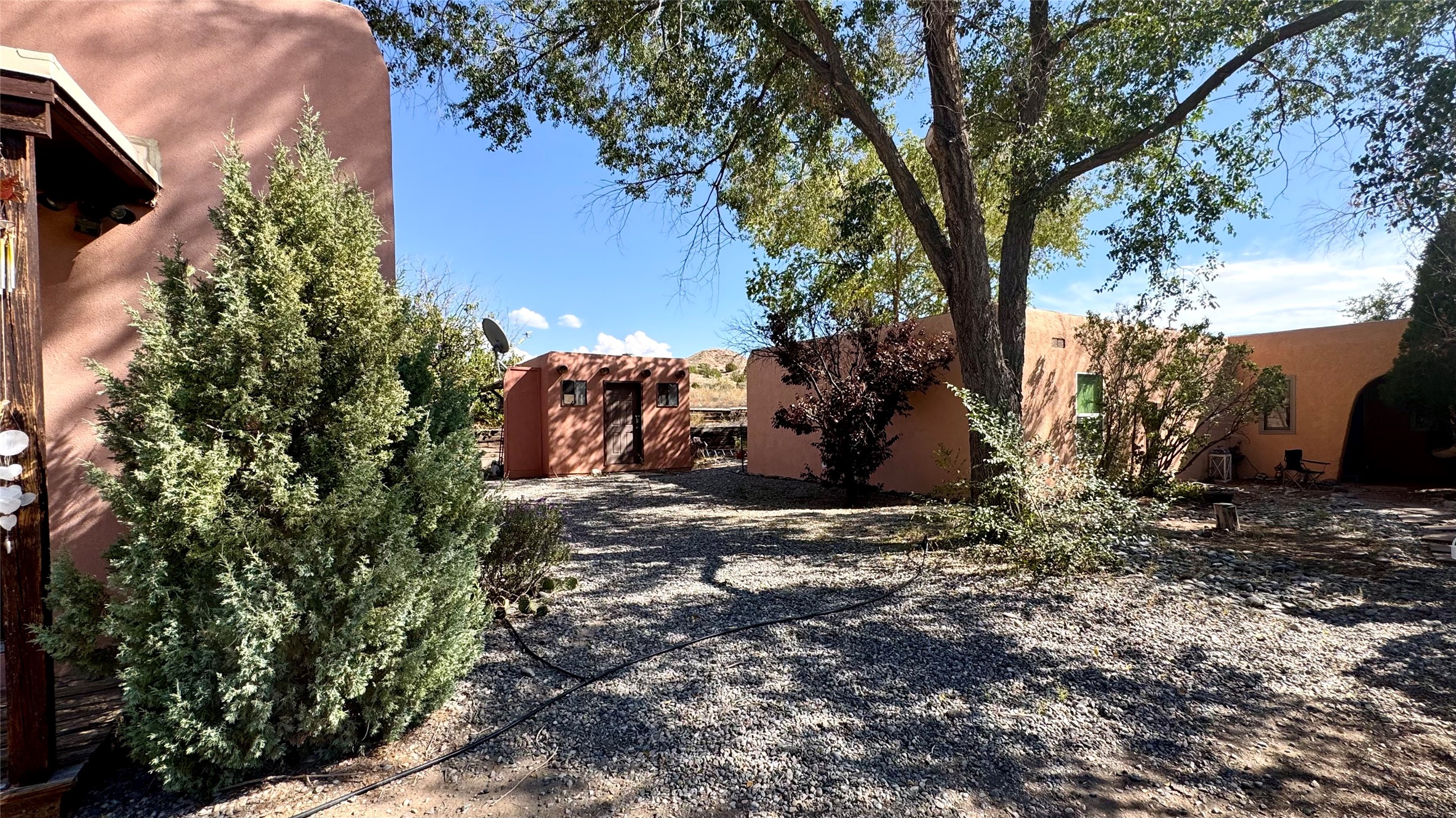 This charming, well-maintained, bright and airy Pueblo-style home is move-in ready and offers a unique blend of tranquility and modern upgrades. Nestled at the end of a private driveway, this 3-bedroom, 2-bath main house comes with a detached 1-bedroom, 1-bath casita, providing privacy and flexibility for guests or potential rental income. Surrounded on two sides by a 600-acre wildlife preserve, the home offers a peaceful retreat with stunning Jemez Mountain views and direct access to miles of hiking trails. Despite its serene setting, it is conveniently located just 20 miles from Santa Fe and Los Alamos.The main house has been thoughtfully updated in 2022 with a new TPO roof, elastomeric stucco painting, a new evaporative cooler, new Andersen windows with stylish new window treatments, a new soapstone wood stove for cozy winter nights, new wood laminate flooring in the living room, and newer carpeting in the bedrooms. Skylights in each bedroom enhance the natural light, creating a warm and inviting atmosphere.The detached casita, approximately 600 square feet, features high ceilings, a private patio, and a fresh modern feel. Recent updates include a new TPO roof, new windows, new wood laminate flooring, and fresh paint, making it a perfect retreat for guests, a rental, or a studio space.Between the main house and the casita, a small detached studio (approximately 120 sq. ft.) offers endless possibilities as a home office, yoga space, or artist's studio. While this unheated building with 220 electric is not included in the total square footage, it adds valuable flexible space.The enclosed courtyard is landscaped with mature trees that provide refreshing summer shade, while the low-maintenance design ensures easy upkeep. Additionally, an insulated storage shed provides extra space for tools and outdoor gear.Offering a rare combination of privacy, stunning natural surroundings, and modern updates, this peaceful oasis is the perfect place to call home.