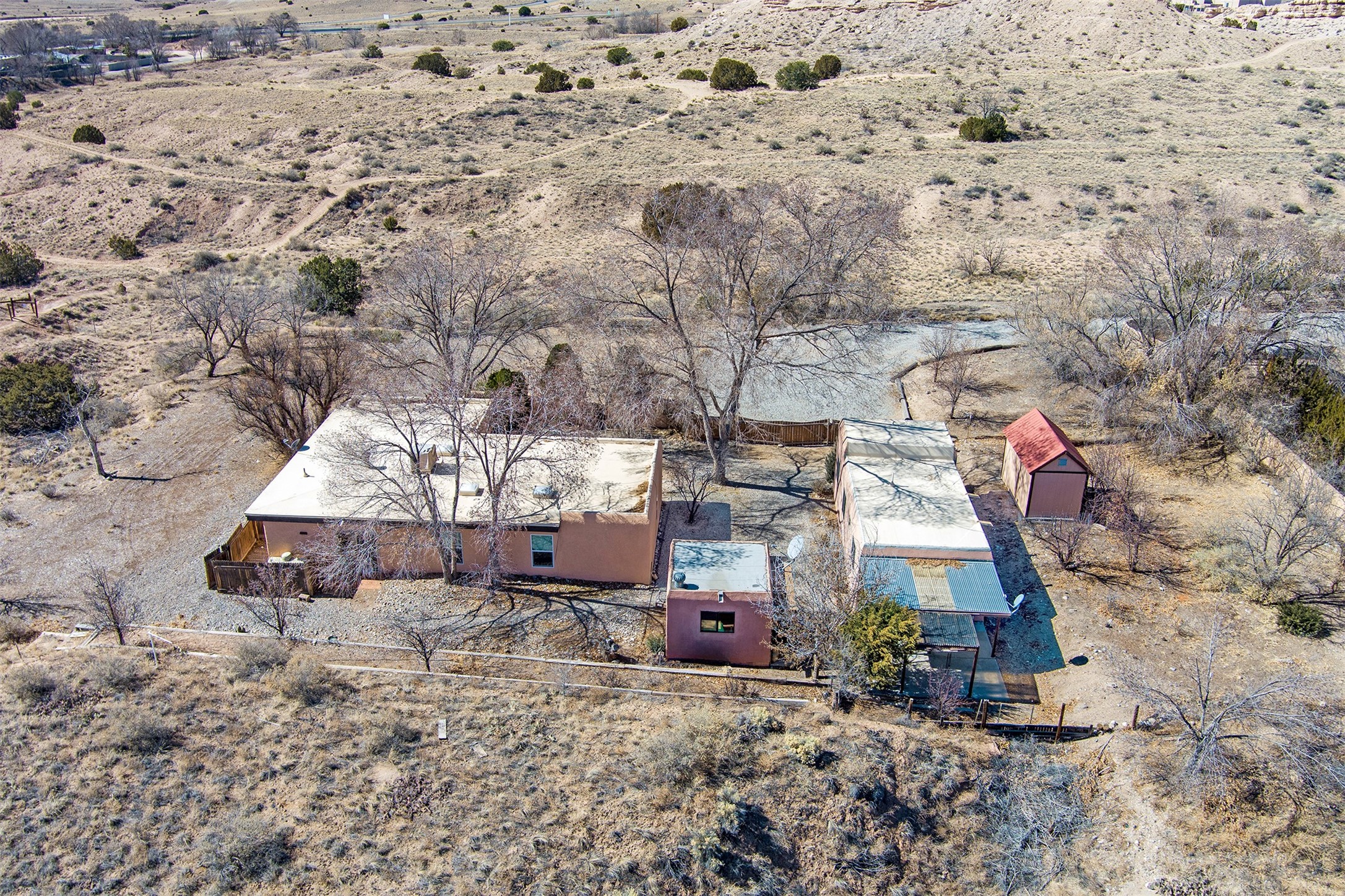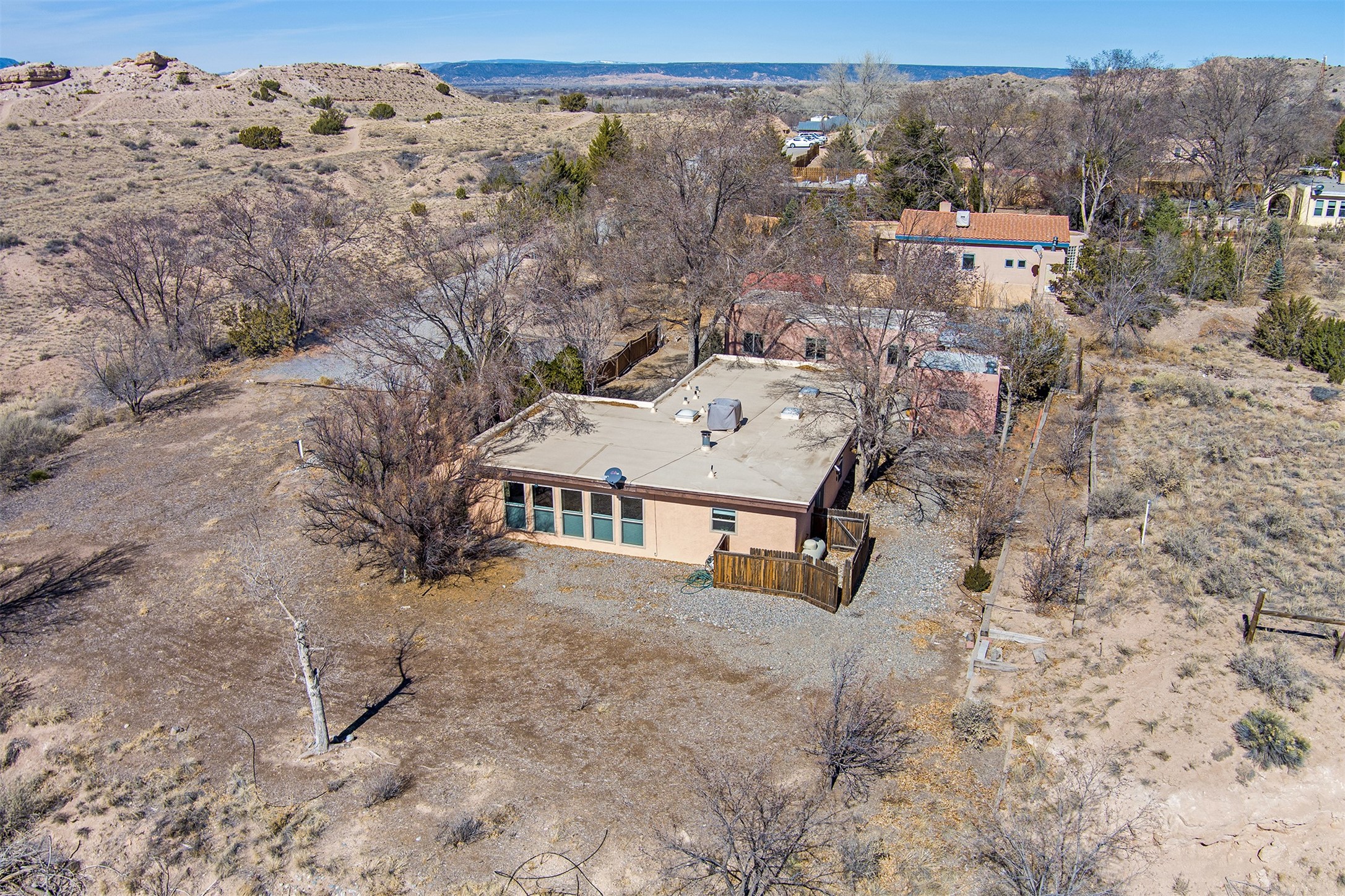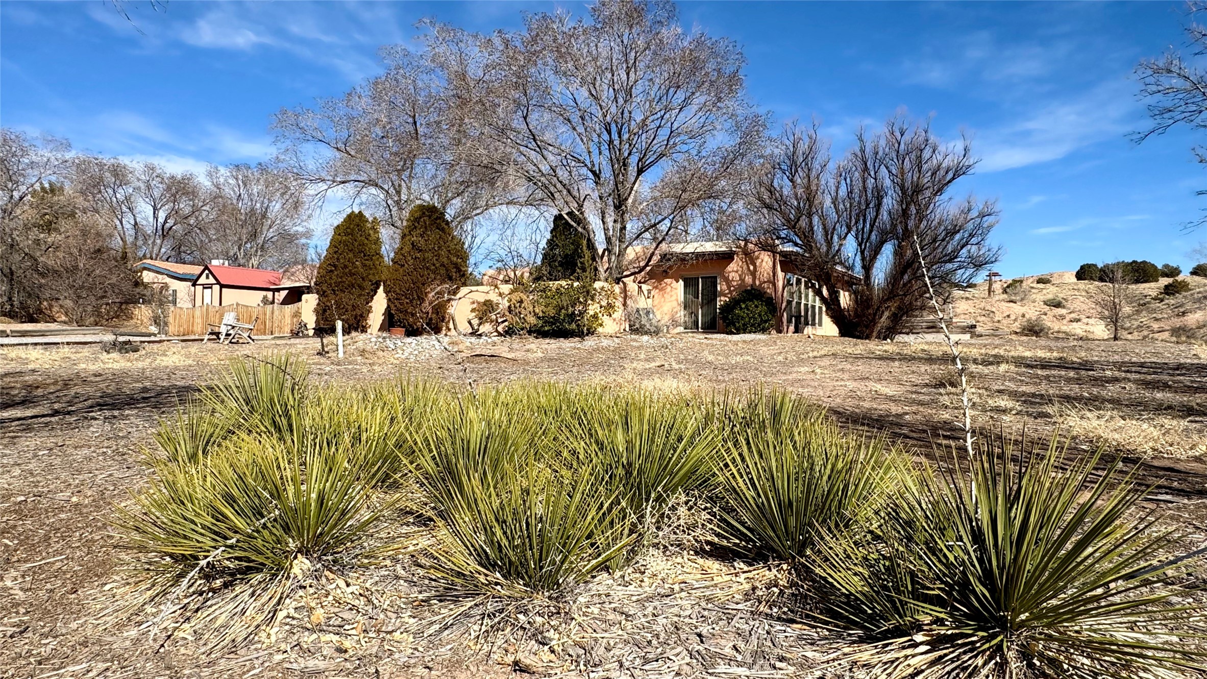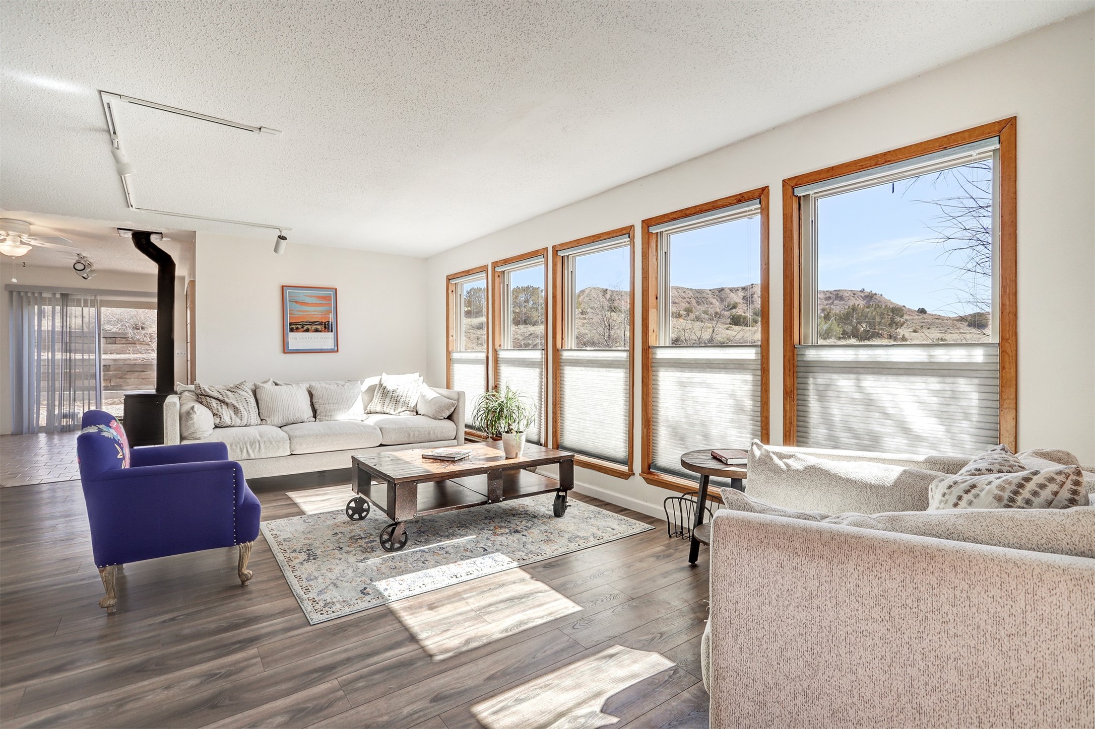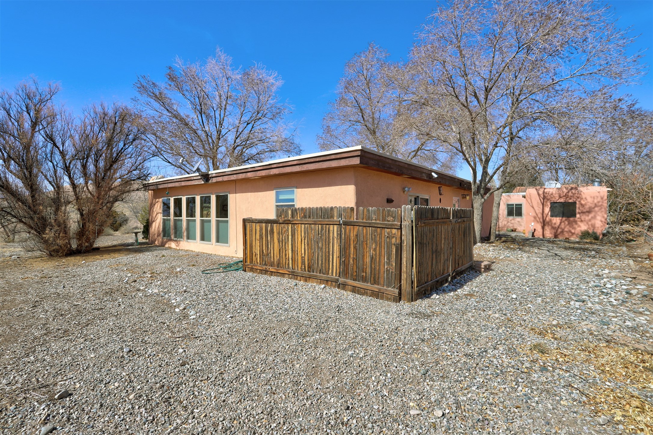 This charming, well-maintained, bright and airy Pueblo-style home is move-in ready and offers a unique blend of tranquility and modern upgrades. Nestled at the end of a private driveway, this 3-bedroom, 2-bath main house comes with a detached 1-bedroom, 1-bath casita, providing privacy and flexibility for guests or potential rental income. Surrounded on two sides by a 600-acre wildlife preserve, the home offers a peaceful retreat with stunning Jemez Mountain views and direct access to miles of hiking trails. Despite its serene setting, it is conveniently located just 20 miles from Santa Fe and Los Alamos.The main house has been thoughtfully updated in 2022 with a new TPO roof, elastomeric stucco painting, a new evaporative cooler, new Andersen windows with stylish new window treatments, a new soapstone wood stove for cozy winter nights, new wood laminate flooring in the living room, and newer carpeting in the bedrooms. Skylights in each bedroom enhance the natural light, creating a warm and inviting atmosphere.The detached casita, approximately 600 square feet, features high ceilings, a private patio, and a fresh modern feel. Recent updates include a new TPO roof, new windows, new wood laminate flooring, and fresh paint, making it a perfect retreat for guests, a rental, or a studio space.Between the main house and the casita, a small detached studio (approximately 120 sq. ft.) offers endless possibilities as a home office, yoga space, or artist's studio. While this unheated building with 220 electric is not included in the total square footage, it adds valuable flexible space.The enclosed courtyard is landscaped with mature trees that provide refreshing summer shade, while the low-maintenance design ensures easy upkeep. Additionally, an insulated storage shed provides extra space for tools and outdoor gear.Offering a rare combination of privacy, stunning natural surroundings, and modern updates, this peaceful oasis is the perfect place to call home.