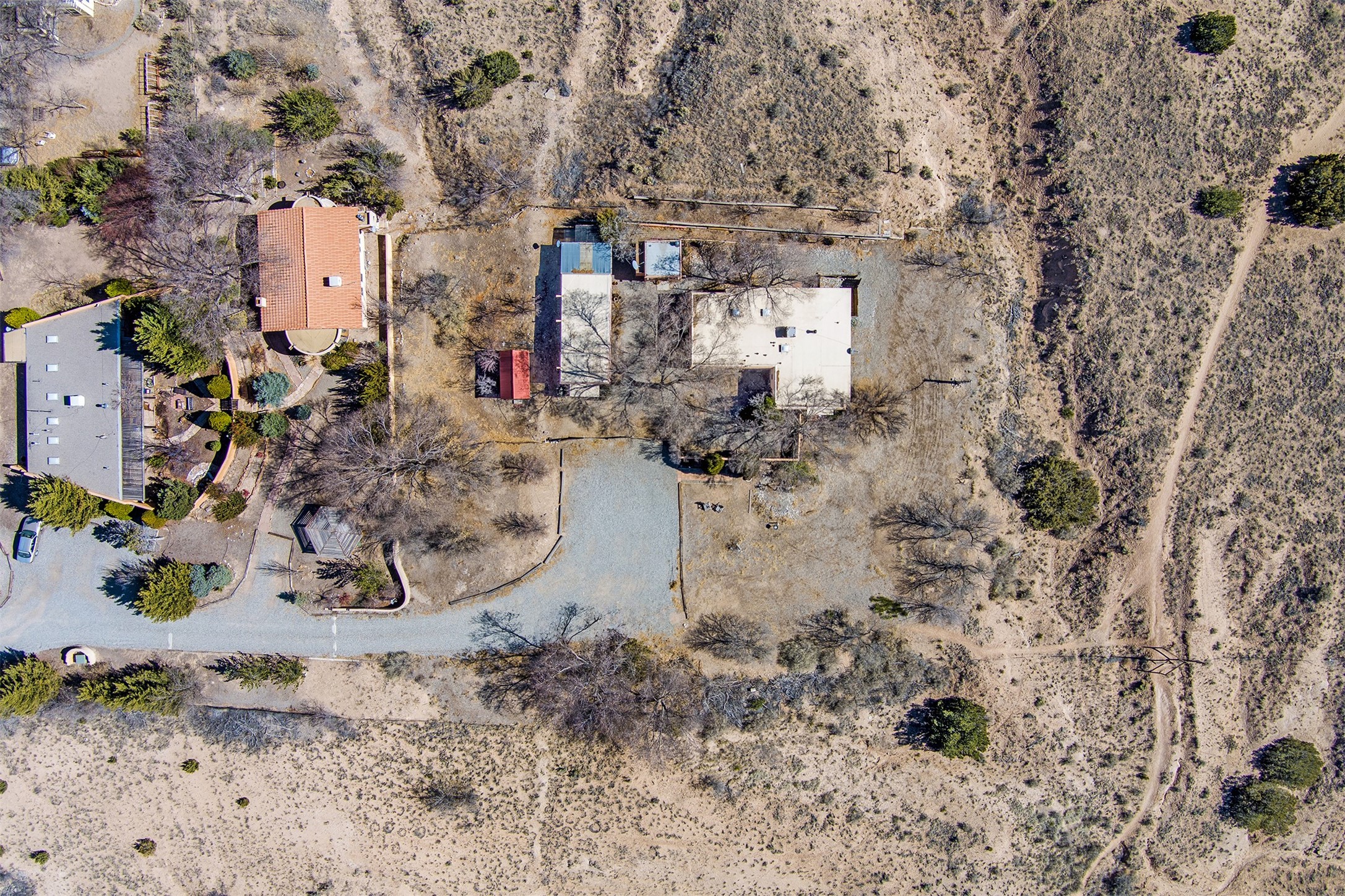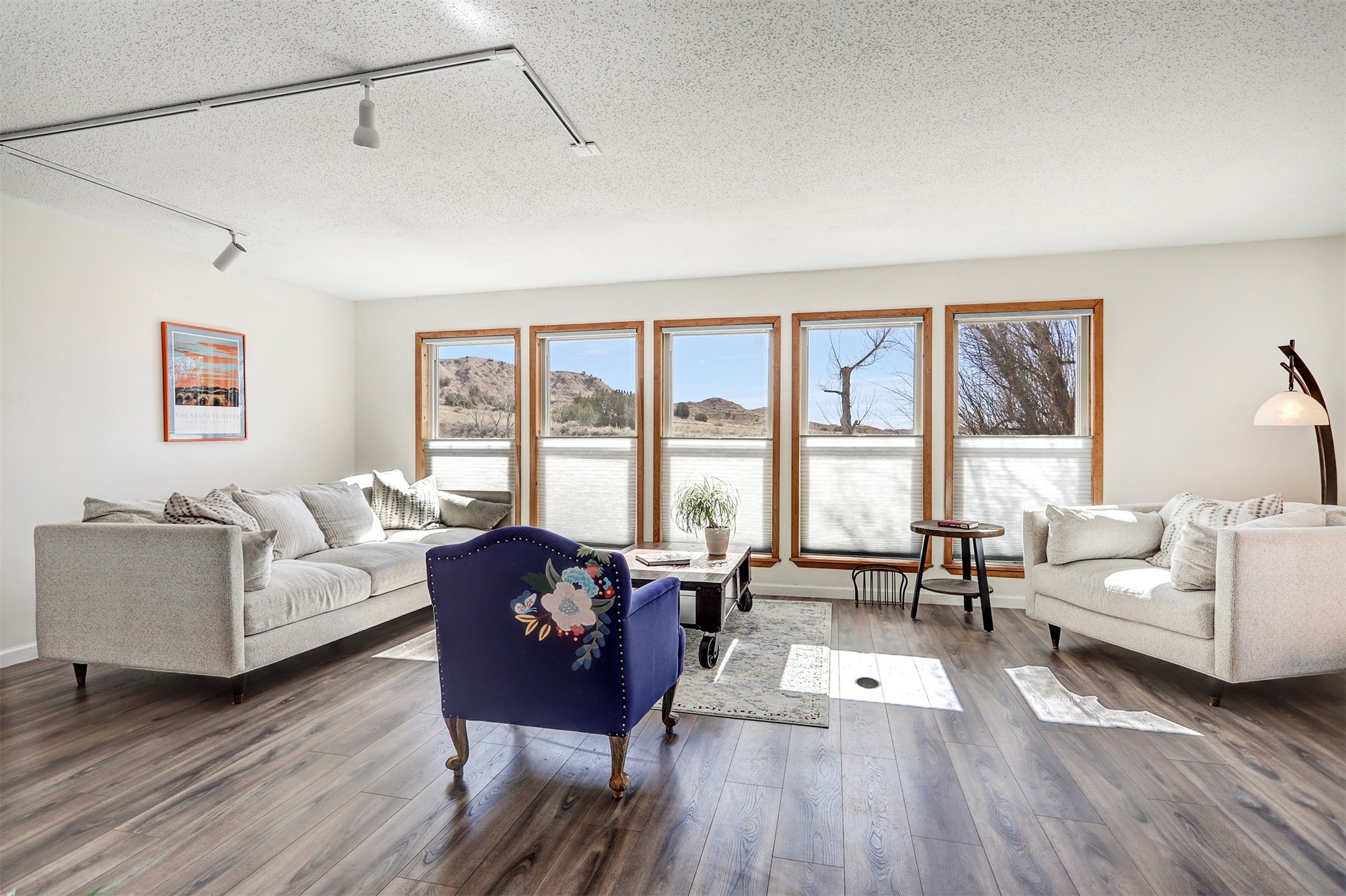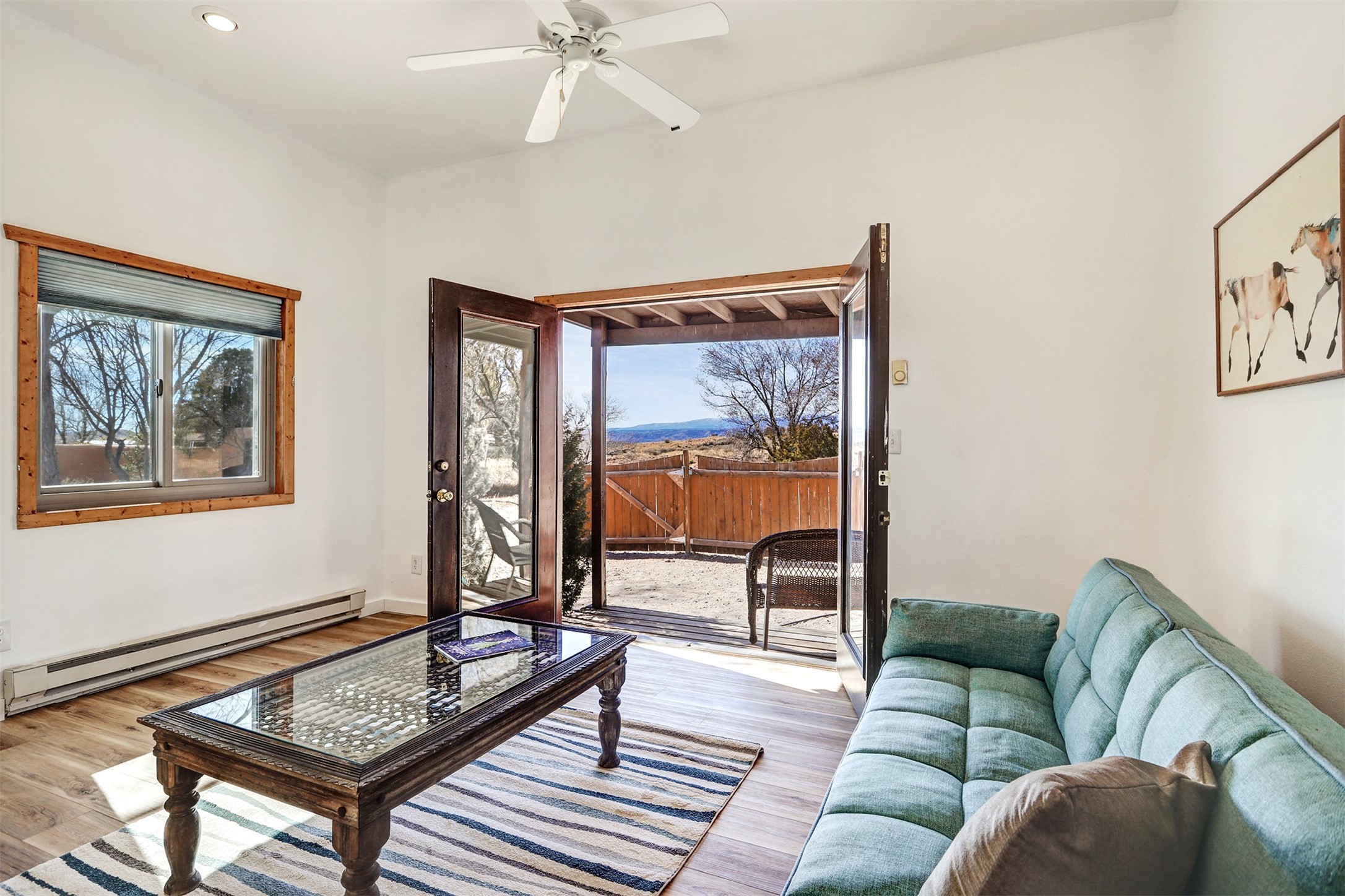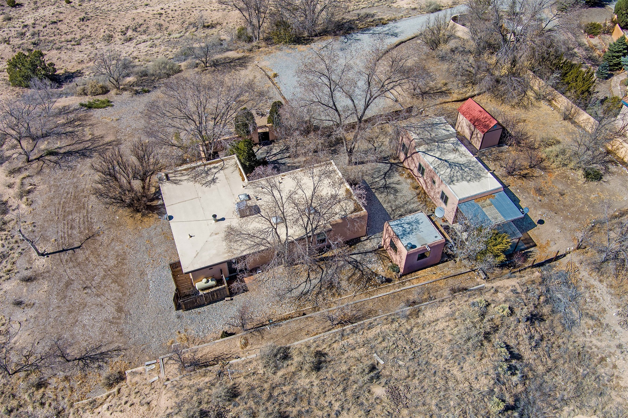 This charming, well-maintained, bright and airy Pueblo-style home is move-in ready and offers a unique blend of tranquility and modern upgrades. Nestled at the end of a private driveway, this 3-bedroom, 2-bath main house comes with a detached 1-bedroom, 1-bath casita, providing privacy and flexibility for guests or potential rental income. Surrounded on two sides by a 600-acre wildlife preserve, the home offers a peaceful retreat with stunning Jemez Mountain views and direct access to miles of hiking trails. Despite its serene setting, it is conveniently located just 20 miles from Santa Fe and Los Alamos.The main house has been thoughtfully updated in 2022 with a new TPO roof, elastomeric stucco painting, a new evaporative cooler, new Andersen windows with stylish new window treatments, a new soapstone wood stove for cozy winter nights, new wood laminate flooring in the living room, and newer carpeting in the bedrooms. Skylights in each bedroom enhance the natural light, creating a warm and inviting atmosphere.The detached casita, approximately 600 square feet, features high ceilings, a private patio, and a fresh modern feel. Recent updates include a new TPO roof, new windows, new wood laminate flooring, and fresh paint, making it a perfect retreat for guests, a rental, or a studio space.Between the main house and the casita, a small detached studio (approximately 120 sq. ft.) offers endless possibilities as a home office, yoga space, or artist's studio. While this unheated building with 220 electric is not included in the total square footage, it adds valuable flexible space.The enclosed courtyard is landscaped with mature trees that provide refreshing summer shade, while the low-maintenance design ensures easy upkeep. Additionally, an insulated storage shed provides extra space for tools and outdoor gear.Offering a rare combination of privacy, stunning natural surroundings, and modern updates, this peaceful oasis is the perfect place to call home.