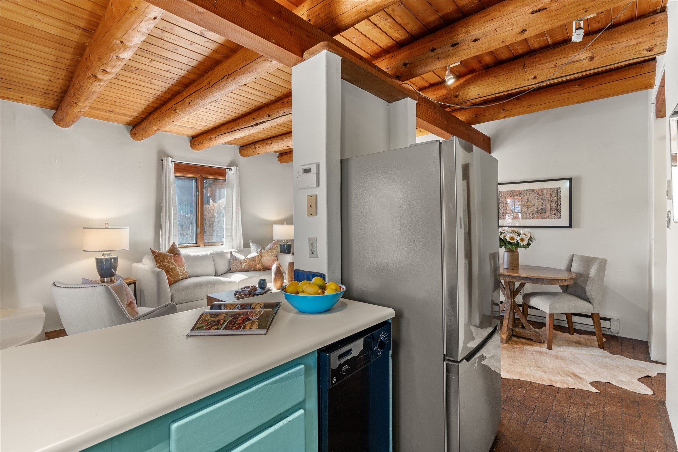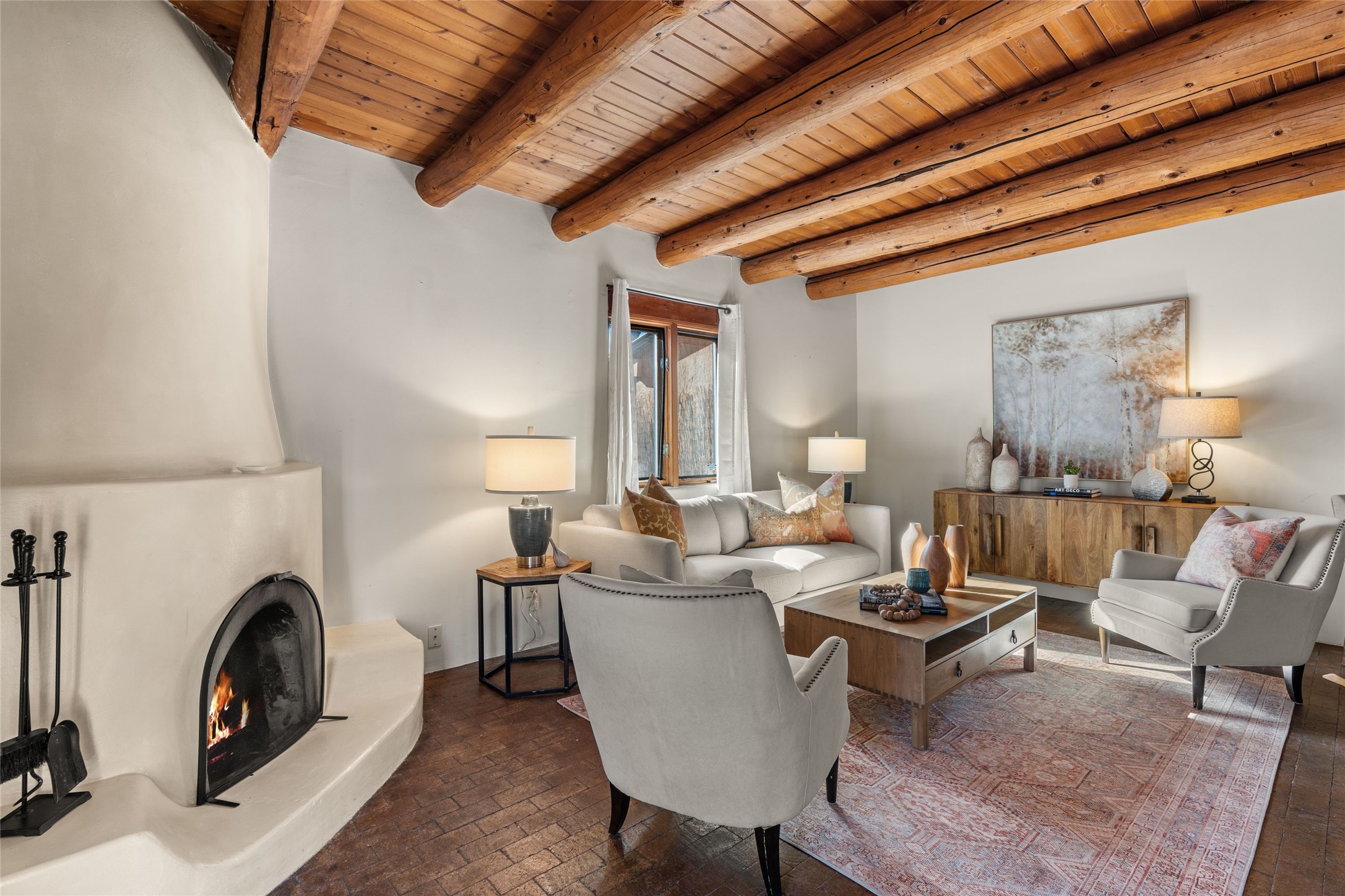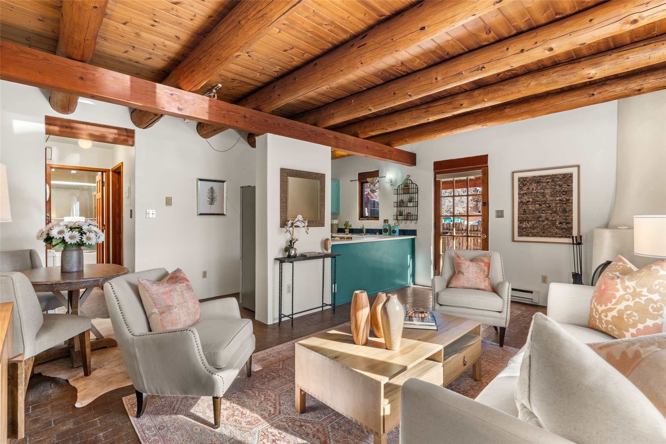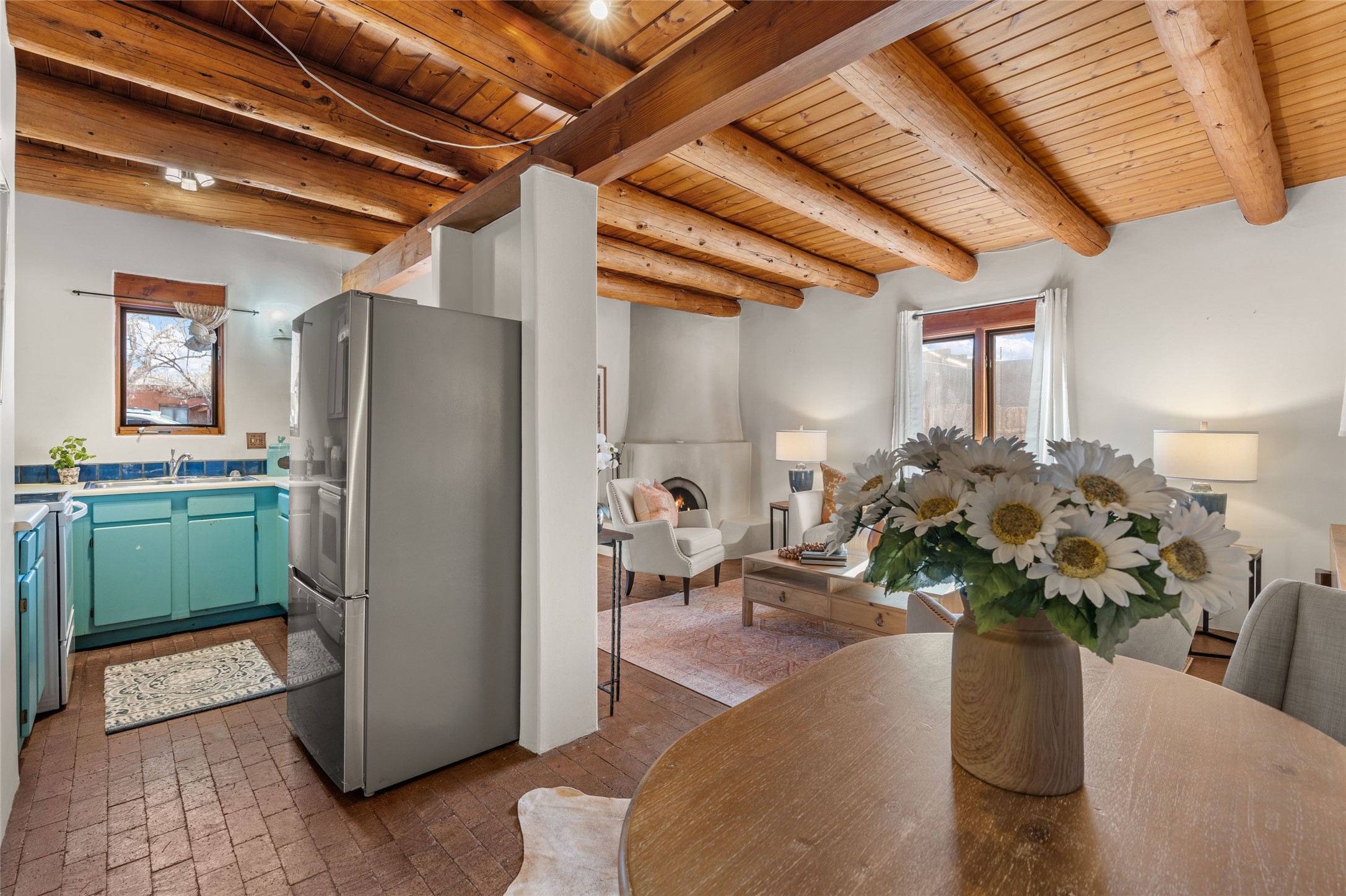 Experience the charm and convenience of this cozy one-bedroom, one-bathroom home located in a prime location, just steps away from vibrant restaurants, shopping, Santa Fe Railyard, and the downtown plaza. Built in 1987, this traditional-style gem features an open floor plan with approximately 589 sq. ft. of living space. Highlights include a kiva wood-burning fireplace in the living area, perfect for cozy evenings, and timeless brick floors that add character throughout. The property also offers designated parking for your convenience and a small fenced yard--a peaceful retreat in the heart of the city. This delightful home blends traditional charm with modern accessibility, making it a perfect sanctuary close to everything Santa Fe has to offer.