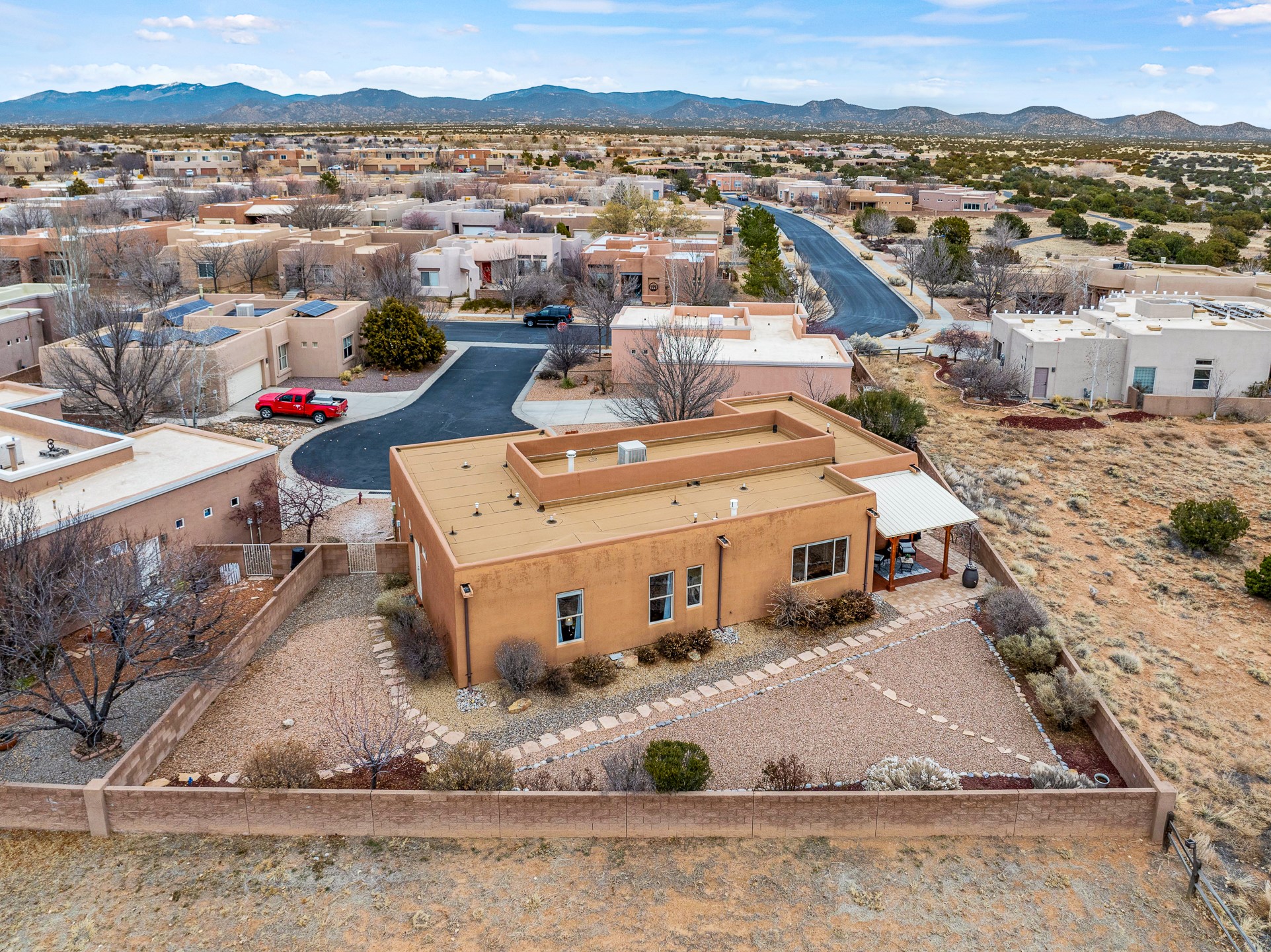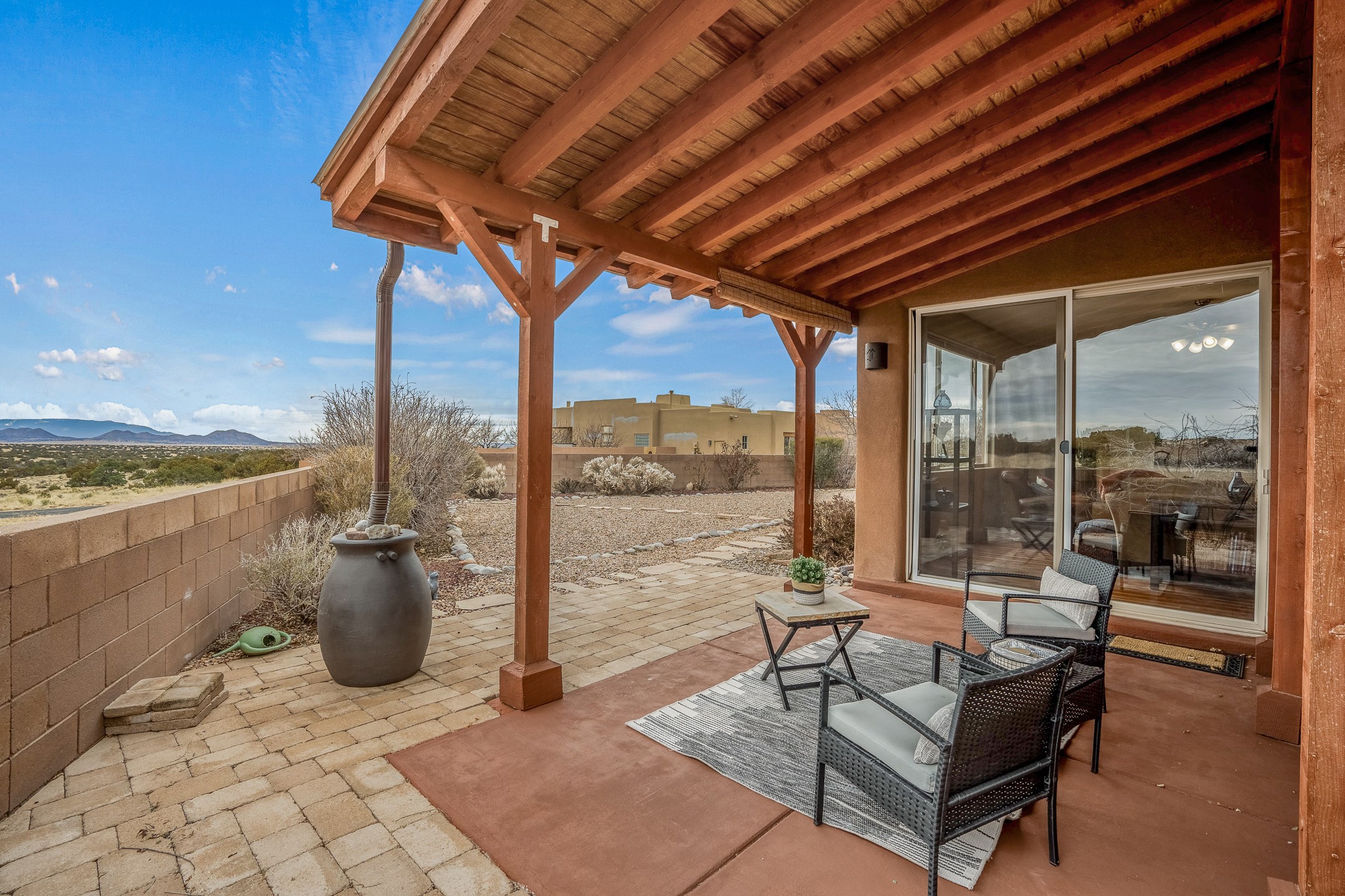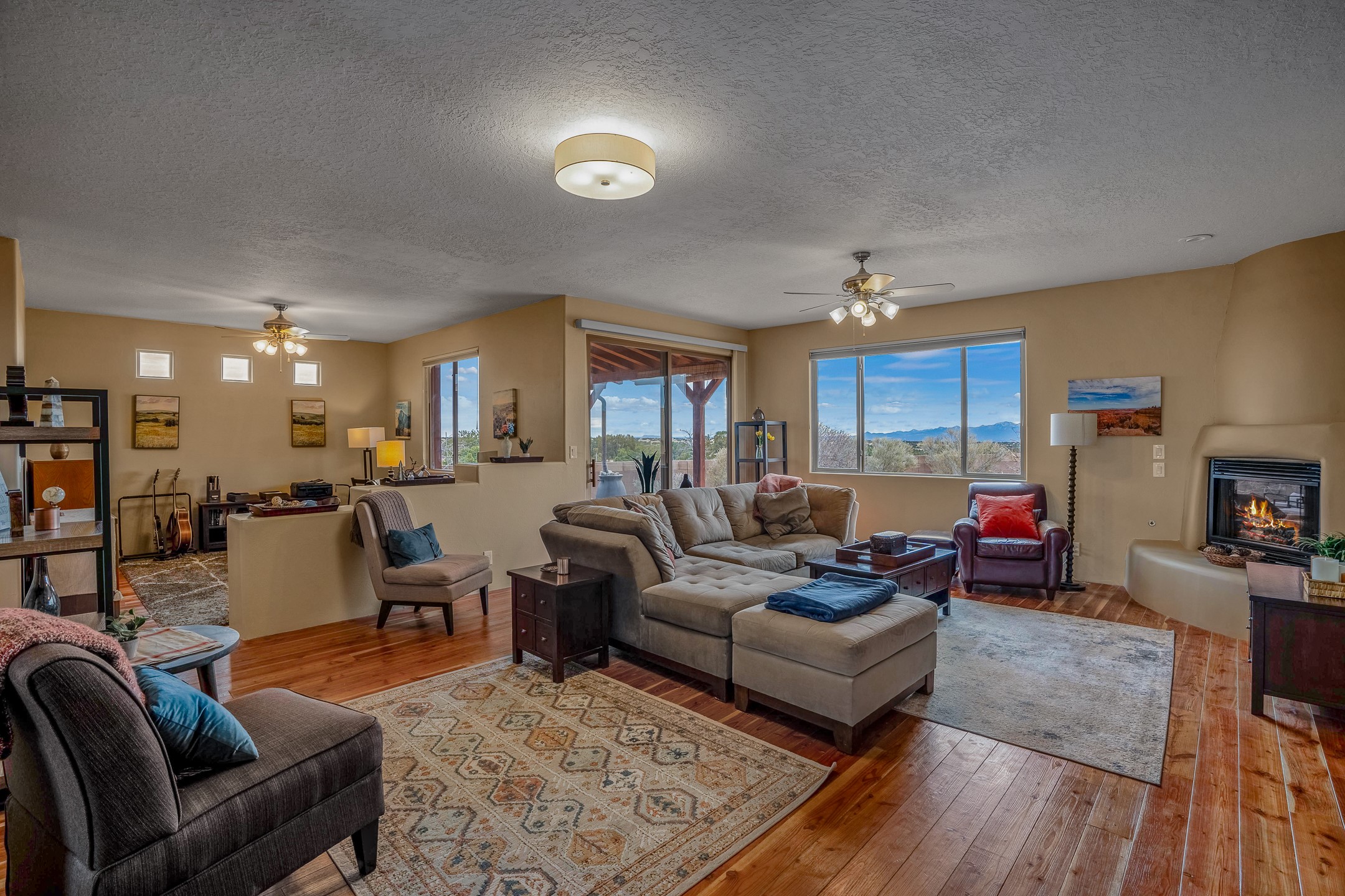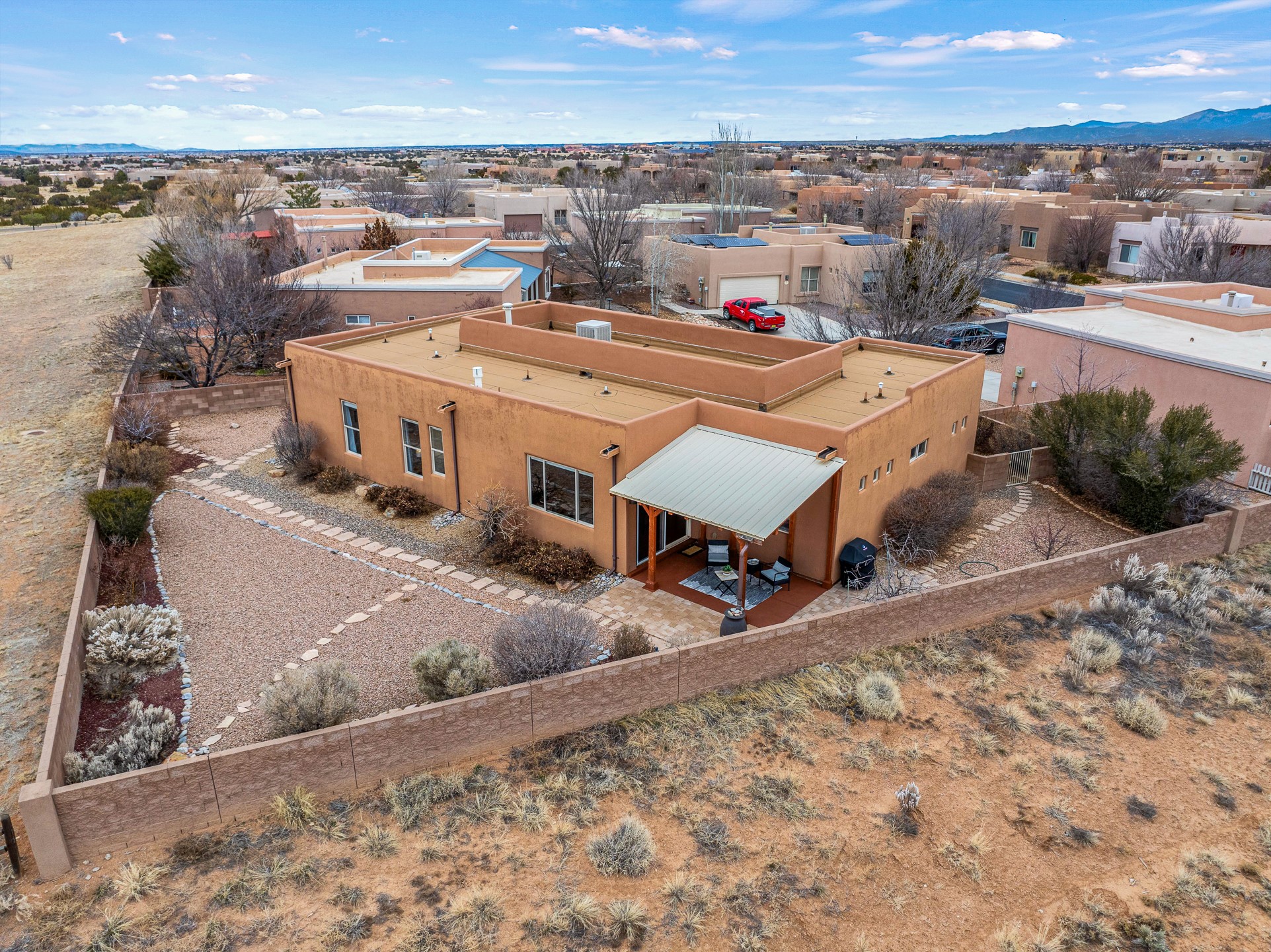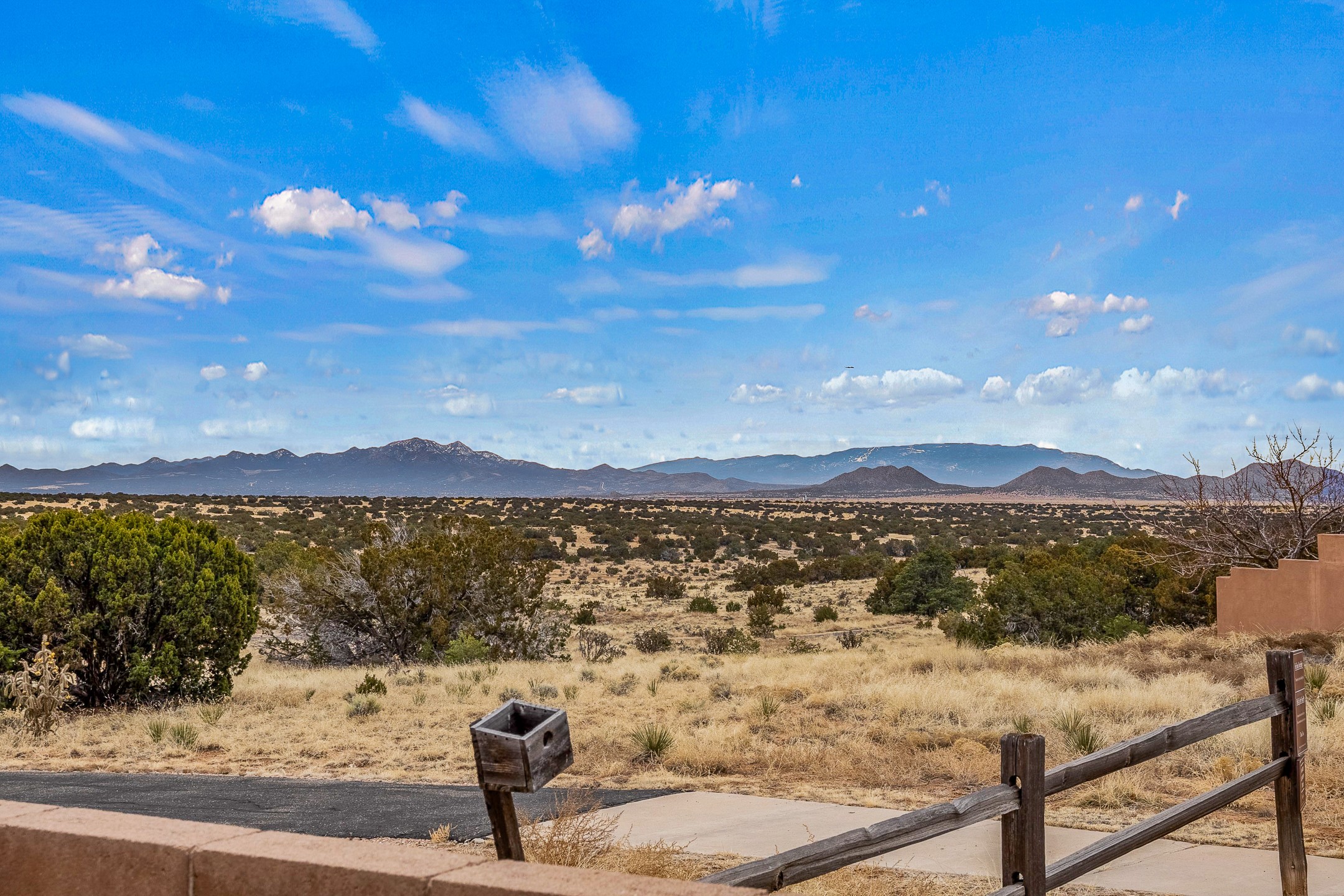 Expansive views and quiet living in Rancho Viejo from this updated 3 bedroom 2 bath home. Sellers have updated the bathrooms, kitchen back-splash tile, some new lighting, repainted entire home and new xeriscaping. Beautiful Douglas Fir wood floors and a gas kiva fireplace welcome you home. Backing to open space, the vistas are awesome and the enclosed back yard takes advantage. Walking trails! Nice large primary closet. Well maintained.