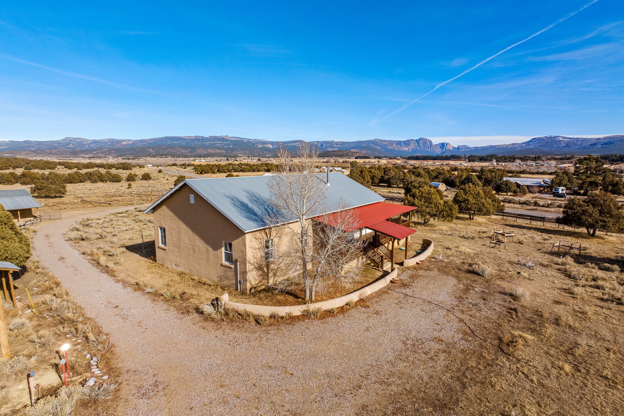 One level ranch home with bunkhouse on over 18 acres bordering the 700,000+ acre Jicarilla. Located only 7 miles east of Heron Lake State Park where you'll find excellent fishing for lake trout and kokanee salmon. No Covenants/No HOA on this fully fenced usable acreage. Located at 7360' elevation with excellent southern exposure and good year round access on a well maintained county road. Abundant water through both Ruthern Rural Water Co-Op as well as a permitted water well. Outbuildings include a 24' x 48' livestock barn with a wood stove and a 10'overhead door, a 24' x 40' metal hay barn with electricity & water and a 8' overhead door, a 24' x 48' greenhouse, chicken coop, and a 10' x 14'bunkhouse with electricity. 60' round pen and a 145' x 155' riding arena make for great horse training areas. The wrap around porch offers fabulous views of the surrounding mountain ranges. This gorgeous Southwest style home offers custom plank hardwood floors, a huge kitchen, a large living area, tall ceilings, and multiple sources of heat thanks to both in-floor radiant heat and a wood stove. Annual taxes are $3,154.48.Priced 50% below replacement costs in today's construction market.
