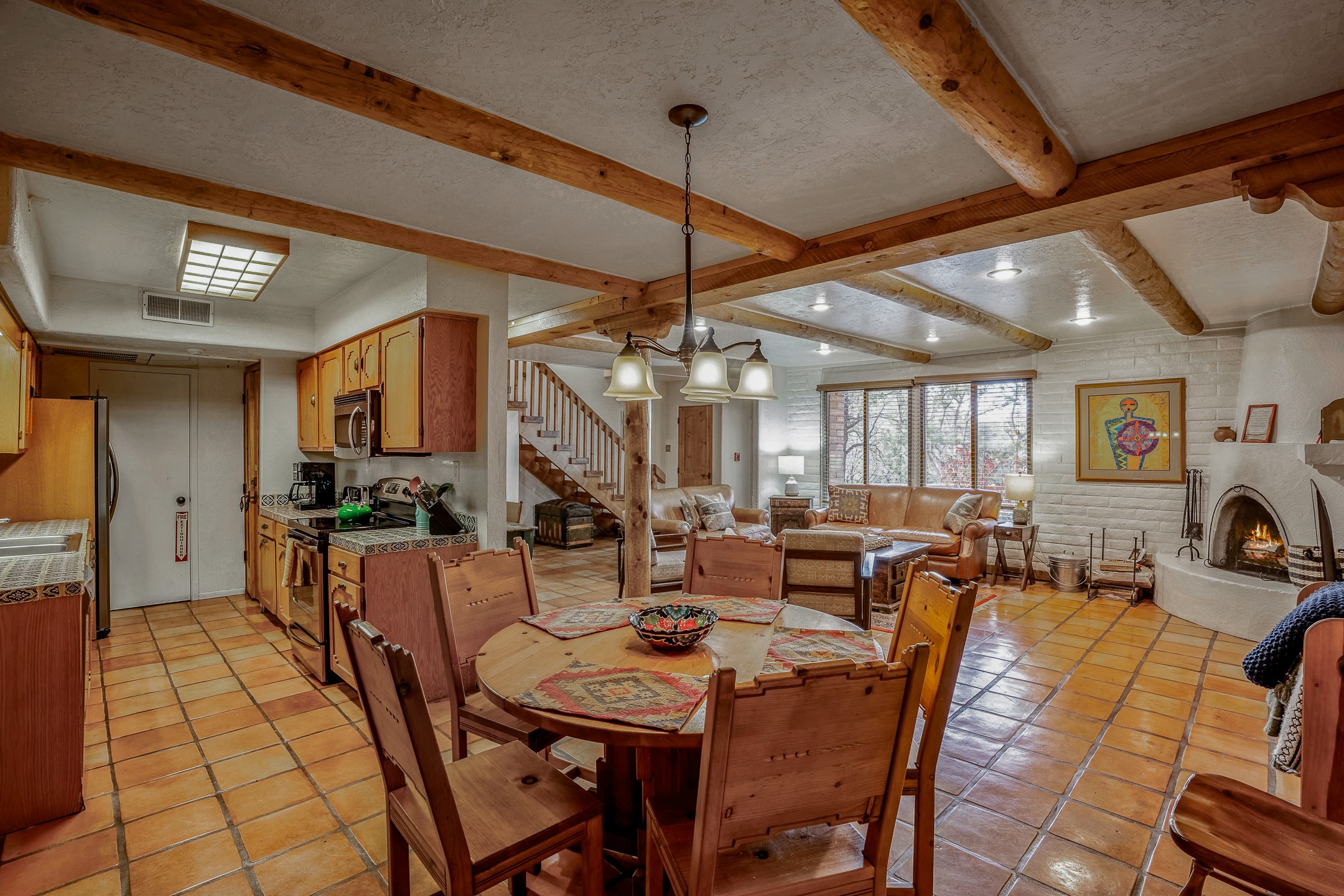 This downtown Santa Fe style 3 bedroom, 3 bathroom, 2-story condo is a rare offering at the Fort Marcy Compound, located just 6 blocks from the famous downtown Santa Fe plaza! Enjoy the indoor swimming pool and hot tub any time of year, and the beautiful, forested setting with deer and other wildlife visitors. This home features central refrigerated air-conditioning and forced-air heat, all new in 2025. The roof is new as of 2024. Walk to the famous Santa Fe Plaza and downtown to a range of events, from Indian Market, Spanish Market, Fiestas, and restaurants, cafes, shops and museums. Immerse yourself in the Santa Fe art scene, then return to your cozy condo to relax in front of the wood-burning kiva fireplace. Fort Marcy Park and Cross of the Martyrs is just across the road, affording great views of Santa Fe and the Sangre de Cristo Mountains. Also close to Santa Fe highlights - skiing, hiking, day trips to Abiquiu, Ghost Ranch and beyond. Just an hour from Albuquerque. ALL FURNISHINGS convey with sale at zero dollars! Including artwork, kitchen supplies and equipment, and accessories, making this a truly 100% turn-key property! The HOA ALLOWS SHORT-TERM RENTALS, and offers a vacation rental program with on-site professional management, including a staff of housekeepers, maintenance personnel, reception desk, concierge services, shuttle service, etc. Ask listing broker for details. This property is ideal for a short-term rental, vacation home, or full-time residence!