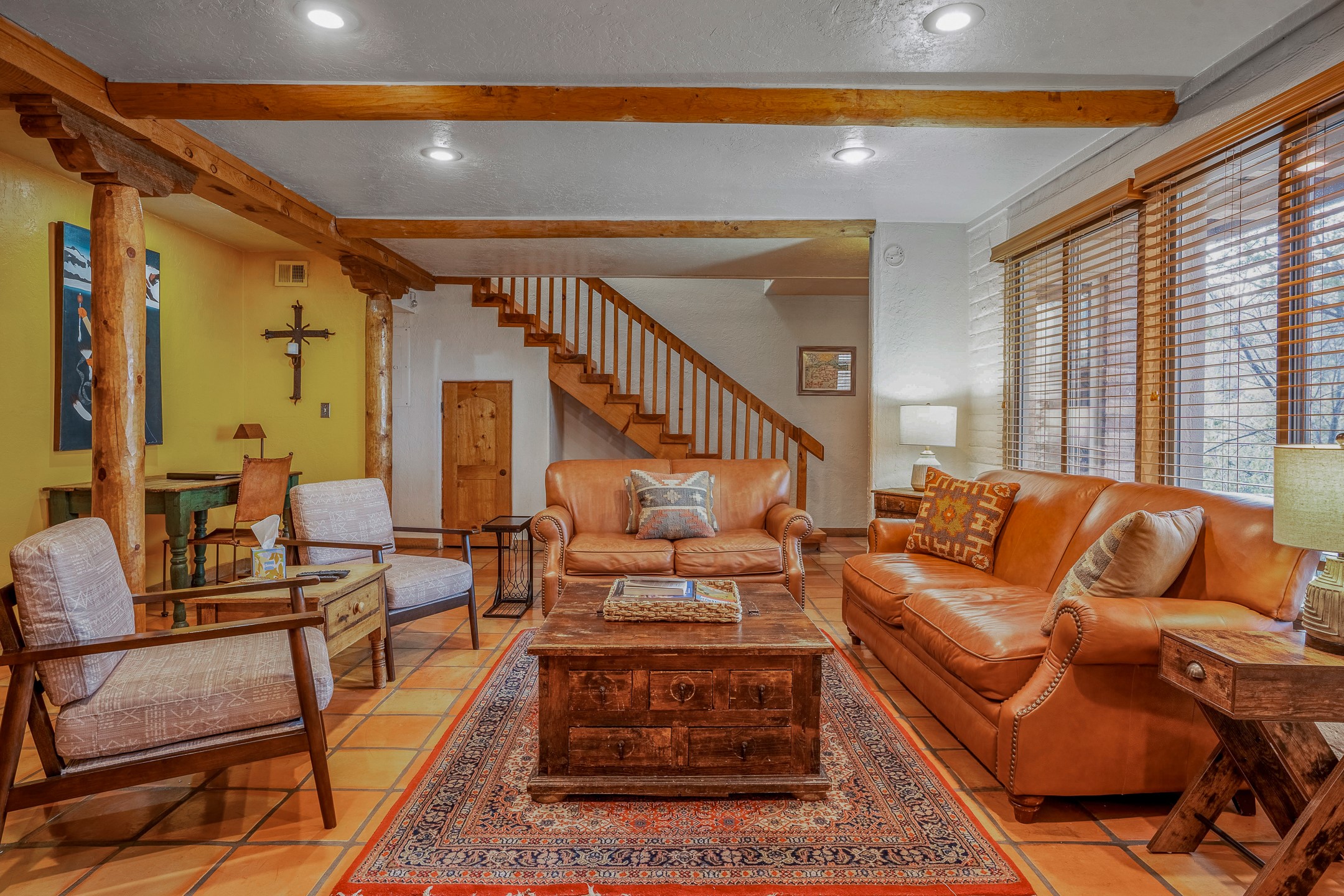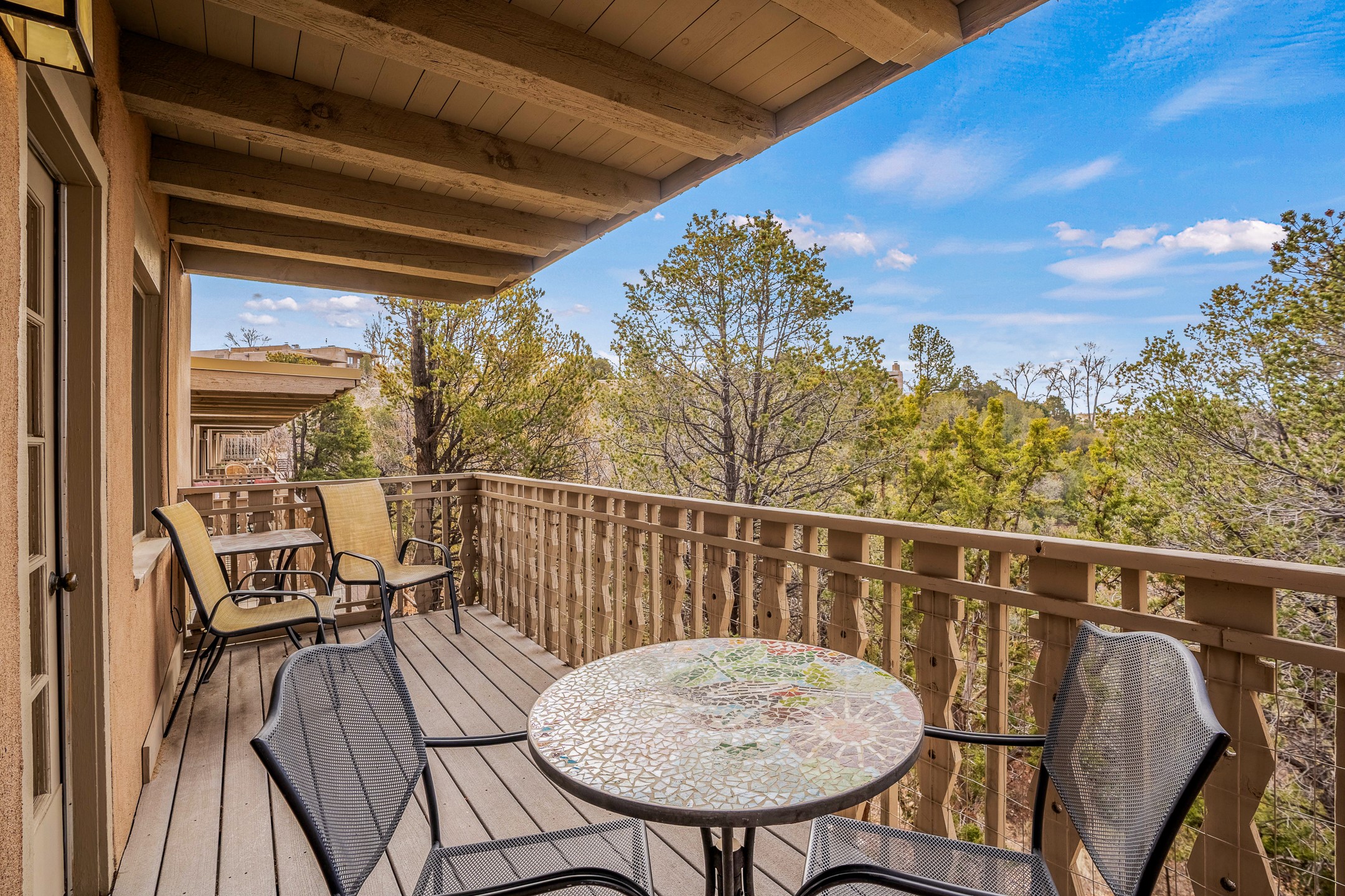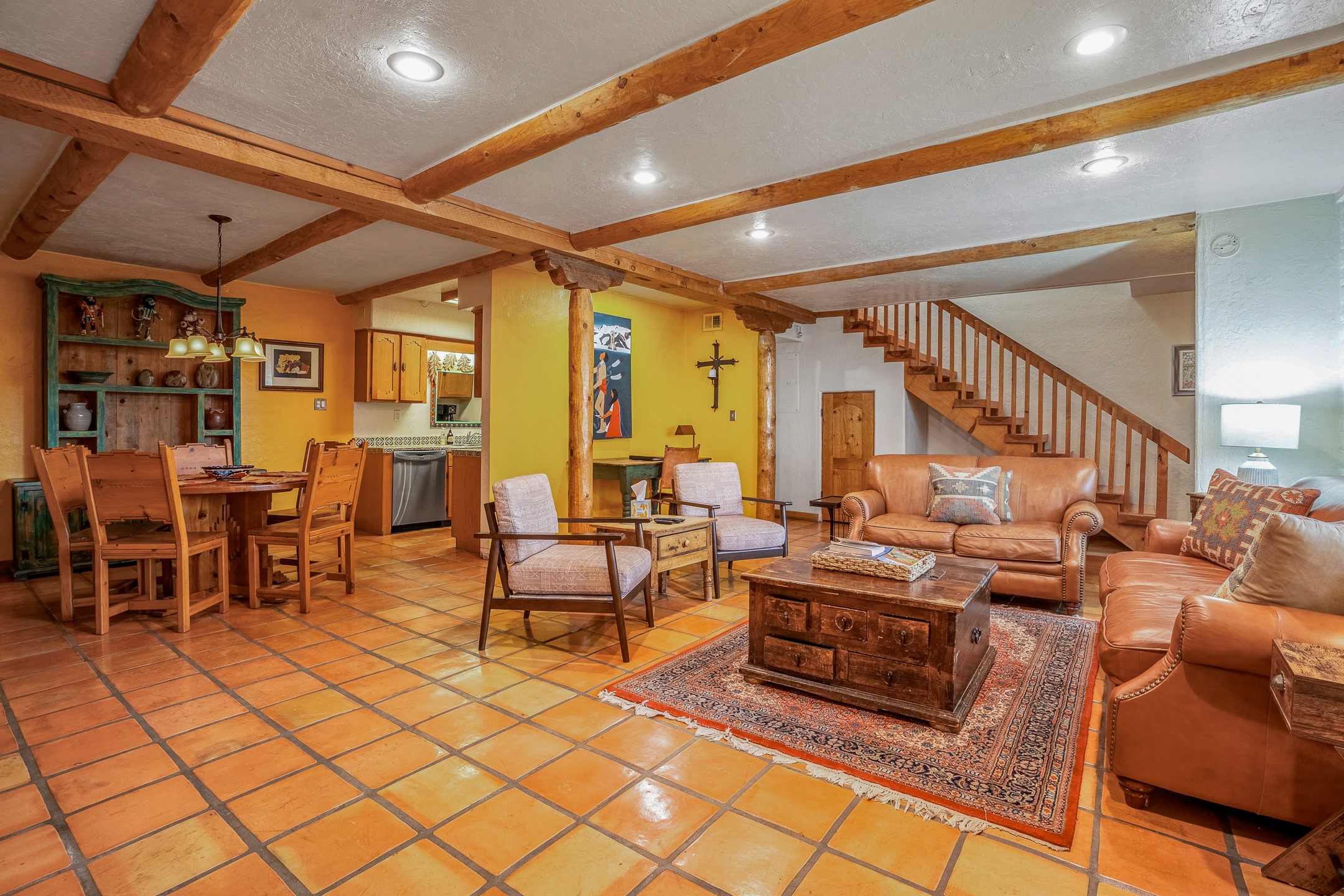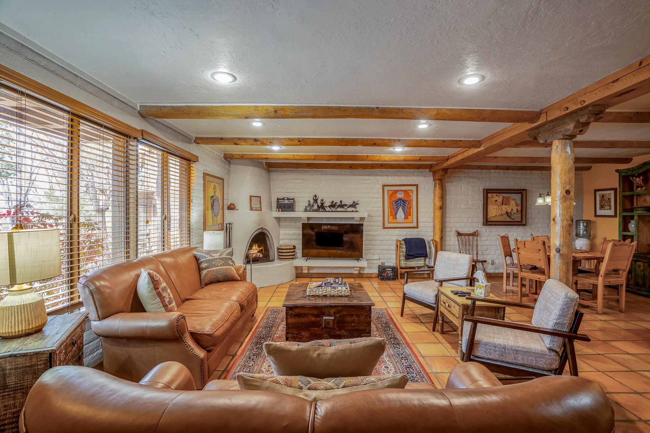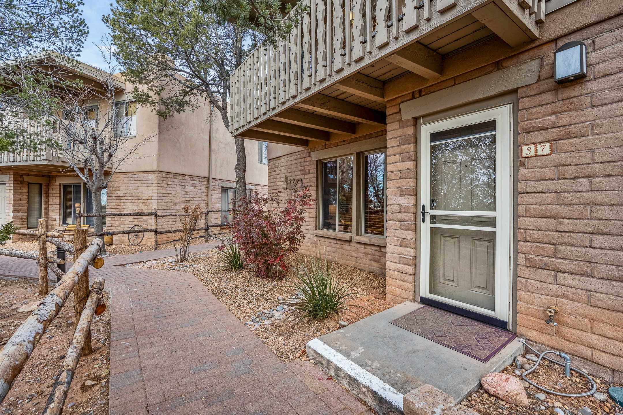 This downtown Santa Fe style 3 bedroom, 3 bathroom, 2-story condo is a rare offering at the Fort Marcy Compound, located just 6 blocks from the famous downtown Santa Fe plaza! Enjoy the indoor swimming pool and hot tub any time of year, and the beautiful, forested setting with deer and other wildlife visitors. This home features central refrigerated air-conditioning and forced-air heat, all new in 2025. The roof is new as of 2024. Walk to the famous Santa Fe Plaza and downtown to a range of events, from Indian Market, Spanish Market, Fiestas, and restaurants, cafes, shops and museums. Immerse yourself in the Santa Fe art scene, then return to your cozy condo to relax in front of the wood-burning kiva fireplace. Fort Marcy Park and Cross of the Martyrs is just across the road, affording great views of Santa Fe and the Sangre de Cristo Mountains. Also close to Santa Fe highlights - skiing, hiking, day trips to Abiquiu, Ghost Ranch and beyond. Just an hour from Albuquerque. ALL FURNISHINGS convey with sale at zero dollars! Including artwork, kitchen supplies and equipment, and accessories, making this a truly 100% turn-key property! The HOA ALLOWS SHORT-TERM RENTALS, and offers a vacation rental program with on-site professional management, including a staff of housekeepers, maintenance personnel, reception desk, concierge services, shuttle service, etc. Ask listing broker for details. This property is ideal for a short-term rental, vacation home, or full-time residence!
