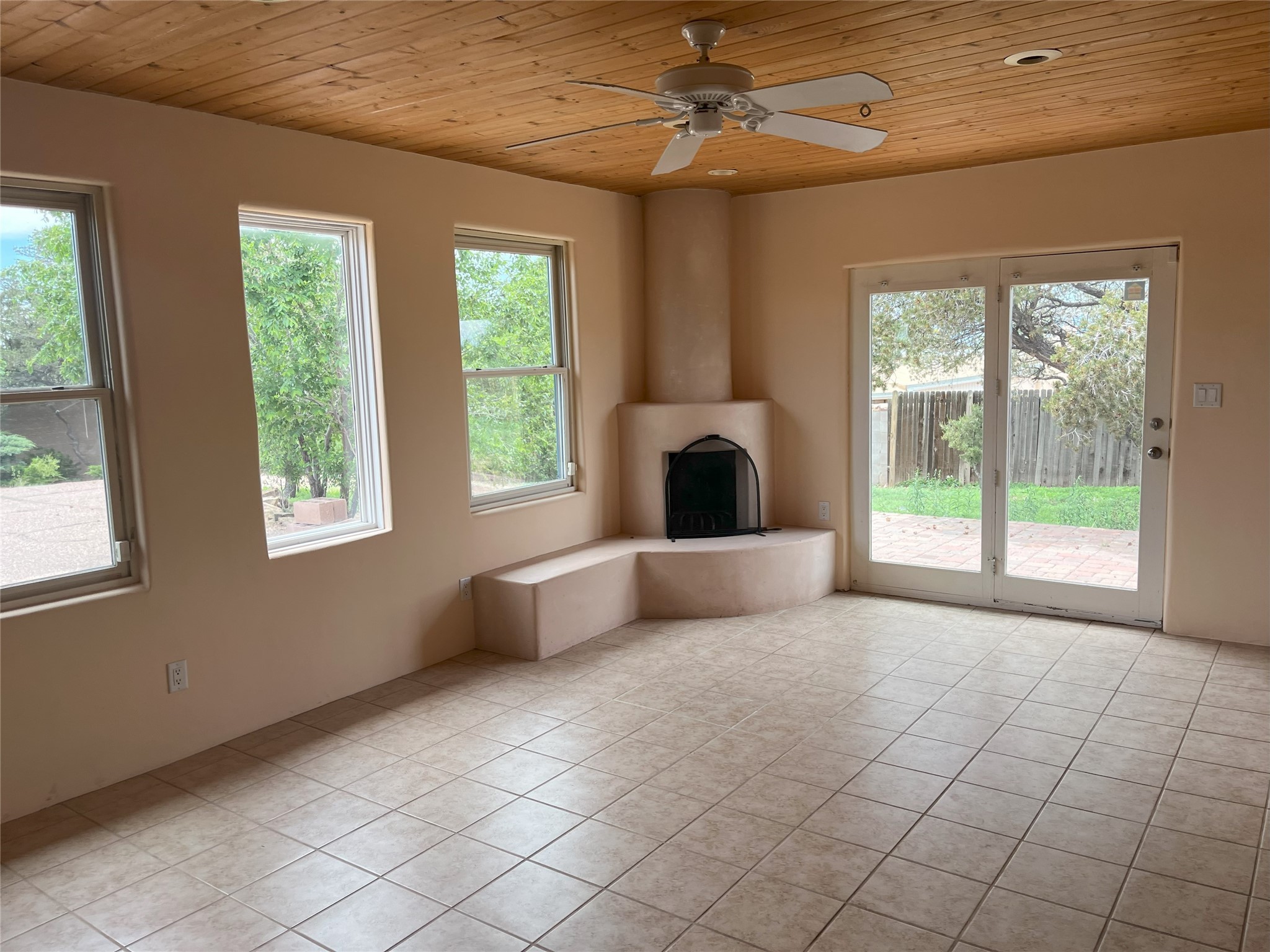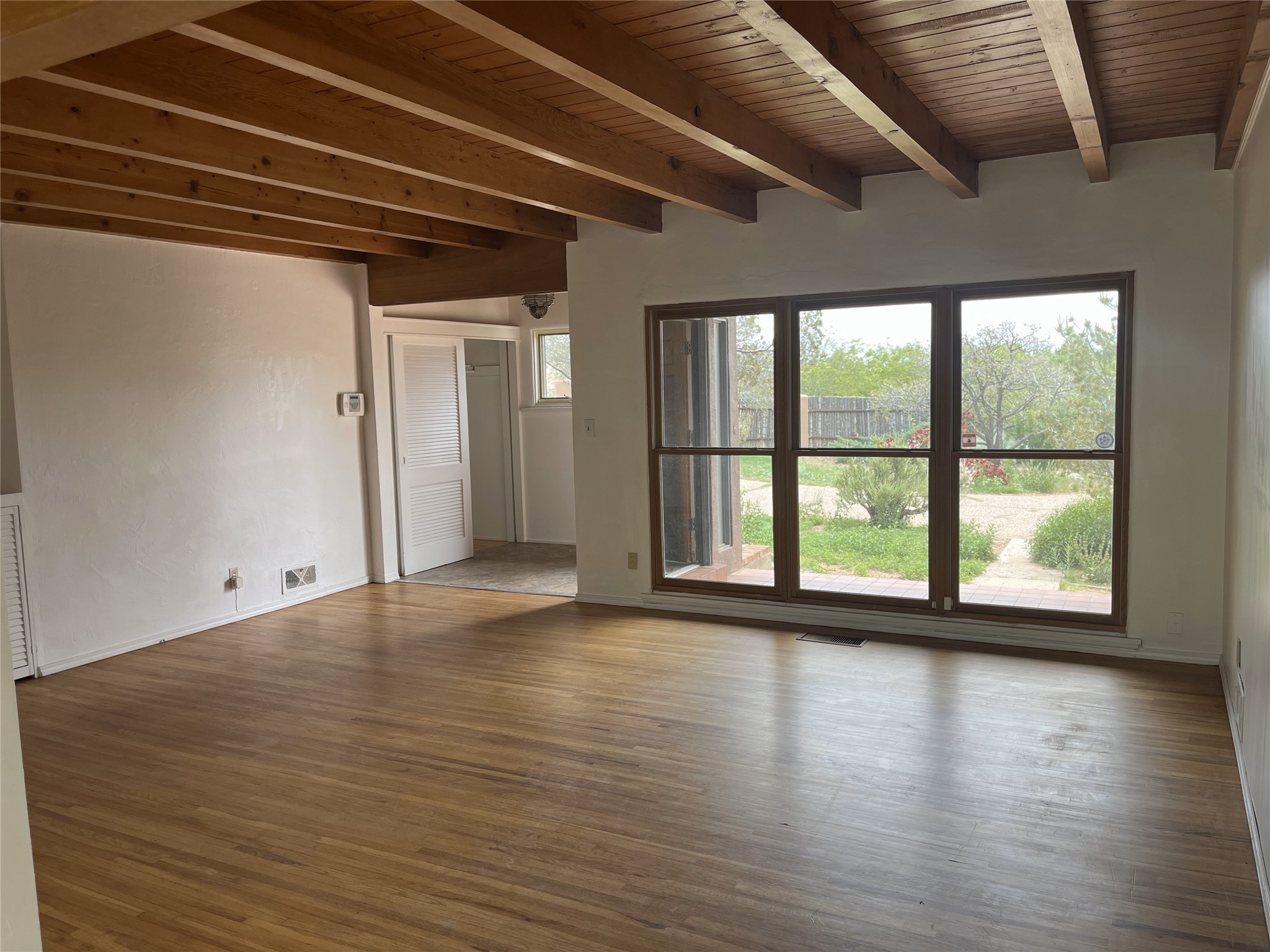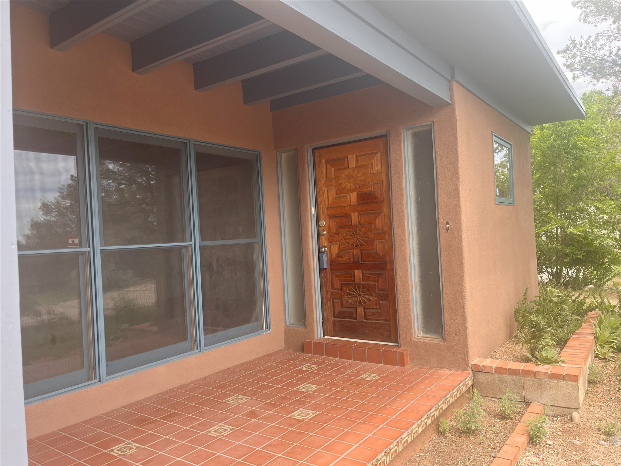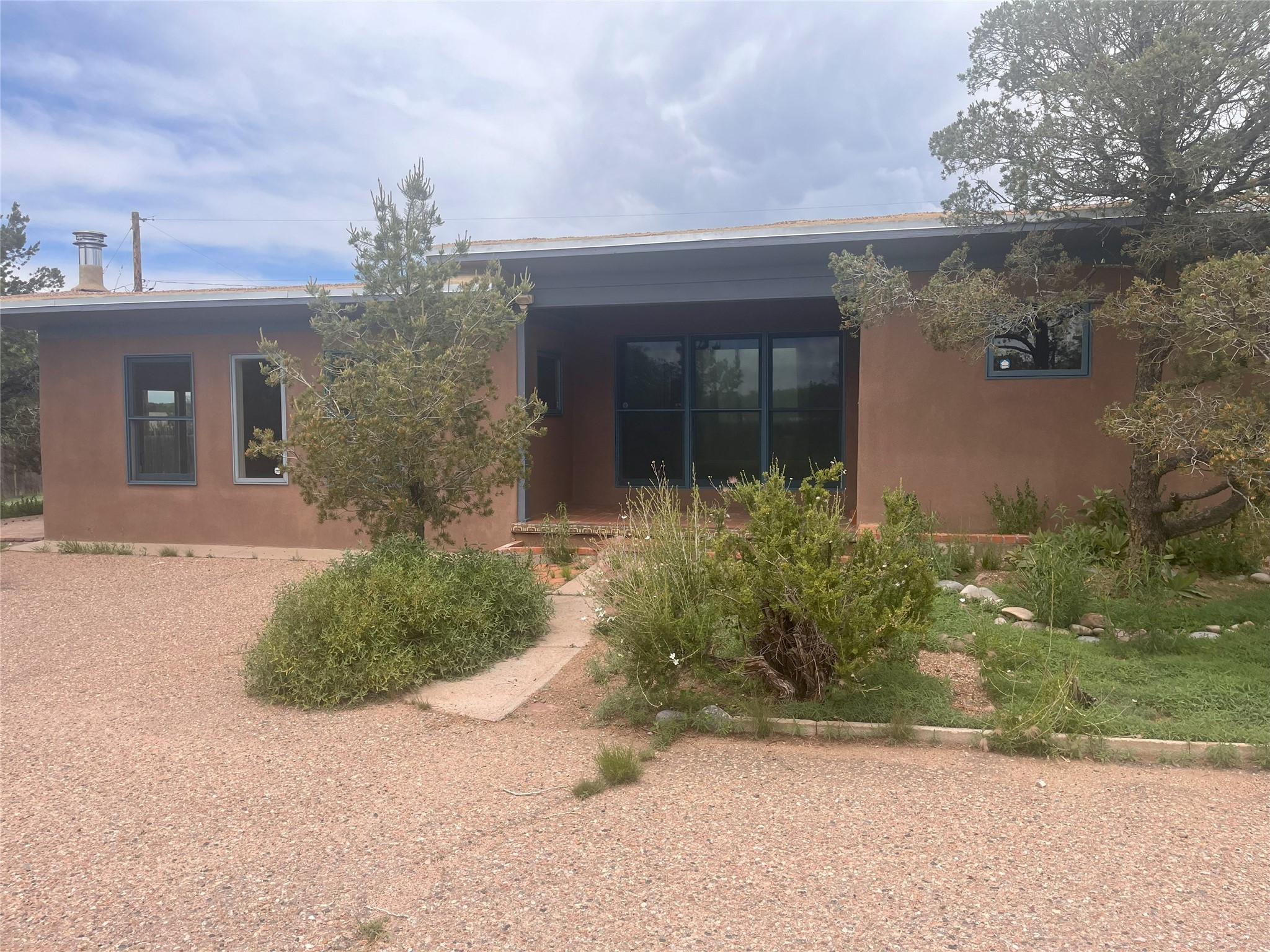 2,000 SF Mid-century Stamm home on .5 acre just south of South Capital. Close to schools,hospital, parks, and hiking. 3 Bedrooms, 2.5 Baths with a large second living area/den or possible fourth bedroom. A charming south-facing front patio welcomes you into the home. Walk through the entryway into a light-filled living room with exposed beams and original oak hardwood floors. The open floorplan is inviting, with the living room opening into a dining area and a beautifully updated kitchen with dining bar and granite counter tops. Skylight in the kitchen and dinning area lets in natural light. Excellent separation of bedrooms with the master and den at one end of the house and the two other bedrooms at the other. Double sinks and slate shower in the master bath. From the master bedroom, full-length glass doors lead outside and offer Jemez mountain views. Interior steps lead into the large and light-filled office or den, which boasts a Kiva fireplace and glass doors leading to a small shaded patio. Dedicated laundry room with utility sink. The concrete pad to the east of the house is perfect for RV/toys parking or possible basketball practice zone. Paved circular driveway and large yard with lots of room to garden or add-on. Several pinon trees in the front of the house. Backyard is a blank slate with views of the Jemez. Roof was redone in 2022 and is under transferable warranty. Aerial photos showing property location were taken before roof re-do.