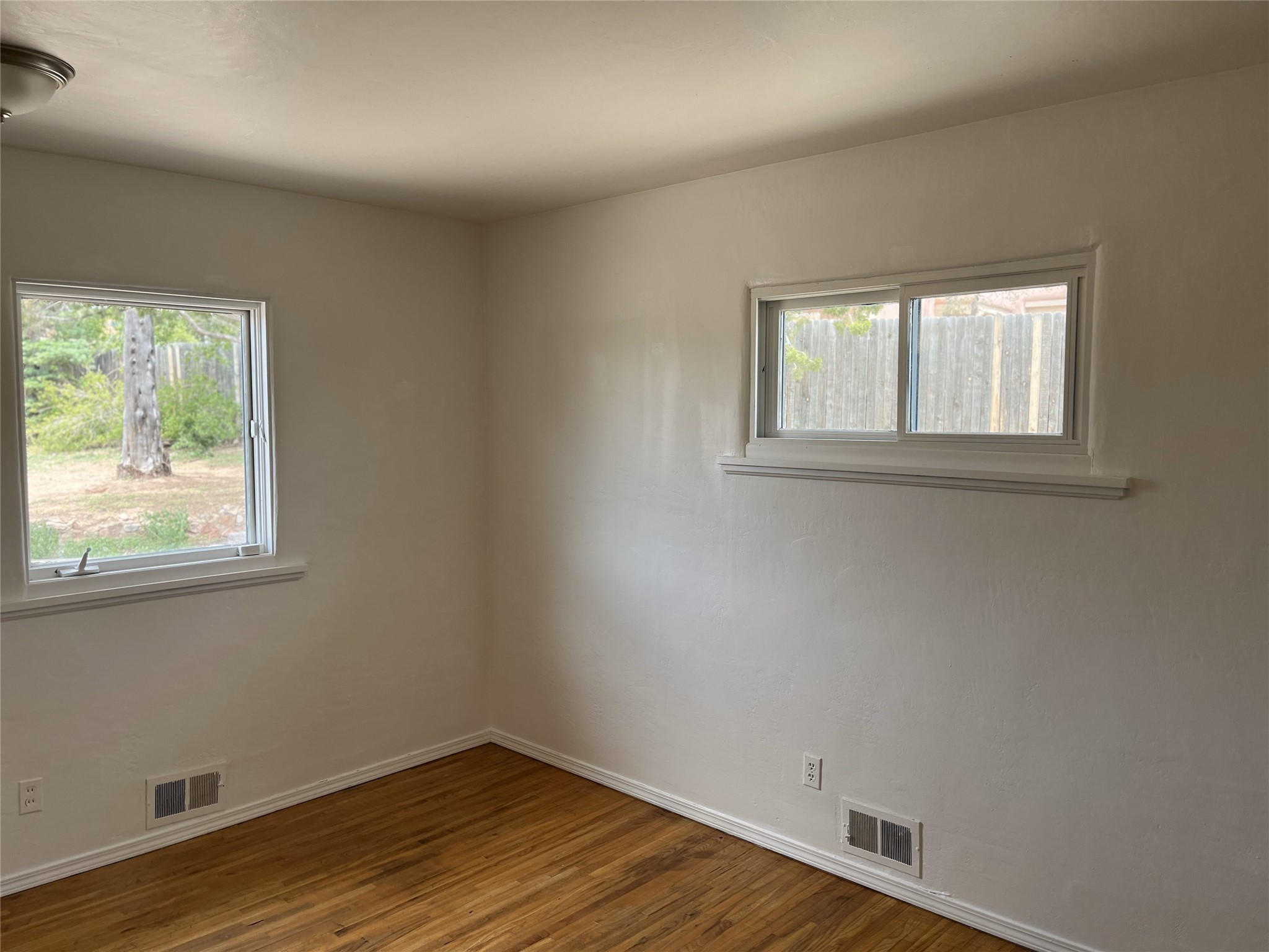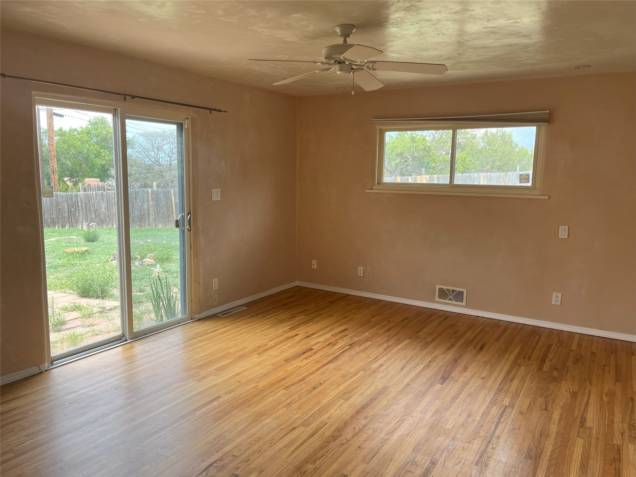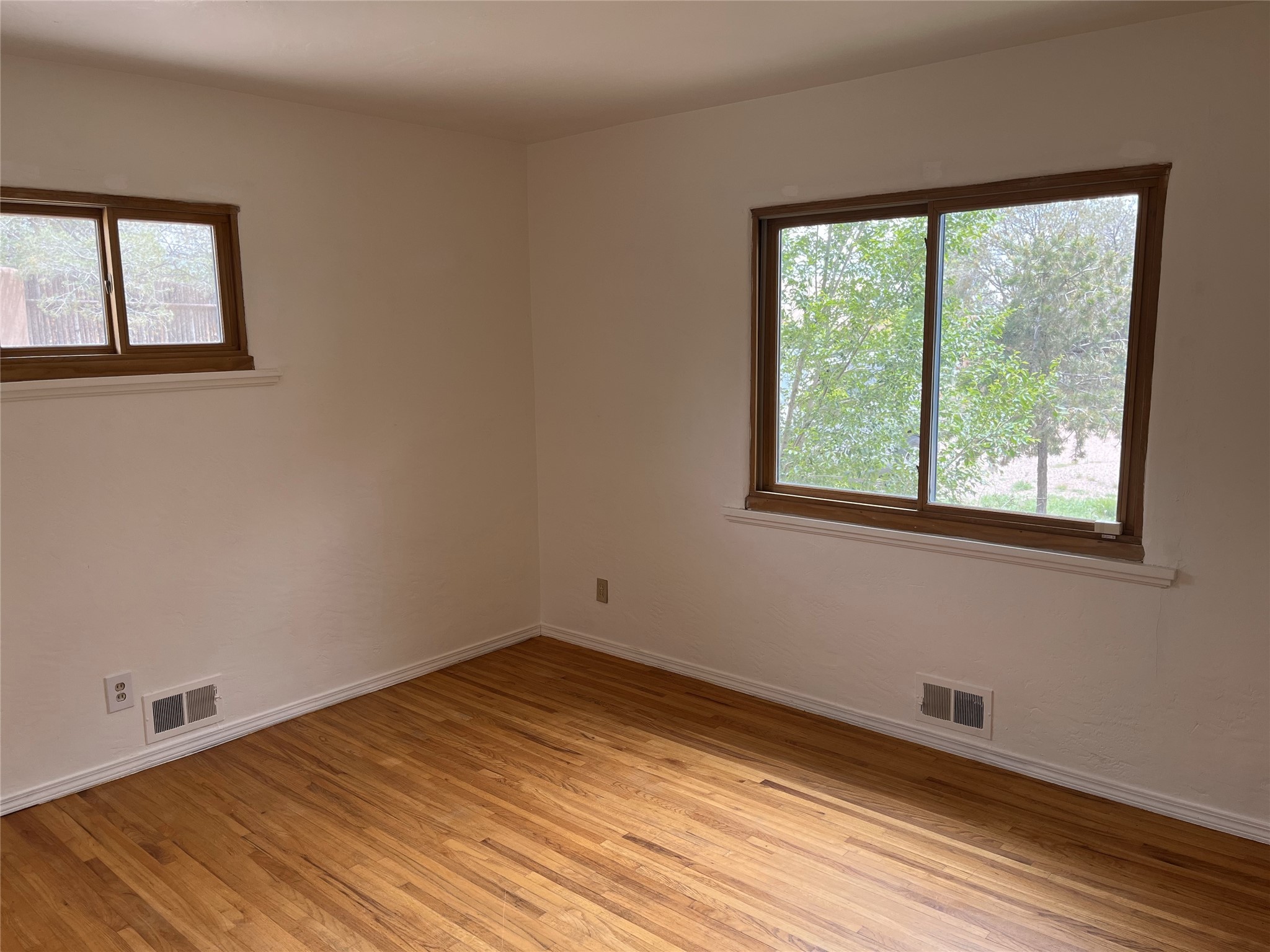 2,000 SF Mid-century Stamm home on .5 acre just south of South Capital. Close to schools,hospital, parks, and hiking. 3 Bedrooms, 2.5 Baths with a large second living area/den or possible fourth bedroom. A charming south-facing front patio welcomes you into the home. Walk through the entryway into a light-filled living room with exposed beams and original oak hardwood floors. The open floorplan is inviting, with the living room opening into a dining area and a beautifully updated kitchen with dining bar and granite counter tops. Skylight in the kitchen and dinning area lets in natural light. Excellent separation of bedrooms with the master and den at one end of the house and the two other bedrooms at the other. Double sinks and slate shower in the master bath. From the master bedroom, full-length glass doors lead outside and offer Jemez mountain views. Interior steps lead into the large and light-filled office or den, which boasts a Kiva fireplace and glass doors leading to a small shaded patio. Dedicated laundry room with utility sink. The concrete pad to the east of the house is perfect for RV/toys parking or possible basketball practice zone. Paved circular driveway and large yard with lots of room to garden or add-on. Several pinon trees in the front of the house. Backyard is a blank slate with views of the Jemez. Roof was redone in 2022 and is under transferable warranty. Aerial photos showing property location were taken before roof re-do.