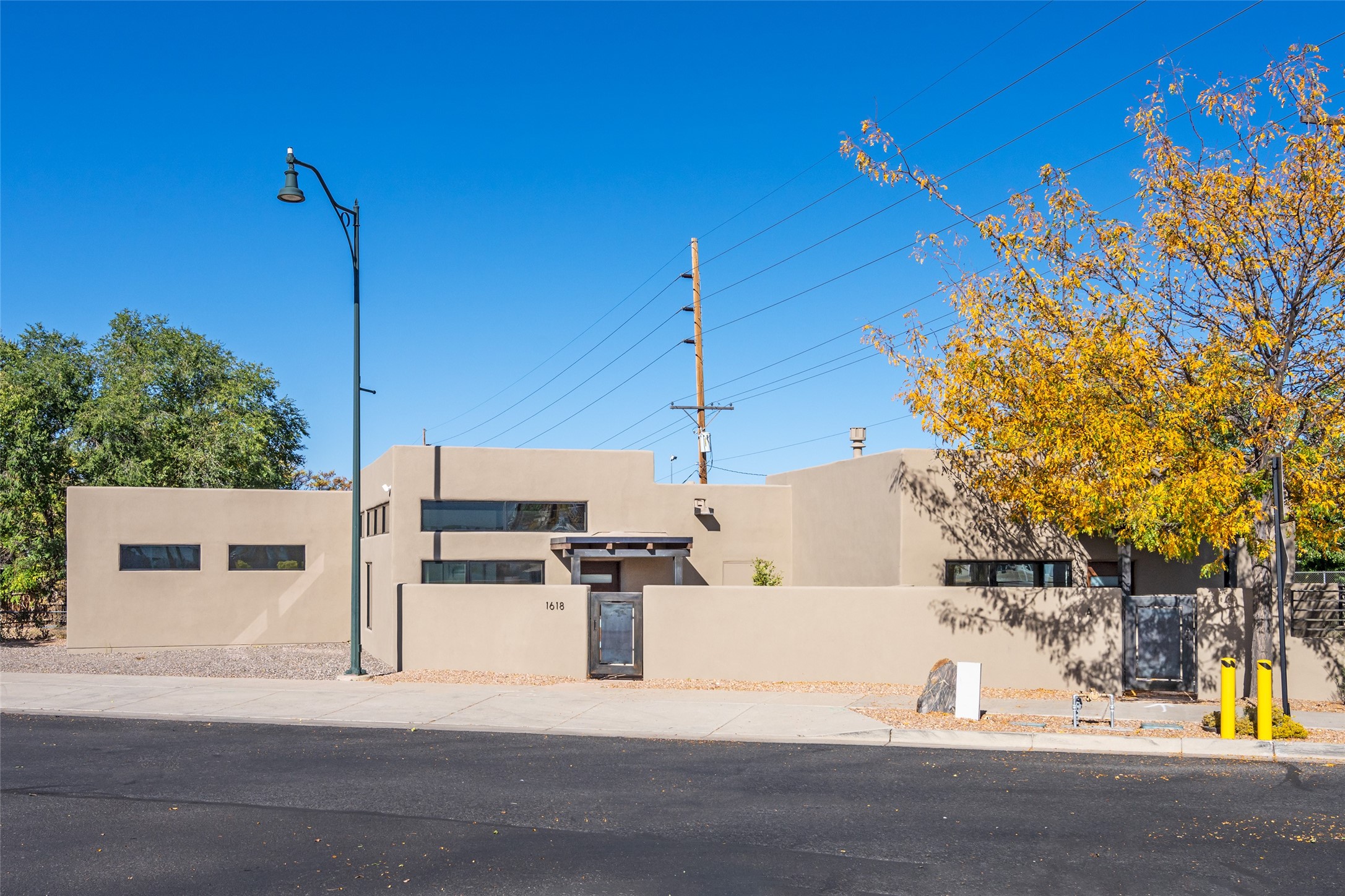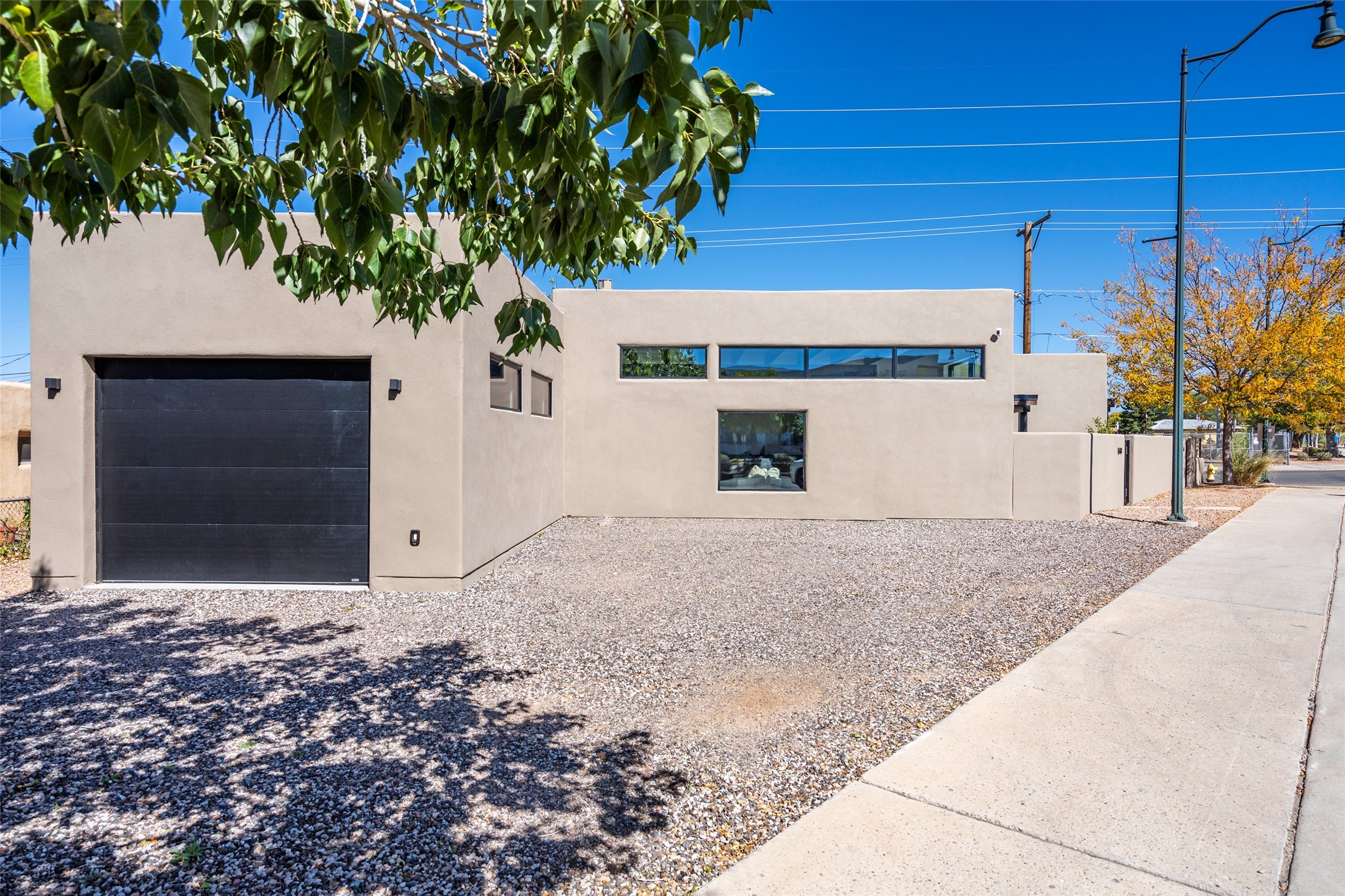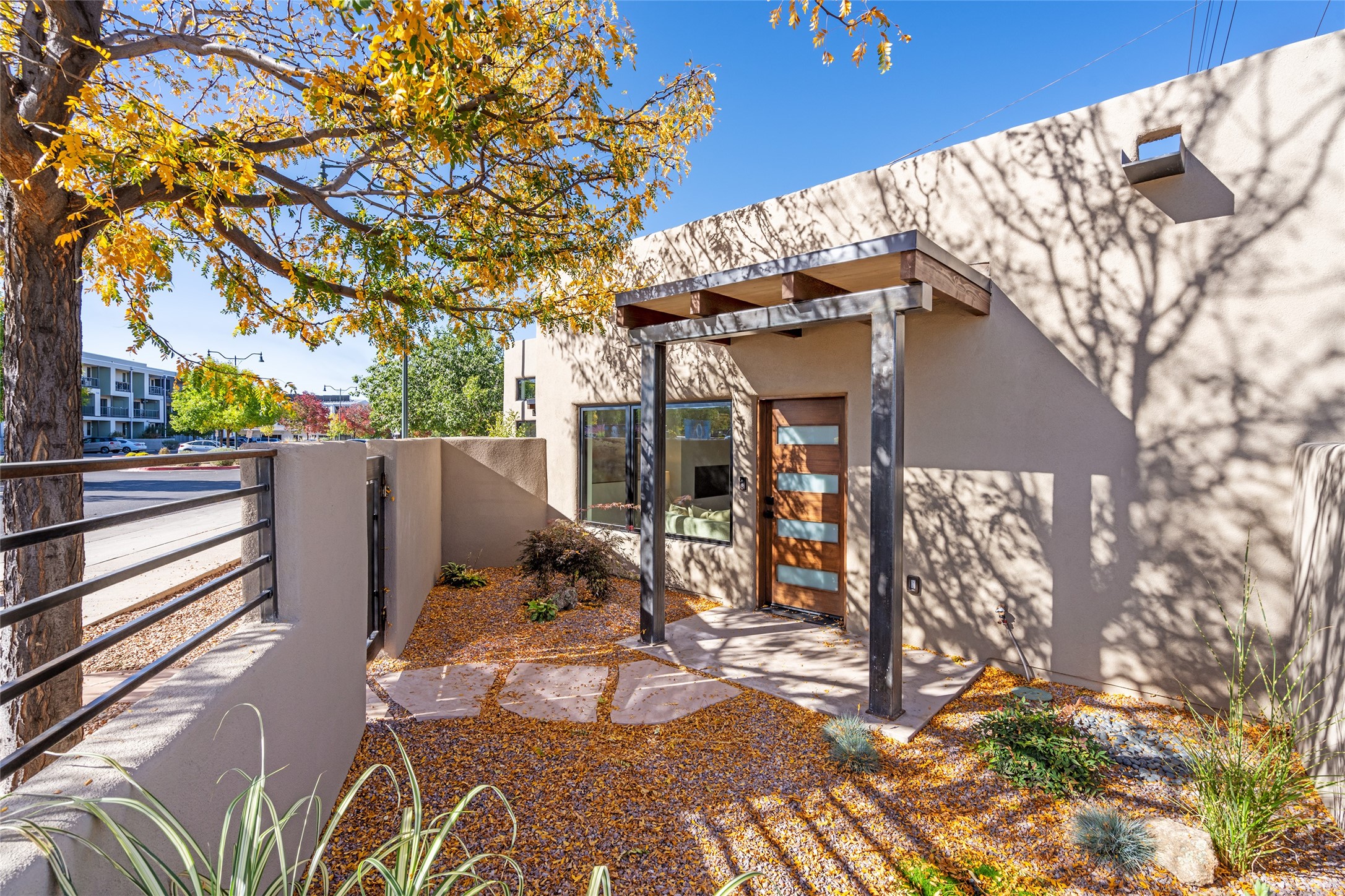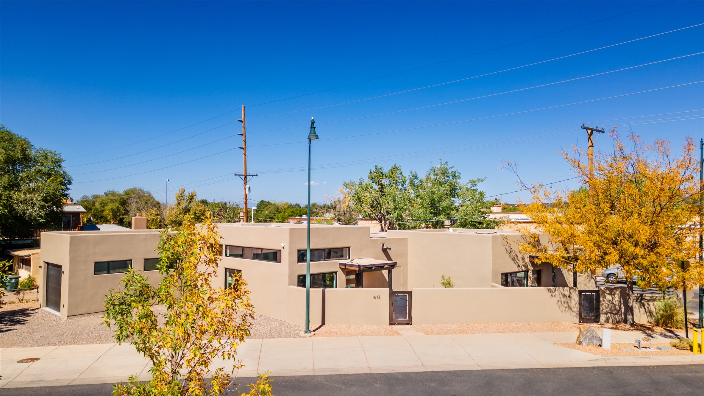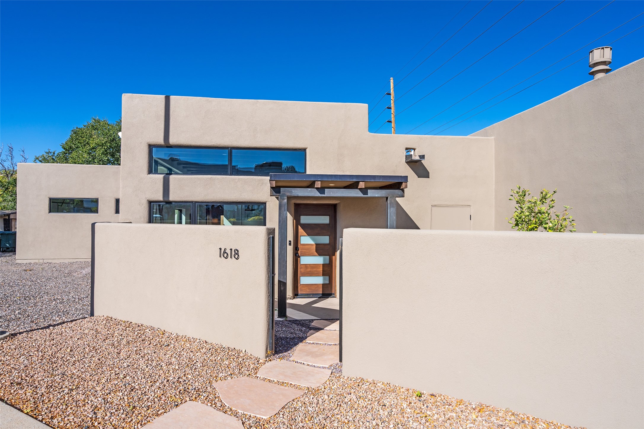 NEW CONSTRUCTION IN THE HEART OF THE RAILYARD! Newly constructed by True North Builders, one of Santa Fe's premier luxury builders, this contemporary property includes a MAIN HOUSE, a GUEST HOUSE and an attached 1-car GARAGE with direct entry. The 1,577 sq. ft. 2 bedroom /2 bathroom main house has an open concept design with beautiful stained concrete flooring, high ceilings with a combination of wood and steel beams, clerestory windows that offer great natural light/privacy and a sleek gas fireplace. The kitchen is the heart of this beautiful property with a large island with ample seating, granite countertops and Fisher Paykal stainless steel appliances. The generous primary suite has a deep soaking tub, a walk-in shower, double vanities and egress to a private patio. The 800 sq. ft. 1 bedroom/1 bathroom attached guest house offers the same level of excellence and finish as the main house and is perfect for your income generation or for friends and family. In-floor radiant heat/air conditioning. 1618 Paseo De Peralta offers one the chance to live in the heart and soul of Santa Fe's exciting Railyard district and, at the same time, offers an incredible opportunity to invest in the new, budding era of Santa Fe.