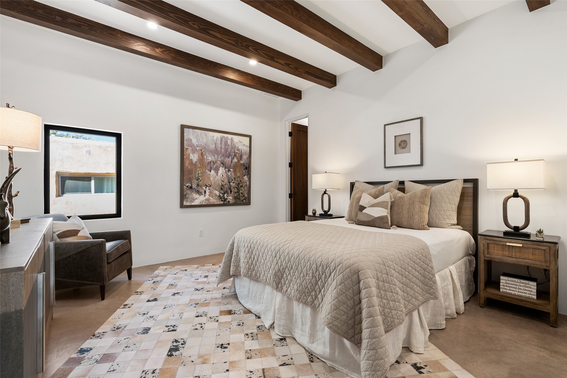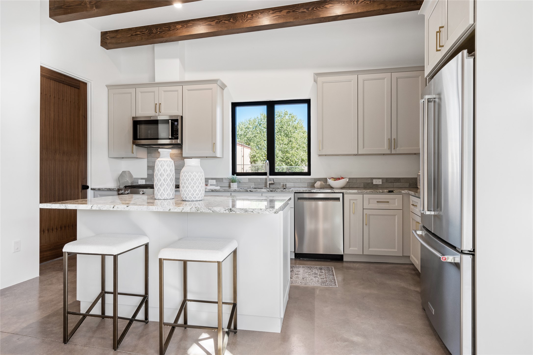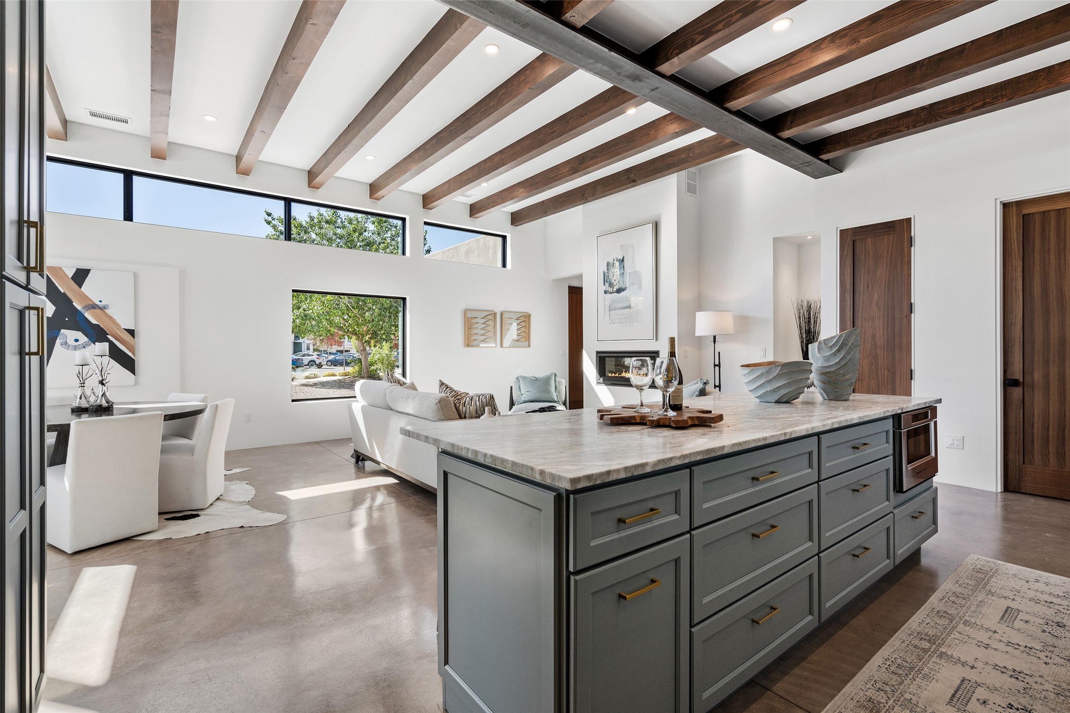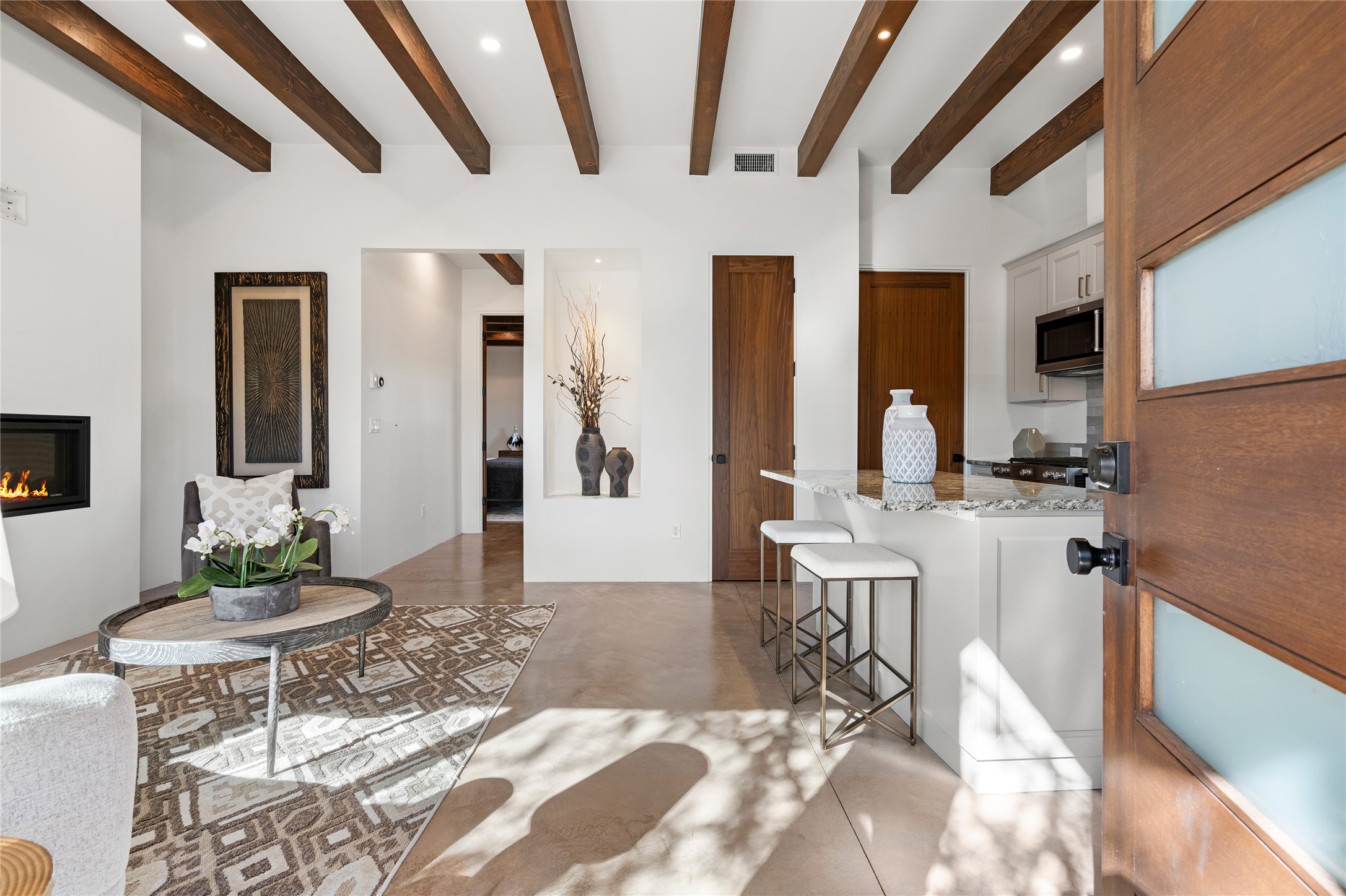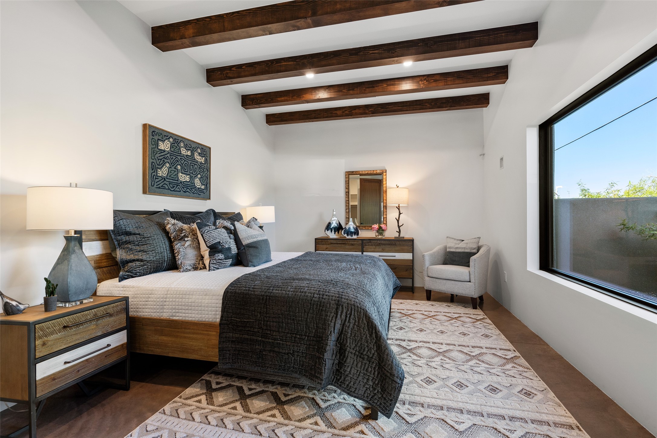 NEW CONSTRUCTION IN THE HEART OF THE RAILYARD! Newly constructed by True North Builders, one of Santa Fe's premier luxury builders, this contemporary property includes a MAIN HOUSE, a GUEST HOUSE and an attached 1-car GARAGE with direct entry. The 1,577 sq. ft. 2 bedroom /2 bathroom main house has an open concept design with beautiful stained concrete flooring, high ceilings with a combination of wood and steel beams, clerestory windows that offer great natural light/privacy and a sleek gas fireplace. The kitchen is the heart of this beautiful property with a large island with ample seating, granite countertops and Fisher Paykal stainless steel appliances. The generous primary suite has a deep soaking tub, a walk-in shower, double vanities and egress to a private patio. The 800 sq. ft. 1 bedroom/1 bathroom attached guest house offers the same level of excellence and finish as the main house and is perfect for your income generation or for friends and family. In-floor radiant heat/air conditioning. 1618 Paseo De Peralta offers one the chance to live in the heart and soul of Santa Fe's exciting Railyard district and, at the same time, offers an incredible opportunity to invest in the new, budding era of Santa Fe.