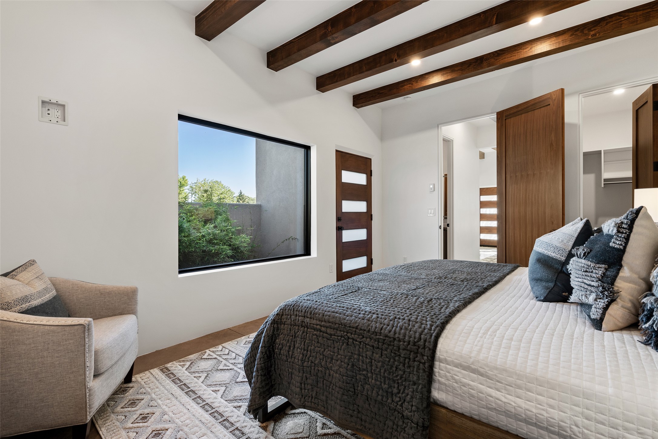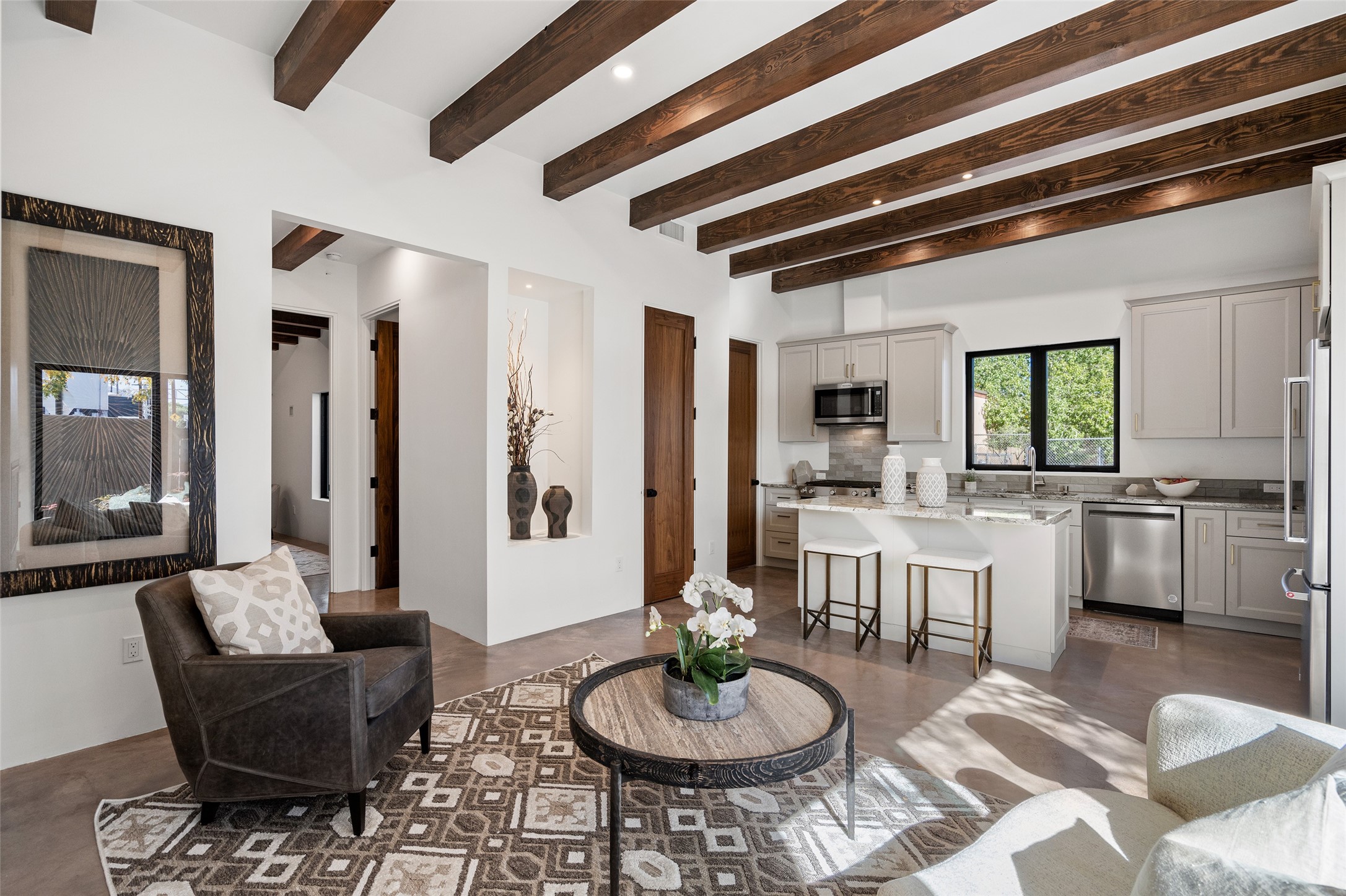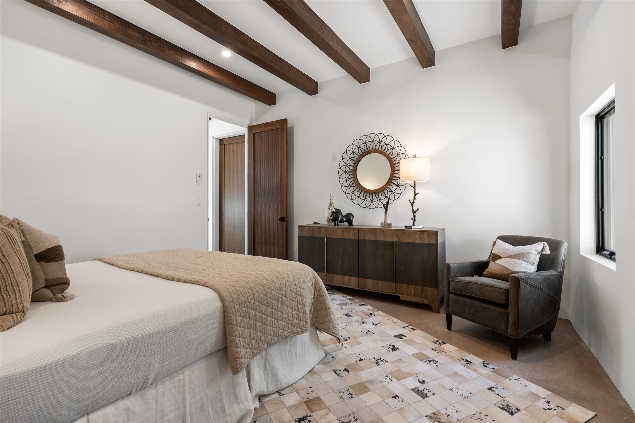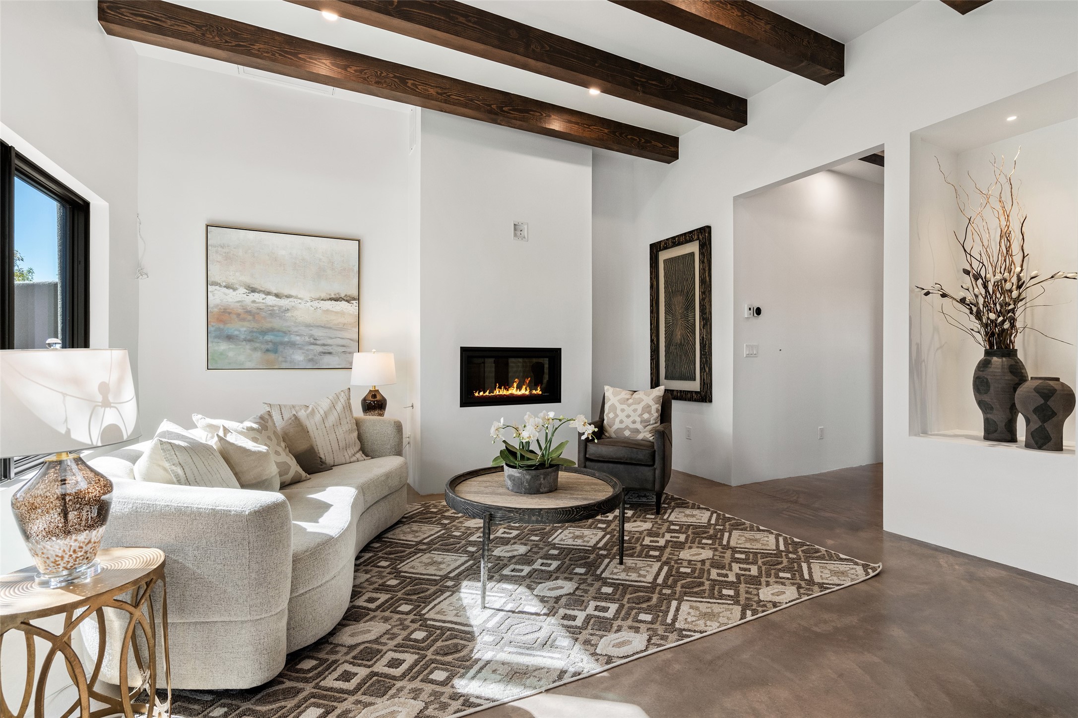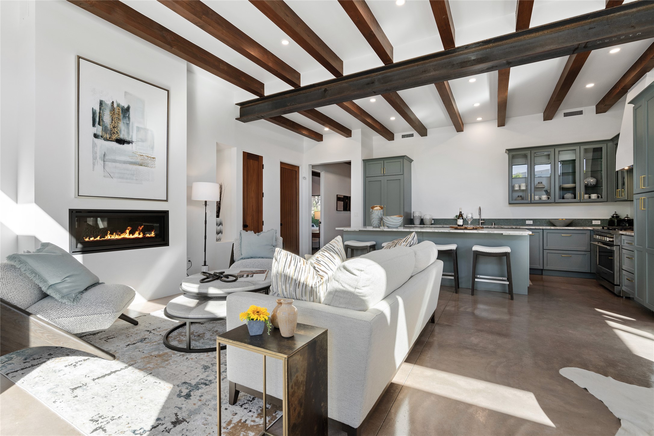 NEW CONSTRUCTION IN THE HEART OF THE RAILYARD! Newly constructed by True North Builders, one of Santa Fe's premier luxury builders, this contemporary property includes a MAIN HOUSE, a GUEST HOUSE and an attached 1-car GARAGE with direct entry. The 1,577 sq. ft. 2 bedroom /2 bathroom main house has an open concept design with beautiful stained concrete flooring, high ceilings with a combination of wood and steel beams, clerestory windows that offer great natural light/privacy and a sleek gas fireplace. The kitchen is the heart of this beautiful property with a large island with ample seating, granite countertops and Fisher Paykal stainless steel appliances. The generous primary suite has a deep soaking tub, a walk-in shower, double vanities and egress to a private patio. The 800 sq. ft. 1 bedroom/1 bathroom attached guest house offers the same level of excellence and finish as the main house and is perfect for your income generation or for friends and family. In-floor radiant heat/air conditioning. 1618 Paseo De Peralta offers one the chance to live in the heart and soul of Santa Fe's exciting Railyard district and, at the same time, offers an incredible opportunity to invest in the new, budding era of Santa Fe.