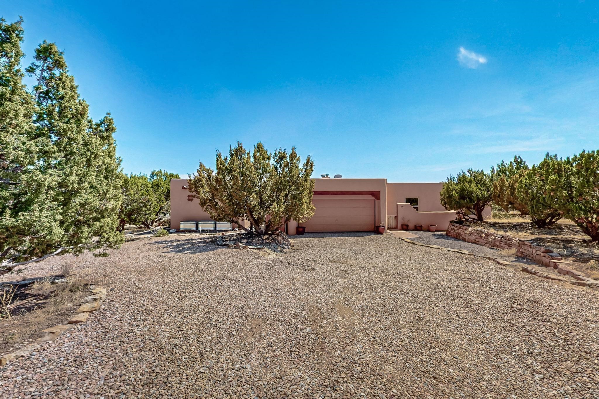 A rare find in Eldorado bordering a 62acre greenbelt dramatically visible through a large picture window on entering this home. Lovely romantic design custom built by Homes by Marie for the original artist owner in 1995 plus a detached studio added by the new artist owner only 3 years ago. A contemporary pueblo look with Santa Fe detailing throughout. A central 2 way kiva fireplace between the dining and living room, beam ceilings, Saltillo floors, bancos and carved twisted beams add southwest charm and character. Natural gas radiant heating, re stuccoed in 2019, community water, high speed internet and interior window blinds. One of the two guest bedrooms was originally a studio and has Saltillo tile, the other has an older carpet. The main bedroom suite, dining room and living room access the patio and fenced rear yard overlooking the greenbelt to sunset and mountain views, There is a large 2 car finished garage with plenty of parking, and a wonderful heat/ac studio, artist ready with a sink and plenty of storage. On 1.33 acres, centrally located in Eldorado within easy reach of all amenities, local shopping, schools, trails, parks, library and senior centre only minutes into Santa Fe.