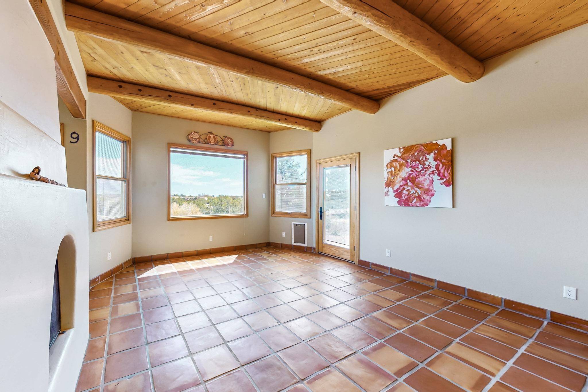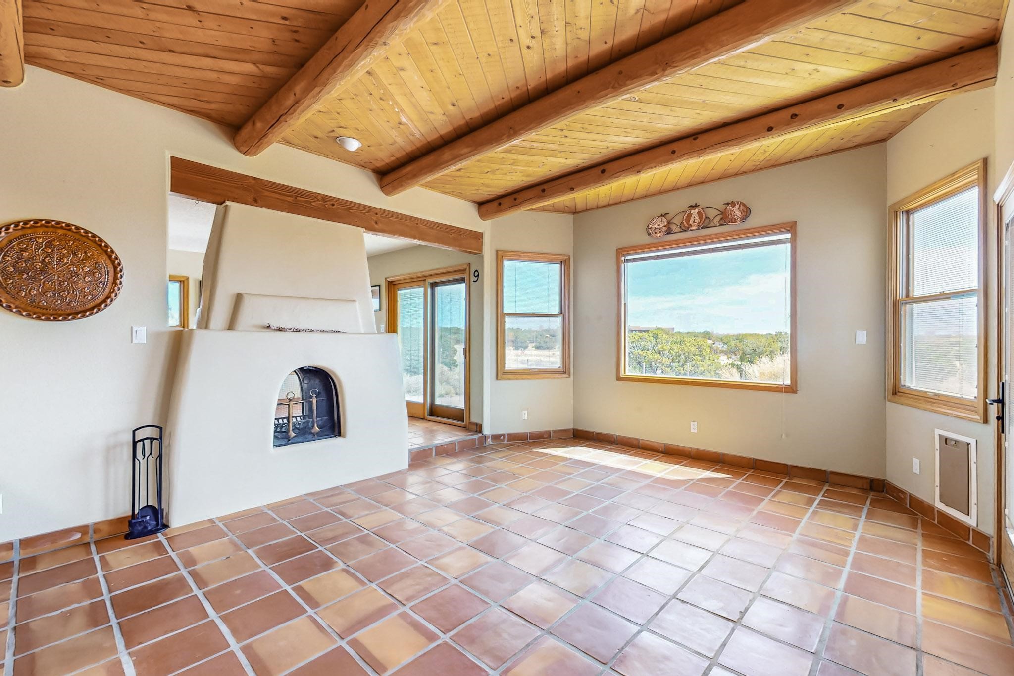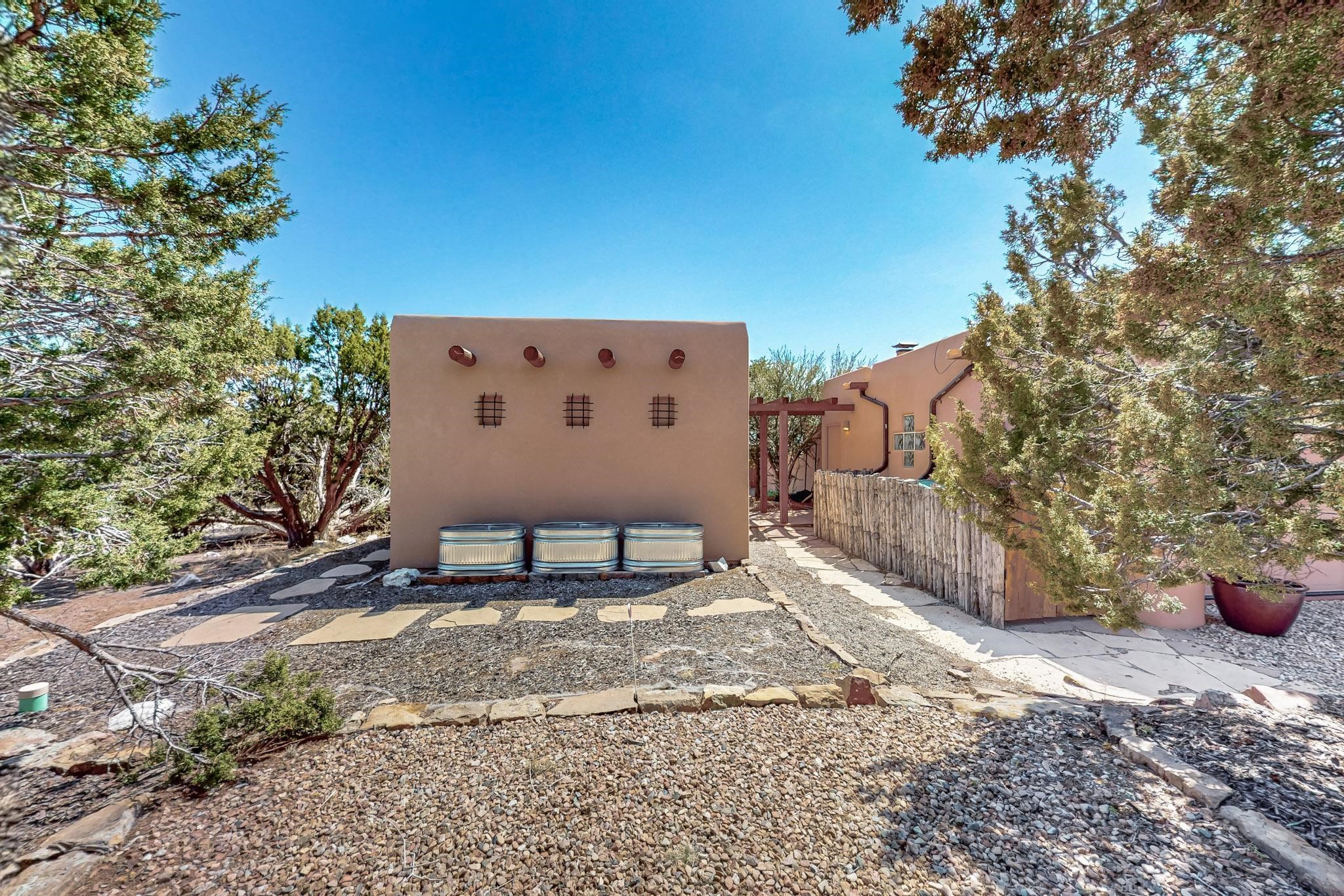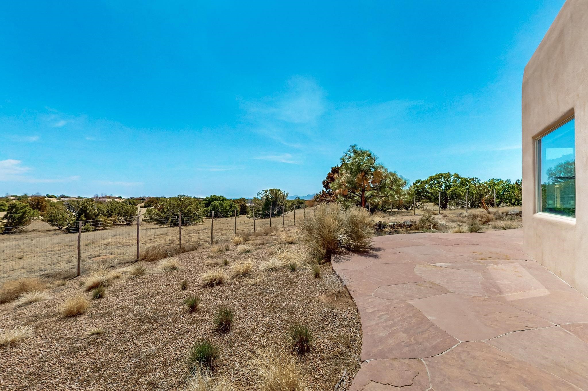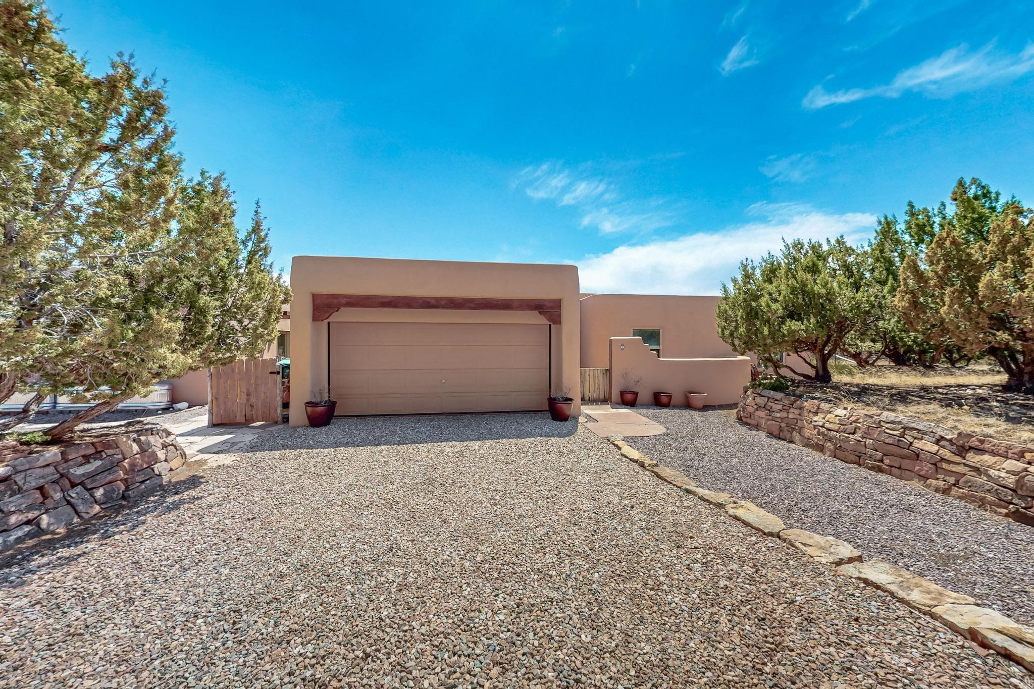 A rare find in Eldorado bordering a 62acre greenbelt dramatically visible through a large picture window on entering this home. Lovely romantic design custom built by Homes by Marie for the original artist owner in 1995 plus a detached studio added by the new artist owner only 3 years ago. A contemporary pueblo look with Santa Fe detailing throughout. A central 2 way kiva fireplace between the dining and living room, beam ceilings, Saltillo floors, bancos and carved twisted beams add southwest charm and character. Natural gas radiant heating, re stuccoed in 2019, community water, high speed internet and interior window blinds. One of the two guest bedrooms was originally a studio and has Saltillo tile, the other has an older carpet. The main bedroom suite, dining room and living room access the patio and fenced rear yard overlooking the greenbelt to sunset and mountain views, There is a large 2 car finished garage with plenty of parking, and a wonderful heat/ac studio, artist ready with a sink and plenty of storage. On 1.33 acres, centrally located in Eldorado within easy reach of all amenities, local shopping, schools, trails, parks, library and senior centre only minutes into Santa Fe.