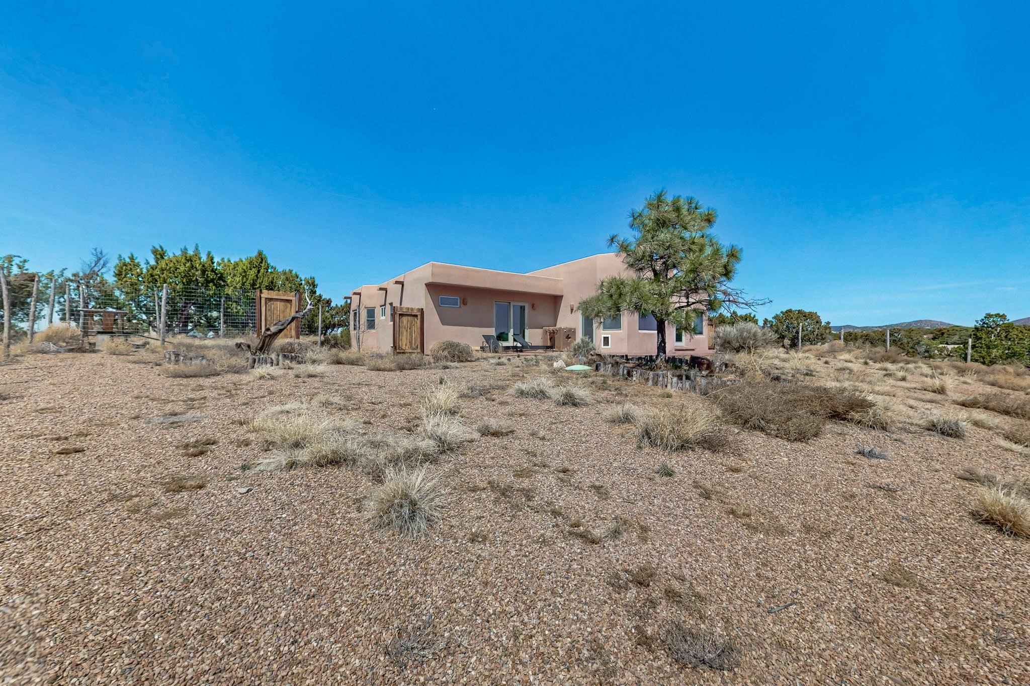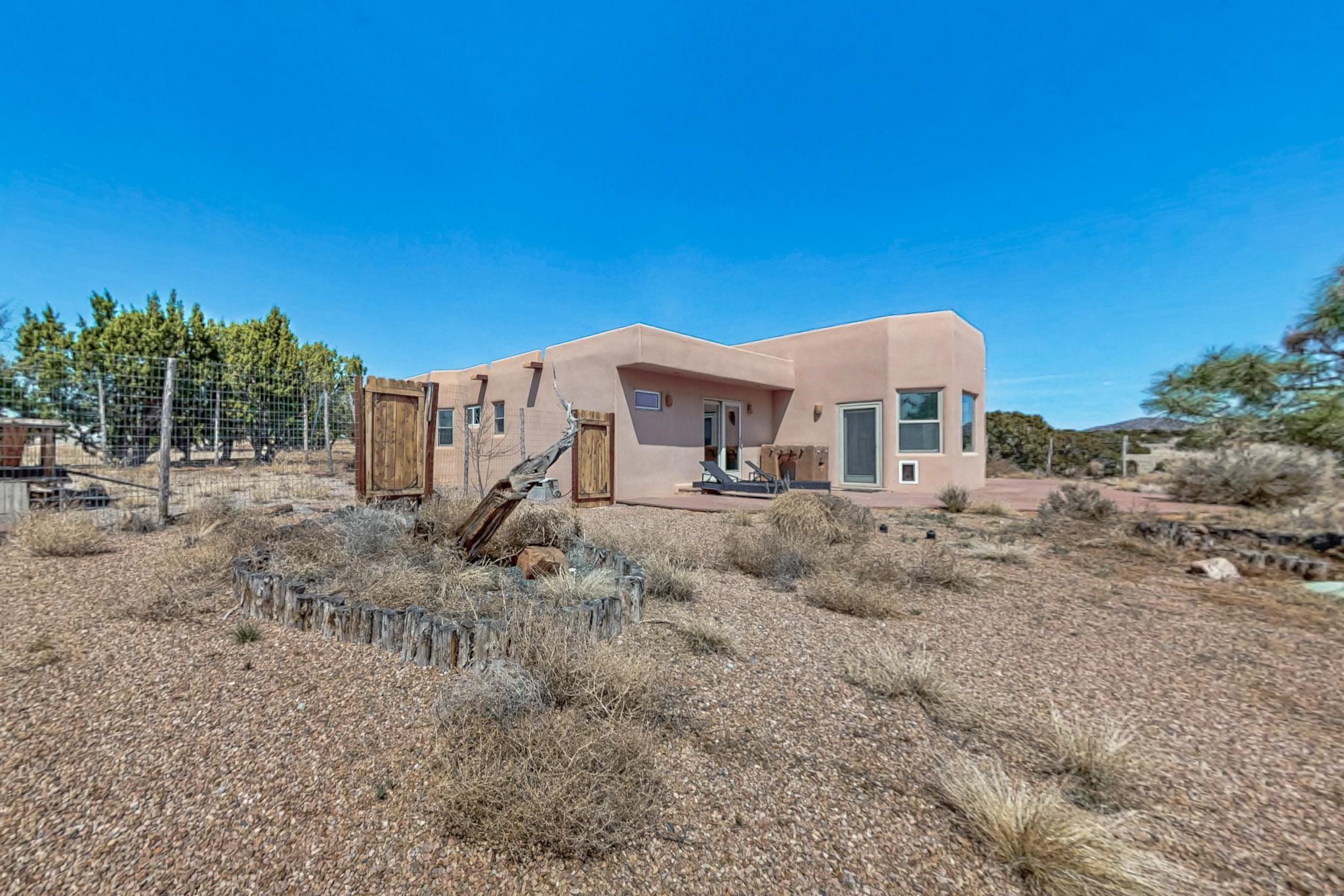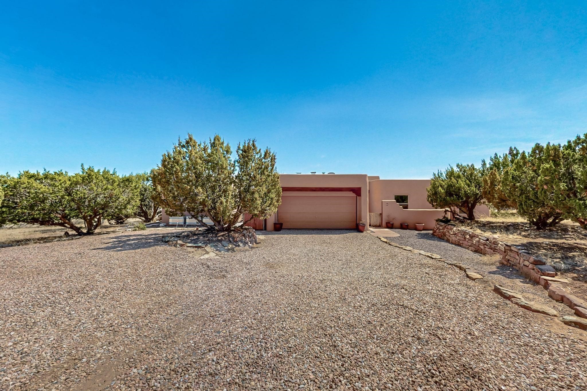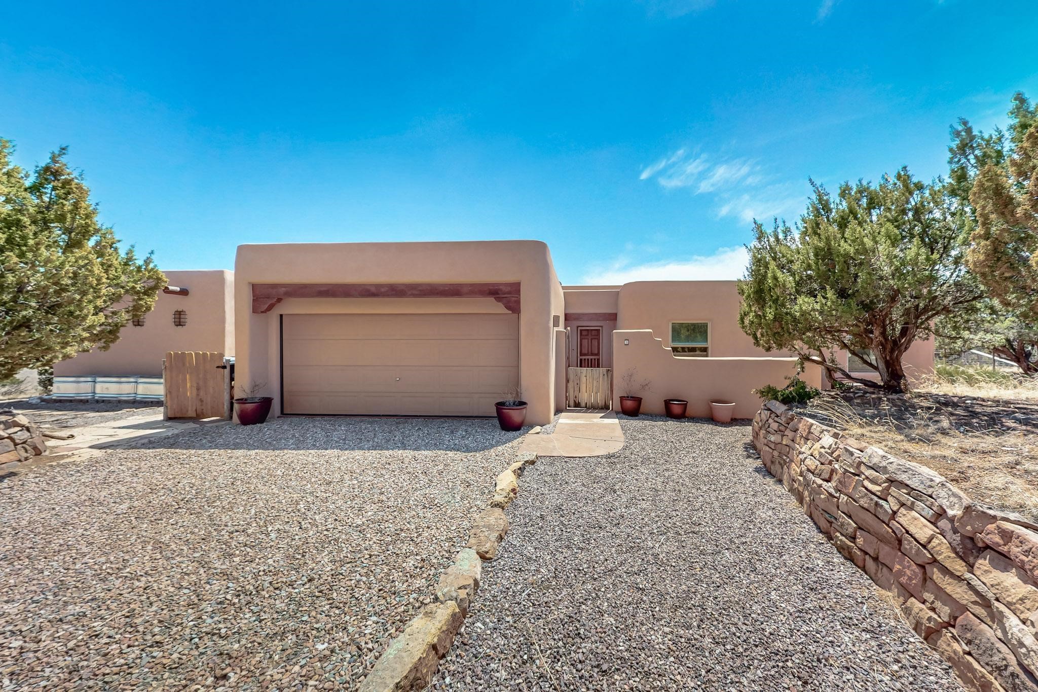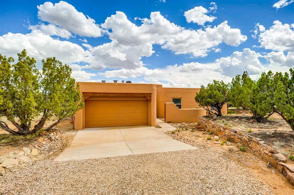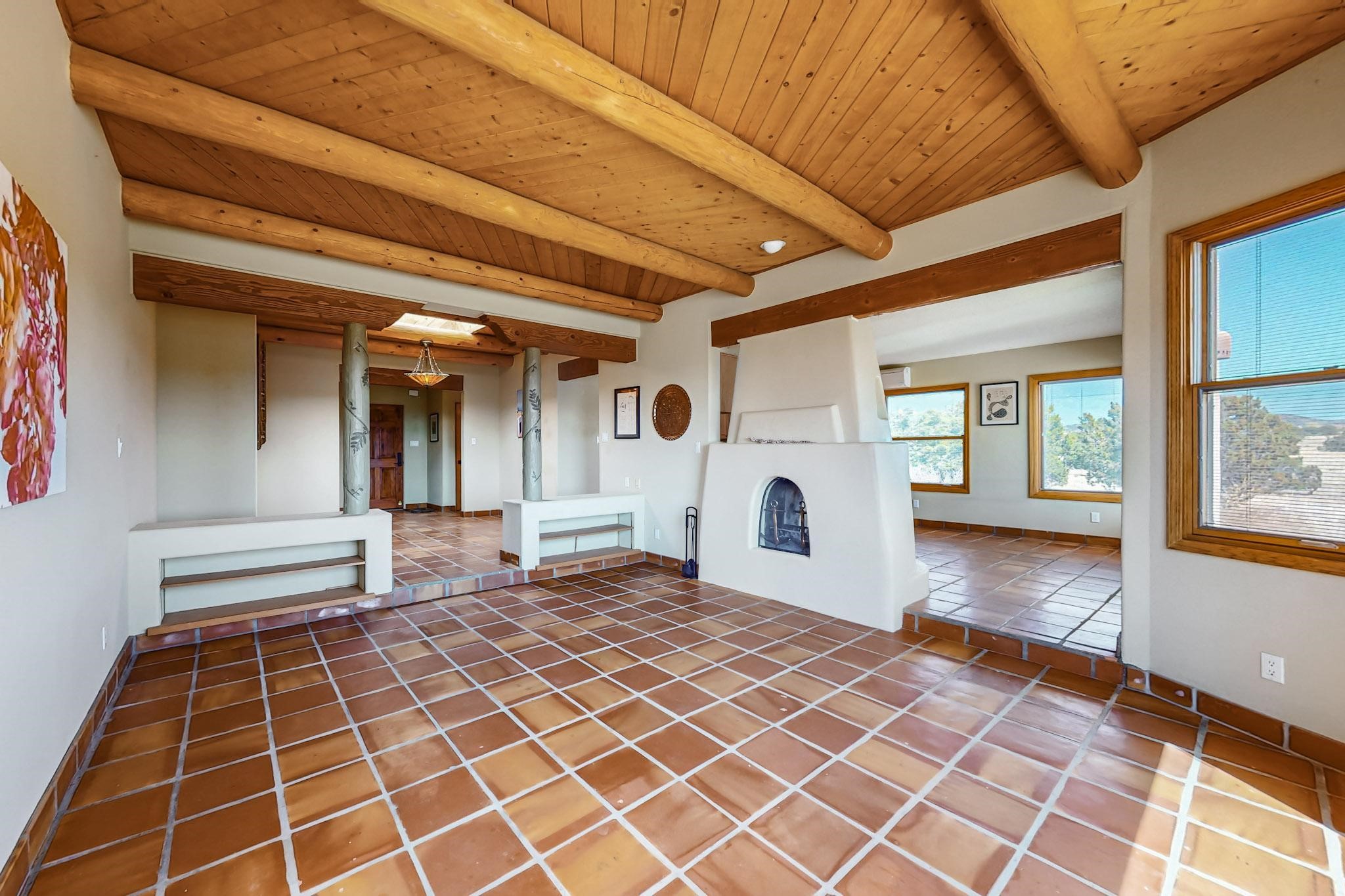 A rare find in Eldorado bordering a 62acre greenbelt dramatically visible through a large picture window on entering this home. Lovely romantic design custom built by Homes by Marie for the original artist owner in 1995 plus a detached studio added by the new artist owner only 3 years ago. A contemporary pueblo look with Santa Fe detailing throughout. A central 2 way kiva fireplace between the dining and living room, beam ceilings, Saltillo floors, bancos and carved twisted beams add southwest charm and character. Natural gas radiant heating, re stuccoed in 2019, community water, high speed internet and interior window blinds. One of the two guest bedrooms was originally a studio and has Saltillo tile, the other has an older carpet. The main bedroom suite, dining room and living room access the patio and fenced rear yard overlooking the greenbelt to sunset and mountain views, There is a large 2 car finished garage with plenty of parking, and a wonderful heat/ac studio, artist ready with a sink and plenty of storage. On 1.33 acres, centrally located in Eldorado within easy reach of all amenities, local shopping, schools, trails, parks, library and senior centre only minutes into Santa Fe.
