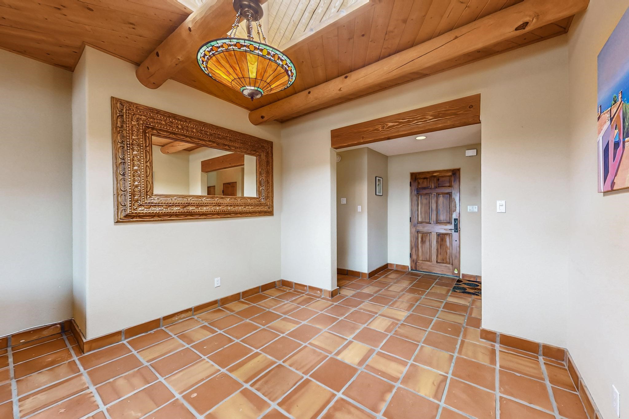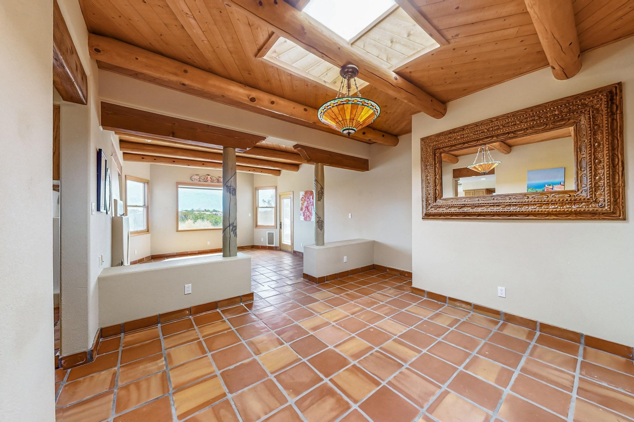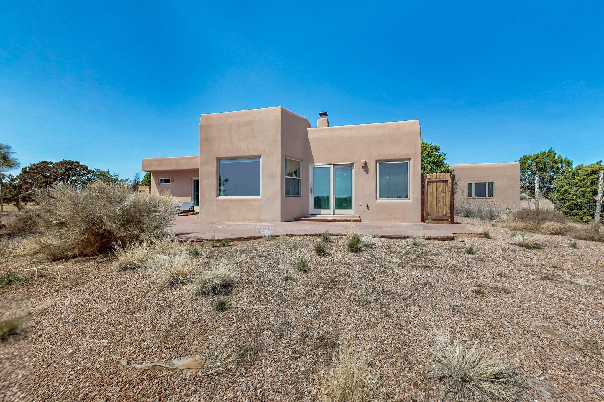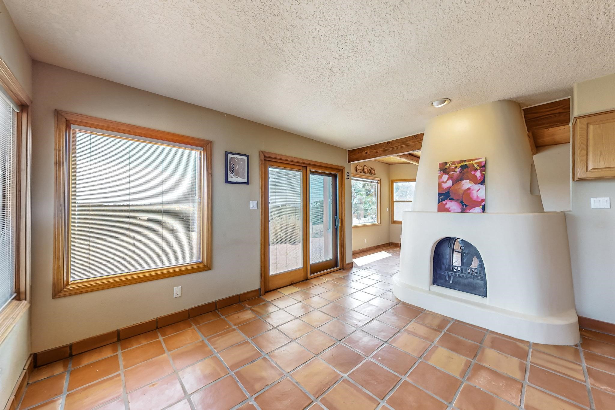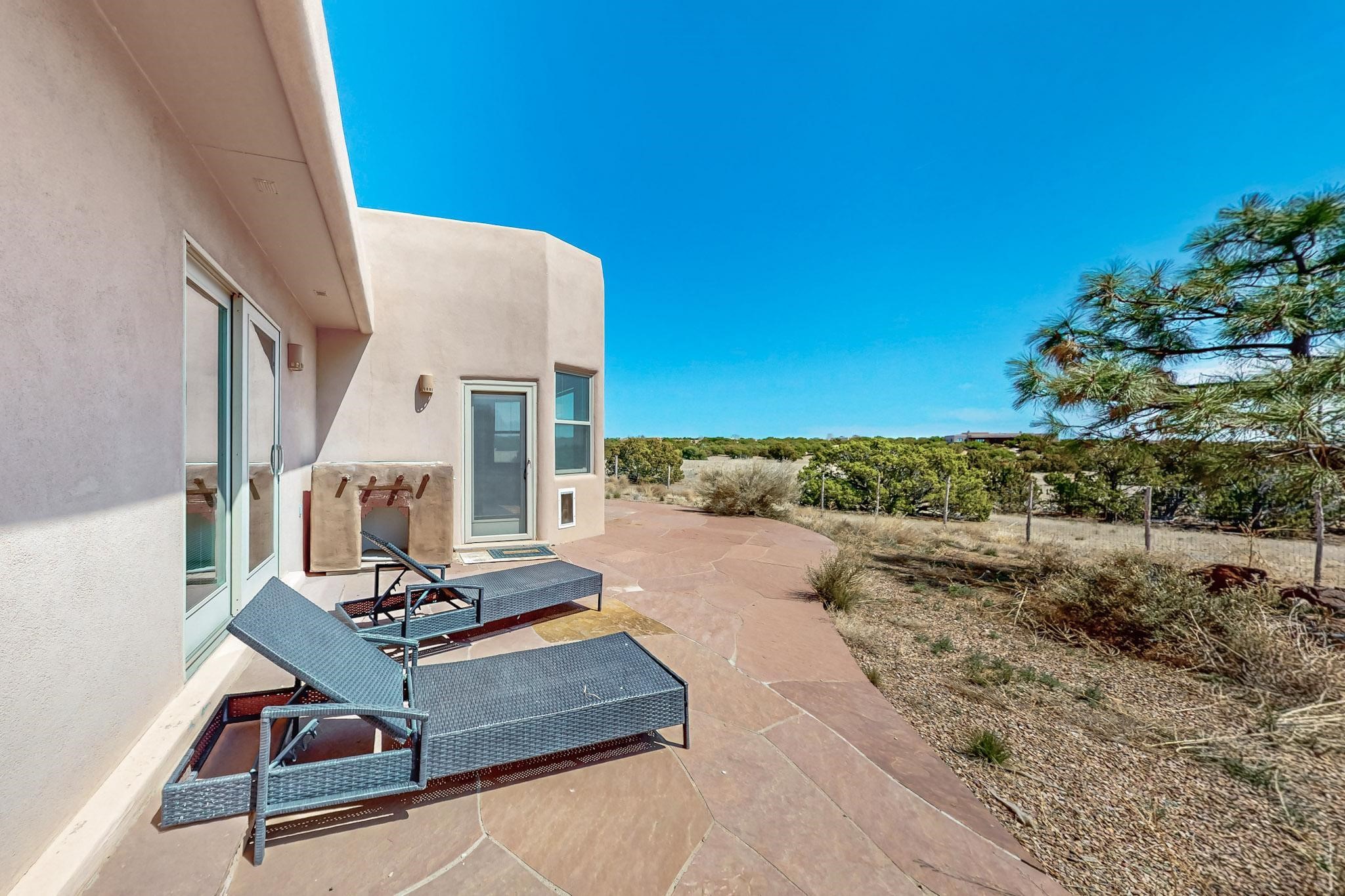 A rare find in Eldorado bordering a 62acre greenbelt dramatically visible through a large picture window on entering this home. Lovely romantic design custom built by Homes by Marie for the original artist owner in 1995 plus a detached studio added by the new artist owner only 3 years ago. A contemporary pueblo look with Santa Fe detailing throughout. A central 2 way kiva fireplace between the dining and living room, beam ceilings, Saltillo floors, bancos and carved twisted beams add southwest charm and character. Natural gas radiant heating, re stuccoed in 2019, community water, high speed internet and interior window blinds. One of the two guest bedrooms was originally a studio and has Saltillo tile, the other has an older carpet. The main bedroom suite, dining room and living room access the patio and fenced rear yard overlooking the greenbelt to sunset and mountain views, There is a large 2 car finished garage with plenty of parking, and a wonderful heat/ac studio, artist ready with a sink and plenty of storage. On 1.33 acres, centrally located in Eldorado within easy reach of all amenities, local shopping, schools, trails, parks, library and senior centre only minutes into Santa Fe.