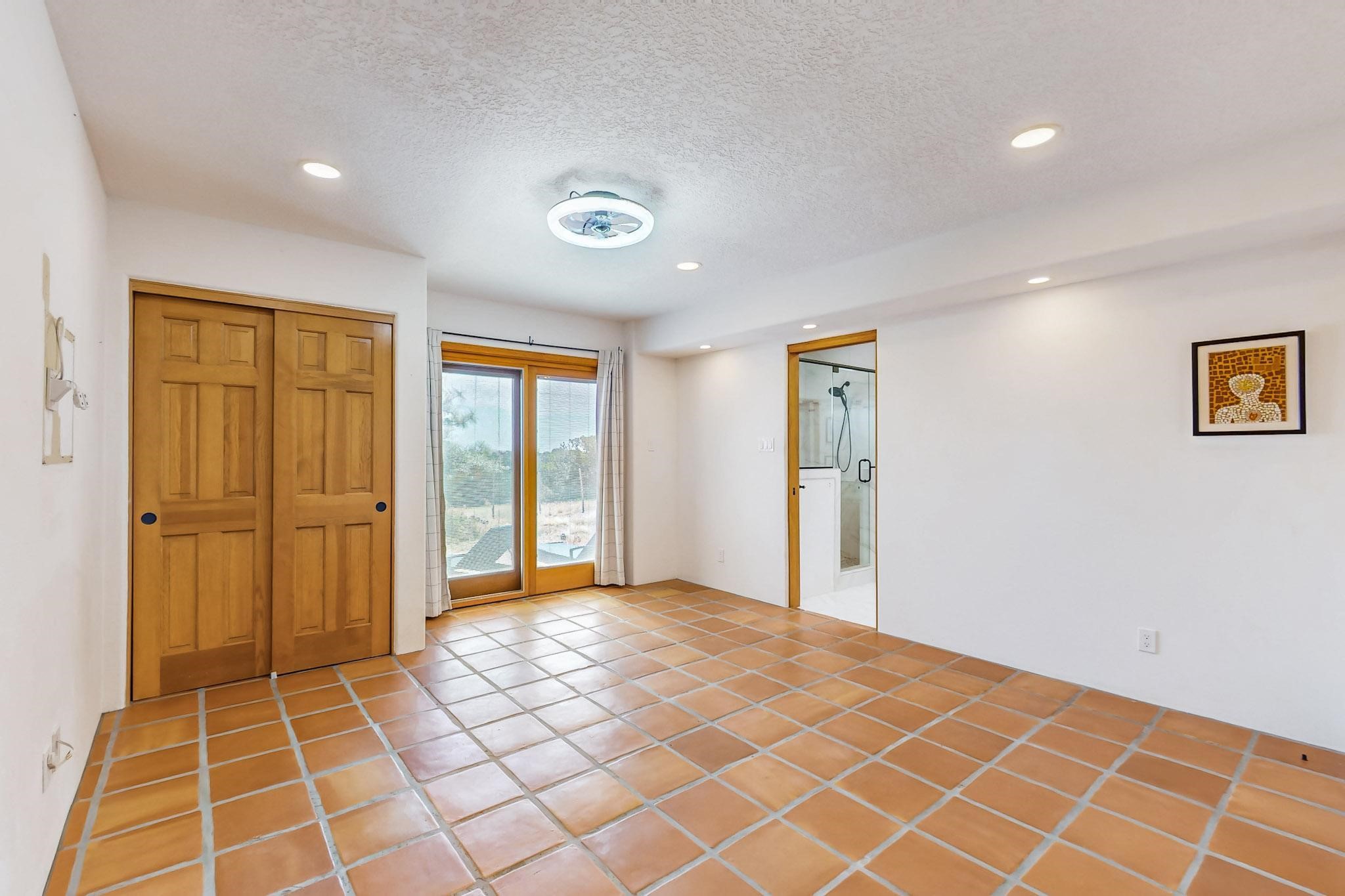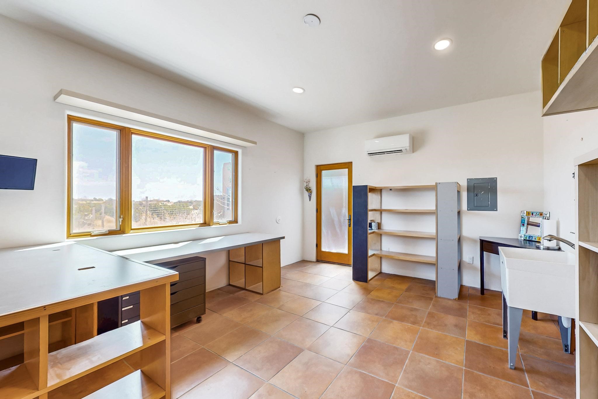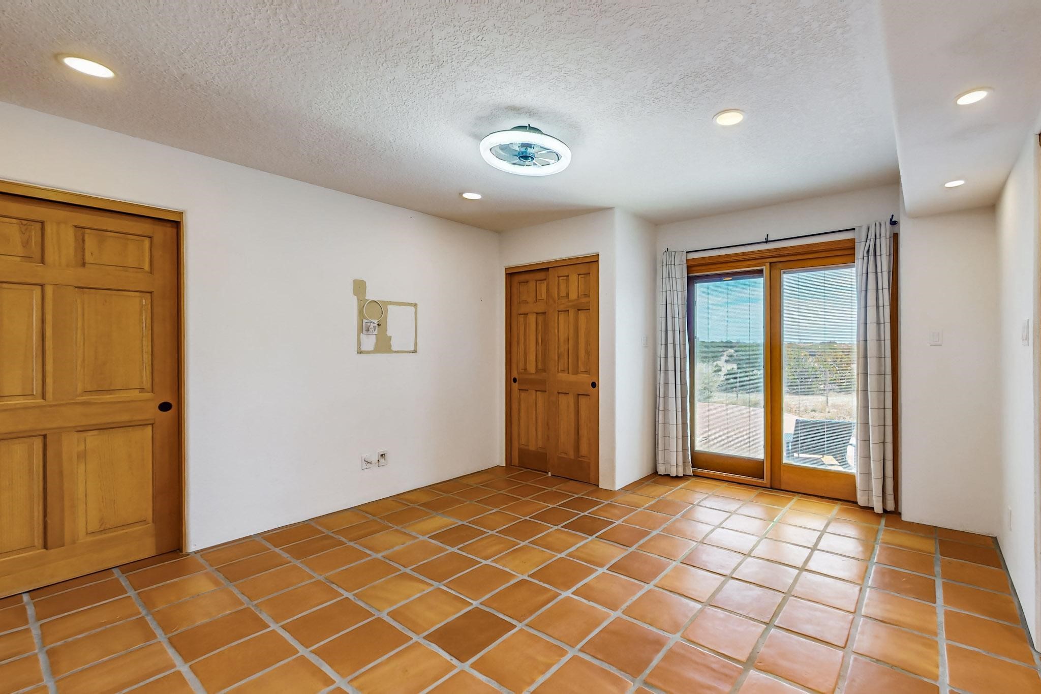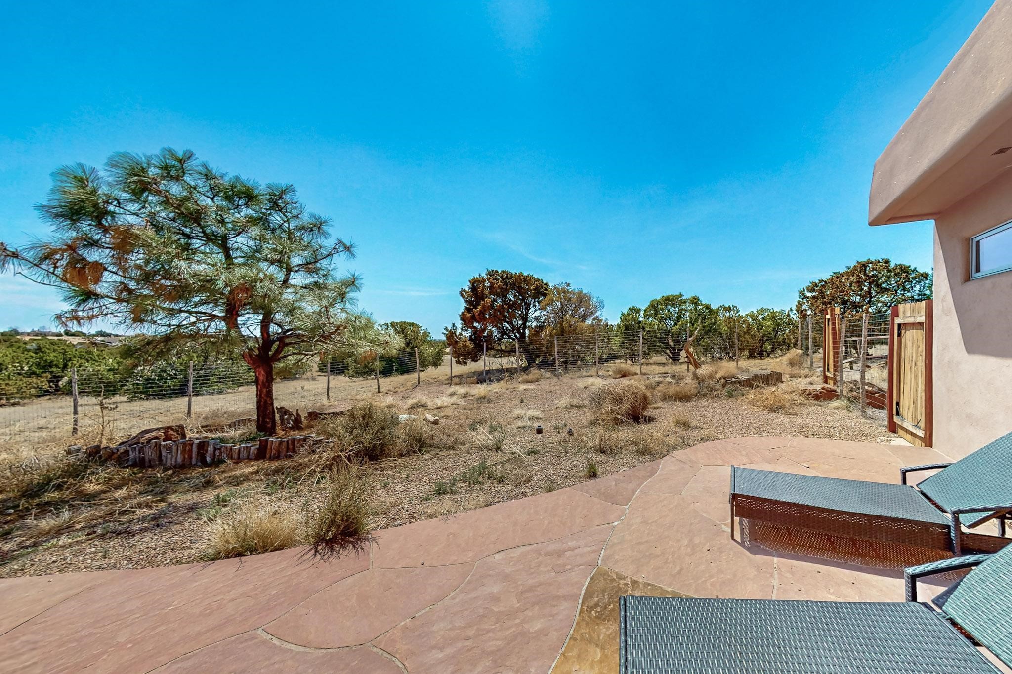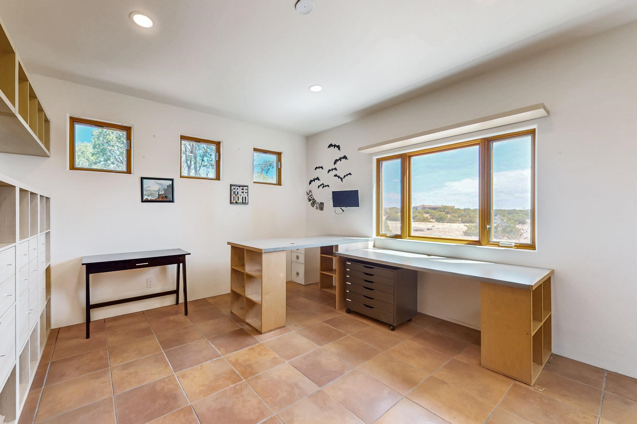 A rare find in Eldorado bordering a 62acre greenbelt dramatically visible through a large picture window on entering this home. Lovely romantic design custom built by Homes by Marie for the original artist owner in 1995 plus a detached studio added by the new artist owner only 3 years ago. A contemporary pueblo look with Santa Fe detailing throughout. A central 2 way kiva fireplace between the dining and living room, beam ceilings, Saltillo floors, bancos and carved twisted beams add southwest charm and character. Natural gas radiant heating, re stuccoed in 2019, community water, high speed internet and interior window blinds. One of the two guest bedrooms was originally a studio and has Saltillo tile, the other has an older carpet. The main bedroom suite, dining room and living room access the patio and fenced rear yard overlooking the greenbelt to sunset and mountain views, There is a large 2 car finished garage with plenty of parking, and a wonderful heat/ac studio, artist ready with a sink and plenty of storage. On 1.33 acres, centrally located in Eldorado within easy reach of all amenities, local shopping, schools, trails, parks, library and senior centre only minutes into Santa Fe.