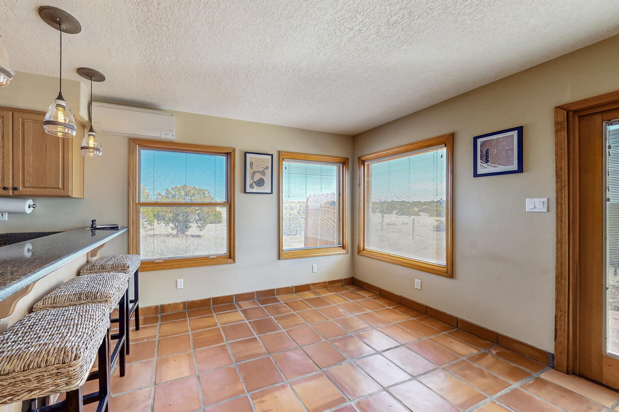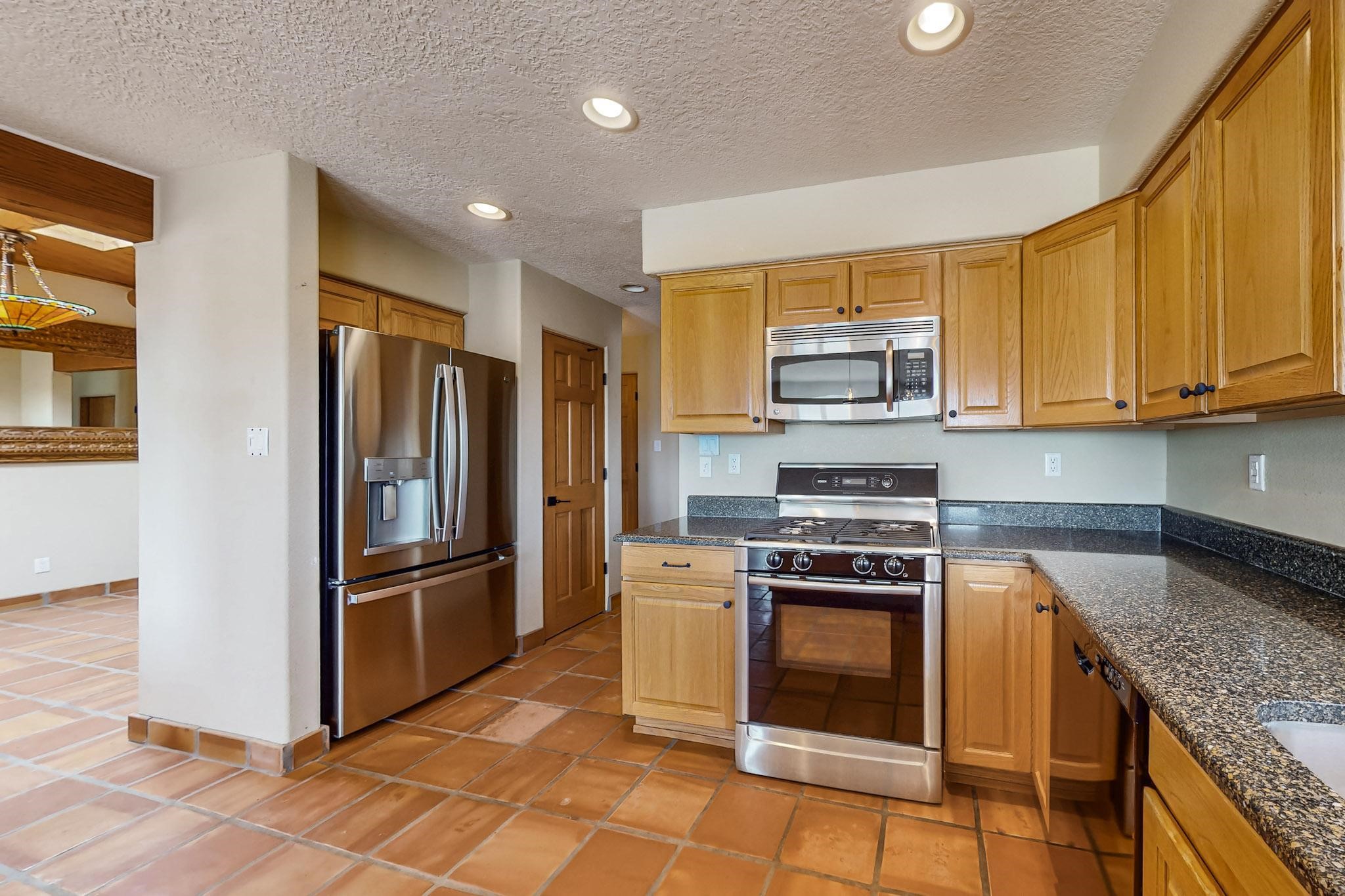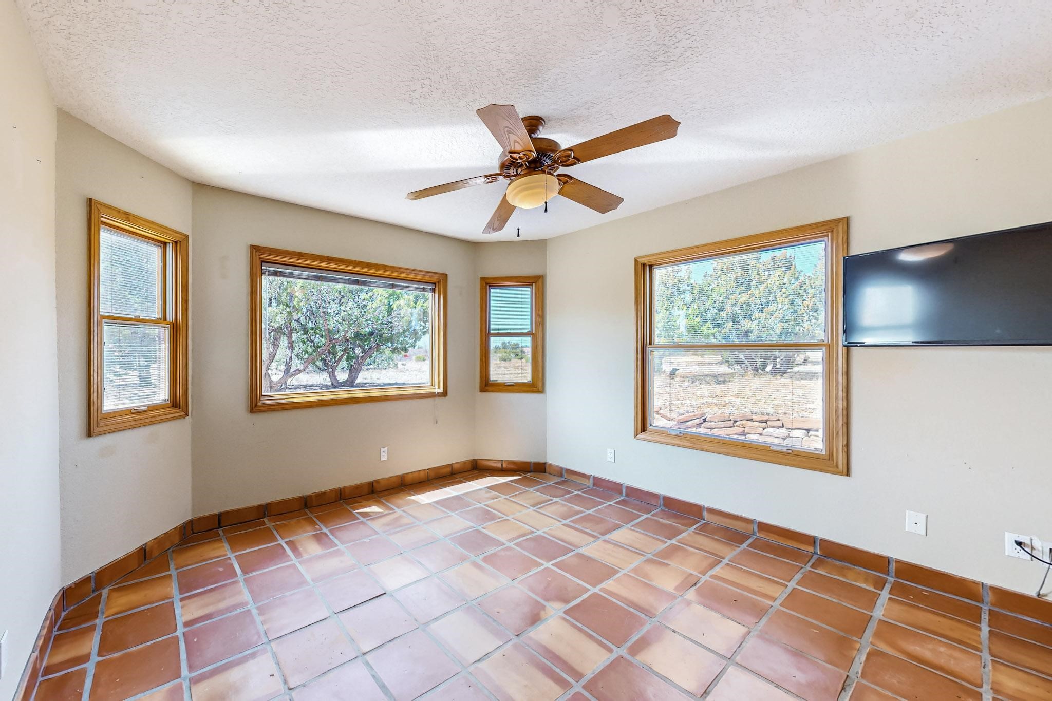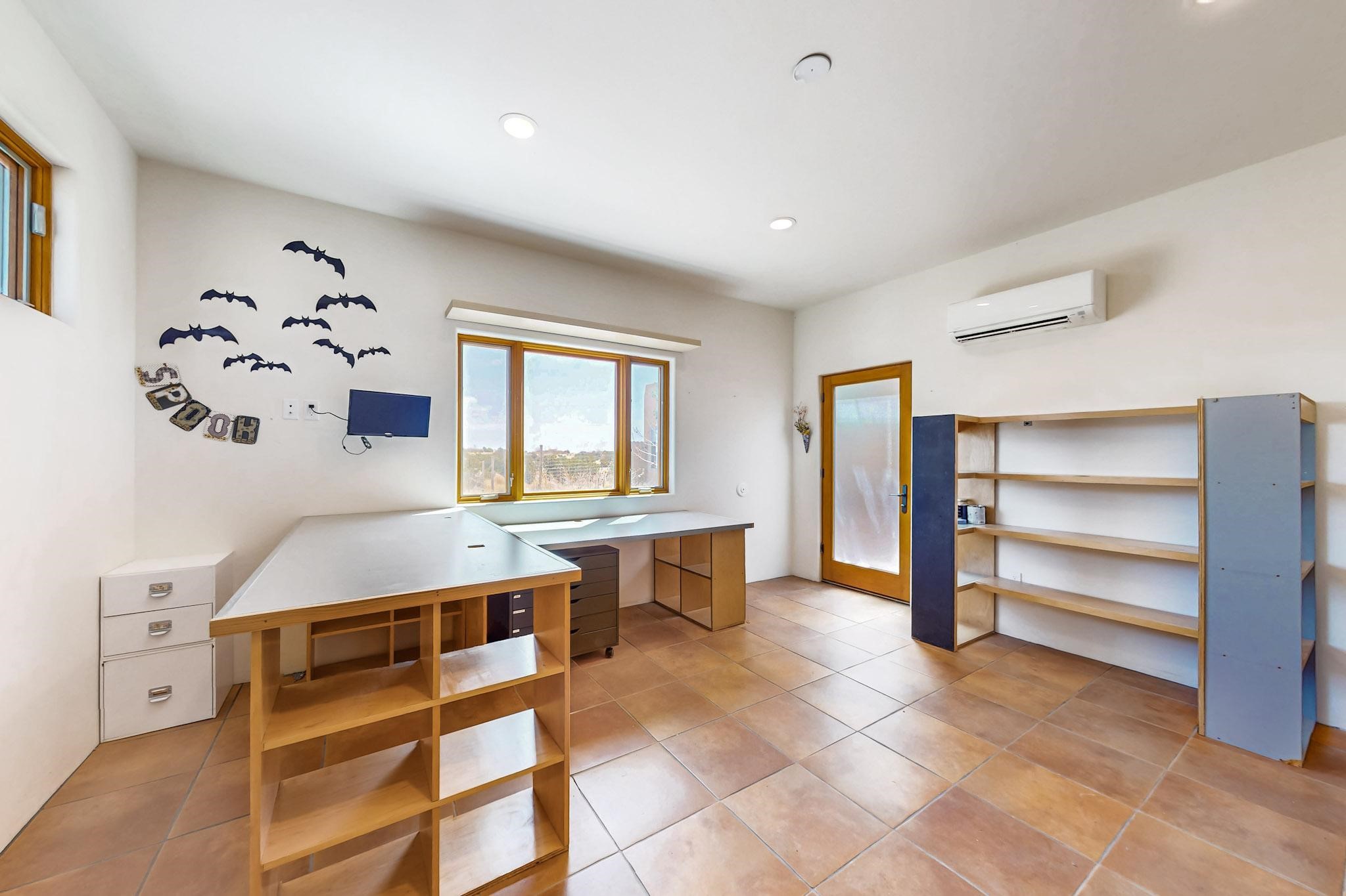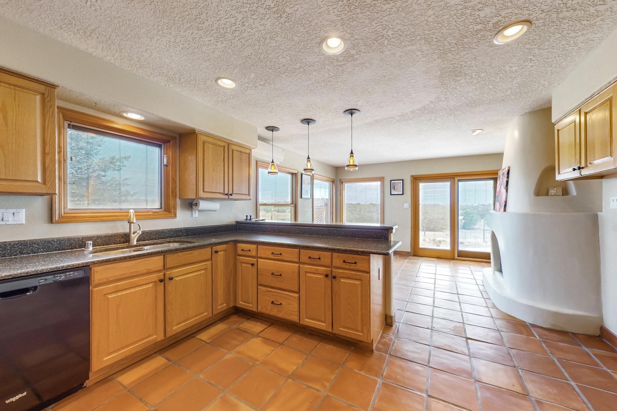 A rare find in Eldorado bordering a 62acre greenbelt dramatically visible through a large picture window on entering this home. Lovely romantic design custom built by Homes by Marie for the original artist owner in 1995 plus a detached studio added by the new artist owner only 3 years ago. A contemporary pueblo look with Santa Fe detailing throughout. A central 2 way kiva fireplace between the dining and living room, beam ceilings, Saltillo floors, bancos and carved twisted beams add southwest charm and character. Natural gas radiant heating, re stuccoed in 2019, community water, high speed internet and interior window blinds. One of the two guest bedrooms was originally a studio and has Saltillo tile, the other has an older carpet. The main bedroom suite, dining room and living room access the patio and fenced rear yard overlooking the greenbelt to sunset and mountain views, There is a large 2 car finished garage with plenty of parking, and a wonderful heat/ac studio, artist ready with a sink and plenty of storage. On 1.33 acres, centrally located in Eldorado within easy reach of all amenities, local shopping, schools, trails, parks, library and senior centre only minutes into Santa Fe.