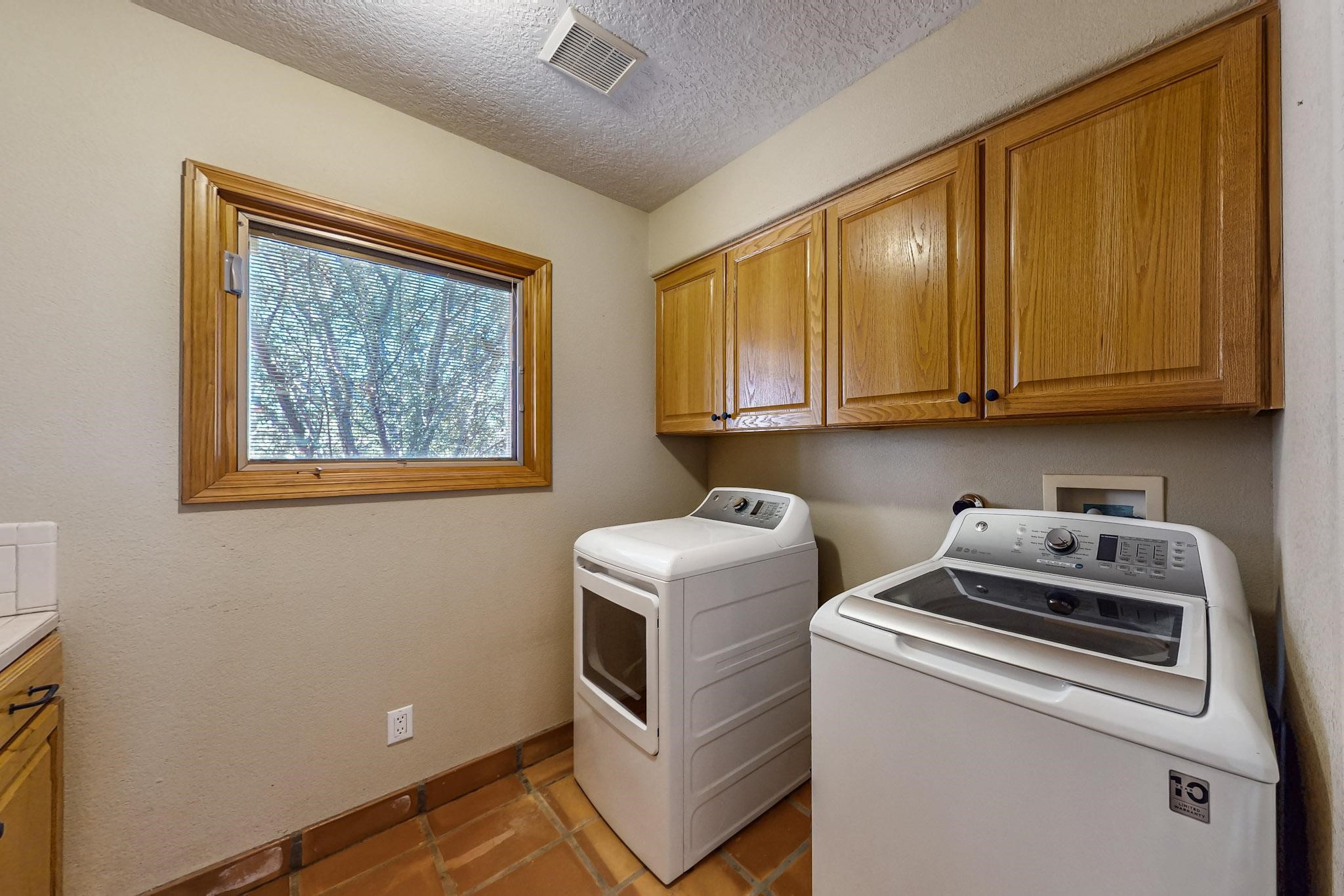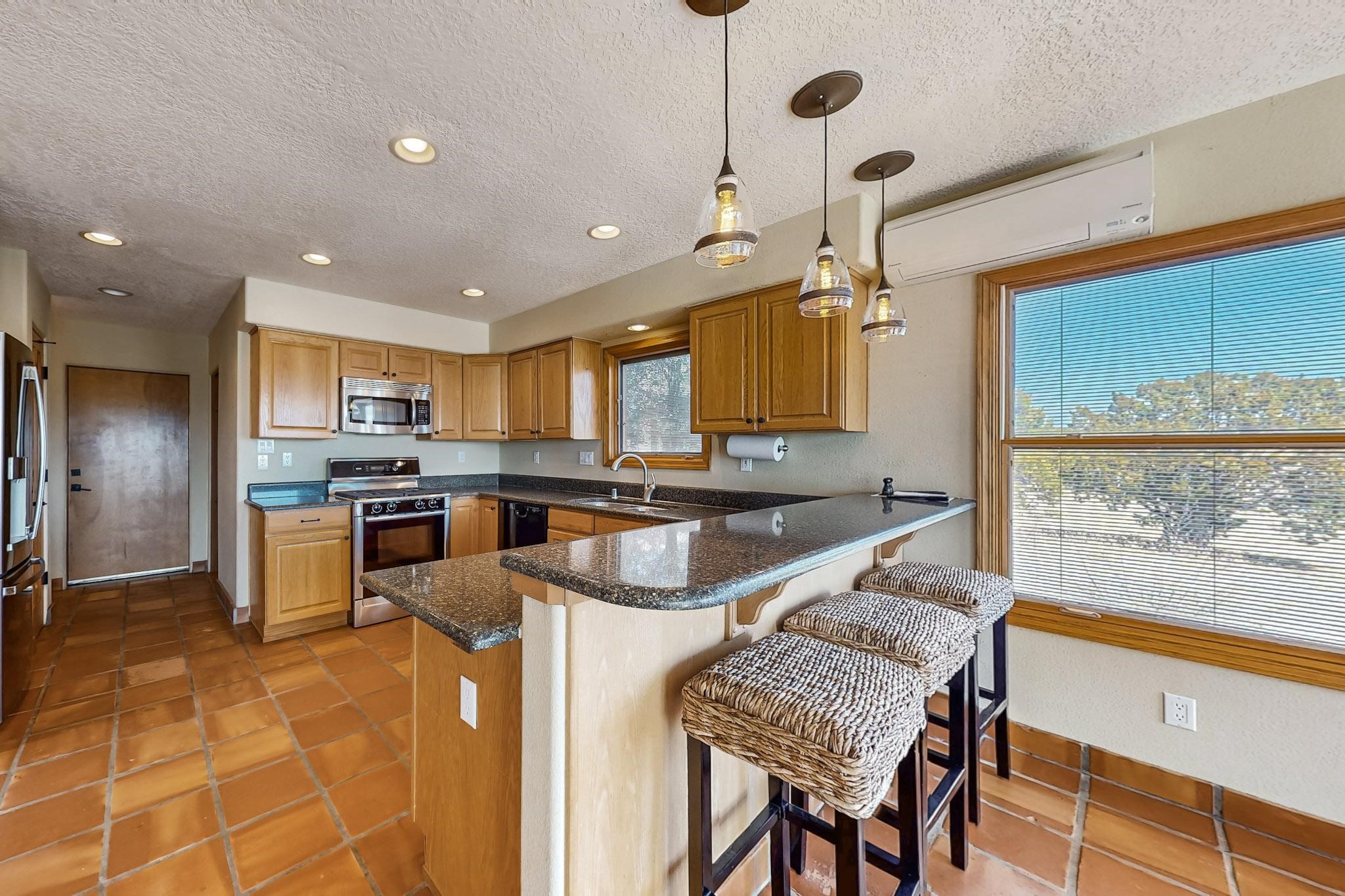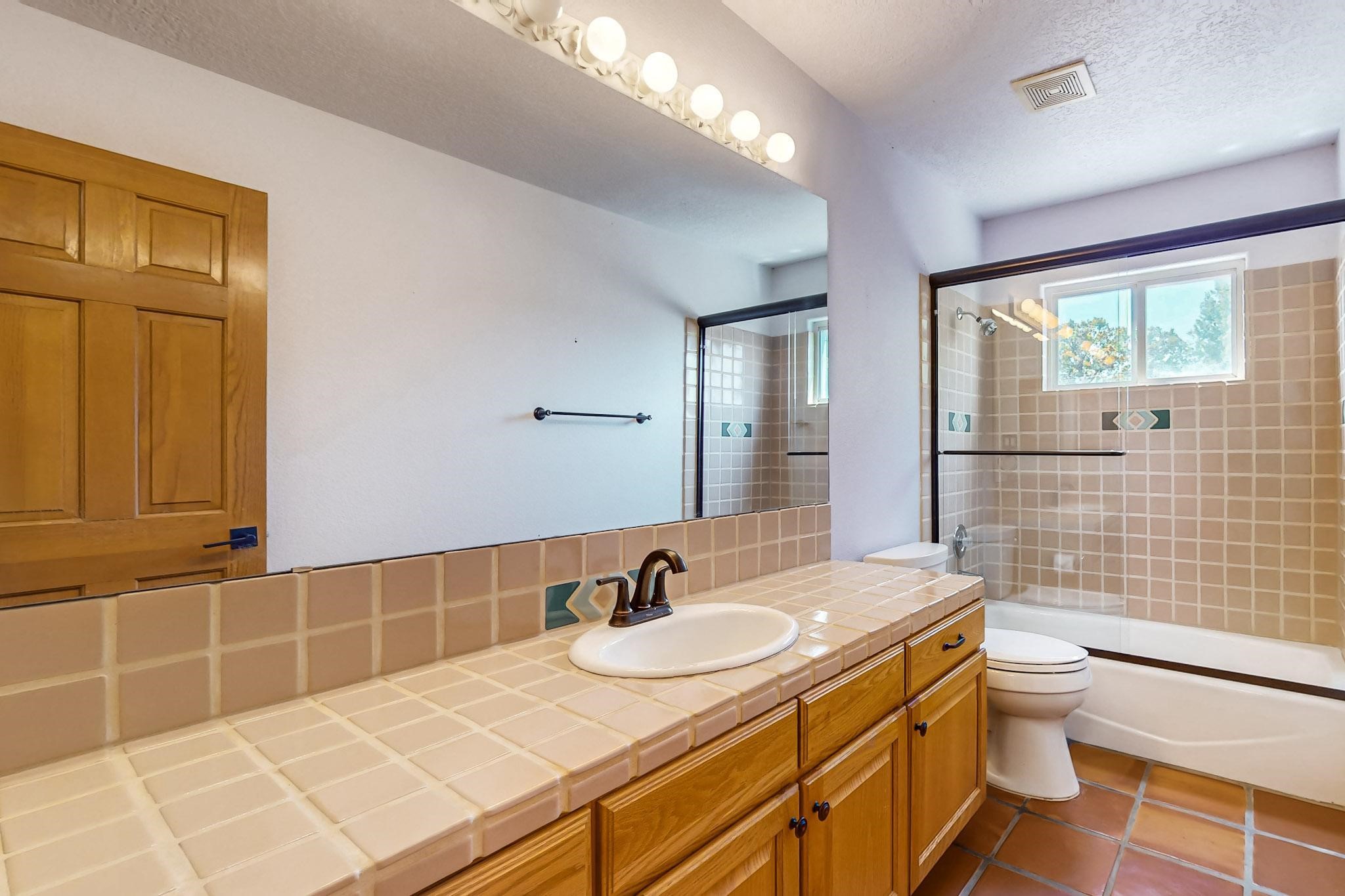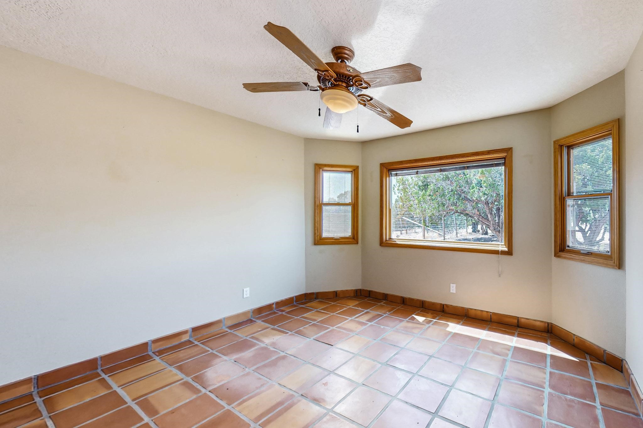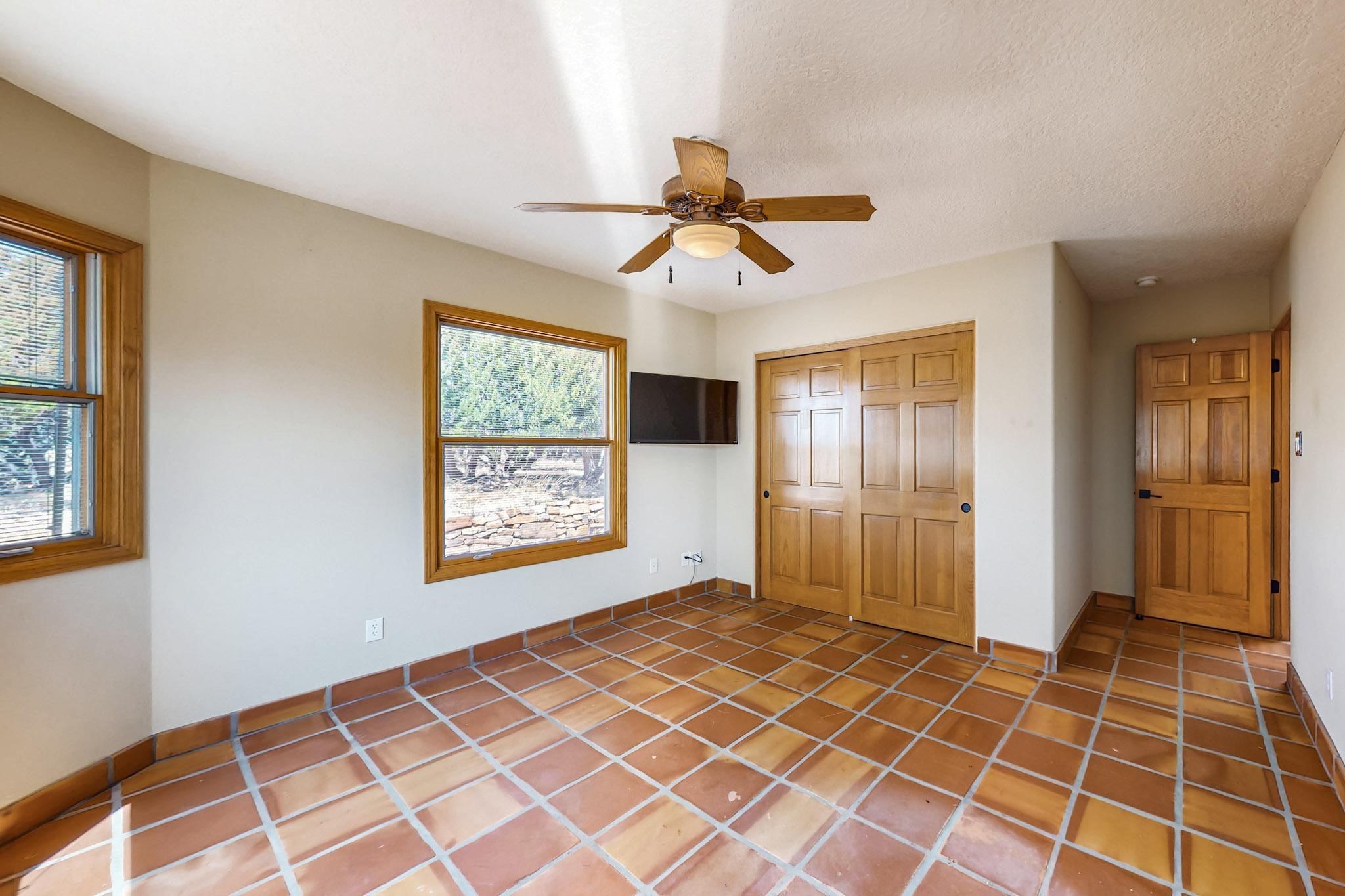A rare find in Eldorado bordering a 62acre greenbelt dramatically visible through a large picture window on entering this home. Lovely romantic design custom built by Homes by Marie for the original artist owner in 1995 plus a detached studio added by the new artist owner only 3 years ago. A contemporary pueblo look with Santa Fe detailing throughout. A central 2 way kiva fireplace between the dining and living room, beam ceilings, Saltillo floors, bancos and carved twisted beams add southwest charm and character. Natural gas radiant heating, re stuccoed in 2019, community water, high speed internet and interior window blinds. One of the two guest bedrooms was originally a studio and has Saltillo tile, the other has an older carpet. The main bedroom suite, dining room and living room access the patio and fenced rear yard overlooking the greenbelt to sunset and mountain views, There is a large 2 car finished garage with plenty of parking, and a wonderful heat/ac studio, artist ready with a sink and plenty of storage. On 1.33 acres, centrally located in Eldorado within easy reach of all amenities, local shopping, schools, trails, parks, library and senior centre only minutes into Santa Fe.