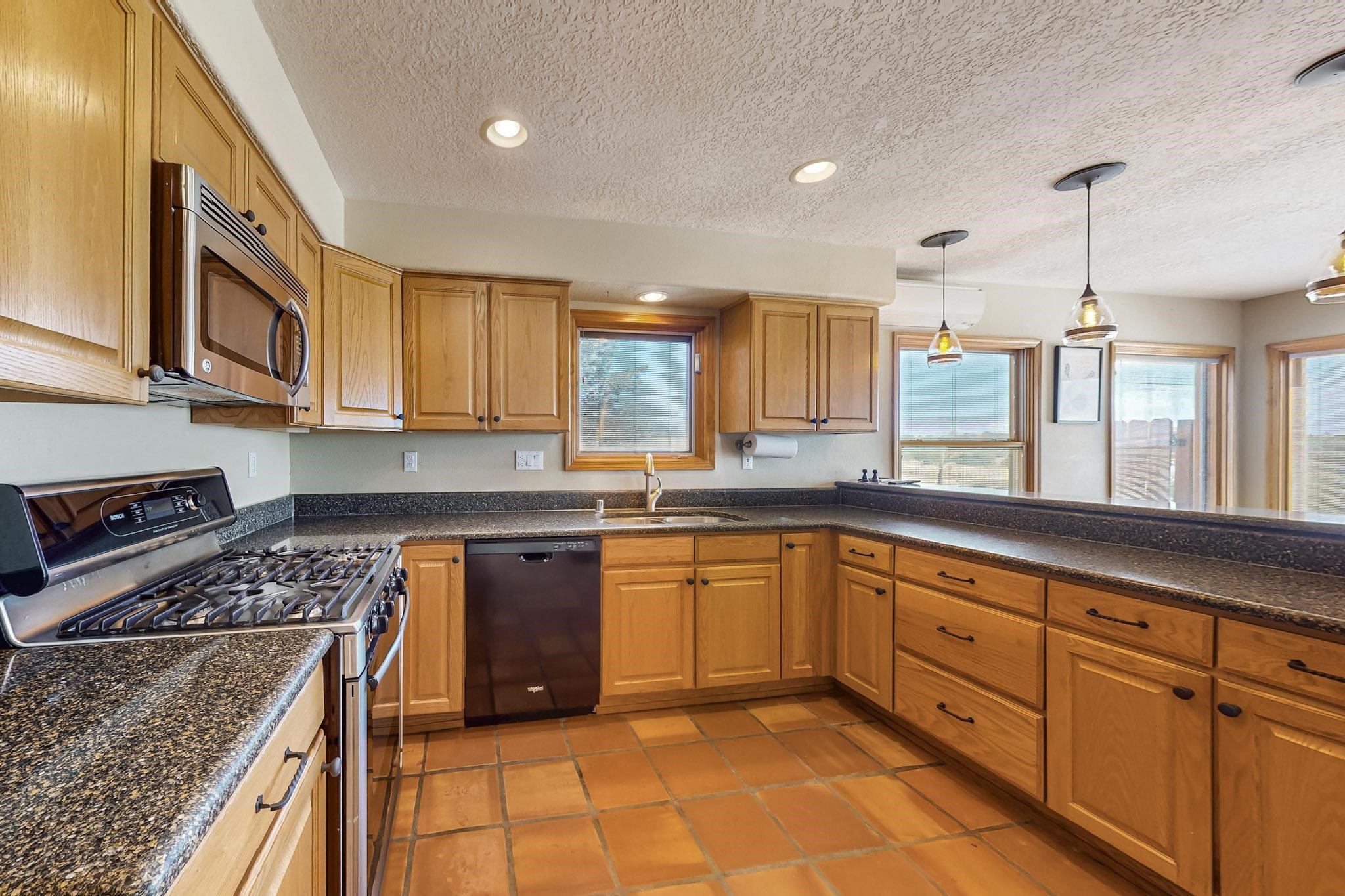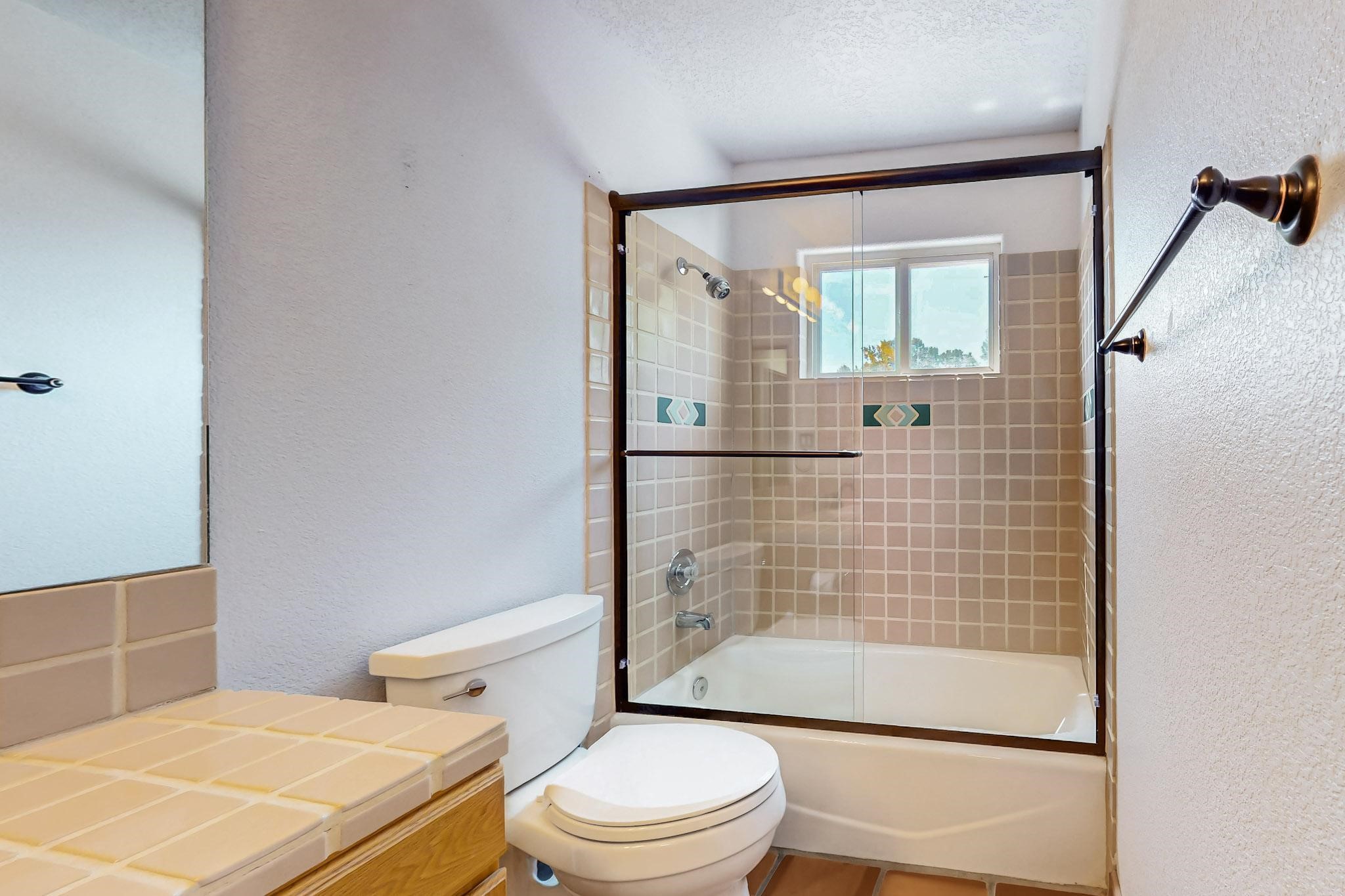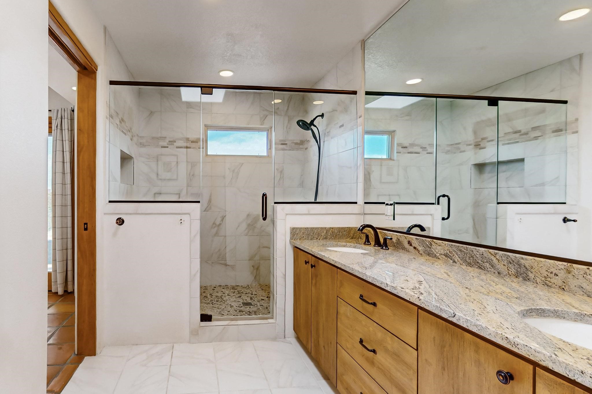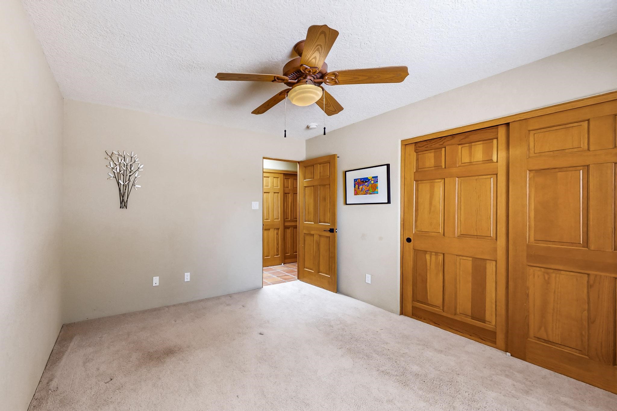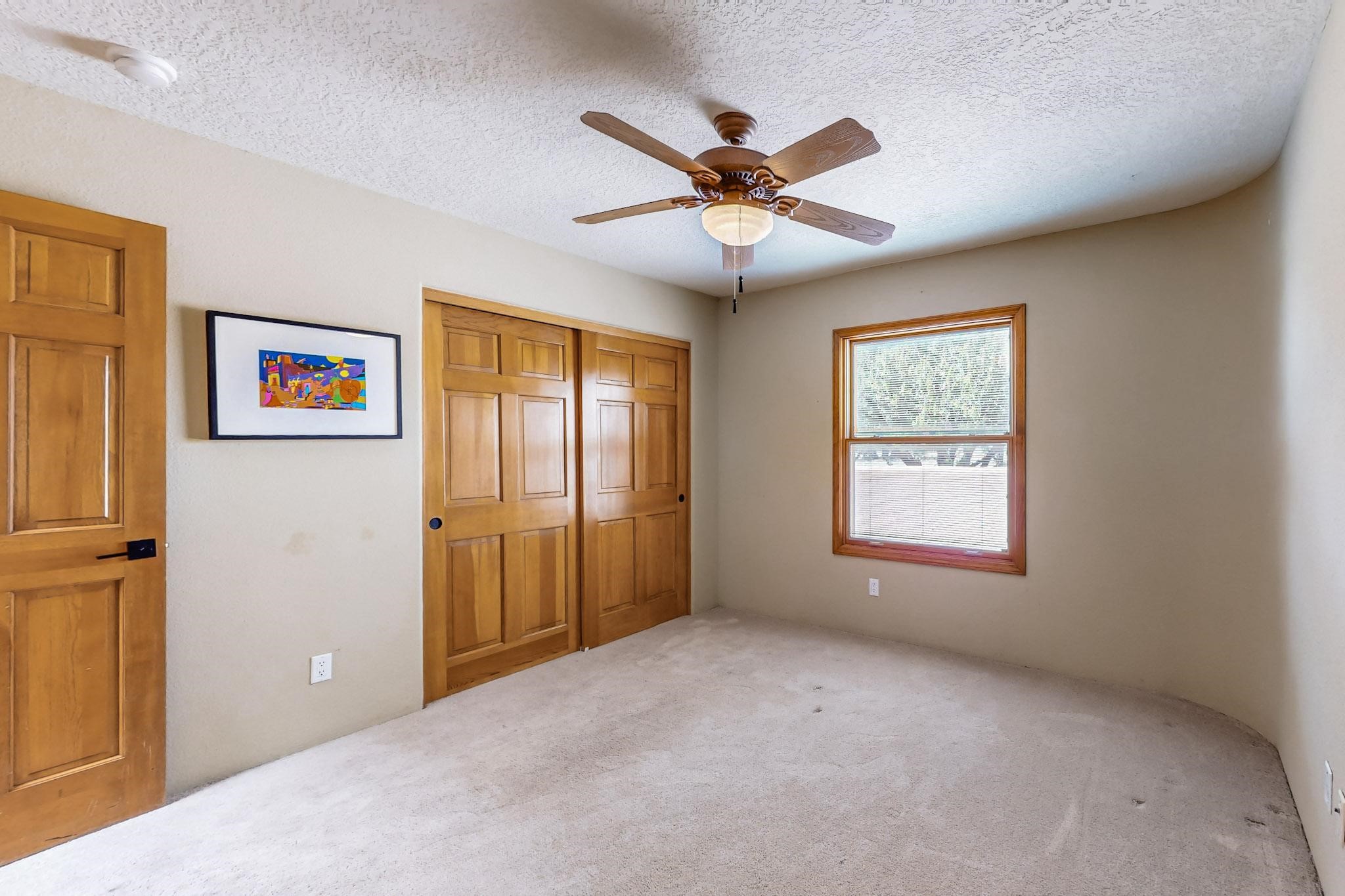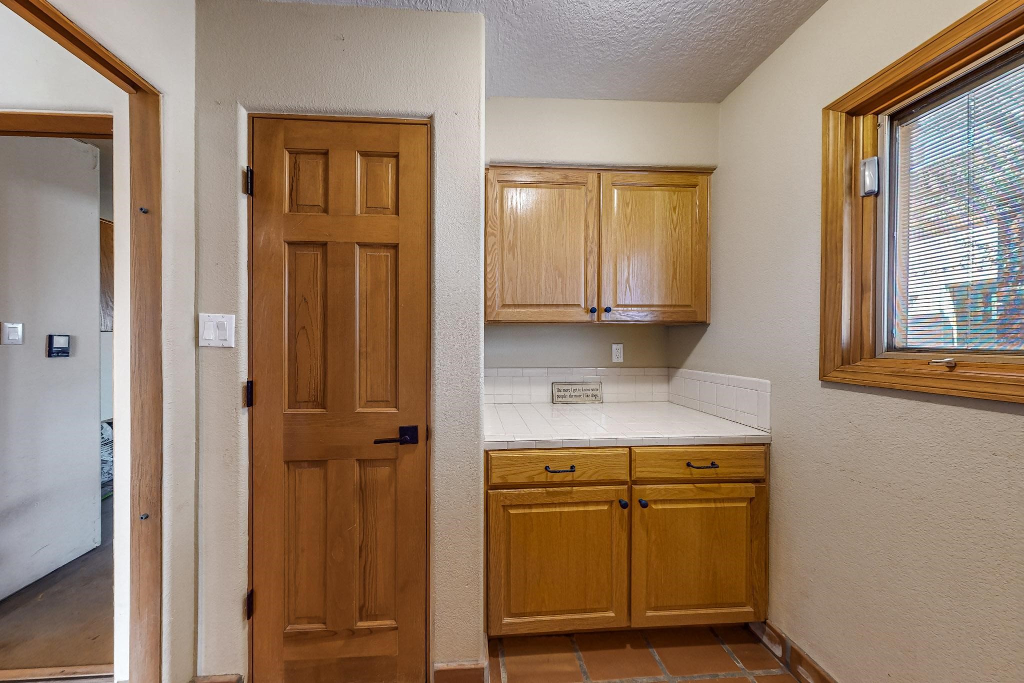 A rare find in Eldorado bordering a 62acre greenbelt dramatically visible through a large picture window on entering this home. Lovely romantic design custom built by Homes by Marie for the original artist owner in 1995 plus a detached studio added by the new artist owner only 3 years ago. A contemporary pueblo look with Santa Fe detailing throughout. A central 2 way kiva fireplace between the dining and living room, beam ceilings, Saltillo floors, bancos and carved twisted beams add southwest charm and character. Natural gas radiant heating, re stuccoed in 2019, community water, high speed internet and interior window blinds. One of the two guest bedrooms was originally a studio and has Saltillo tile, the other has an older carpet. The main bedroom suite, dining room and living room access the patio and fenced rear yard overlooking the greenbelt to sunset and mountain views, There is a large 2 car finished garage with plenty of parking, and a wonderful heat/ac studio, artist ready with a sink and plenty of storage. On 1.33 acres, centrally located in Eldorado within easy reach of all amenities, local shopping, schools, trails, parks, library and senior centre only minutes into Santa Fe.