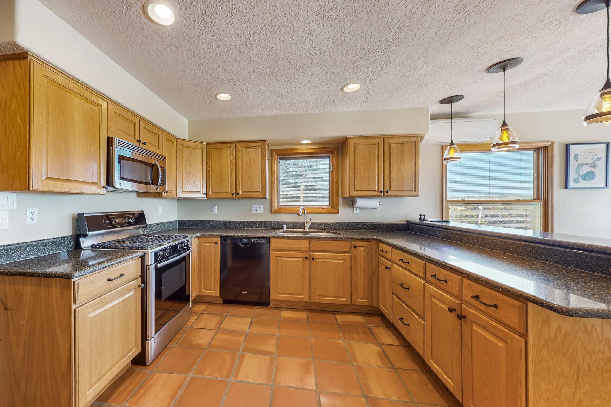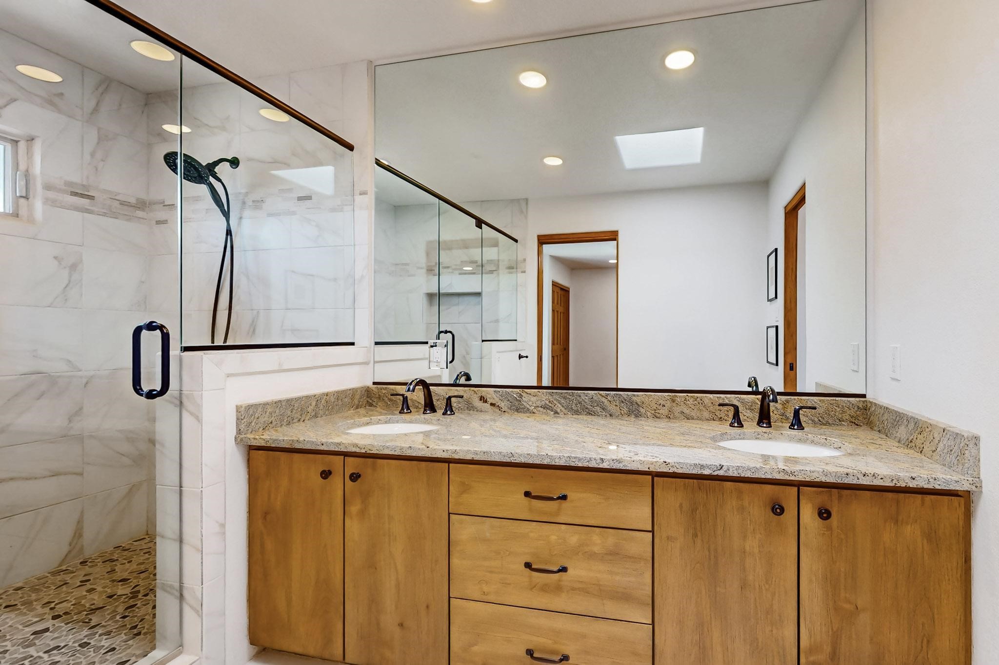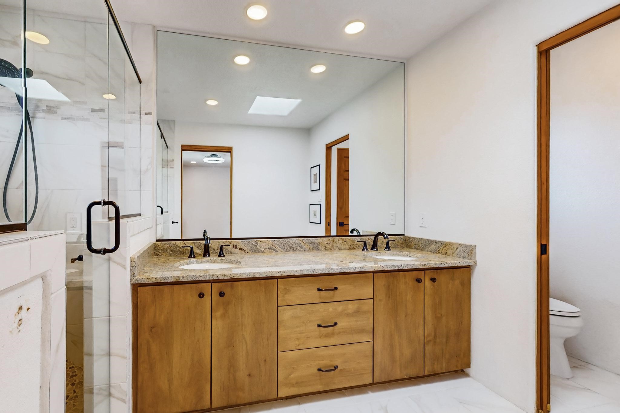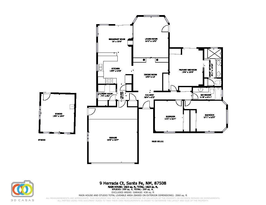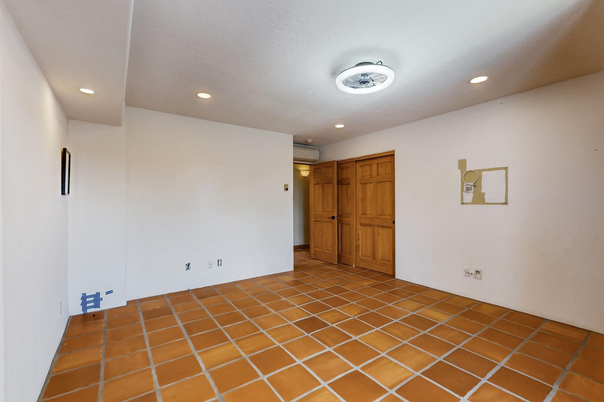 A rare find in Eldorado bordering a 62acre greenbelt dramatically visible through a large picture window on entering this home. Lovely romantic design custom built by Homes by Marie for the original artist owner in 1995 plus a detached studio added by the new artist owner only 3 years ago. A contemporary pueblo look with Santa Fe detailing throughout. A central 2 way kiva fireplace between the dining and living room, beam ceilings, Saltillo floors, bancos and carved twisted beams add southwest charm and character. Natural gas radiant heating, re stuccoed in 2019, community water, high speed internet and interior window blinds. One of the two guest bedrooms was originally a studio and has Saltillo tile, the other has an older carpet. The main bedroom suite, dining room and living room access the patio and fenced rear yard overlooking the greenbelt to sunset and mountain views, There is a large 2 car finished garage with plenty of parking, and a wonderful heat/ac studio, artist ready with a sink and plenty of storage. On 1.33 acres, centrally located in Eldorado within easy reach of all amenities, local shopping, schools, trails, parks, library and senior centre only minutes into Santa Fe.