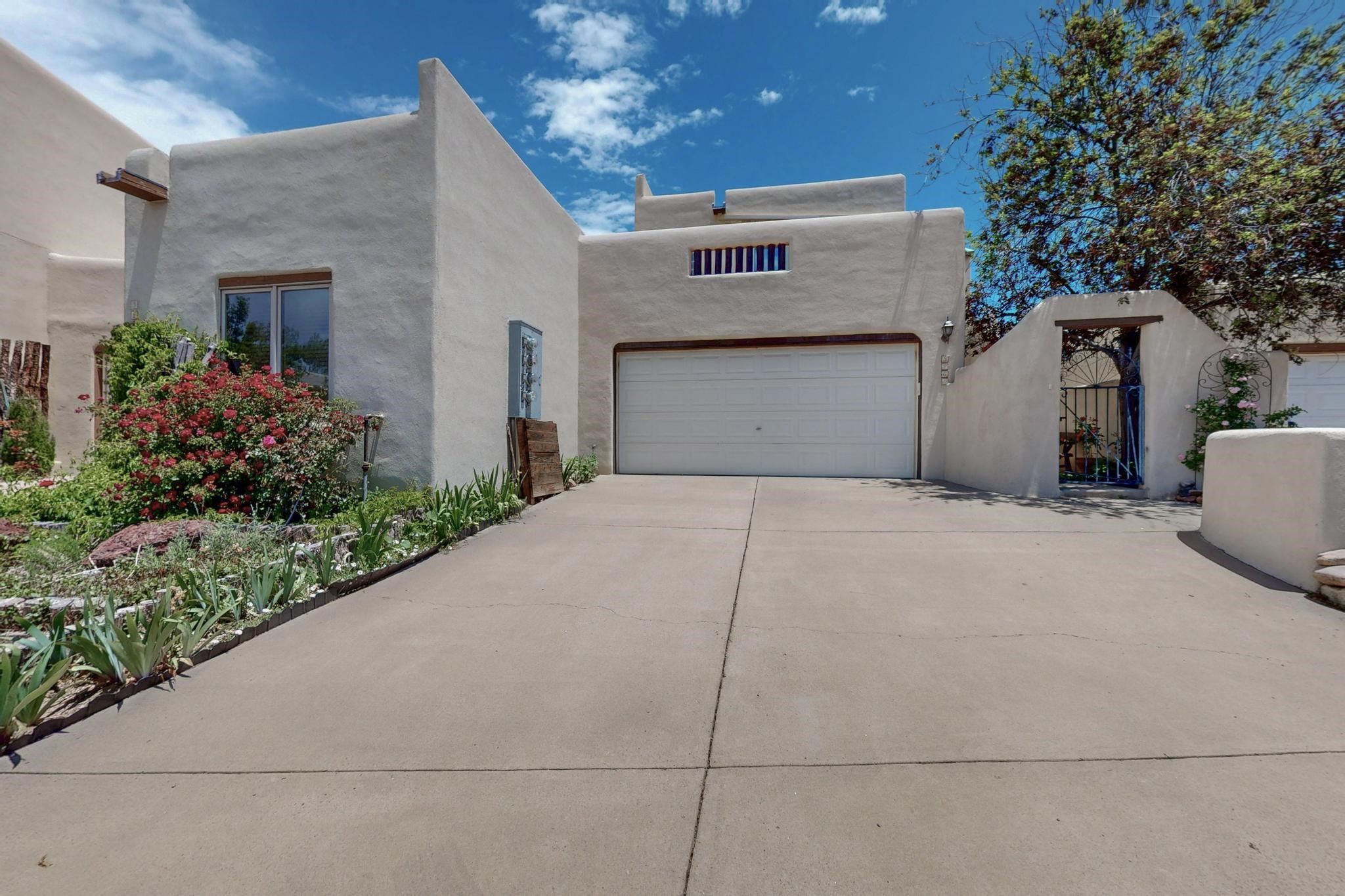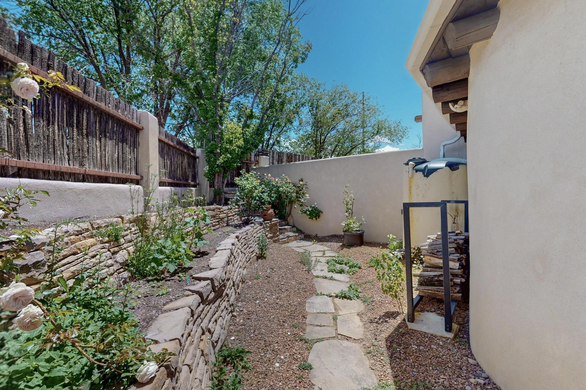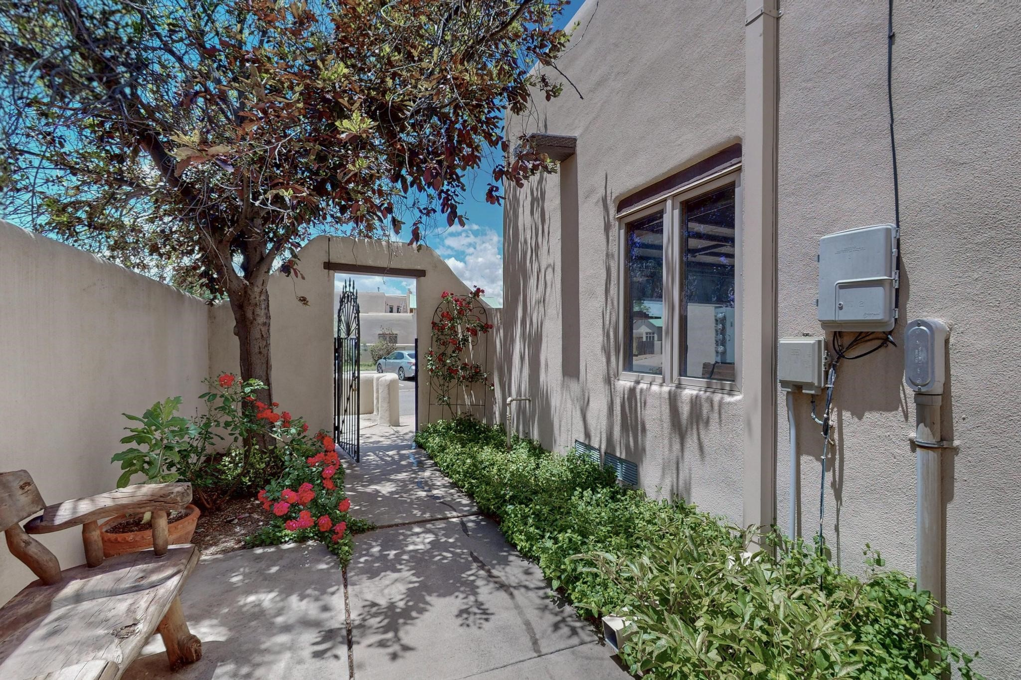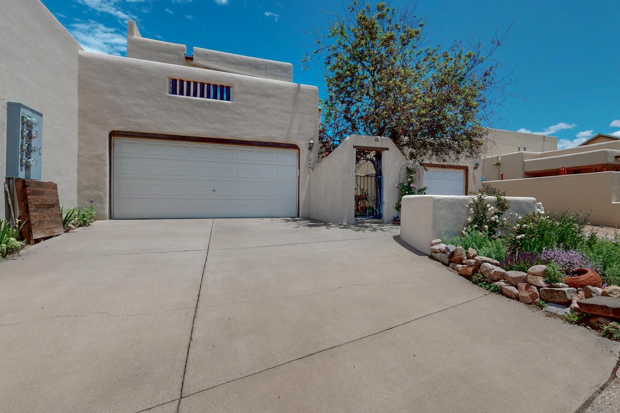 This charming Santa Fe home blends classic Southwestern character with thoughtful modern updates. A standout feature is the large room addition at the back, a true showpiece with traditional vigas, an elaborate built-in banco, oversized tile flooring, and a striking kiva fireplace. This spacious and versatile area can serve as a second living room, a creative studio, or an entertainment space. The home also boasts new kitchen appliances, radiant heat floors for cozy winter living, and two kiva fireplaces that add warmth and Southwestern charm. Two upstairs decks extend from each bedroom, providing private outdoor spaces perfect for relaxation. The interior has been freshly painted, giving the home a clean, move-in ready feel. The lush, colorful garden is complemented by a cistern system, offering an eco-friendly solution for watering. This home invites both comfort and functionality, with Santa Fe style at its core.