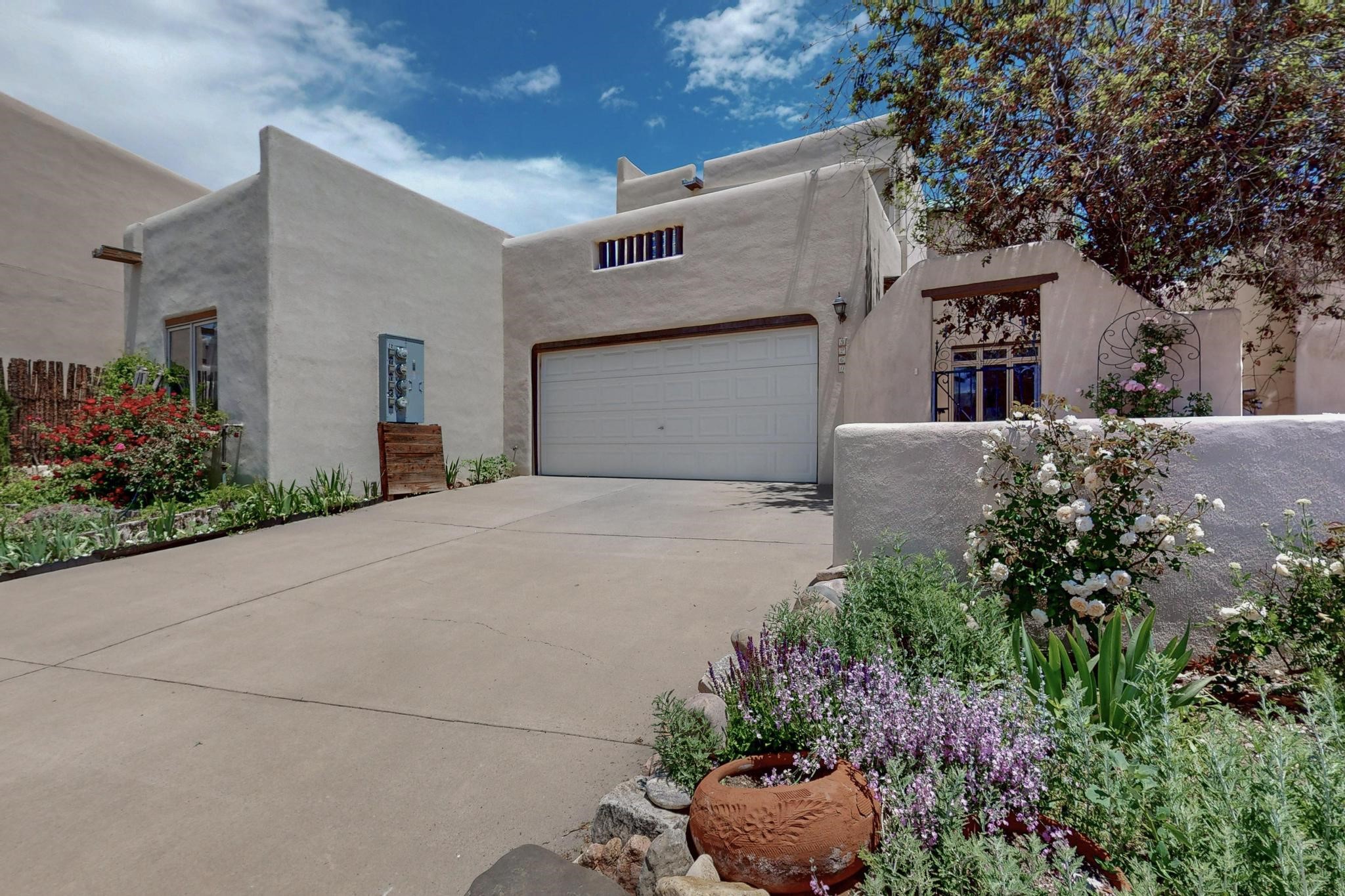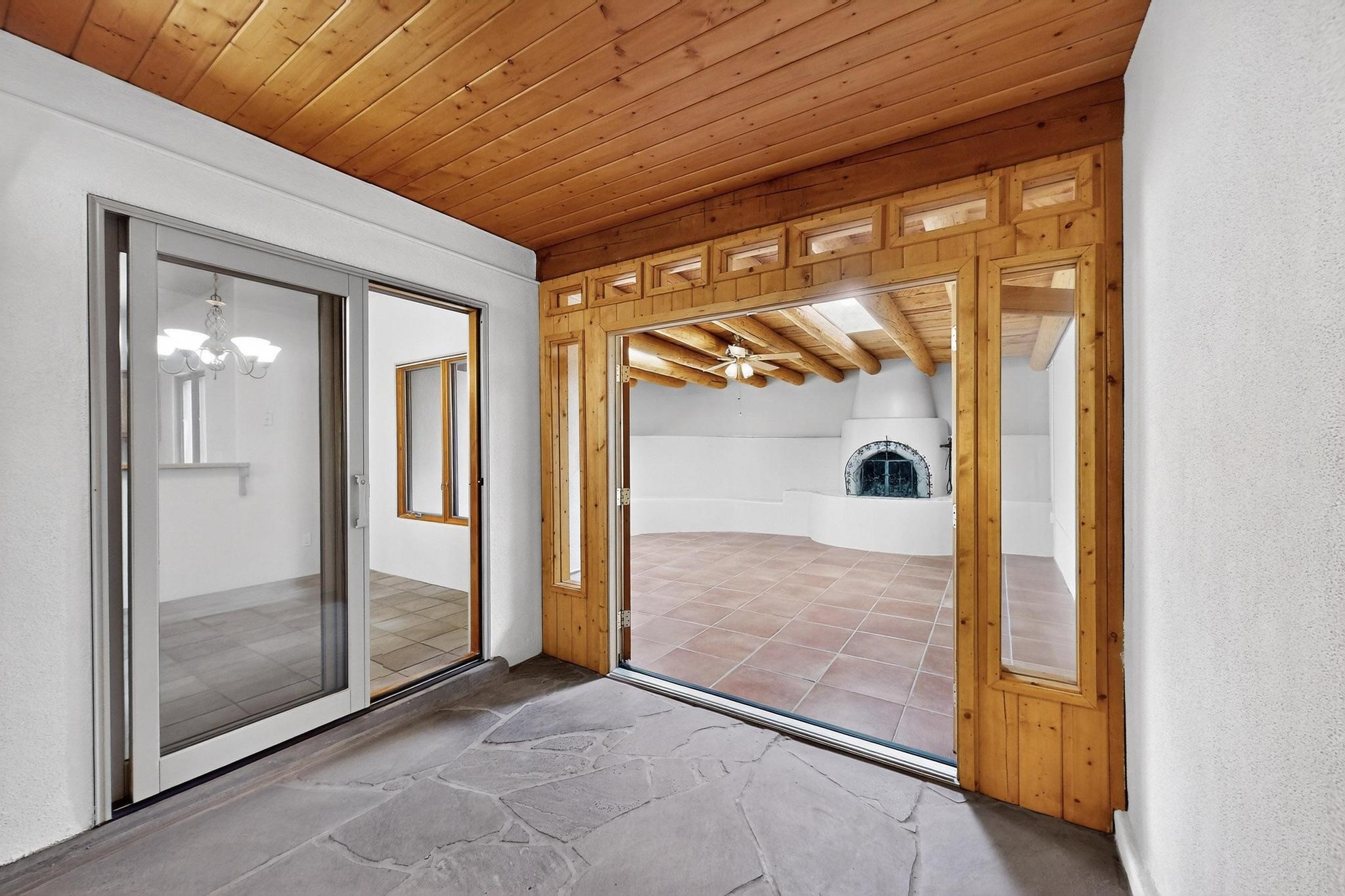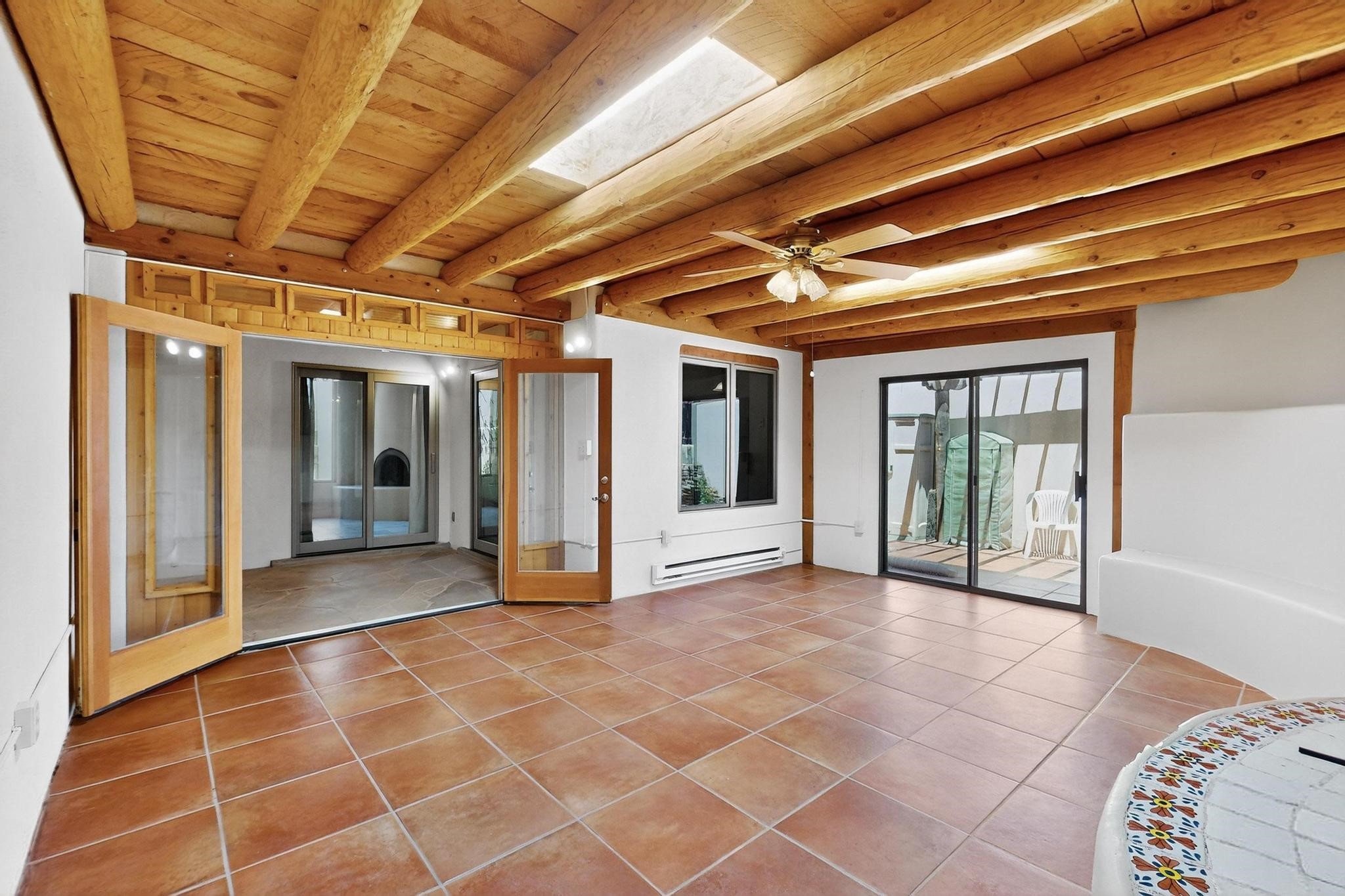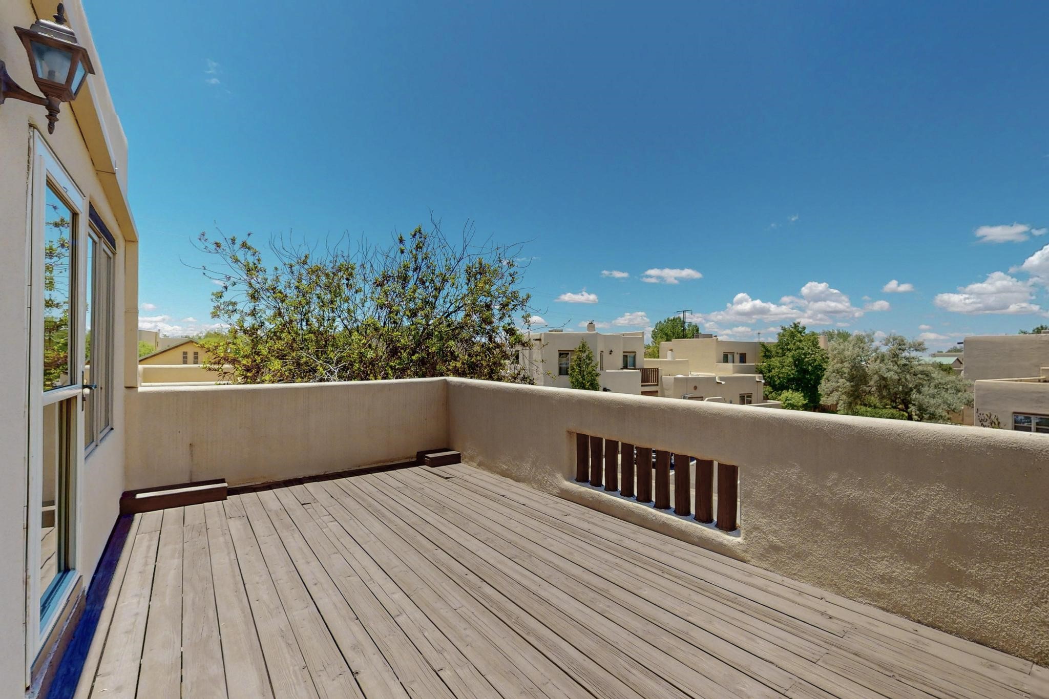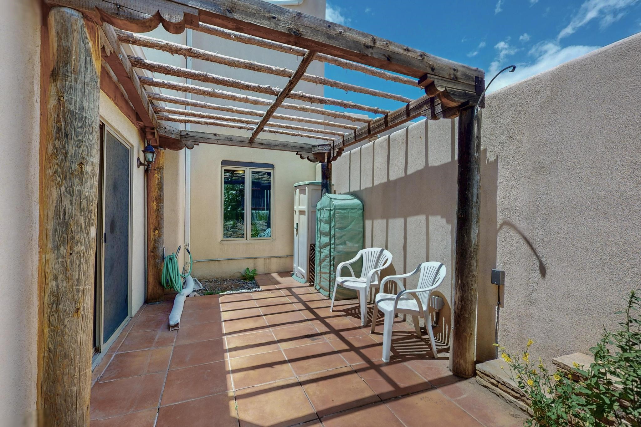 This charming Santa Fe home blends classic Southwestern character with thoughtful modern updates. A standout feature is the large room addition at the back, a true showpiece with traditional vigas, an elaborate built-in banco, oversized tile flooring, and a striking kiva fireplace. This spacious and versatile area can serve as a second living room, a creative studio, or an entertainment space. The home also boasts new kitchen appliances, radiant heat floors for cozy winter living, and two kiva fireplaces that add warmth and Southwestern charm. Two upstairs decks extend from each bedroom, providing private outdoor spaces perfect for relaxation. The interior has been freshly painted, giving the home a clean, move-in ready feel. The lush, colorful garden is complemented by a cistern system, offering an eco-friendly solution for watering. This home invites both comfort and functionality, with Santa Fe style at its core.