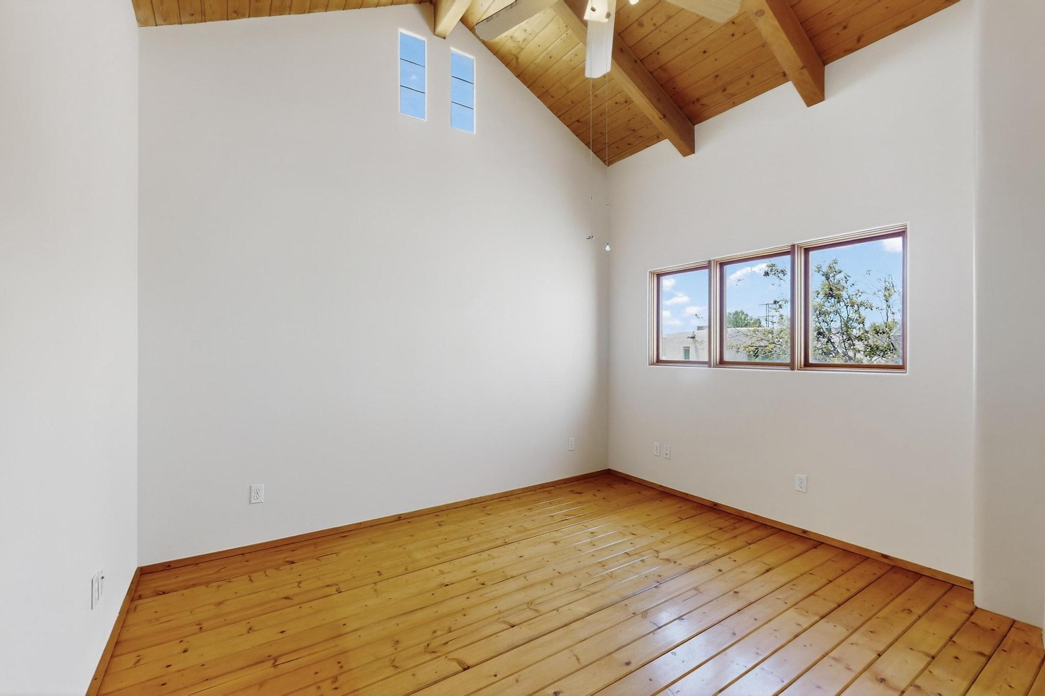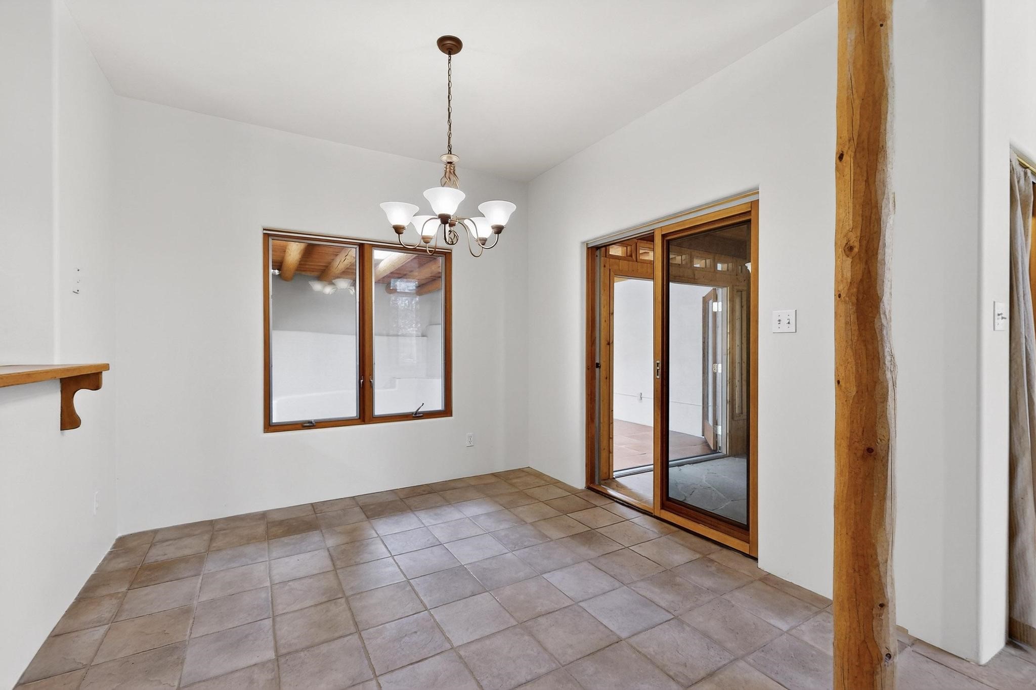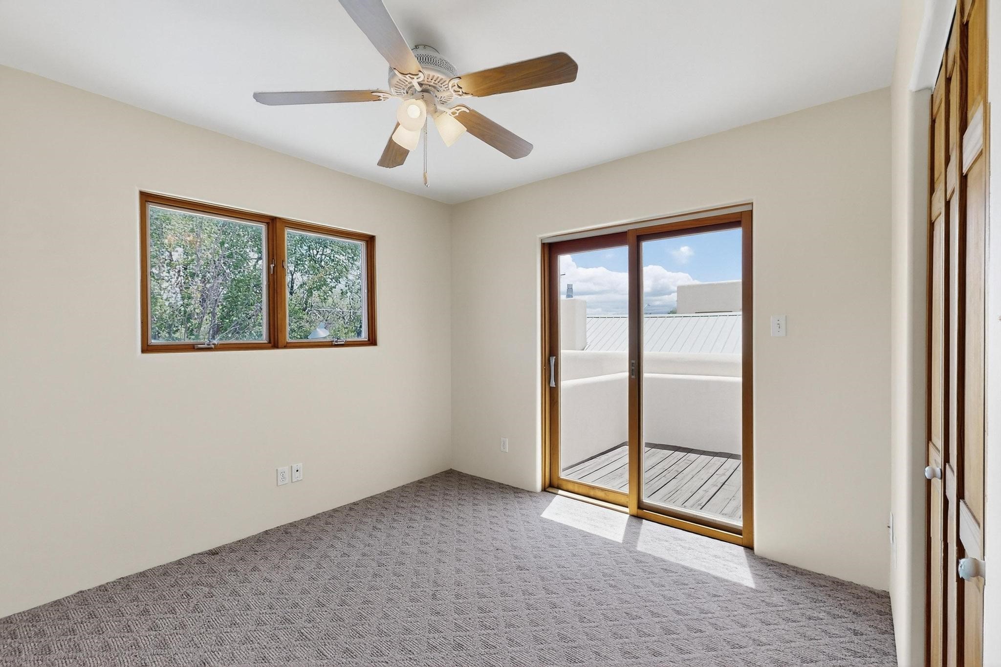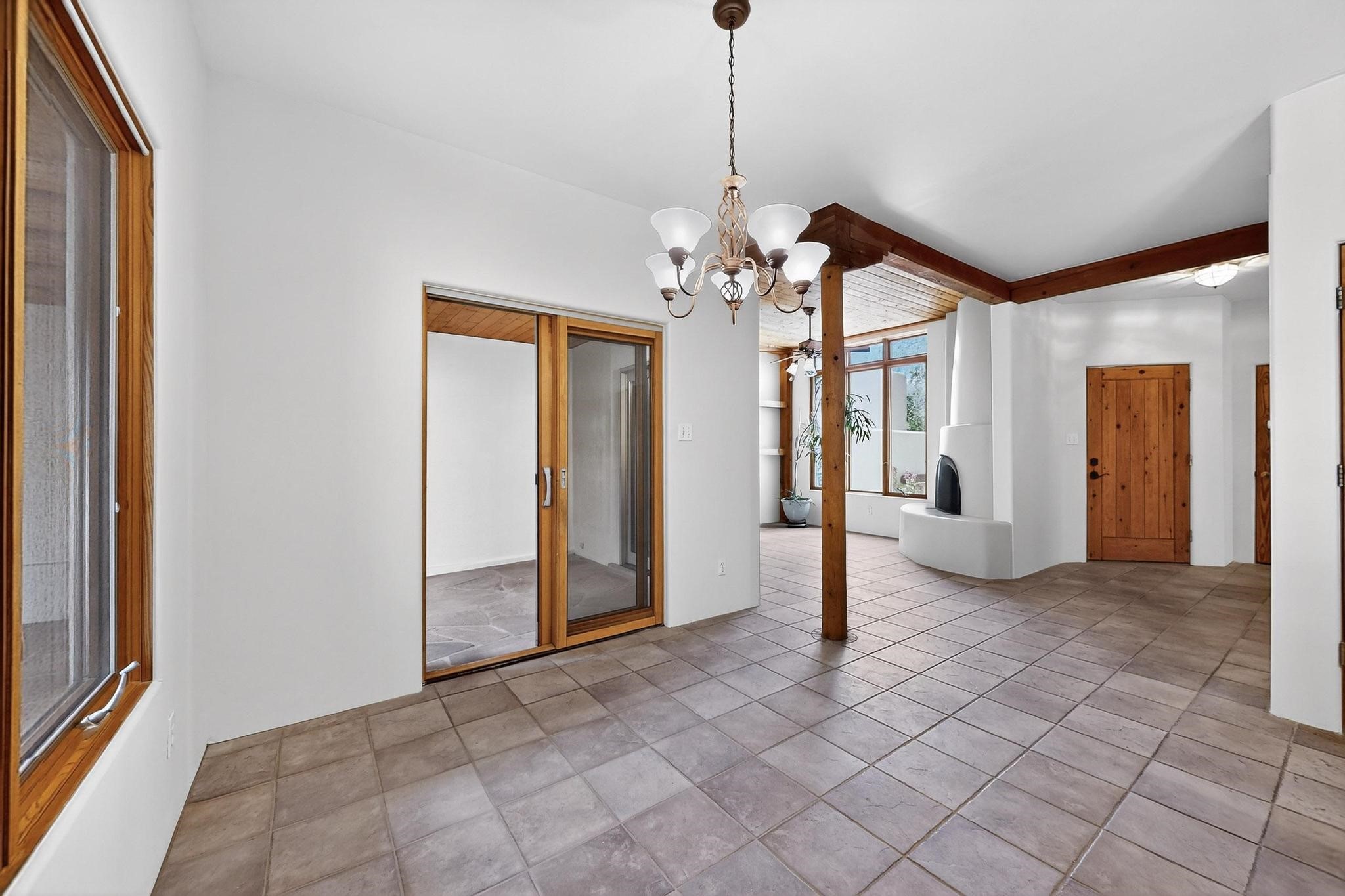 This charming Santa Fe home blends classic Southwestern character with thoughtful modern updates. A standout feature is the large room addition at the back, a true showpiece with traditional vigas, an elaborate built-in banco, oversized tile flooring, and a striking kiva fireplace. This spacious and versatile area can serve as a second living room, a creative studio, or an entertainment space. The home also boasts new kitchen appliances, radiant heat floors for cozy winter living, and two kiva fireplaces that add warmth and Southwestern charm. Two upstairs decks extend from each bedroom, providing private outdoor spaces perfect for relaxation. The interior has been freshly painted, giving the home a clean, move-in ready feel. The lush, colorful garden is complemented by a cistern system, offering an eco-friendly solution for watering. This home invites both comfort and functionality, with Santa Fe style at its core.
