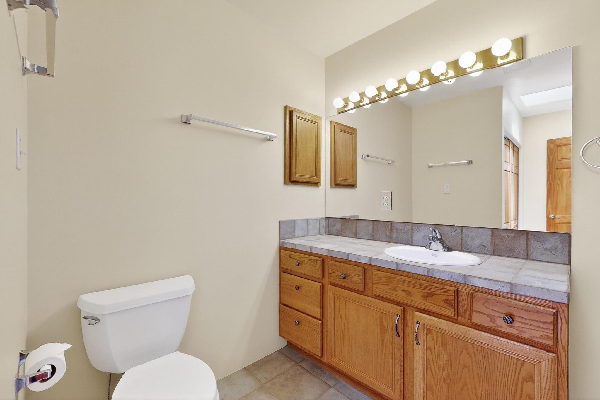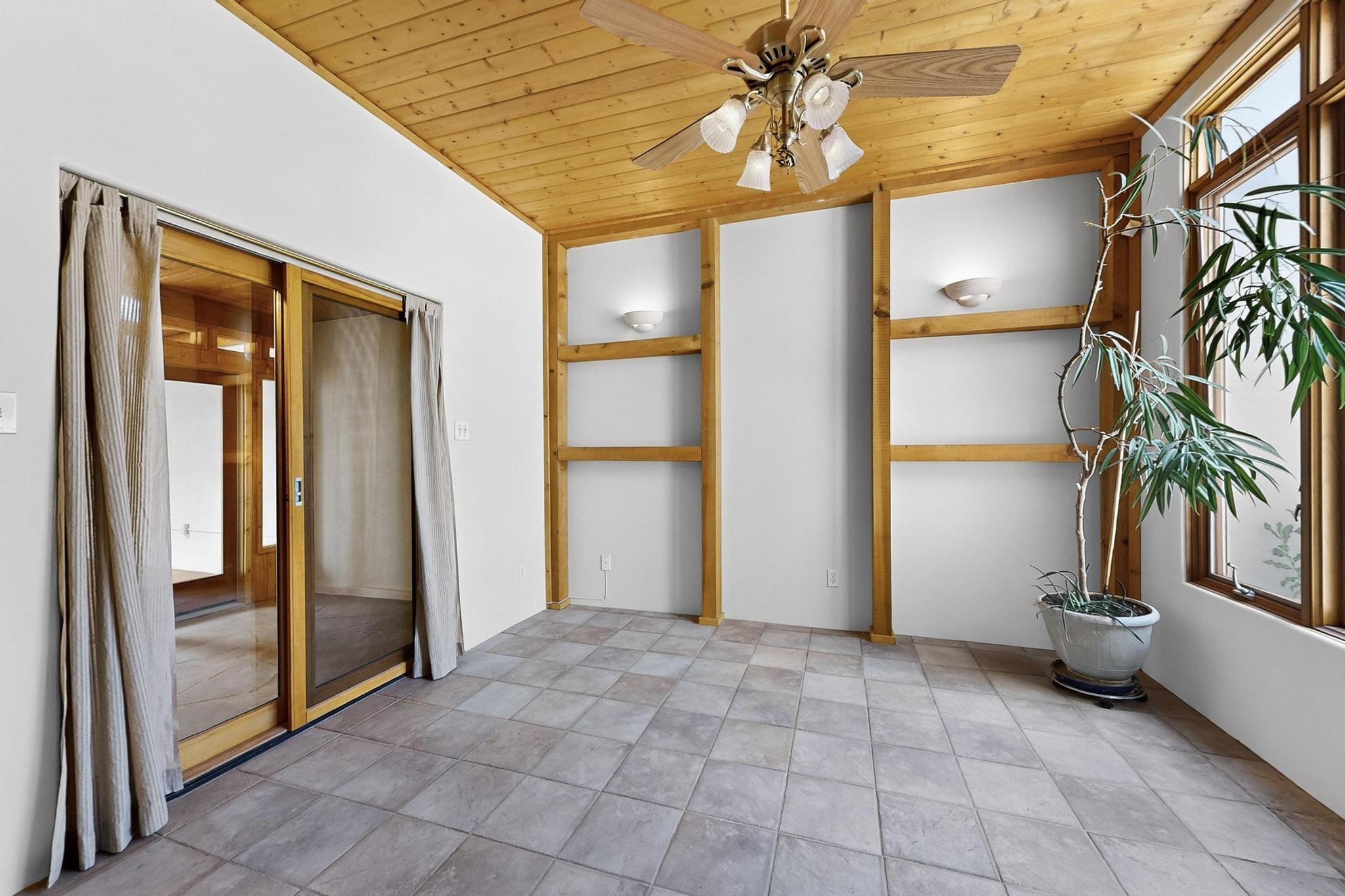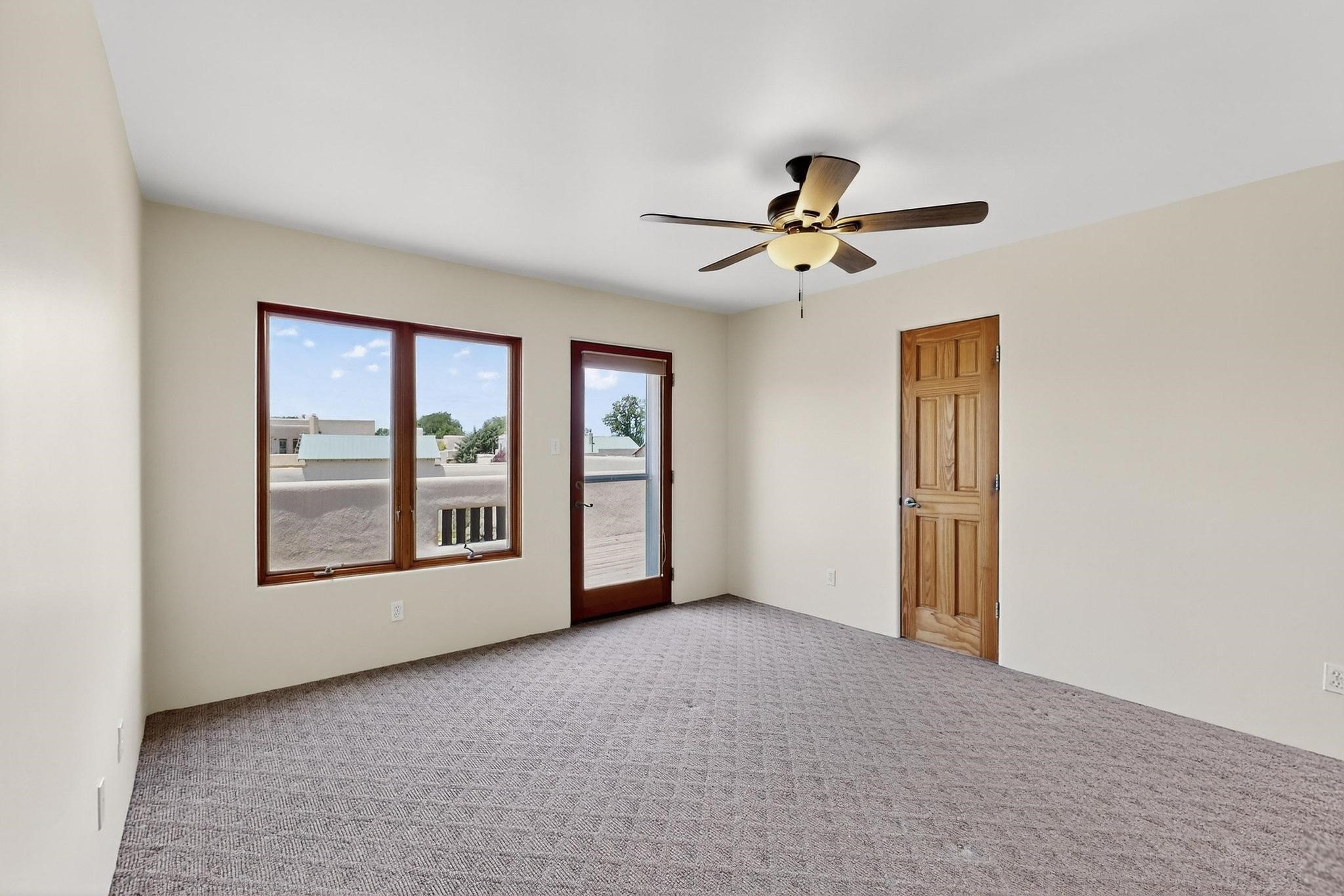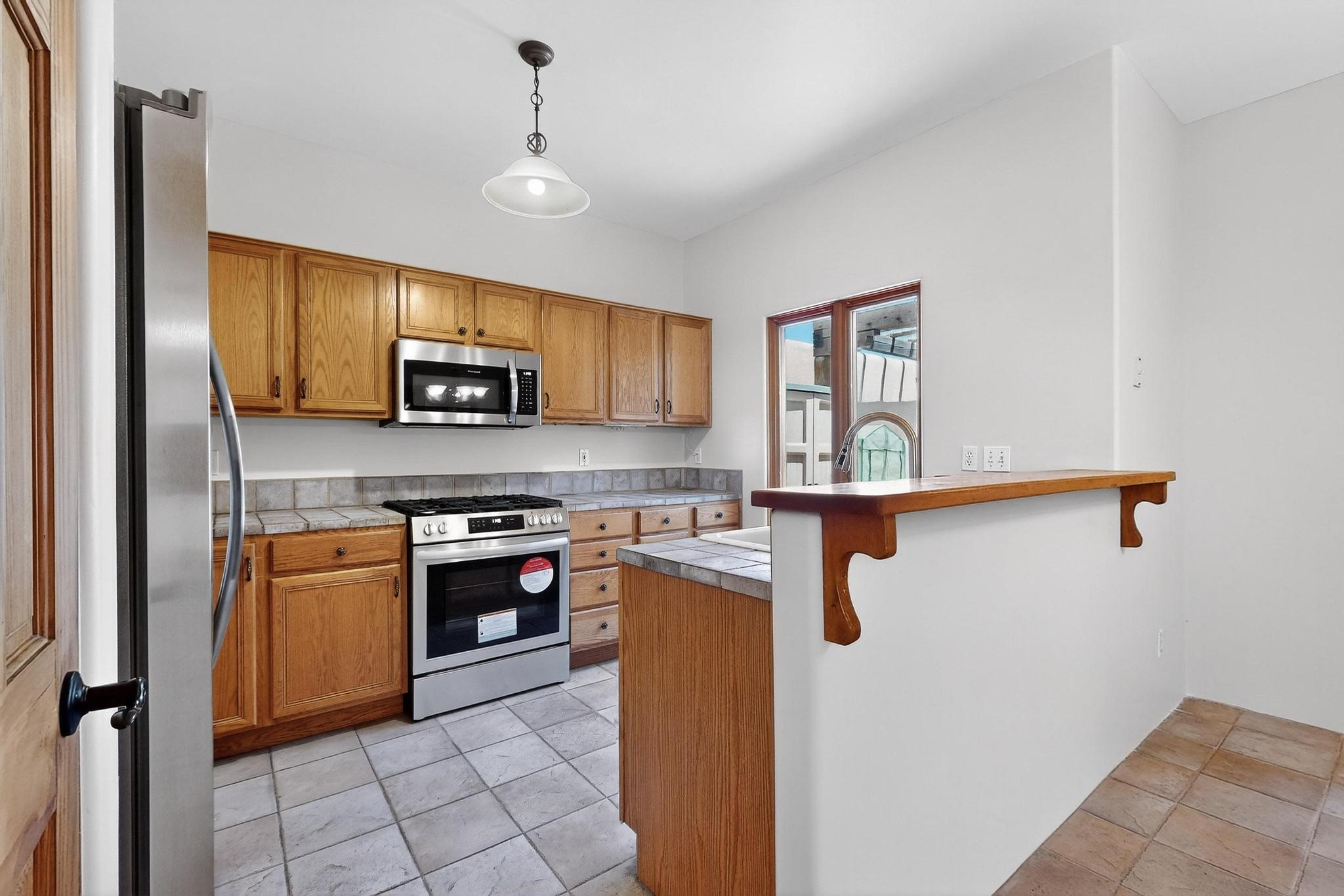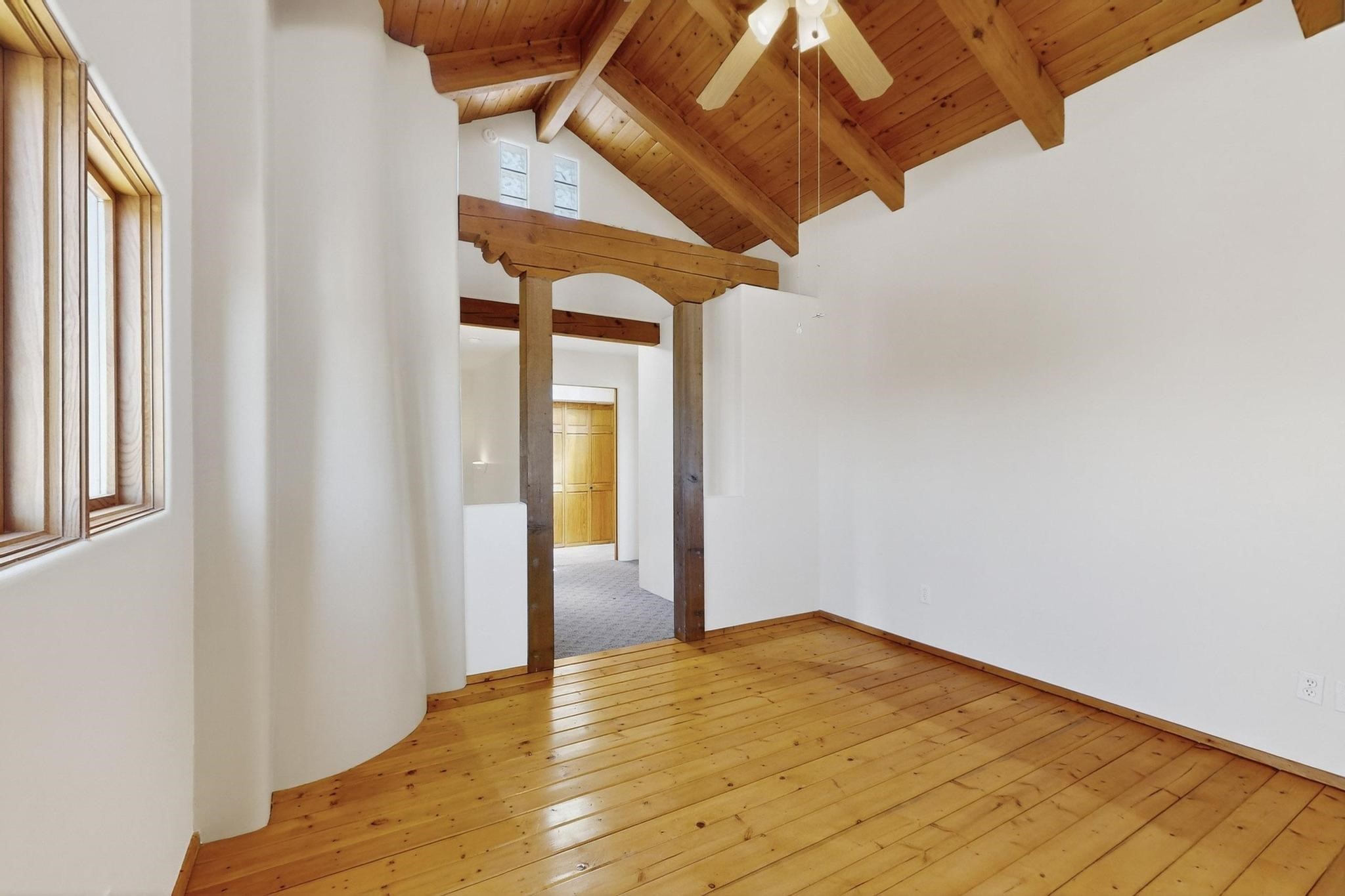 This charming Santa Fe home blends classic Southwestern character with thoughtful modern updates. A standout feature is the large room addition at the back, a true showpiece with traditional vigas, an elaborate built-in banco, oversized tile flooring, and a striking kiva fireplace. This spacious and versatile area can serve as a second living room, a creative studio, or an entertainment space. The home also boasts new kitchen appliances, radiant heat floors for cozy winter living, and two kiva fireplaces that add warmth and Southwestern charm. Two upstairs decks extend from each bedroom, providing private outdoor spaces perfect for relaxation. The interior has been freshly painted, giving the home a clean, move-in ready feel. The lush, colorful garden is complemented by a cistern system, offering an eco-friendly solution for watering. This home invites both comfort and functionality, with Santa Fe style at its core.