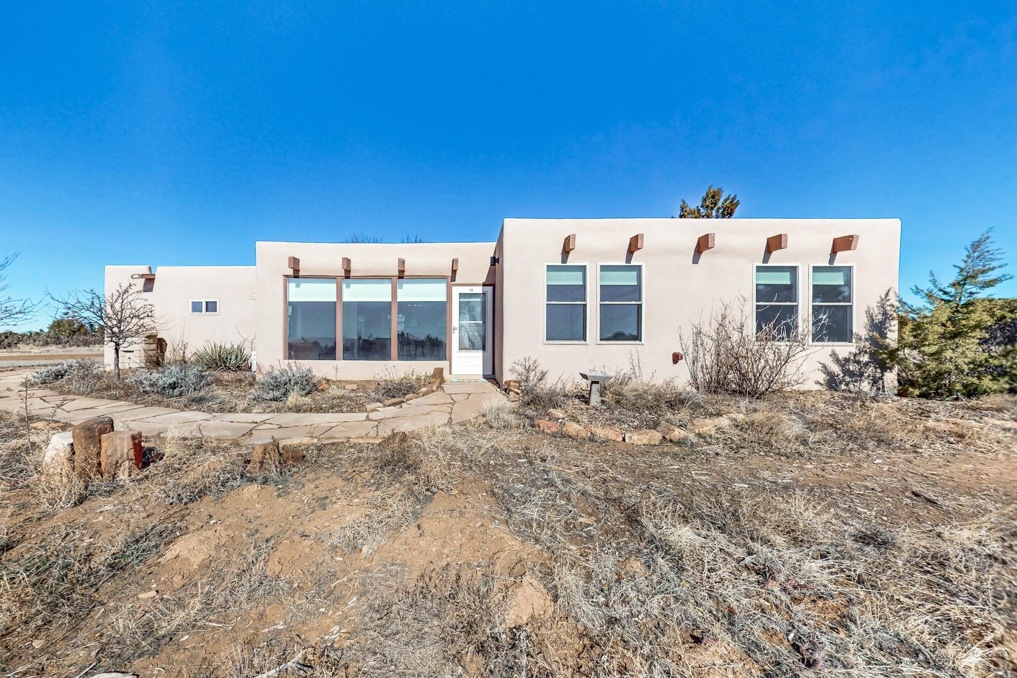 Priced to Sell! Lovely popular passive solar open plan design, move in ready. Totally refreshed sparkling interior including new carpets and paint.The main and guest baths were both remodeled in 2023, the kitchen updated with maple cabinetry, quartz and butcher block countertops, new appliances including natural gas cooktop with electric oven, and under cabinet lighting. Besides the wood stove, a minisplit was added about 5 years ago, and gas wall heaters in each bedroom. All windows except the living room were replaced in 2021. The home was restuccoed in 2021 and the garage door replaced the year before. A polyurethane membrane roof covering and insulation was installed approximately 10 years ago. There is a 3 share well and a well share agreement approximately $80.00 per year. Fruit trees including a productive apricot and apple in lovely fully fenced private backyard. Sunset views and a quiet 1.3 acre surround yet quick paved access to Eldorado amenities, local shopping and services plus only minutes into Santa Fe.