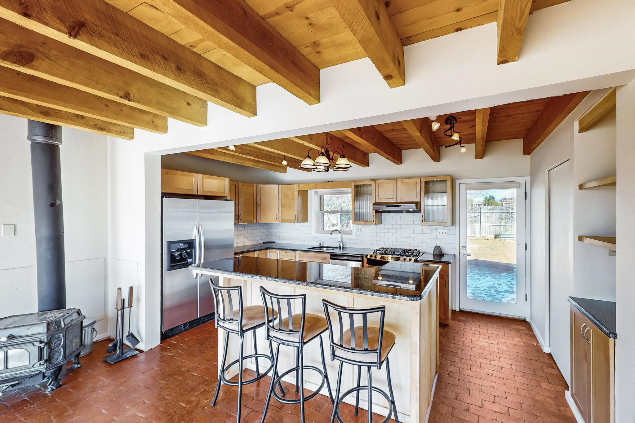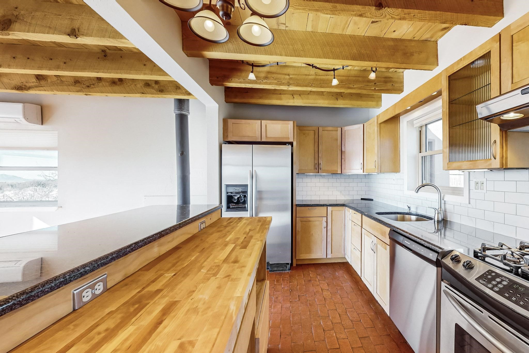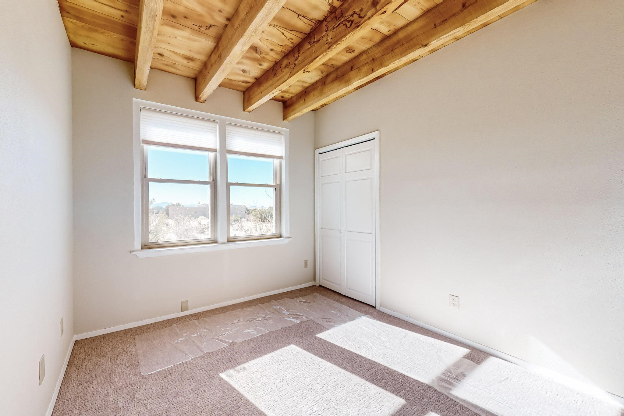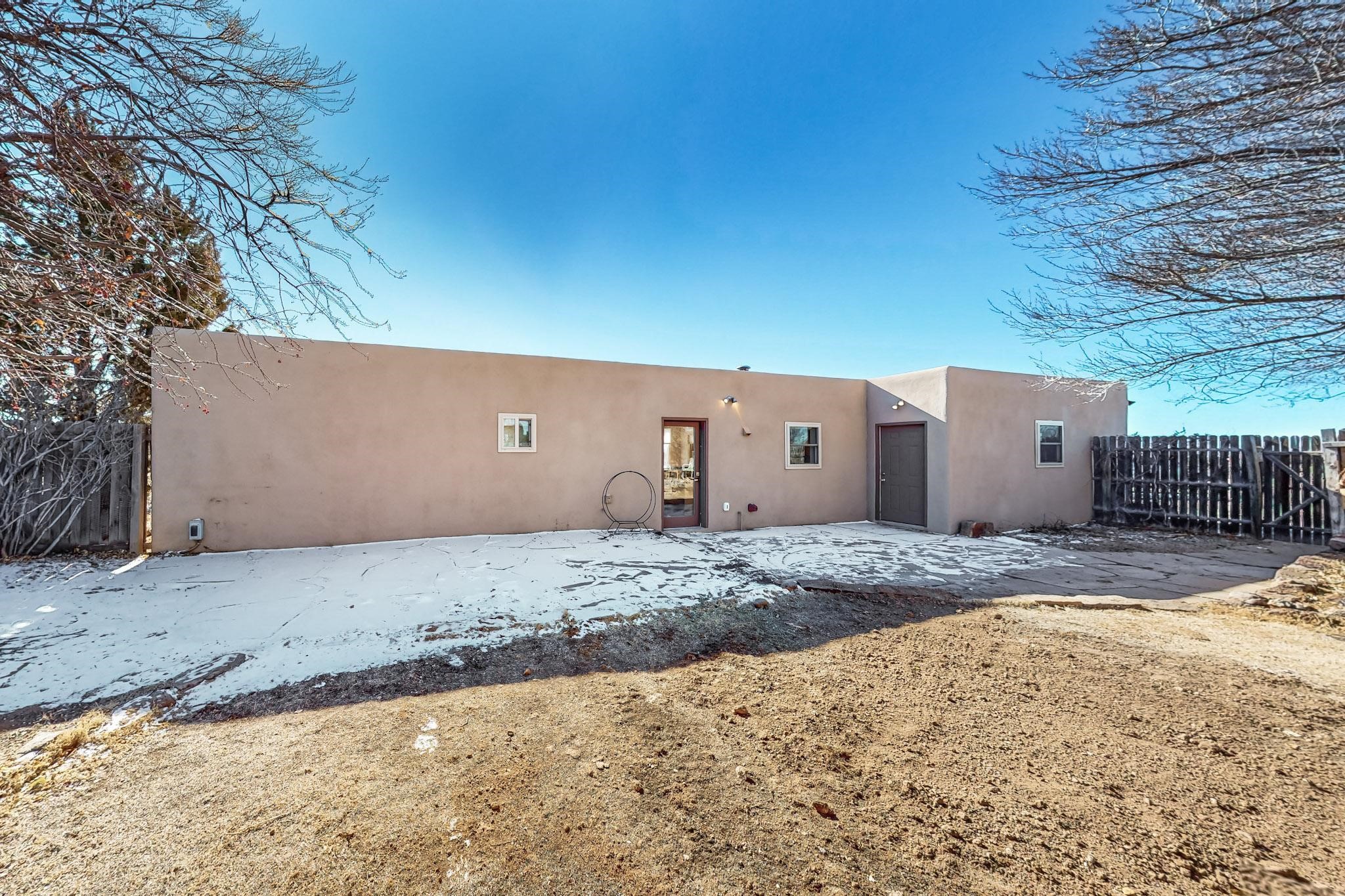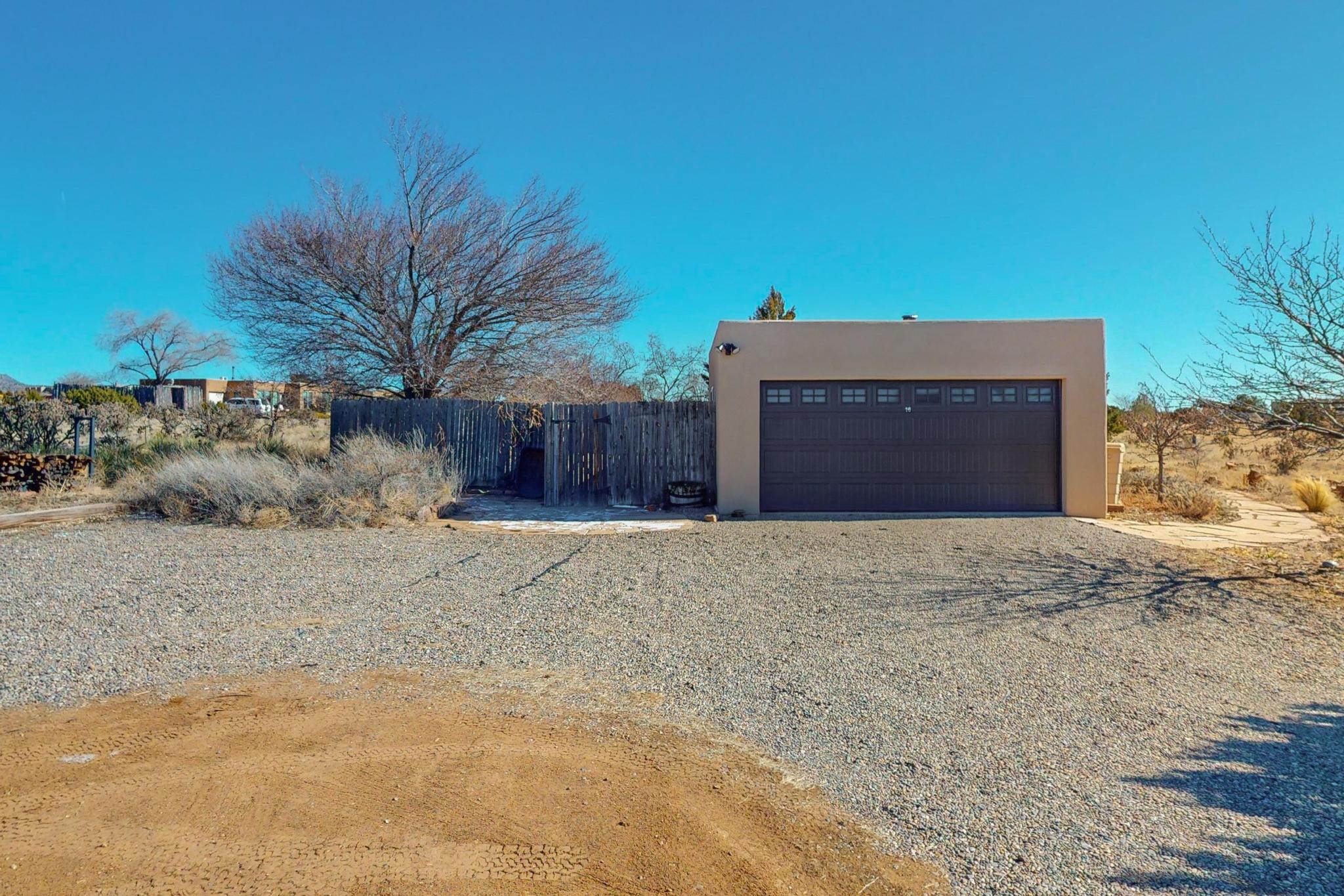 Priced to Sell! Lovely popular passive solar open plan design, move in ready. Totally refreshed sparkling interior including new carpets and paint.The main and guest baths were both remodeled in 2023, the kitchen updated with maple cabinetry, quartz and butcher block countertops, new appliances including natural gas cooktop with electric oven, and under cabinet lighting. Besides the wood stove, a minisplit was added about 5 years ago, and gas wall heaters in each bedroom. All windows except the living room were replaced in 2021. The home was restuccoed in 2021 and the garage door replaced the year before. A polyurethane membrane roof covering and insulation was installed approximately 10 years ago. There is a 3 share well and a well share agreement approximately $80.00 per year. Fruit trees including a productive apricot and apple in lovely fully fenced private backyard. Sunset views and a quiet 1.3 acre surround yet quick paved access to Eldorado amenities, local shopping and services plus only minutes into Santa Fe.