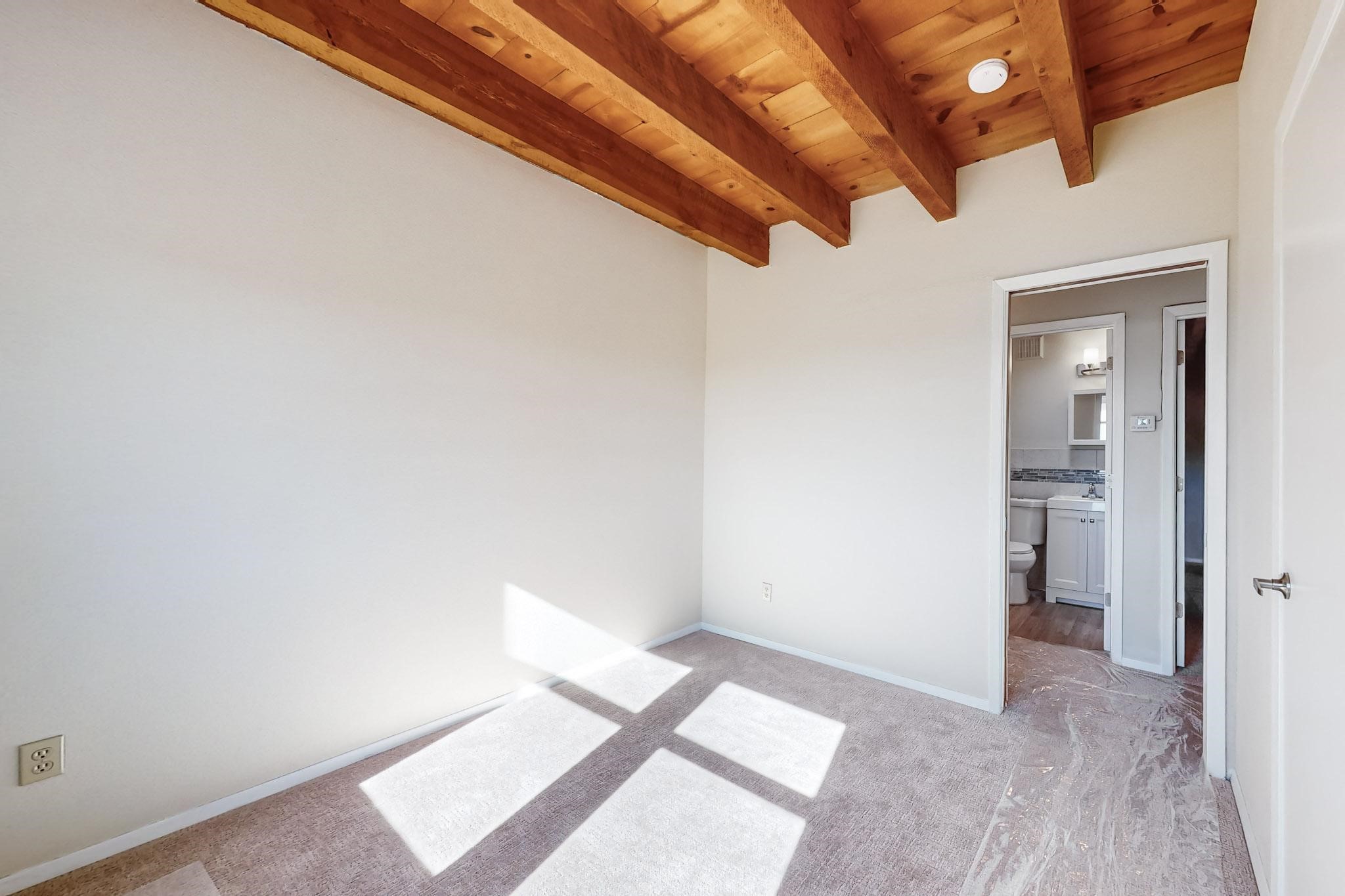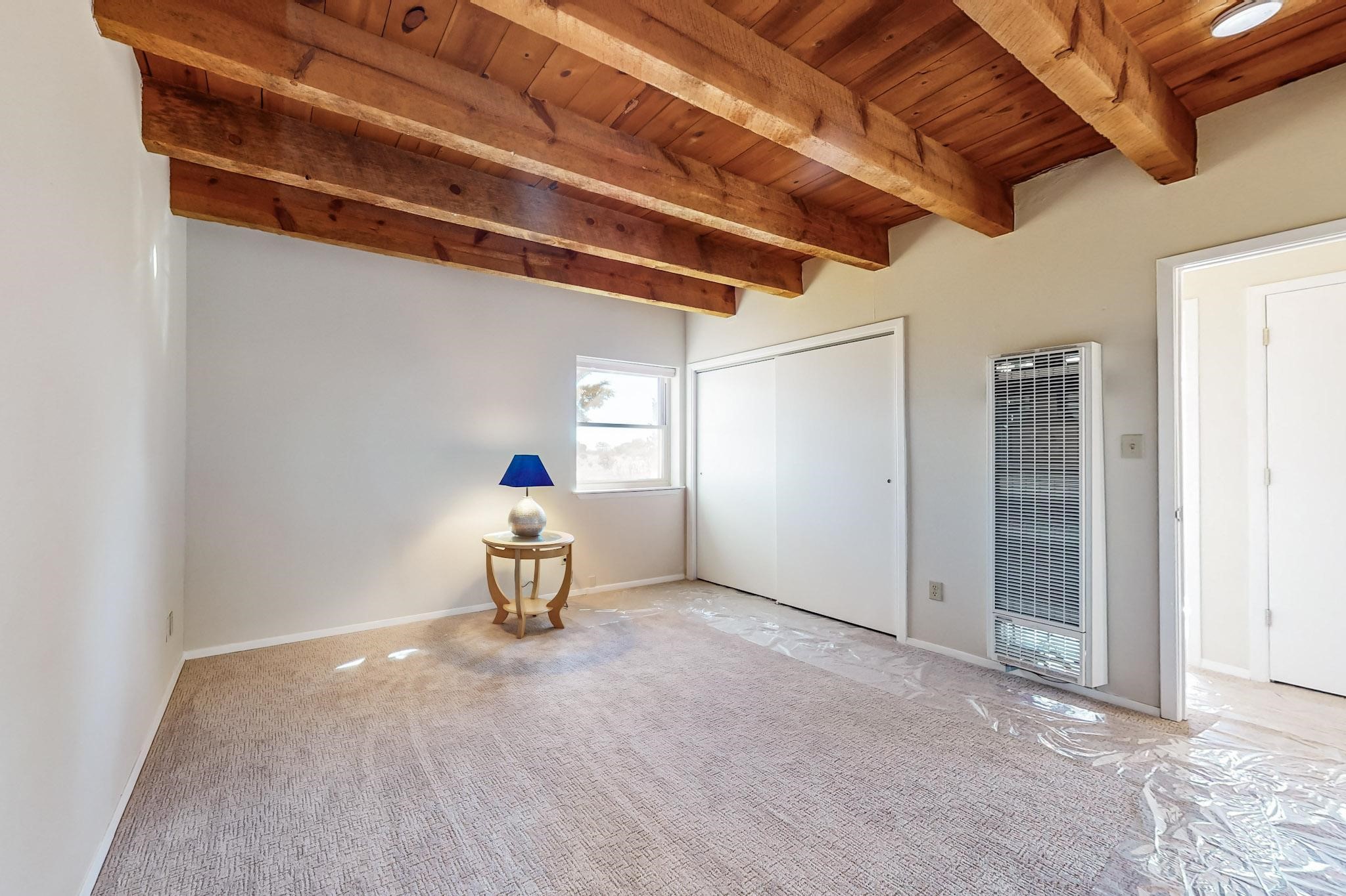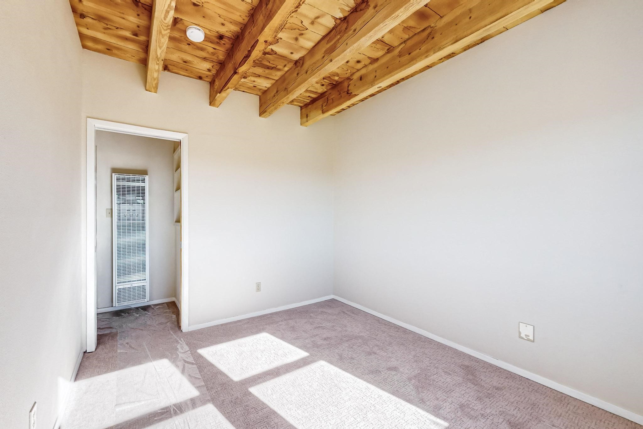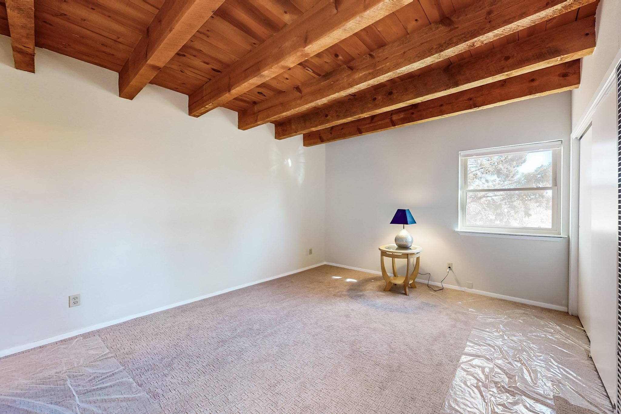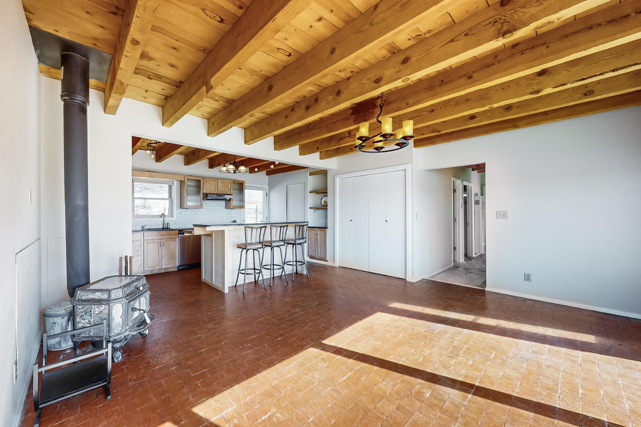 Priced to Sell! Lovely popular passive solar open plan design, move in ready. Totally refreshed sparkling interior including new carpets and paint.The main and guest baths were both remodeled in 2023, the kitchen updated with maple cabinetry, quartz and butcher block countertops, new appliances including natural gas cooktop with electric oven, and under cabinet lighting. Besides the wood stove, a minisplit was added about 5 years ago, and gas wall heaters in each bedroom. All windows except the living room were replaced in 2021. The home was restuccoed in 2021 and the garage door replaced the year before. A polyurethane membrane roof covering and insulation was installed approximately 10 years ago. There is a 3 share well and a well share agreement approximately $80.00 per year. Fruit trees including a productive apricot and apple in lovely fully fenced private backyard. Sunset views and a quiet 1.3 acre surround yet quick paved access to Eldorado amenities, local shopping and services plus only minutes into Santa Fe.