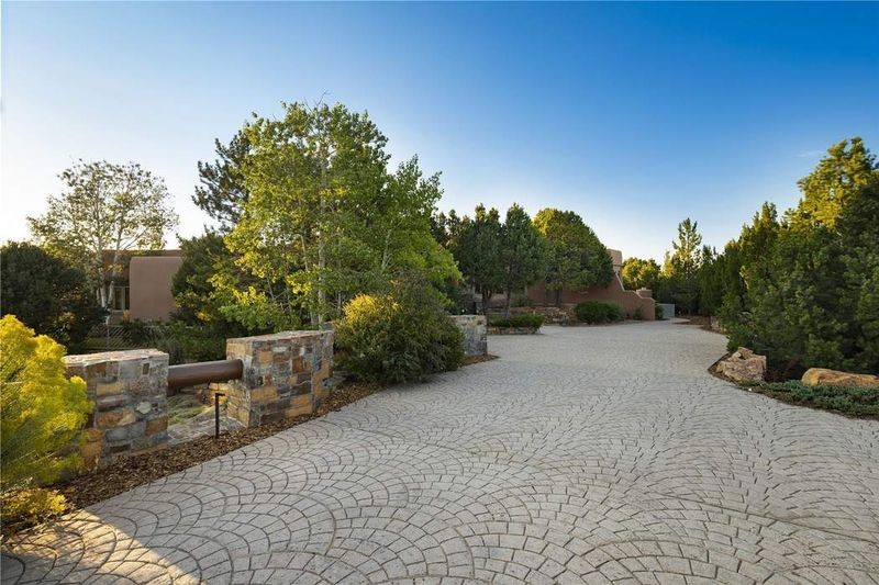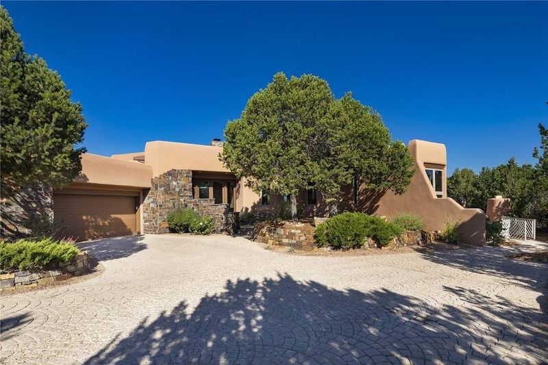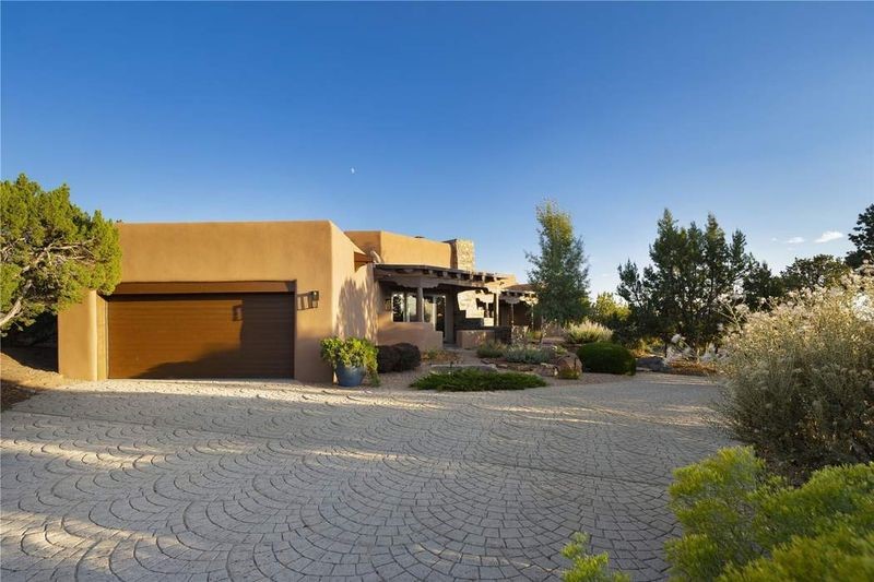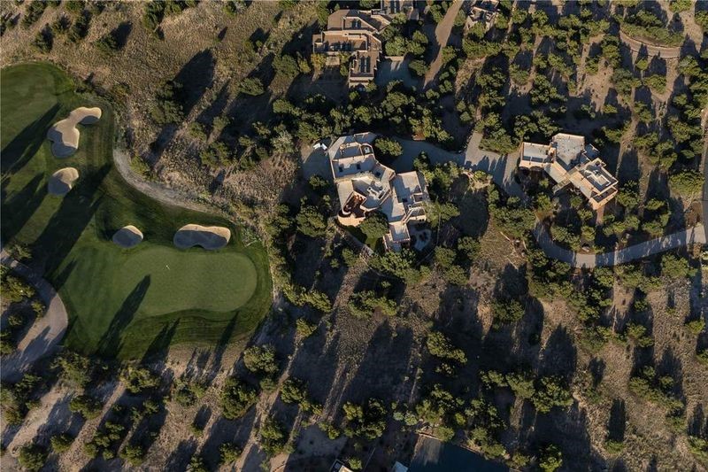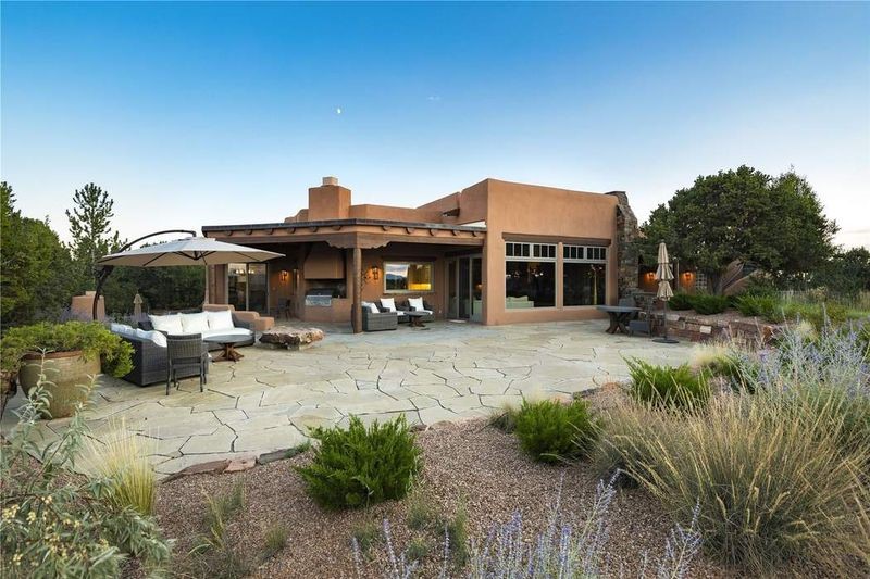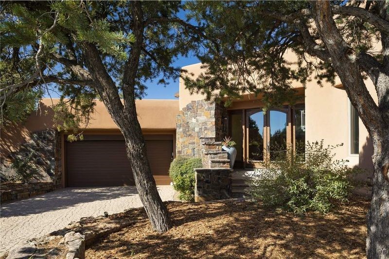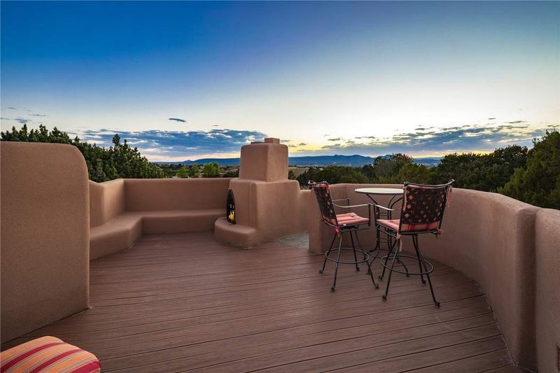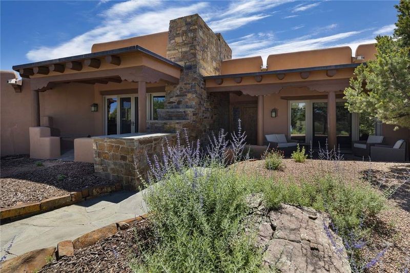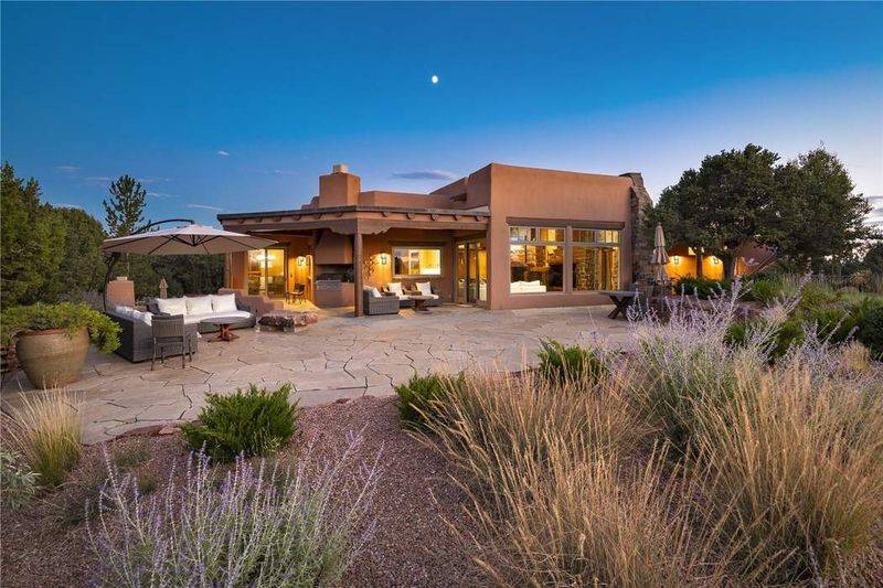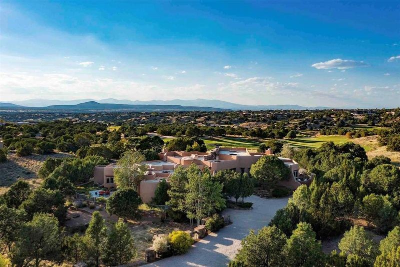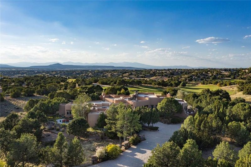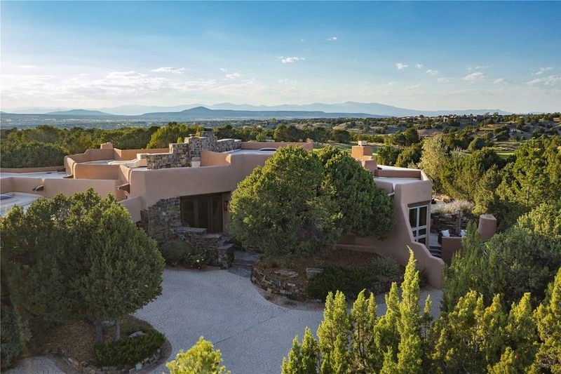 One of the most extraordinary estates in all of Santa Fe, this exquisite 7,700 square foot house and guest house with stunning Jemez Mountain views is sited to perfection overlooking the 14th green on the Sunrise Golf Course within the master planned community of Las Campanas. Designed to celebrate the ultimate Santa Fe lifestyle, this Rastra and Pumice Crete-constructed estate was built and updated with the highest level of luxury finishes, which impresses with superior custom craftsmanship and offers an incredible outdoor living experience with vibrant landscape, a rare viewing deck with a fireplace, and surround outdoor entertainment areas, complete with outdoor fireplaces, and a built-in BBQ, all of which overlook the golf course and views. The 5700 square foot main house offers excellent separation of space with 3 bedrooms/5 baths + office/media room, with a dedicated wine room and a 2-car garage. Guests enjoy full independence with a spacious detached, 2,000 square foot, 2 bedroom/2 bath guest house, complete with a full kitchen, spacious living room, and a 2 car garage. Design features include a welcoming private driveway with custom pavers, a dramatic front entrance which beautifully captures the views upon entering the main house, a recently updated designer's island kitchen with state-of-the-art appliances and an expansive formal living room with stunning views, grand fireplace and portal access. Located off the main living room and kitchen is the spacious formal dining area and an intimate seating area, also with views and portal access. The private owner's suite delights with views, fireplace and a newly updated spa-like bath with natural stone counters, tranquil soaking tub with an elevated fireplace, walk-in shower, dual vanities and closets. Separate from the main living area, within the main house are 2 guest bedroom ensuites, which share their own living room. This epic home is a rare offering and represents true Santa Fe luxury with sophistication.