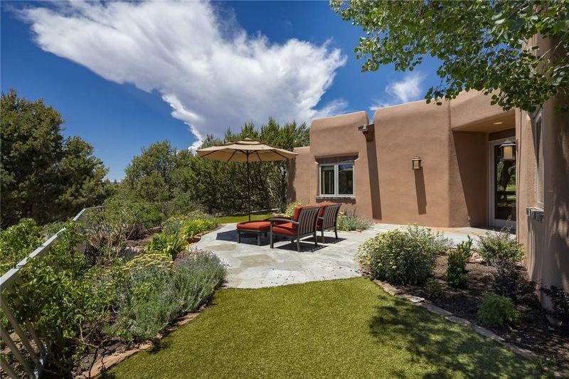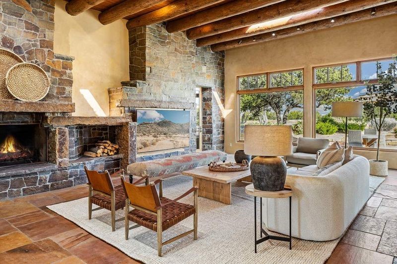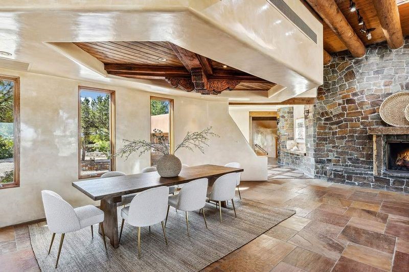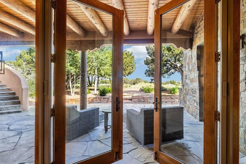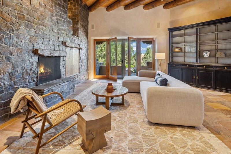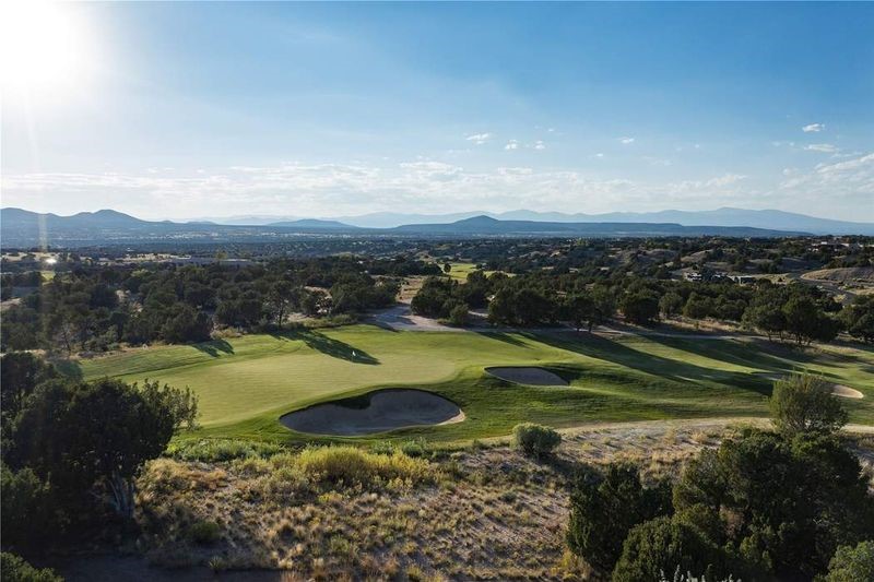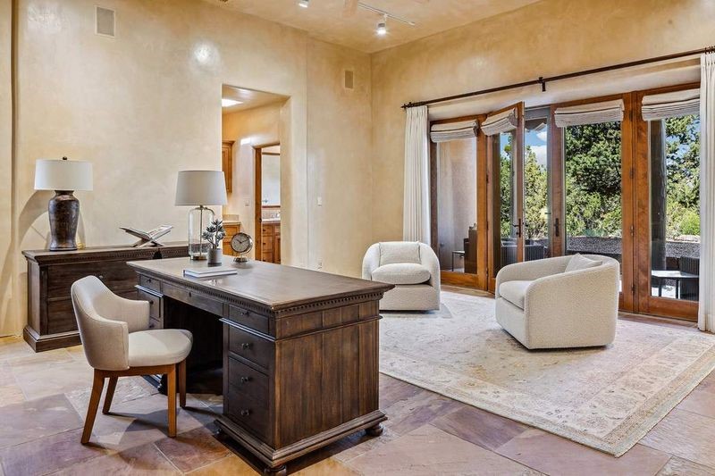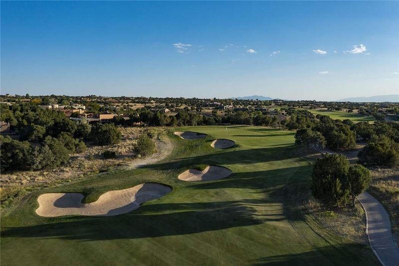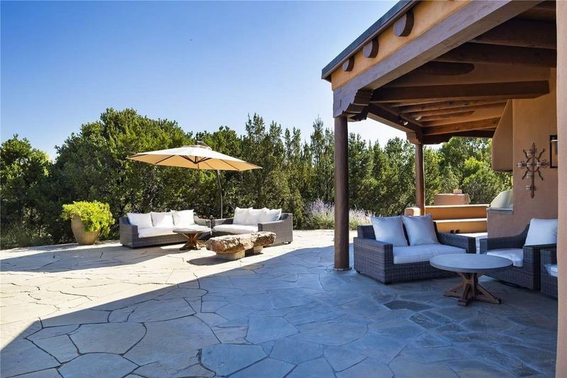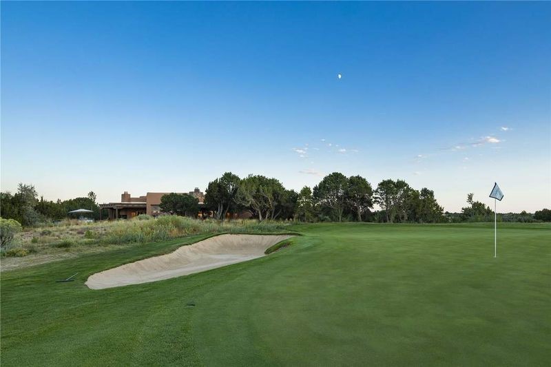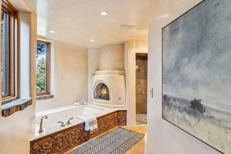 One of the most extraordinary estates in all of Santa Fe, this exquisite 7,700 square foot house and guest house with stunning Jemez Mountain views is sited to perfection overlooking the 14th green on the Sunrise Golf Course within the master planned community of Las Campanas. Designed to celebrate the ultimate Santa Fe lifestyle, this Rastra and Pumice Crete-constructed estate was built and updated with the highest level of luxury finishes, which impresses with superior custom craftsmanship and offers an incredible outdoor living experience with vibrant landscape, a rare viewing deck with a fireplace, and surround outdoor entertainment areas, complete with outdoor fireplaces, and a built-in BBQ, all of which overlook the golf course and views. The 5700 square foot main house offers excellent separation of space with 3 bedrooms/5 baths + office/media room, with a dedicated wine room and a 2-car garage. Guests enjoy full independence with a spacious detached, 2,000 square foot, 2 bedroom/2 bath guest house, complete with a full kitchen, spacious living room, and a 2 car garage. Design features include a welcoming private driveway with custom pavers, a dramatic front entrance which beautifully captures the views upon entering the main house, a recently updated designer's island kitchen with state-of-the-art appliances and an expansive formal living room with stunning views, grand fireplace and portal access. Located off the main living room and kitchen is the spacious formal dining area and an intimate seating area, also with views and portal access. The private owner's suite delights with views, fireplace and a newly updated spa-like bath with natural stone counters, tranquil soaking tub with an elevated fireplace, walk-in shower, dual vanities and closets. Separate from the main living area, within the main house are 2 guest bedroom ensuites, which share their own living room. This epic home is a rare offering and represents true Santa Fe luxury with sophistication.