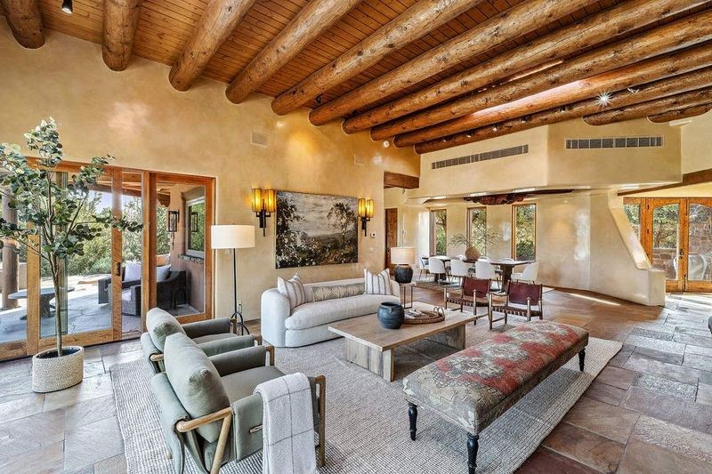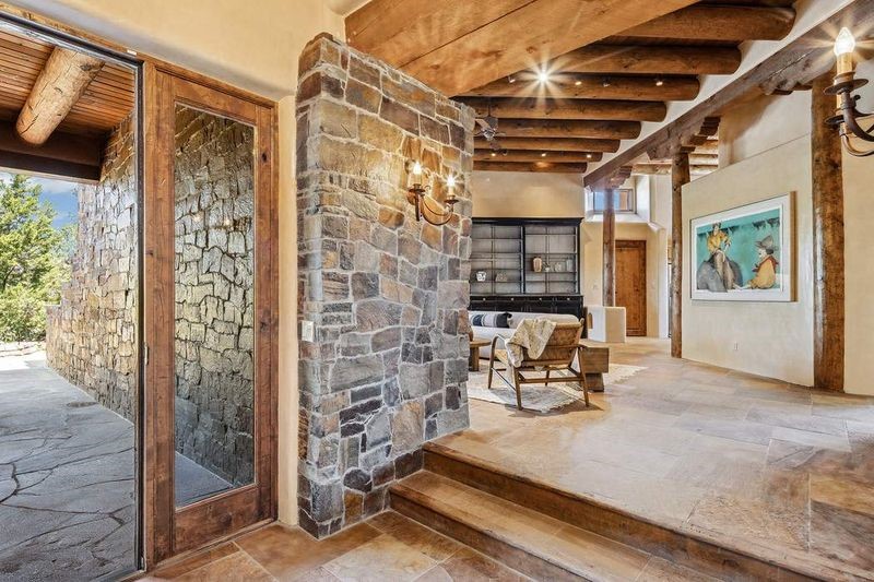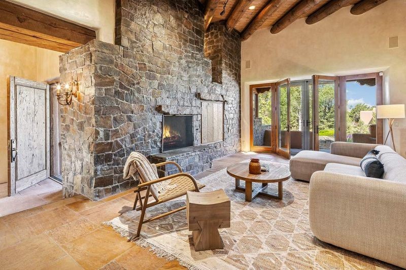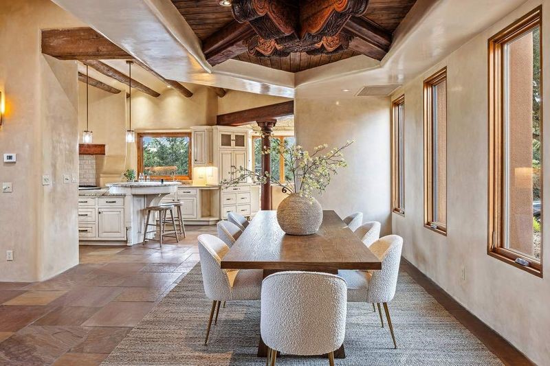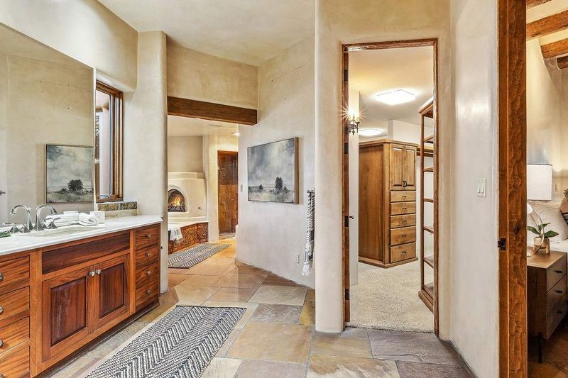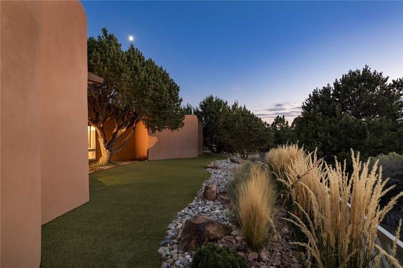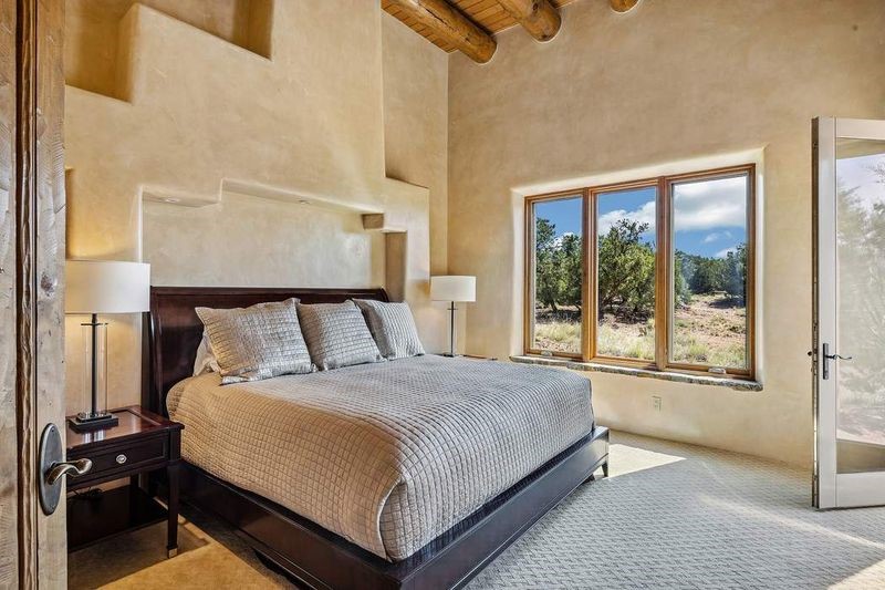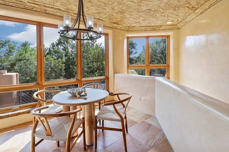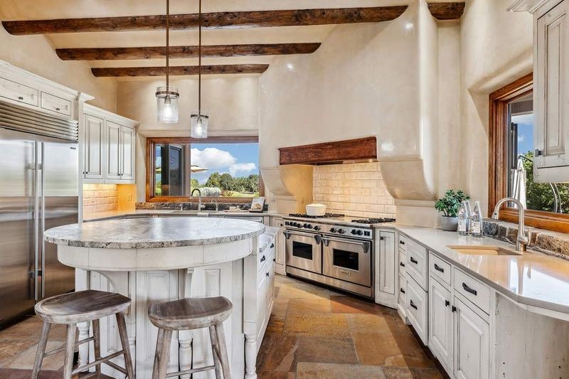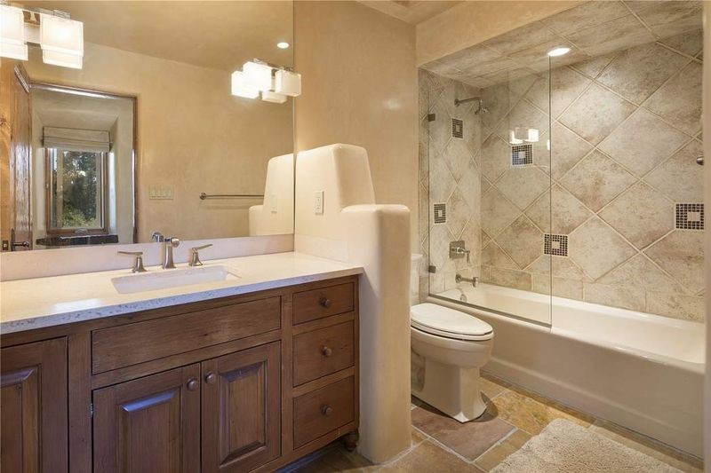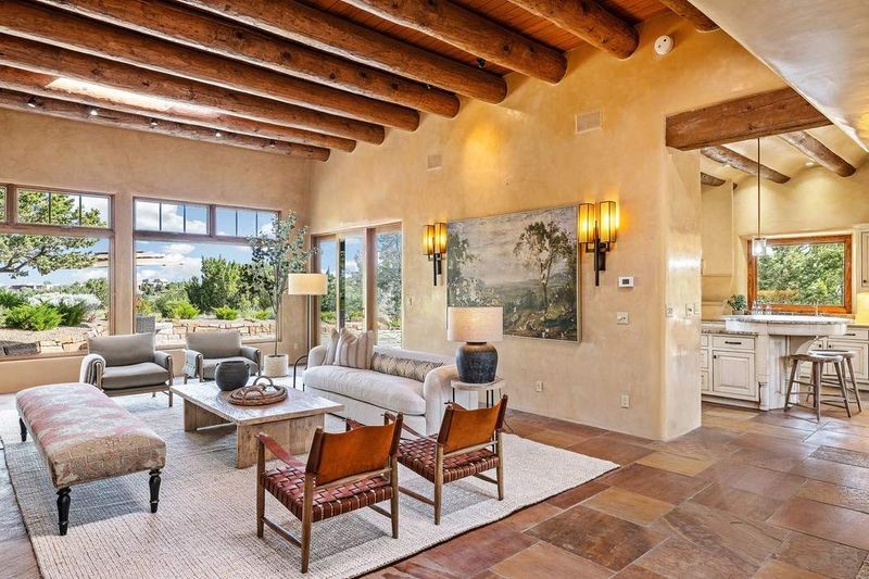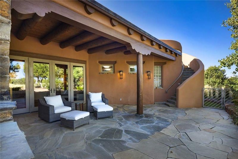 One of the most extraordinary estates in all of Santa Fe, this exquisite 7,700 square foot house and guest house with stunning Jemez Mountain views is sited to perfection overlooking the 14th green on the Sunrise Golf Course within the master planned community of Las Campanas. Designed to celebrate the ultimate Santa Fe lifestyle, this Rastra and Pumice Crete-constructed estate was built and updated with the highest level of luxury finishes, which impresses with superior custom craftsmanship and offers an incredible outdoor living experience with vibrant landscape, a rare viewing deck with a fireplace, and surround outdoor entertainment areas, complete with outdoor fireplaces, and a built-in BBQ, all of which overlook the golf course and views. The 5700 square foot main house offers excellent separation of space with 3 bedrooms/5 baths + office/media room, with a dedicated wine room and a 2-car garage. Guests enjoy full independence with a spacious detached, 2,000 square foot, 2 bedroom/2 bath guest house, complete with a full kitchen, spacious living room, and a 2 car garage. Design features include a welcoming private driveway with custom pavers, a dramatic front entrance which beautifully captures the views upon entering the main house, a recently updated designer's island kitchen with state-of-the-art appliances and an expansive formal living room with stunning views, grand fireplace and portal access. Located off the main living room and kitchen is the spacious formal dining area and an intimate seating area, also with views and portal access. The private owner's suite delights with views, fireplace and a newly updated spa-like bath with natural stone counters, tranquil soaking tub with an elevated fireplace, walk-in shower, dual vanities and closets. Separate from the main living area, within the main house are 2 guest bedroom ensuites, which share their own living room. This epic home is a rare offering and represents true Santa Fe luxury with sophistication.