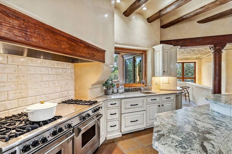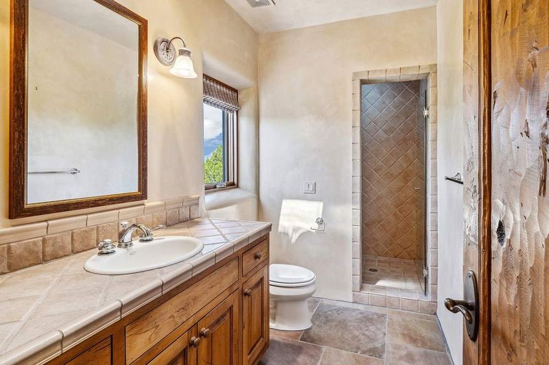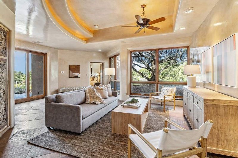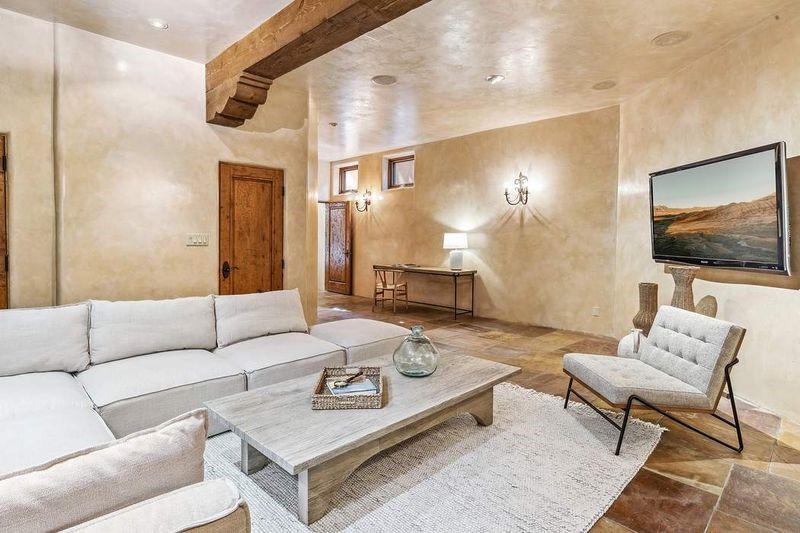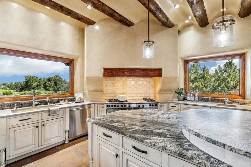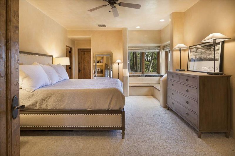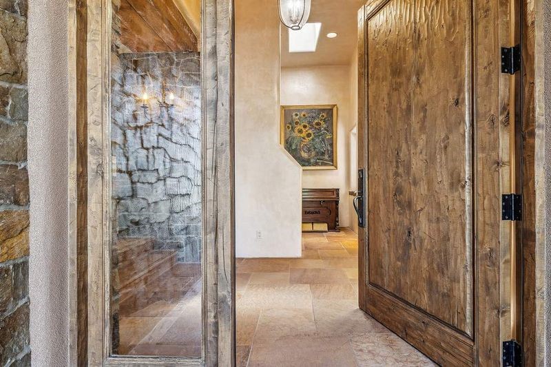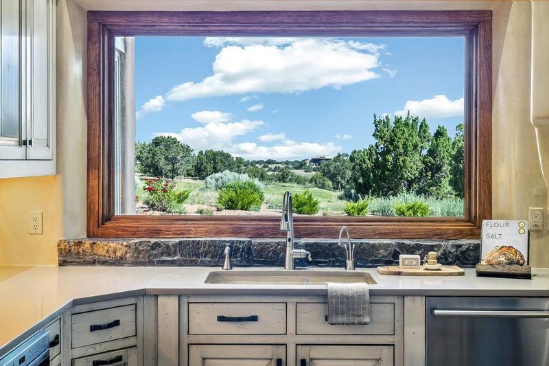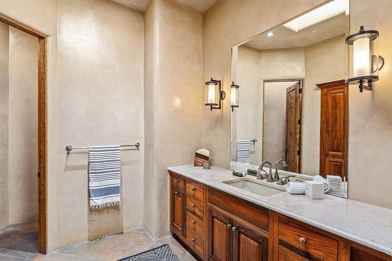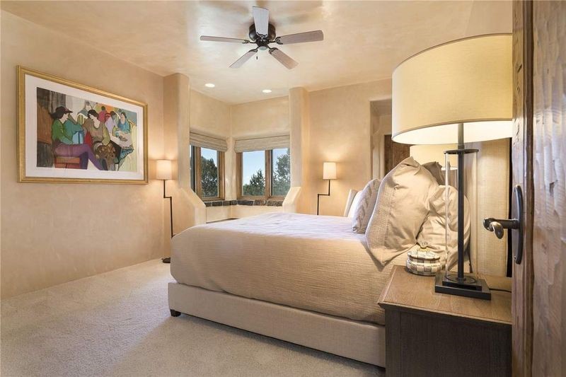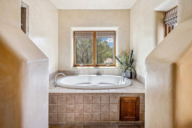 One of the most extraordinary estates in all of Santa Fe, this exquisite 7,700 square foot house and guest house with stunning Jemez Mountain views is sited to perfection overlooking the 14th green on the Sunrise Golf Course within the master planned community of Las Campanas. Designed to celebrate the ultimate Santa Fe lifestyle, this Rastra and Pumice Crete-constructed estate was built and updated with the highest level of luxury finishes, which impresses with superior custom craftsmanship and offers an incredible outdoor living experience with vibrant landscape, a rare viewing deck with a fireplace, and surround outdoor entertainment areas, complete with outdoor fireplaces, and a built-in BBQ, all of which overlook the golf course and views. The 5700 square foot main house offers excellent separation of space with 3 bedrooms/5 baths + office/media room, with a dedicated wine room and a 2-car garage. Guests enjoy full independence with a spacious detached, 2,000 square foot, 2 bedroom/2 bath guest house, complete with a full kitchen, spacious living room, and a 2 car garage. Design features include a welcoming private driveway with custom pavers, a dramatic front entrance which beautifully captures the views upon entering the main house, a recently updated designer's island kitchen with state-of-the-art appliances and an expansive formal living room with stunning views, grand fireplace and portal access. Located off the main living room and kitchen is the spacious formal dining area and an intimate seating area, also with views and portal access. The private owner's suite delights with views, fireplace and a newly updated spa-like bath with natural stone counters, tranquil soaking tub with an elevated fireplace, walk-in shower, dual vanities and closets. Separate from the main living area, within the main house are 2 guest bedroom ensuites, which share their own living room. This epic home is a rare offering and represents true Santa Fe luxury with sophistication.