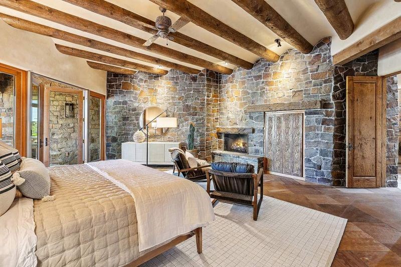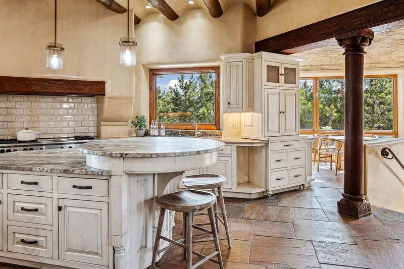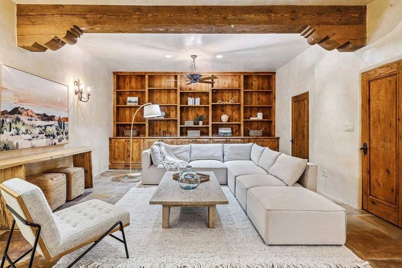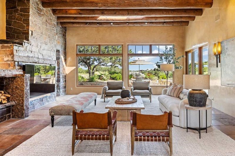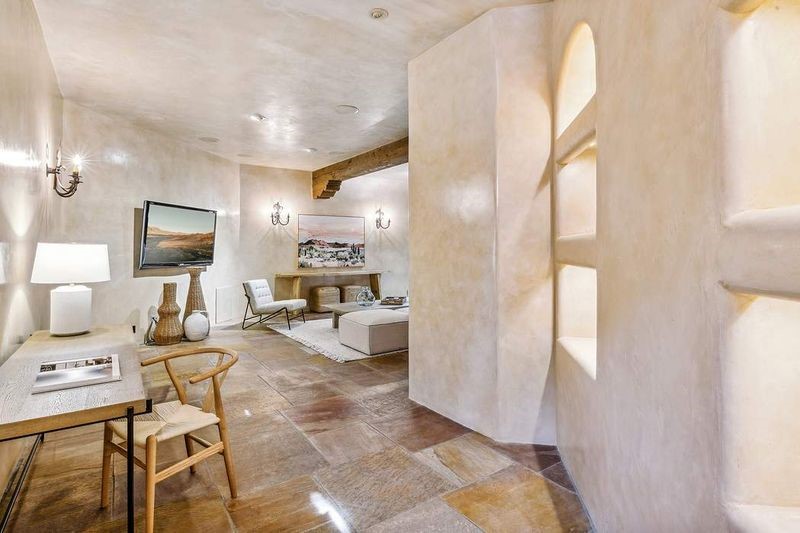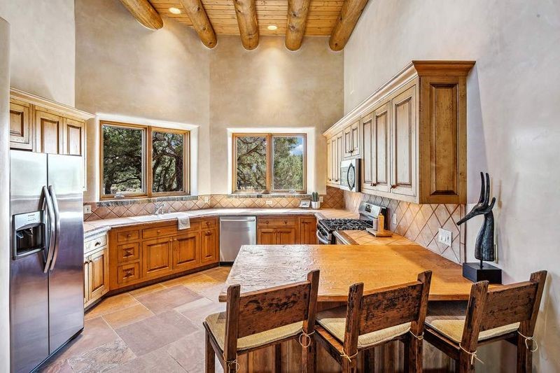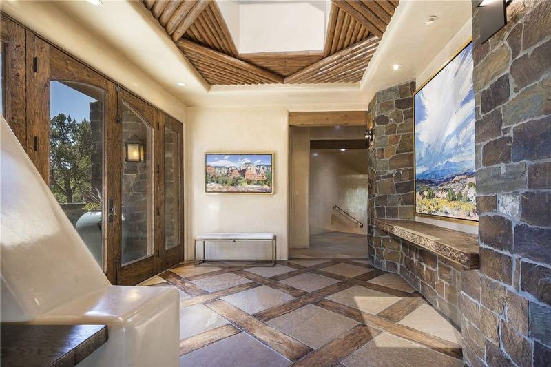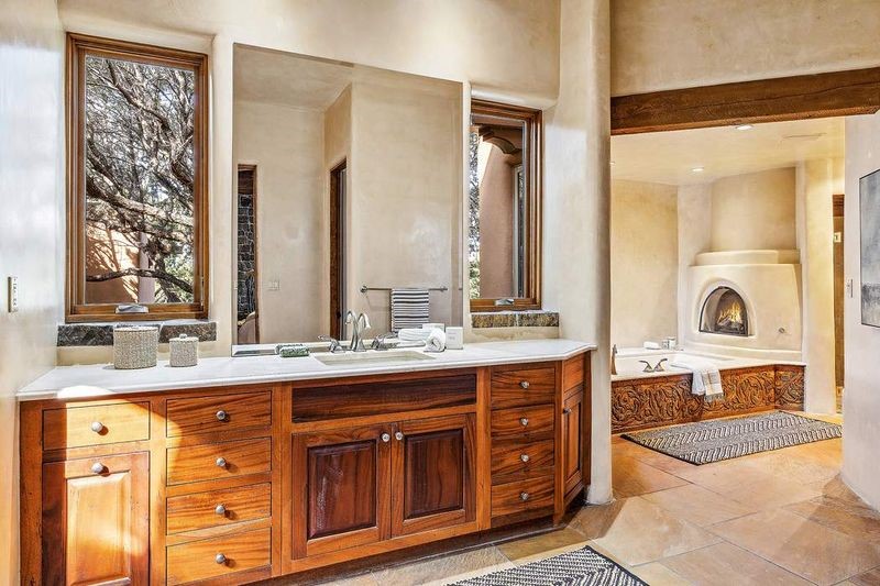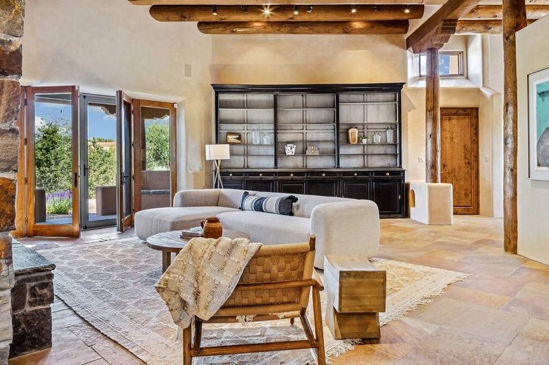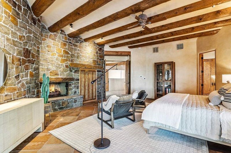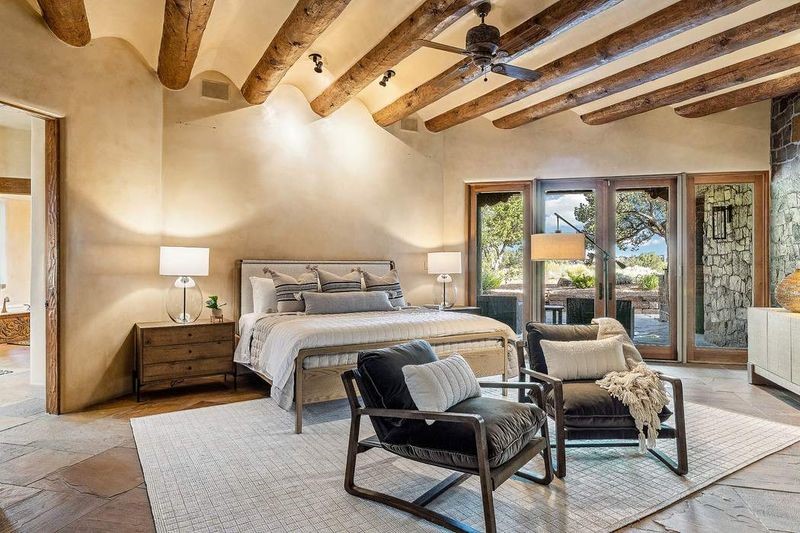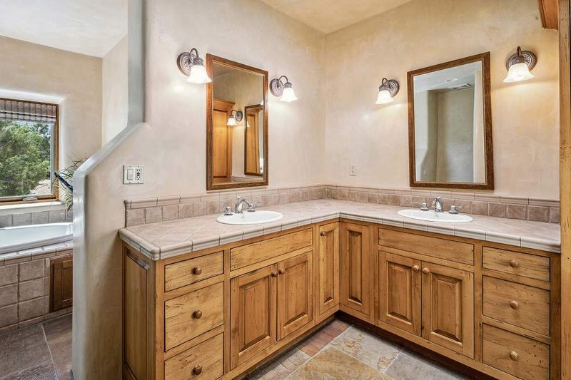 One of the most extraordinary estates in all of Santa Fe, this exquisite 7,700 square foot house and guest house with stunning Jemez Mountain views is sited to perfection overlooking the 14th green on the Sunrise Golf Course within the master planned community of Las Campanas. Designed to celebrate the ultimate Santa Fe lifestyle, this Rastra and Pumice Crete-constructed estate was built and updated with the highest level of luxury finishes, which impresses with superior custom craftsmanship and offers an incredible outdoor living experience with vibrant landscape, a rare viewing deck with a fireplace, and surround outdoor entertainment areas, complete with outdoor fireplaces, and a built-in BBQ, all of which overlook the golf course and views. The 5700 square foot main house offers excellent separation of space with 3 bedrooms/5 baths + office/media room, with a dedicated wine room and a 2-car garage. Guests enjoy full independence with a spacious detached, 2,000 square foot, 2 bedroom/2 bath guest house, complete with a full kitchen, spacious living room, and a 2 car garage. Design features include a welcoming private driveway with custom pavers, a dramatic front entrance which beautifully captures the views upon entering the main house, a recently updated designer's island kitchen with state-of-the-art appliances and an expansive formal living room with stunning views, grand fireplace and portal access. Located off the main living room and kitchen is the spacious formal dining area and an intimate seating area, also with views and portal access. The private owner's suite delights with views, fireplace and a newly updated spa-like bath with natural stone counters, tranquil soaking tub with an elevated fireplace, walk-in shower, dual vanities and closets. Separate from the main living area, within the main house are 2 guest bedroom ensuites, which share their own living room. This epic home is a rare offering and represents true Santa Fe luxury with sophistication.