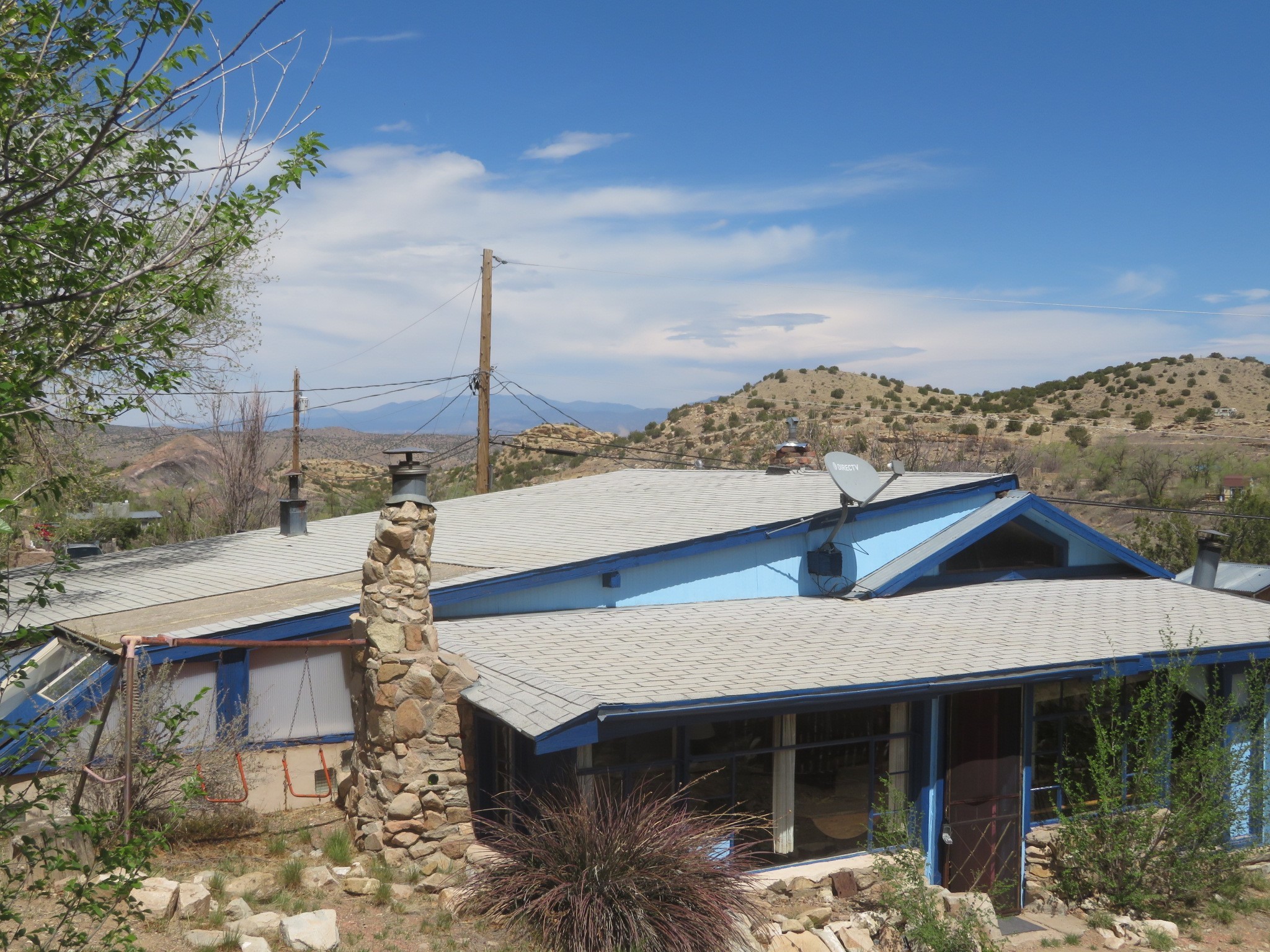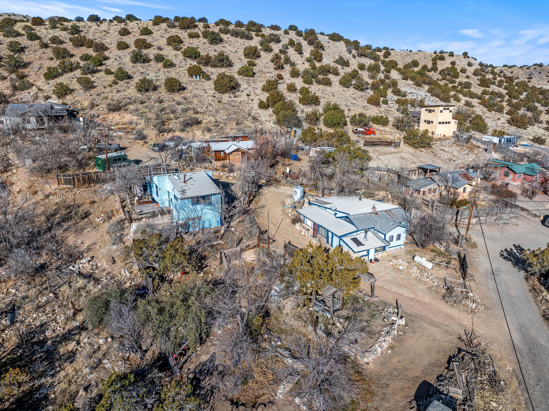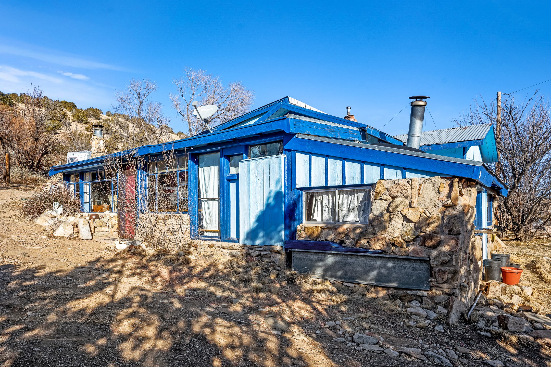 Fix 'em up!--project opportunity in Madrid on nice view lot. Recent price improvement, too. Two homes, two addresses---2 Grasshopper and 29 Backroad, both one of a kind, Madrid-style structures, of stone, wood, and metal siding, both with striking views of hillsides, mountains and town. The much-loved home and semi- industrial metal building --the "warehouse/apartment" will make great projects! You can live in one while you fix up or rent the other as the past owner did, or use as your workshop, home business, storage, garage, etc. On a treed, spacious lot with landscaped terraces and a rocky little arroyo, there's room to park and relax in the yard. Elements of Madrid's old mining days abound: beams from the old Madrid mine building and "found objects" incorporated into the facade. The County Assessor estimates the stone/wood house at 1112 sq ft and the warehouse/apartment at approx. 784 sq ft. Conventional electric, Madrid water membership. Nearby to everything Madrid including the tavern, dispensary, restaurants and galleries, trails, ballpark, and more.
