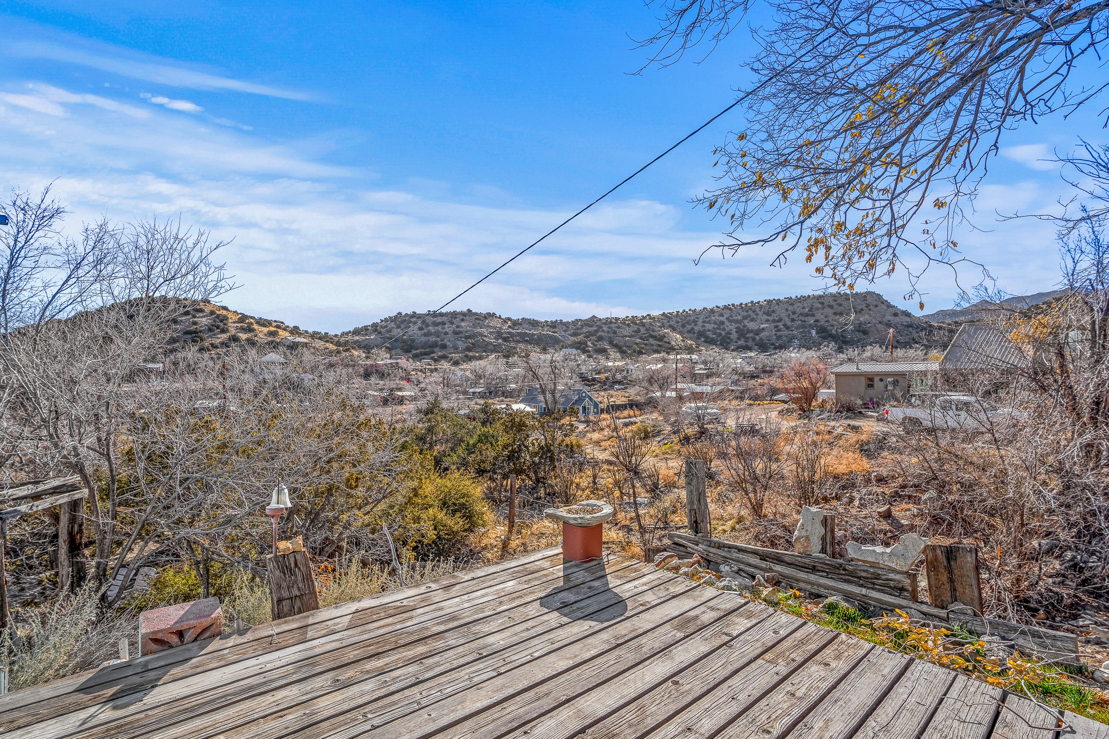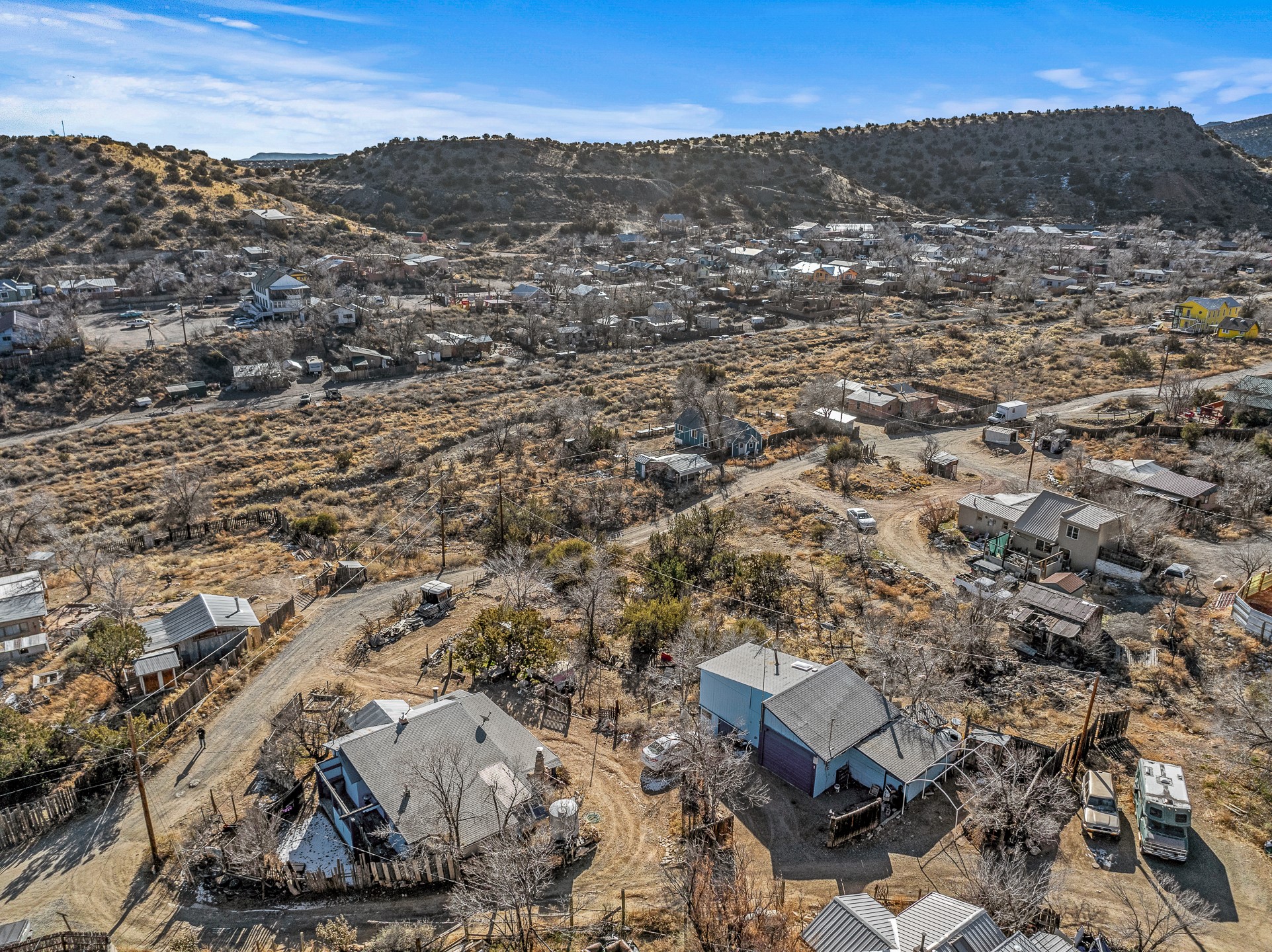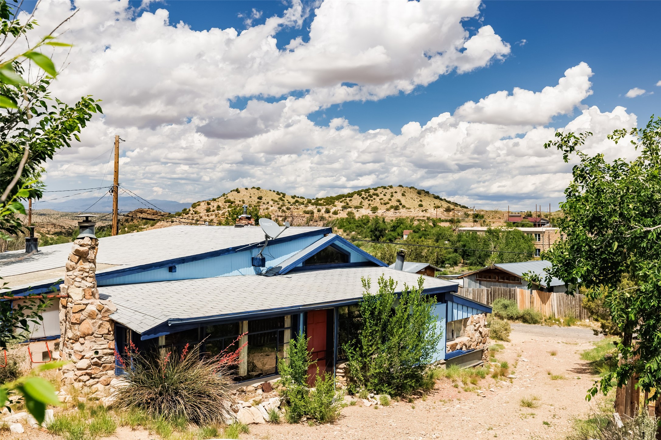 Fix 'em up!--project opportunity in Madrid on nice view lot. Recent price improvement, too. Two homes, two addresses---2 Grasshopper and 29 Backroad, both one of a kind, Madrid-style structures, of stone, wood, and metal siding, both with striking views of hillsides, mountains and town. The much-loved home and semi- industrial metal building --the "warehouse/apartment" will make great projects! You can live in one while you fix up or rent the other as the past owner did, or use as your workshop, home business, storage, garage, etc. On a treed, spacious lot with landscaped terraces and a rocky little arroyo, there's room to park and relax in the yard. Elements of Madrid's old mining days abound: beams from the old Madrid mine building and "found objects" incorporated into the facade. The County Assessor estimates the stone/wood house at 1112 sq ft and the warehouse/apartment at approx. 784 sq ft. Conventional electric, Madrid water membership. Nearby to everything Madrid including the tavern, dispensary, restaurants and galleries, trails, ballpark, and more.
