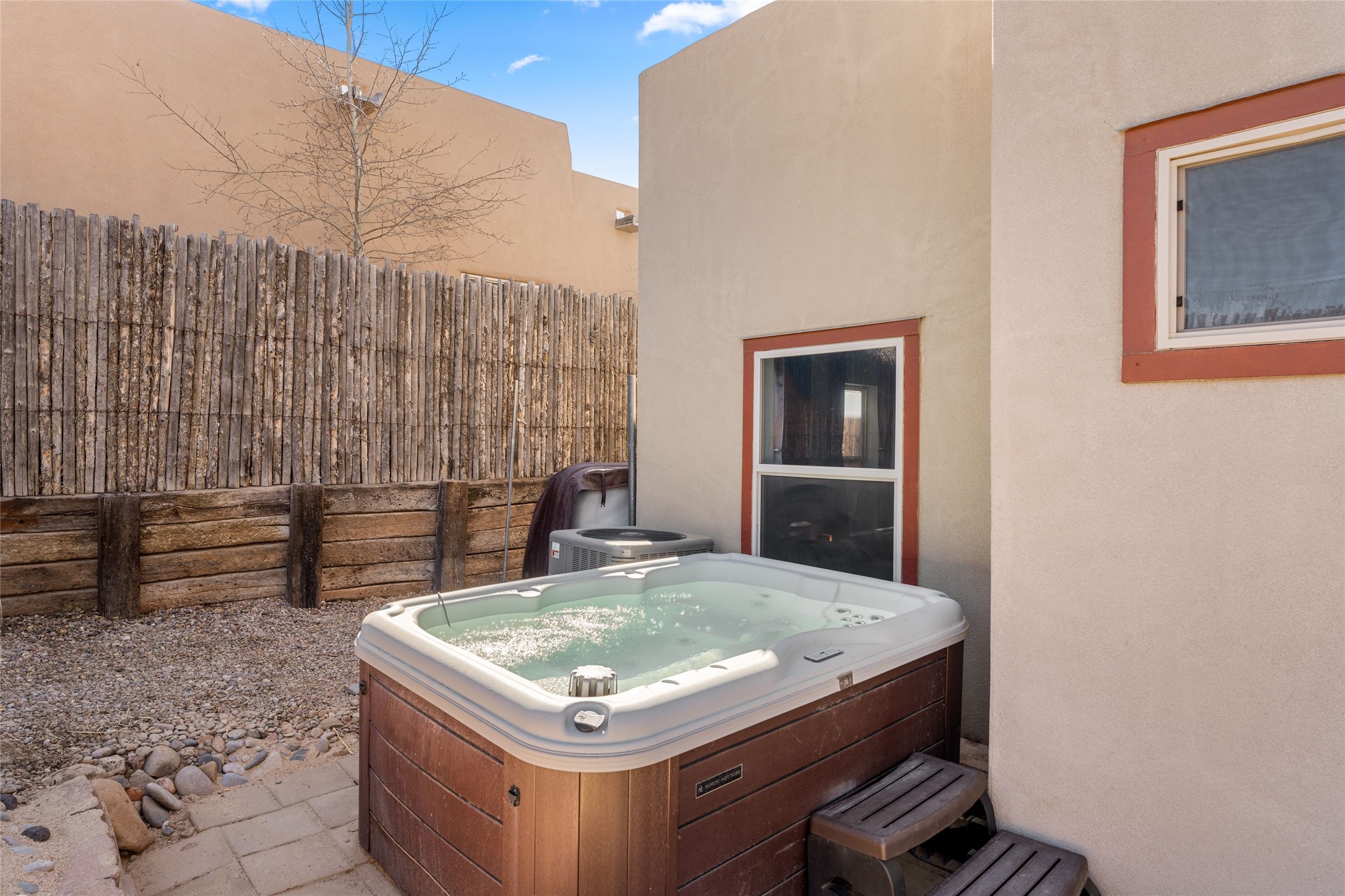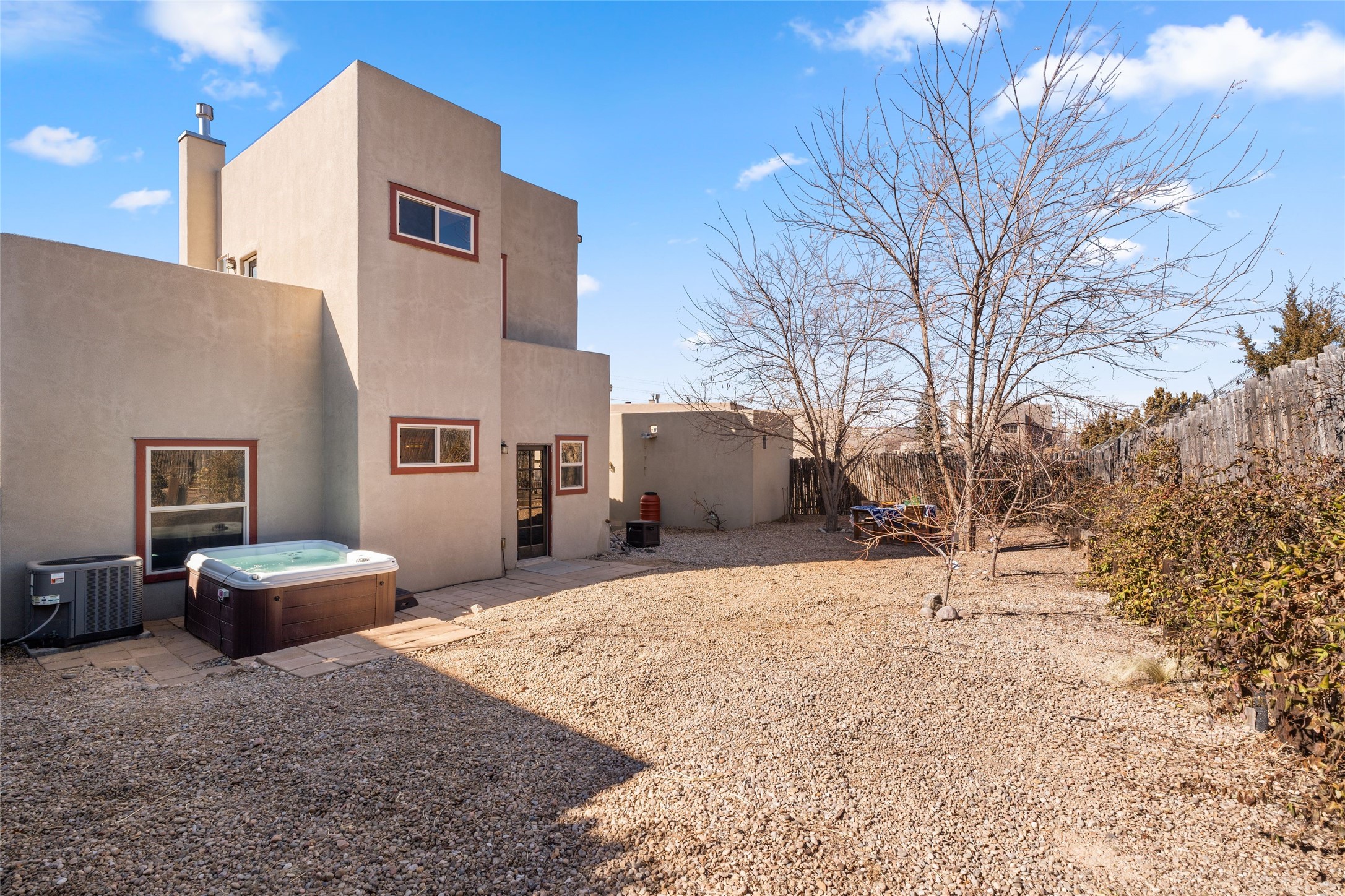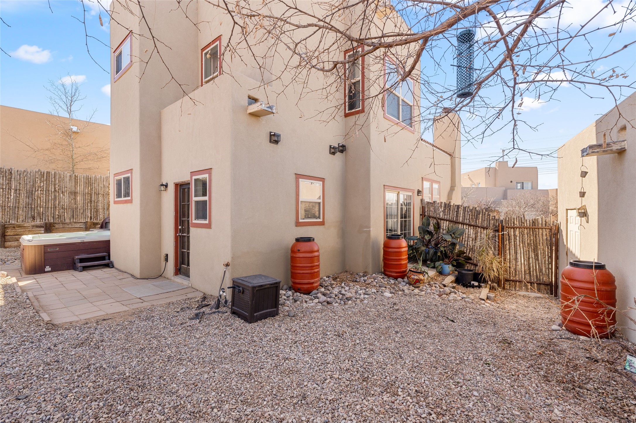 This upgraded and beautifully maintained Nava Ade home offers a perfect blend of comfort and convenience. As you enter under the fruit-bearing plum tree by the front door, you'll be greeted by an open living and dining area, with easy access to the expansive backyard - perfect for entertaining or relaxation. The home boasts a cozy wood-burning fireplace, ideal for those chilly evenings. The renovated kitchen features upgraded quartz countertops and a stylishly tiled backsplash that adds character and functionality. The home has two bedrooms and a full bath downstairs with a principal suite upstairs including ensuite bath, walk-in closet, and a private deck - a great spot to unwind and enjoy the surrounding views. The roomy pantry, laundry area, and closets all have built-in shelving. The large, fully fenced backyard features a hot tub and producing fruit trees, including apple, apricot, and peach, as well as three varieties of grapes, a perfect place to enjoy the seasons. The property is situated in the desirable Nava Ade community offering top-notch amenities, including a swimming pool, exercise room, steam shower, clubhouse, and a scenic path and trail system. Conveniently located just 15 minutes from the historic downtown Plaza and with easy access to retail shops and I-25, this home is ideally located for both relaxation and convenience.