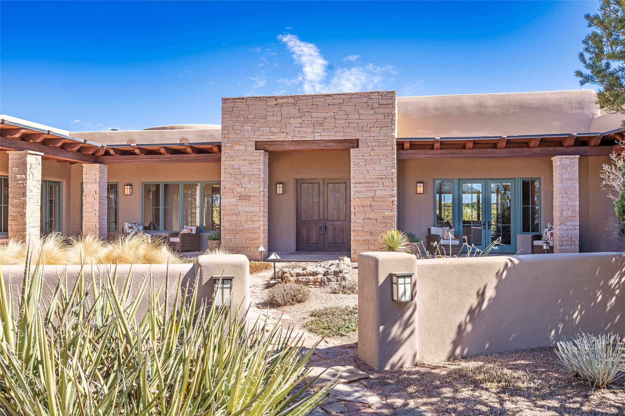 DYNAMIC AND CAPTIVATING MOUNTAIN VIEWS FROM THIS STUNNING LAS CAMPANAS ESTATE SITED HIGH ON A PRIME ELEVATED LOT AT THE END OF A TRANQUIL CUL-DE-SAC. This stunning estate captures the essence of Santa Fe living at its finest. Set on just over three acres, with sweeping views of the Sangre de Cristo mountains from every major room, the property offers a rare sense of privacy and luxe living. A beautifully landscaped courtyard welcomes you, with the soothing sound of water features and striking Anasazi stacked stone columns setting the stage for what awaits you inside. Enter through impressive tall wooden entry doors, and the mountains unfold before you - framed by warm wood and hand-detailed features. Traditional vigas stretch across the ceilings, while soft diamond plaster walls glow in the changing light of the day... With eight fireplaces throughout, the home feels both elegant and deeply comforting. Designed for effortless living and entertaining, the main house features formal and informal living and dining areas, a chef's kitchen with high-end appliances, and expansive counters. The home easily spans inside and outside areas - perfect for soaking in Santa Fe's breathtaking sunsets. The owner's suite is a retreat of its own, opening to the front courtyard and a private covered portal. A cozy sitting room, an oversized spa-like bath, and a custom walk-in closet set the tone for this personal sanctuary. Across the courtyard, the guest house offers a private space with its own bedroom, bath, and all the warmth of the main home. And when the moment calls for something truly special, the rooftop terrace offers a front-row seat to Santa Fe's endless vistas. Tucked just out of sight, the oversized yet discreet three-car garage keeps the home's approach pristine, allowing its timeless beauty to shine. This is more than just a home - it's an experience, a place where traditional Santa Fe charm meets refined comfort in the most effortless way.