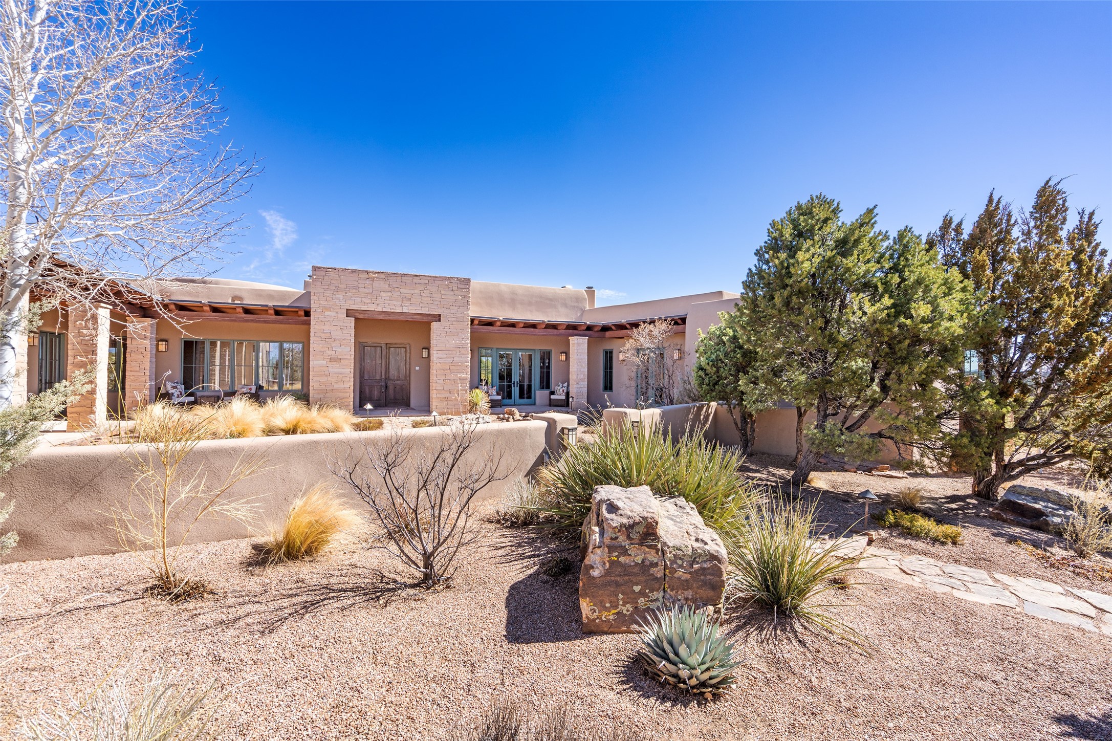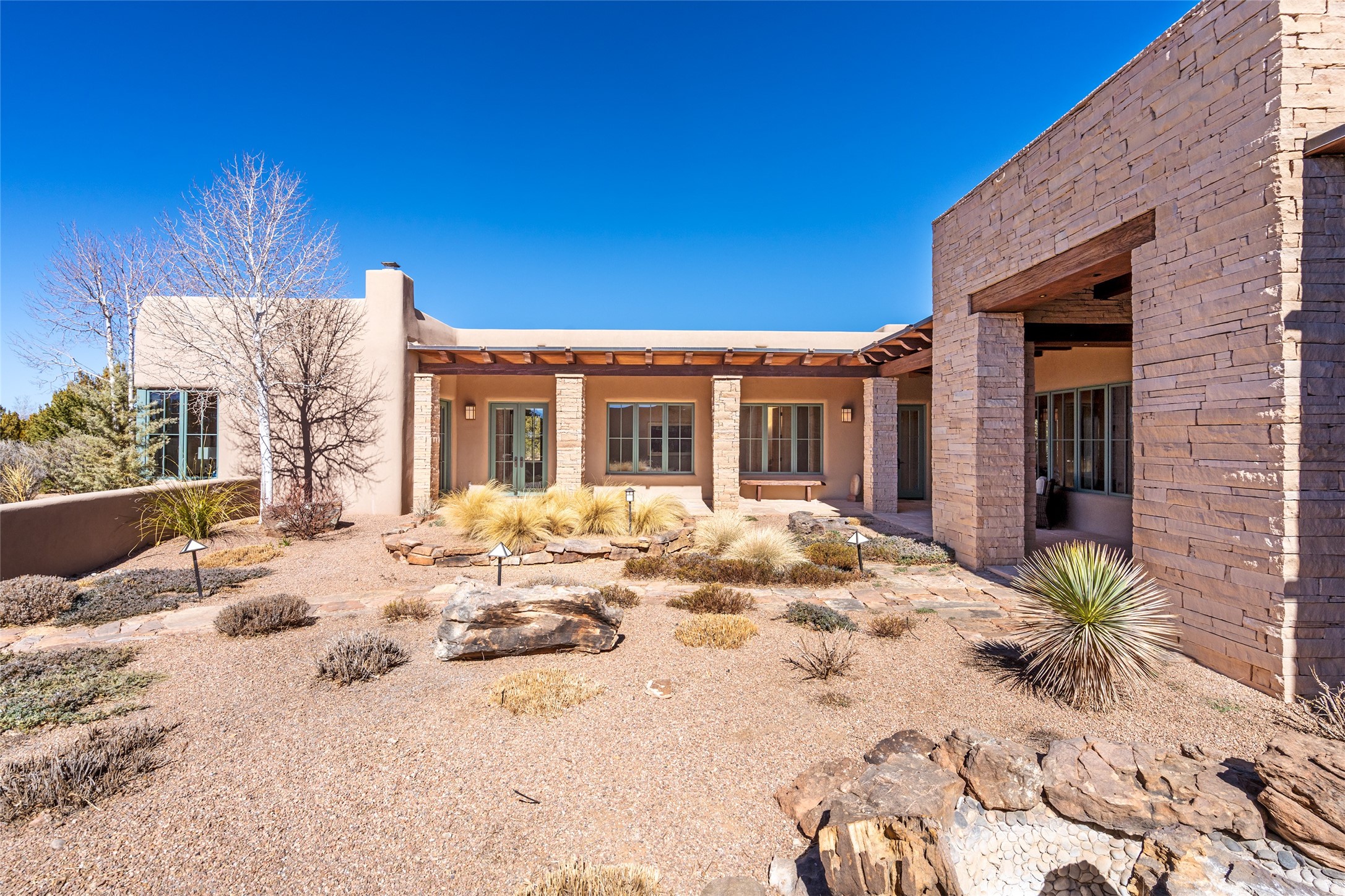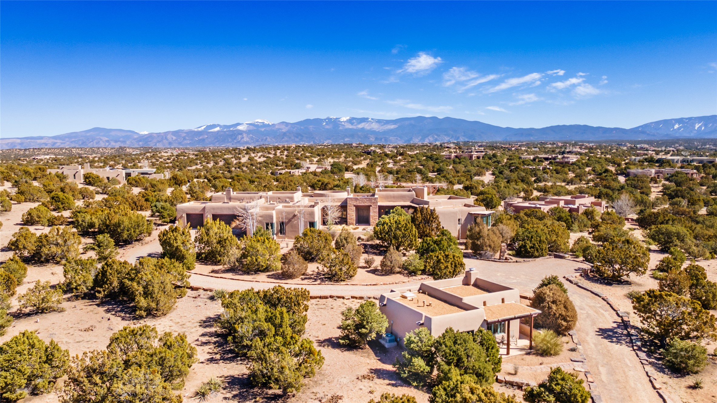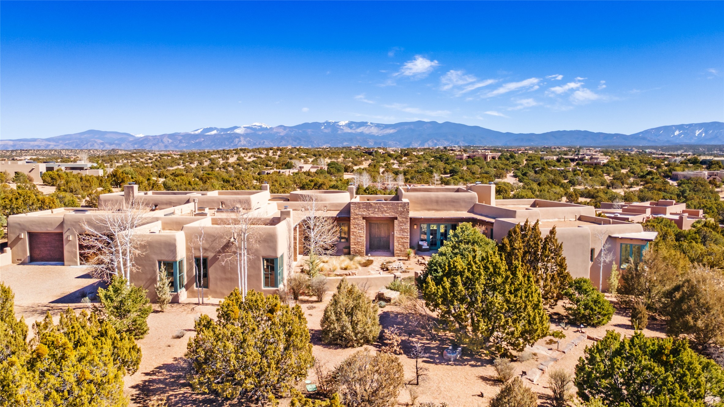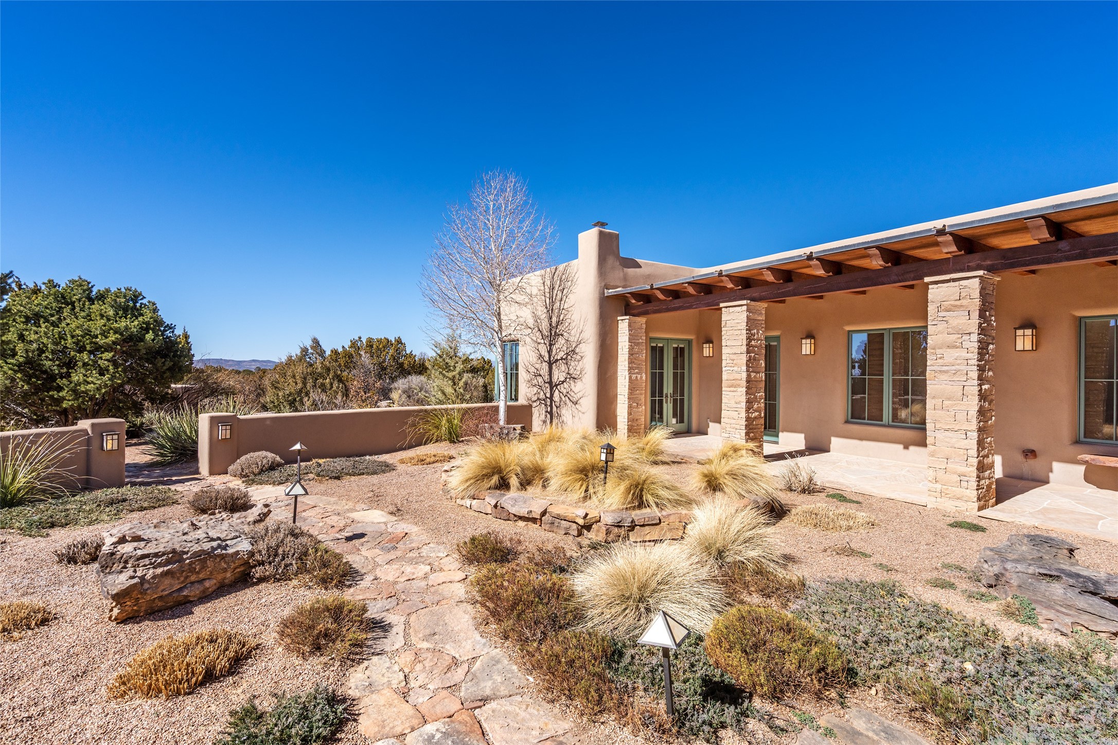 DYNAMIC AND CAPTIVATING MOUNTAIN VIEWS FROM THIS STUNNING LAS CAMPANAS ESTATE SITED HIGH ON A PRIME ELEVATED LOT AT THE END OF A TRANQUIL CUL-DE-SAC. This stunning estate captures the essence of Santa Fe living at its finest. Set on just over three acres, with sweeping views of the Sangre de Cristo mountains from every major room, the property offers a rare sense of privacy and luxe living. A beautifully landscaped courtyard welcomes you, with the soothing sound of water features and striking Anasazi stacked stone columns setting the stage for what awaits you inside. Enter through impressive tall wooden entry doors, and the mountains unfold before you - framed by warm wood and hand-detailed features. Traditional vigas stretch across the ceilings, while soft diamond plaster walls glow in the changing light of the day... With eight fireplaces throughout, the home feels both elegant and deeply comforting. Designed for effortless living and entertaining, the main house features formal and informal living and dining areas, a chef's kitchen with high-end appliances, and expansive counters. The home easily spans inside and outside areas - perfect for soaking in Santa Fe's breathtaking sunsets. The owner's suite is a retreat of its own, opening to the front courtyard and a private covered portal. A cozy sitting room, an oversized spa-like bath, and a custom walk-in closet set the tone for this personal sanctuary. Across the courtyard, the guest house offers a private space with its own bedroom, bath, and all the warmth of the main home. And when the moment calls for something truly special, the rooftop terrace offers a front-row seat to Santa Fe's endless vistas. Tucked just out of sight, the oversized yet discreet three-car garage keeps the home's approach pristine, allowing its timeless beauty to shine. This is more than just a home - it's an experience, a place where traditional Santa Fe charm meets refined comfort in the most effortless way.