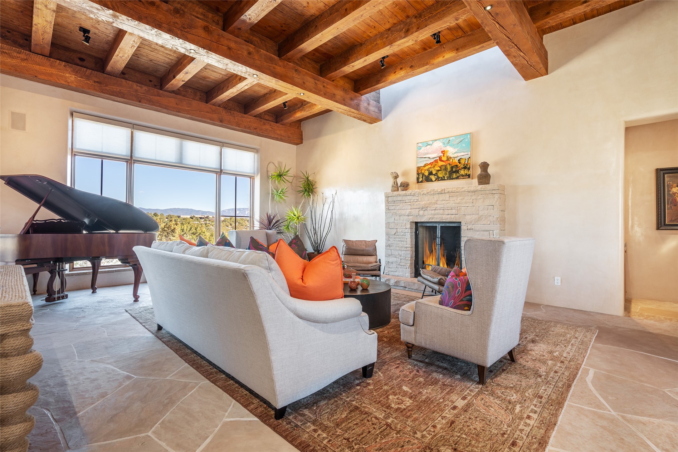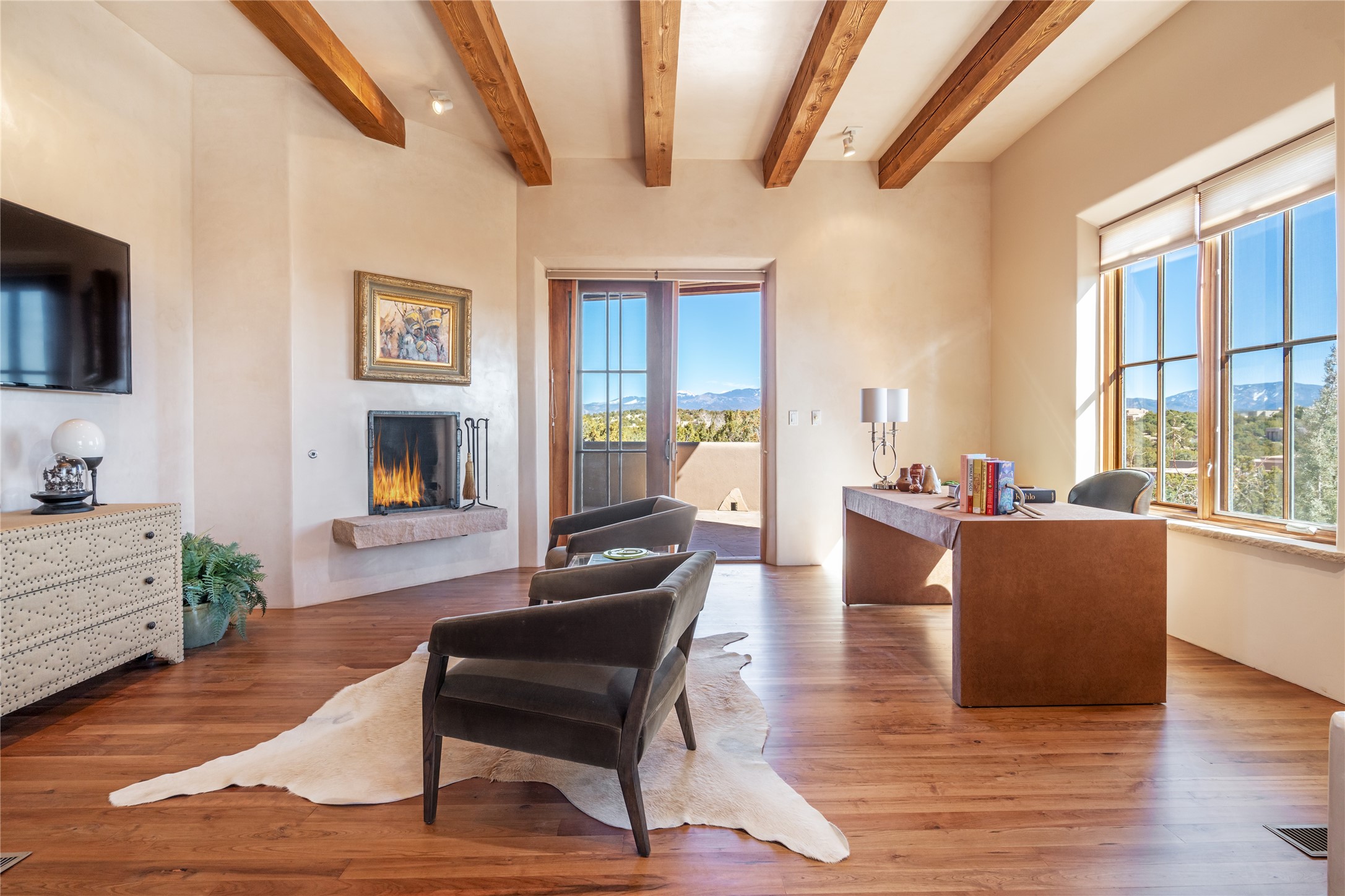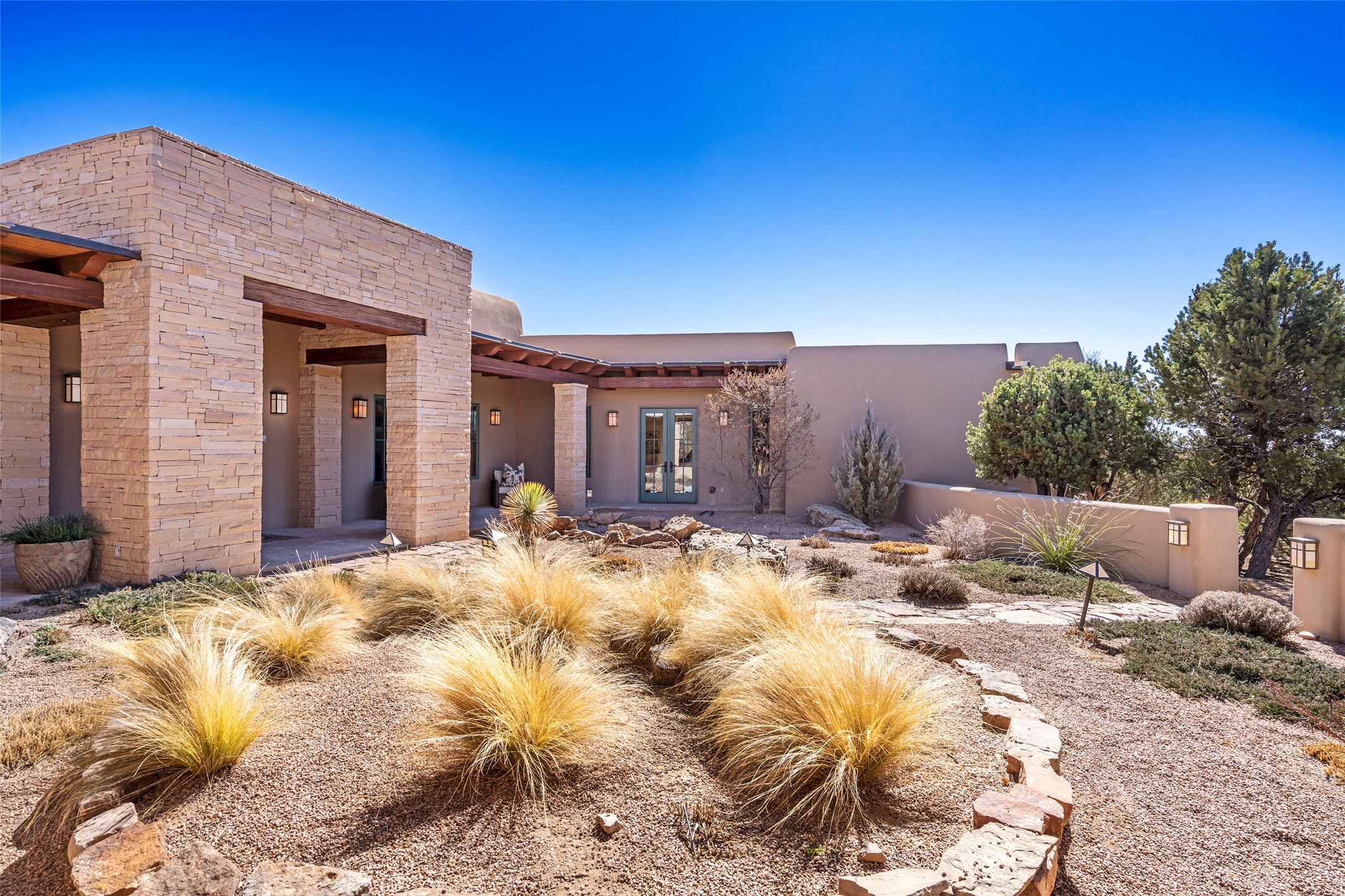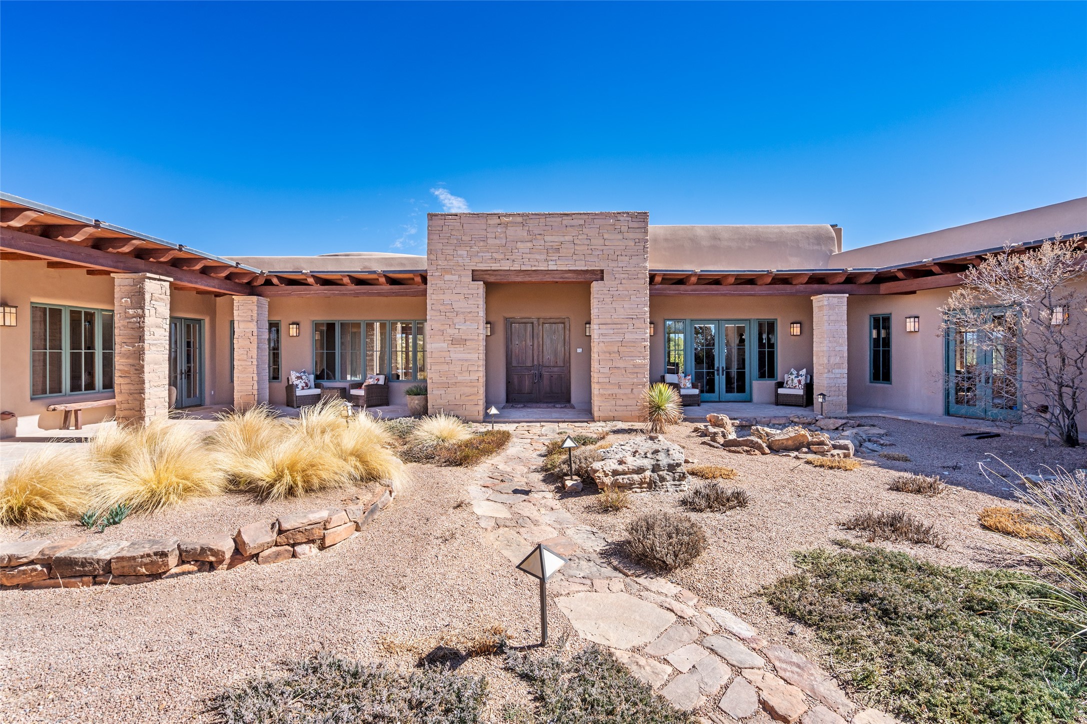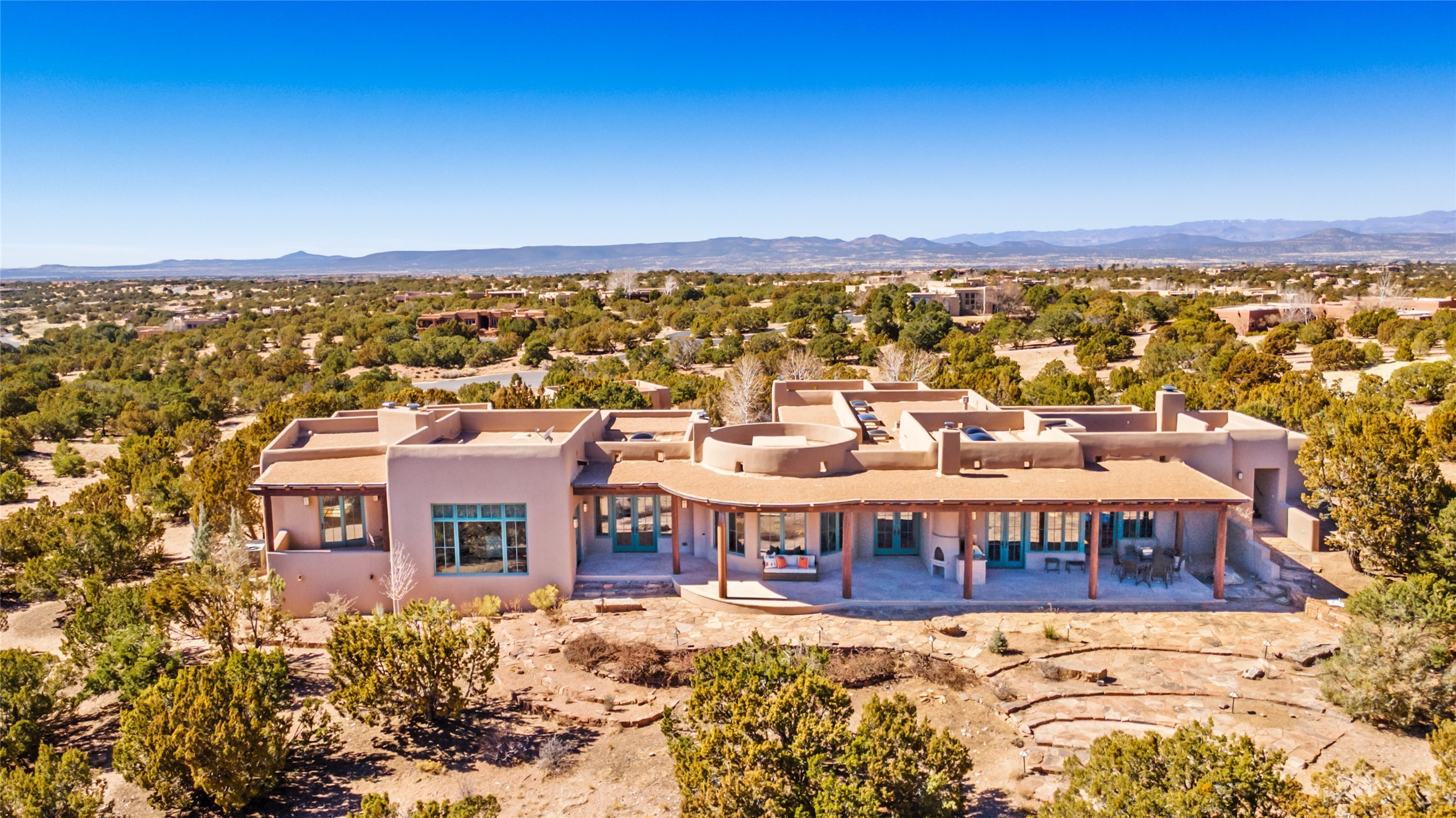 DYNAMIC AND CAPTIVATING MOUNTAIN VIEWS FROM THIS STUNNING LAS CAMPANAS ESTATE SITED HIGH ON A PRIME ELEVATED LOT AT THE END OF A TRANQUIL CUL-DE-SAC. This stunning estate captures the essence of Santa Fe living at its finest. Set on just over three acres, with sweeping views of the Sangre de Cristo mountains from every major room, the property offers a rare sense of privacy and luxe living. A beautifully landscaped courtyard welcomes you, with the soothing sound of water features and striking Anasazi stacked stone columns setting the stage for what awaits you inside. Enter through impressive tall wooden entry doors, and the mountains unfold before you - framed by warm wood and hand-detailed features. Traditional vigas stretch across the ceilings, while soft diamond plaster walls glow in the changing light of the day... With eight fireplaces throughout, the home feels both elegant and deeply comforting. Designed for effortless living and entertaining, the main house features formal and informal living and dining areas, a chef's kitchen with high-end appliances, and expansive counters. The home easily spans inside and outside areas - perfect for soaking in Santa Fe's breathtaking sunsets. The owner's suite is a retreat of its own, opening to the front courtyard and a private covered portal. A cozy sitting room, an oversized spa-like bath, and a custom walk-in closet set the tone for this personal sanctuary. Across the courtyard, the guest house offers a private space with its own bedroom, bath, and all the warmth of the main home. And when the moment calls for something truly special, the rooftop terrace offers a front-row seat to Santa Fe's endless vistas. Tucked just out of sight, the oversized yet discreet three-car garage keeps the home's approach pristine, allowing its timeless beauty to shine. This is more than just a home - it's an experience, a place where traditional Santa Fe charm meets refined comfort in the most effortless way.