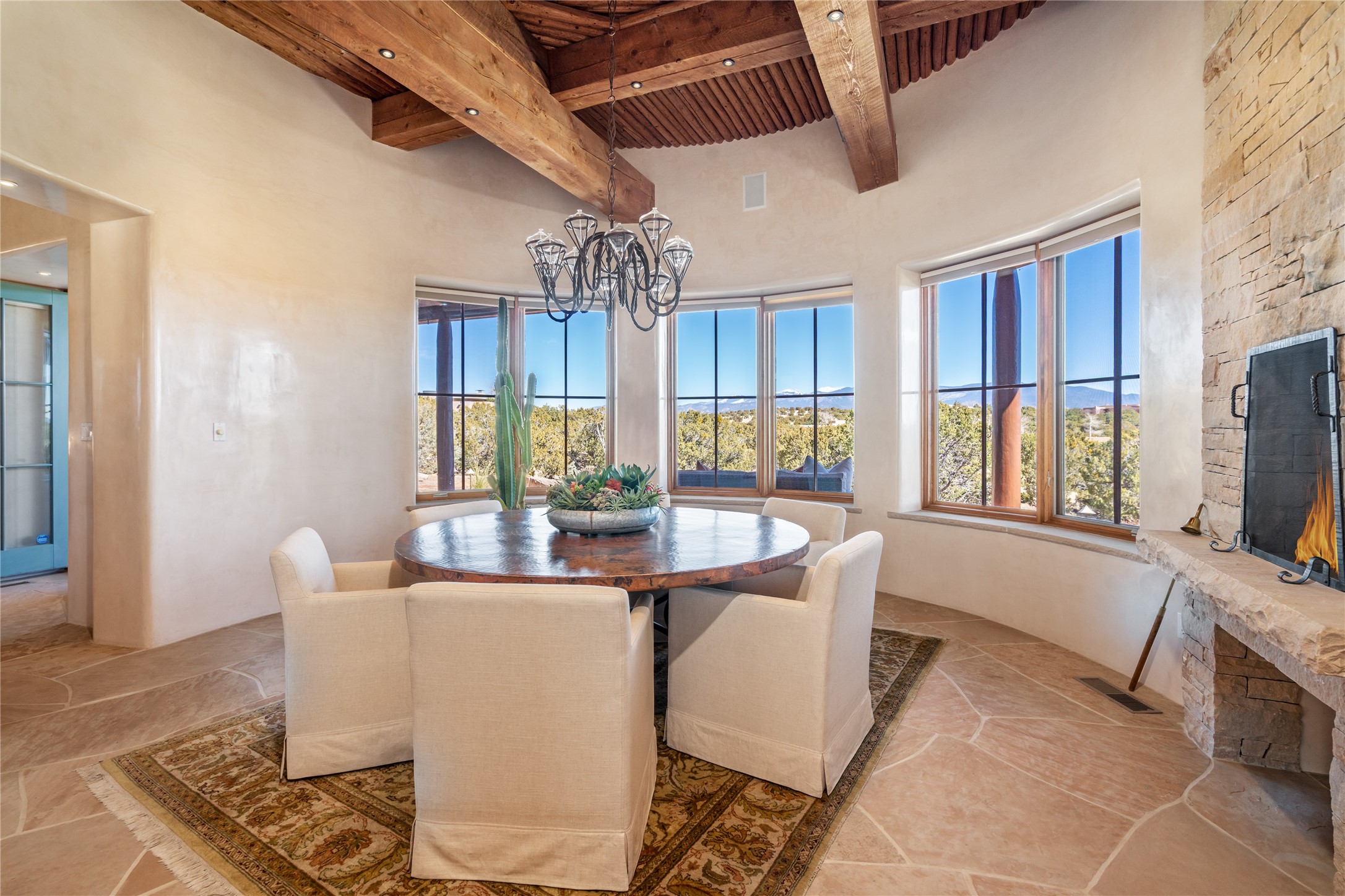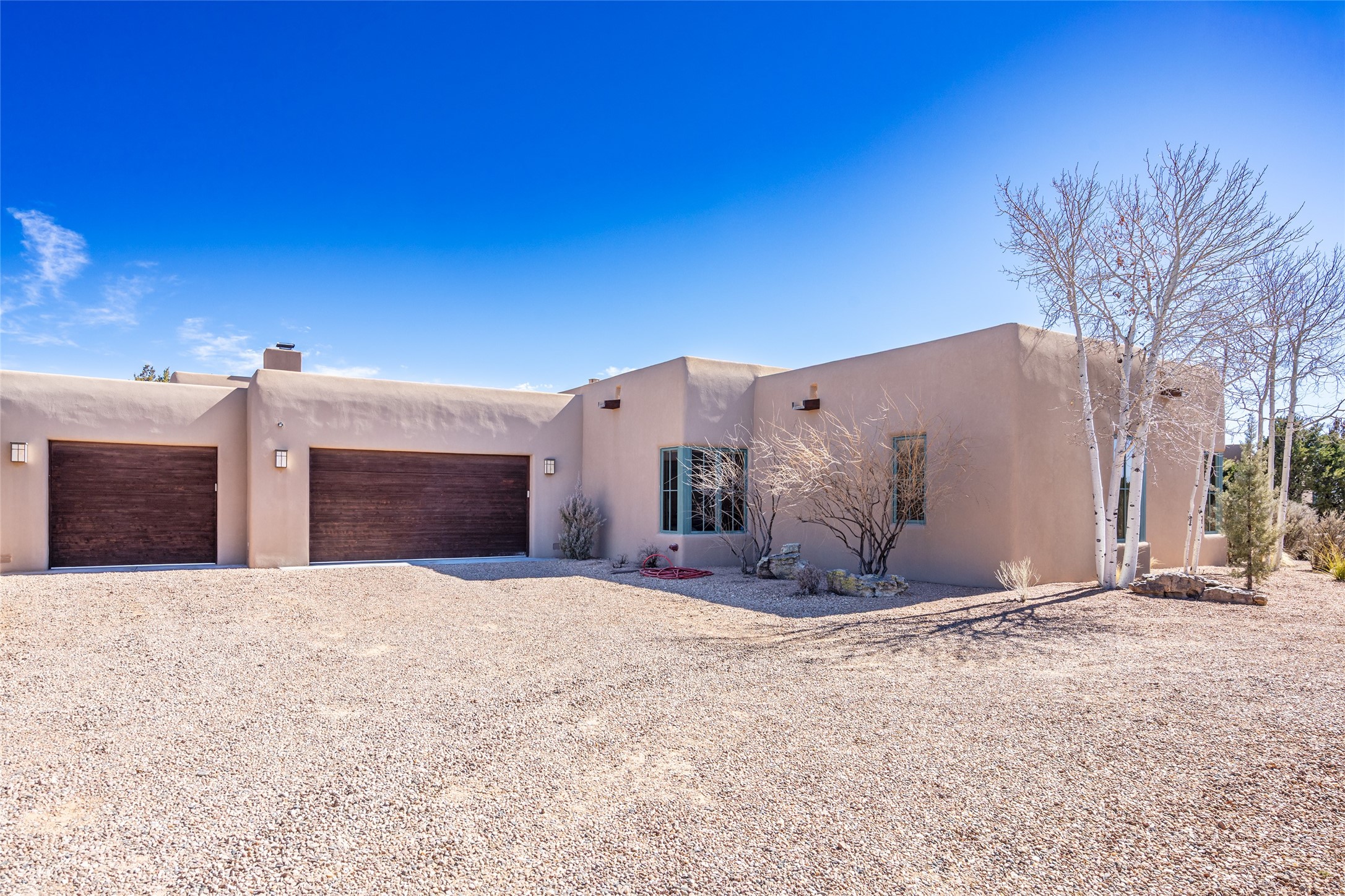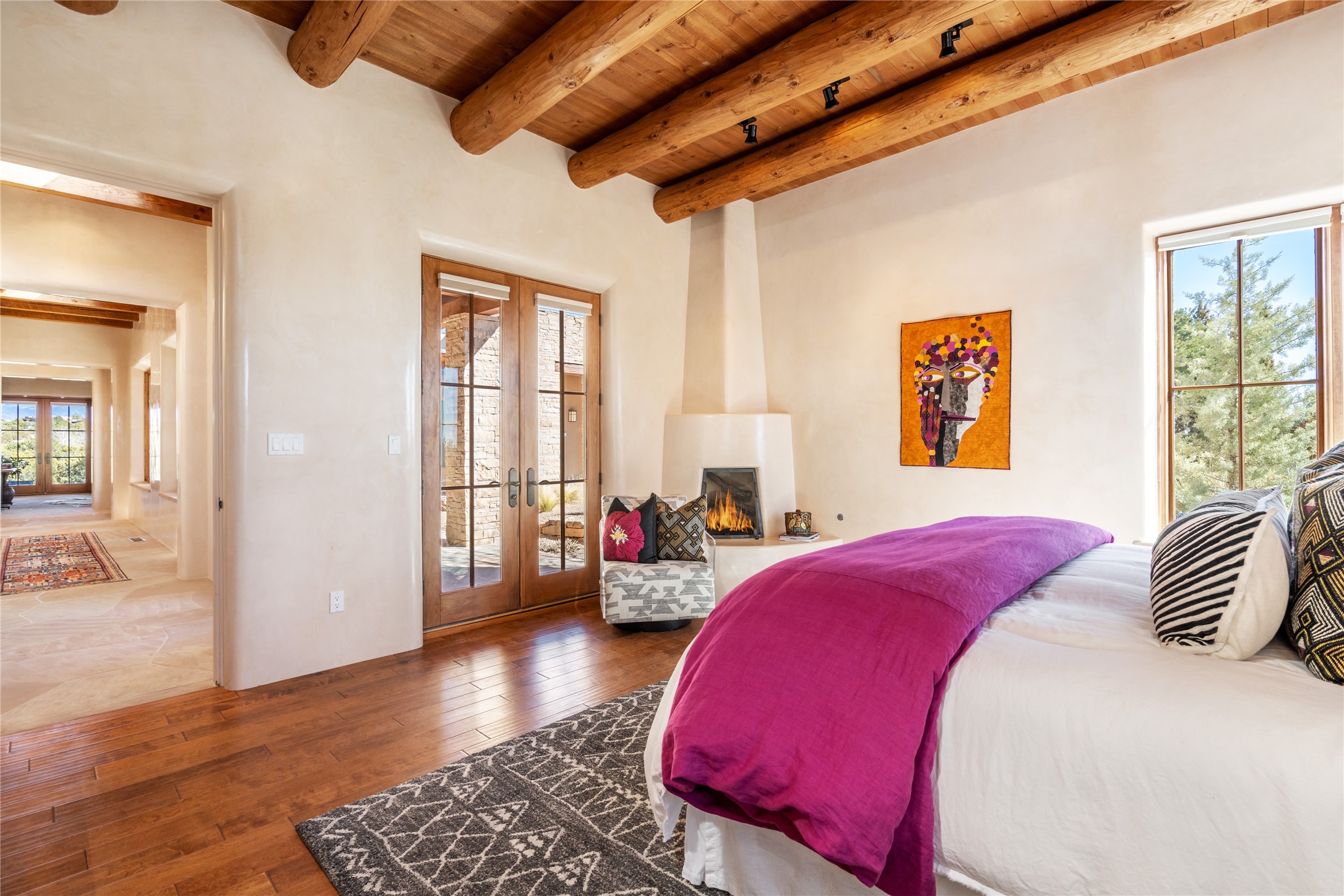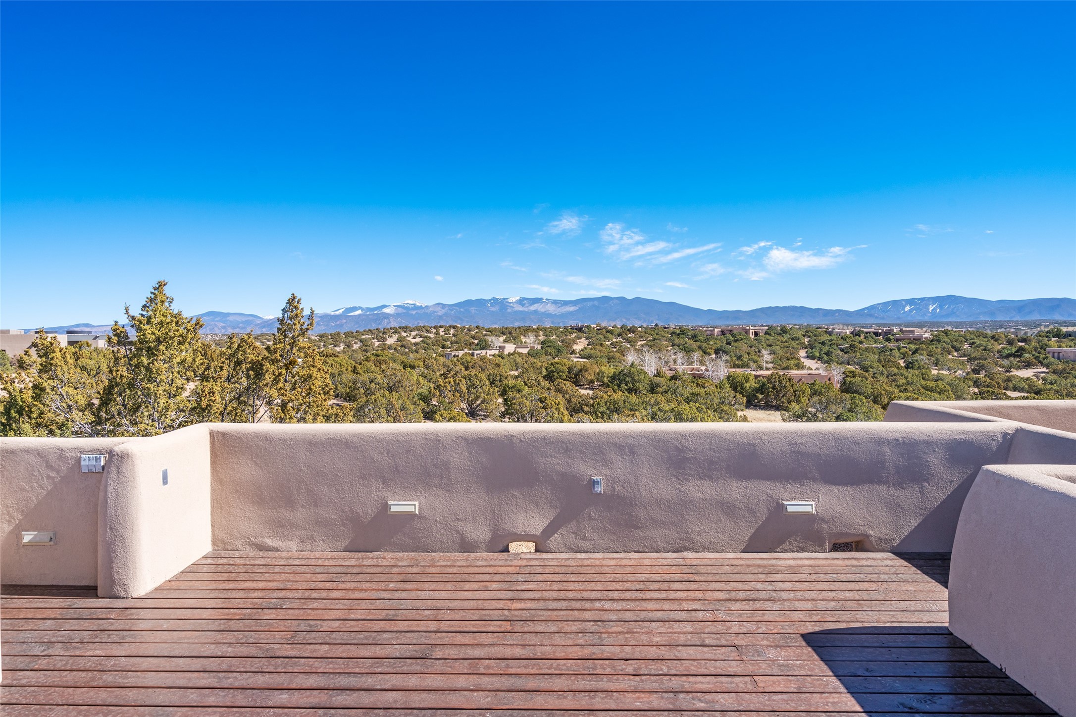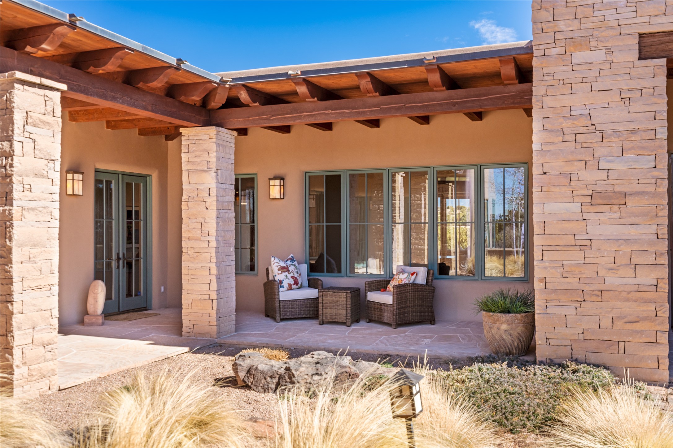 DYNAMIC AND CAPTIVATING MOUNTAIN VIEWS FROM THIS STUNNING LAS CAMPANAS ESTATE SITED HIGH ON A PRIME ELEVATED LOT AT THE END OF A TRANQUIL CUL-DE-SAC. This stunning estate captures the essence of Santa Fe living at its finest. Set on just over three acres, with sweeping views of the Sangre de Cristo mountains from every major room, the property offers a rare sense of privacy and luxe living. A beautifully landscaped courtyard welcomes you, with the soothing sound of water features and striking Anasazi stacked stone columns setting the stage for what awaits you inside. Enter through impressive tall wooden entry doors, and the mountains unfold before you - framed by warm wood and hand-detailed features. Traditional vigas stretch across the ceilings, while soft diamond plaster walls glow in the changing light of the day... With eight fireplaces throughout, the home feels both elegant and deeply comforting. Designed for effortless living and entertaining, the main house features formal and informal living and dining areas, a chef's kitchen with high-end appliances, and expansive counters. The home easily spans inside and outside areas - perfect for soaking in Santa Fe's breathtaking sunsets. The owner's suite is a retreat of its own, opening to the front courtyard and a private covered portal. A cozy sitting room, an oversized spa-like bath, and a custom walk-in closet set the tone for this personal sanctuary. Across the courtyard, the guest house offers a private space with its own bedroom, bath, and all the warmth of the main home. And when the moment calls for something truly special, the rooftop terrace offers a front-row seat to Santa Fe's endless vistas. Tucked just out of sight, the oversized yet discreet three-car garage keeps the home's approach pristine, allowing its timeless beauty to shine. This is more than just a home - it's an experience, a place where traditional Santa Fe charm meets refined comfort in the most effortless way.
