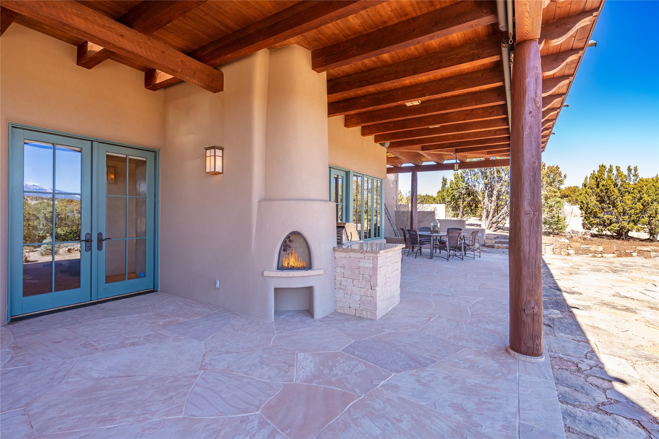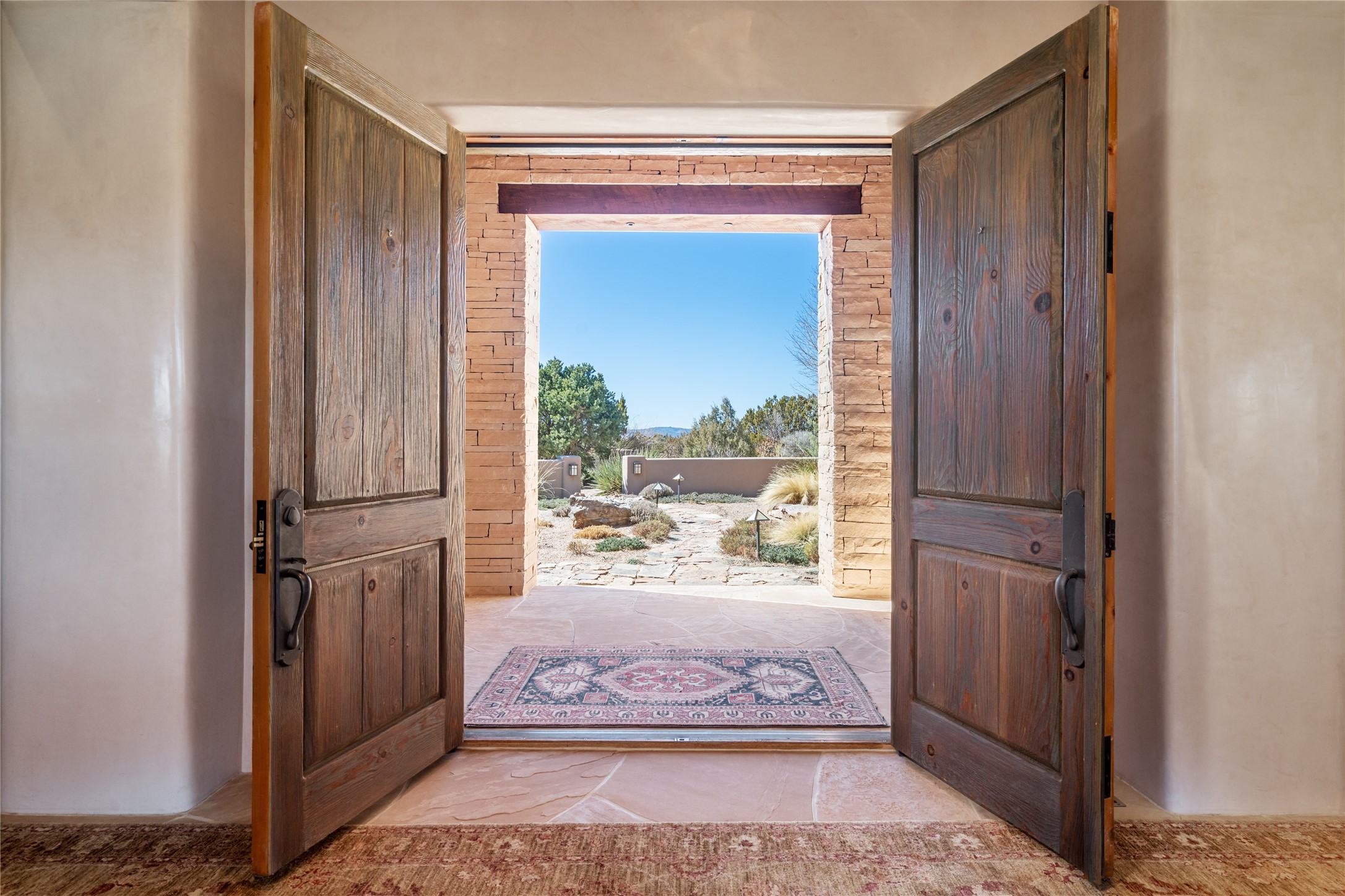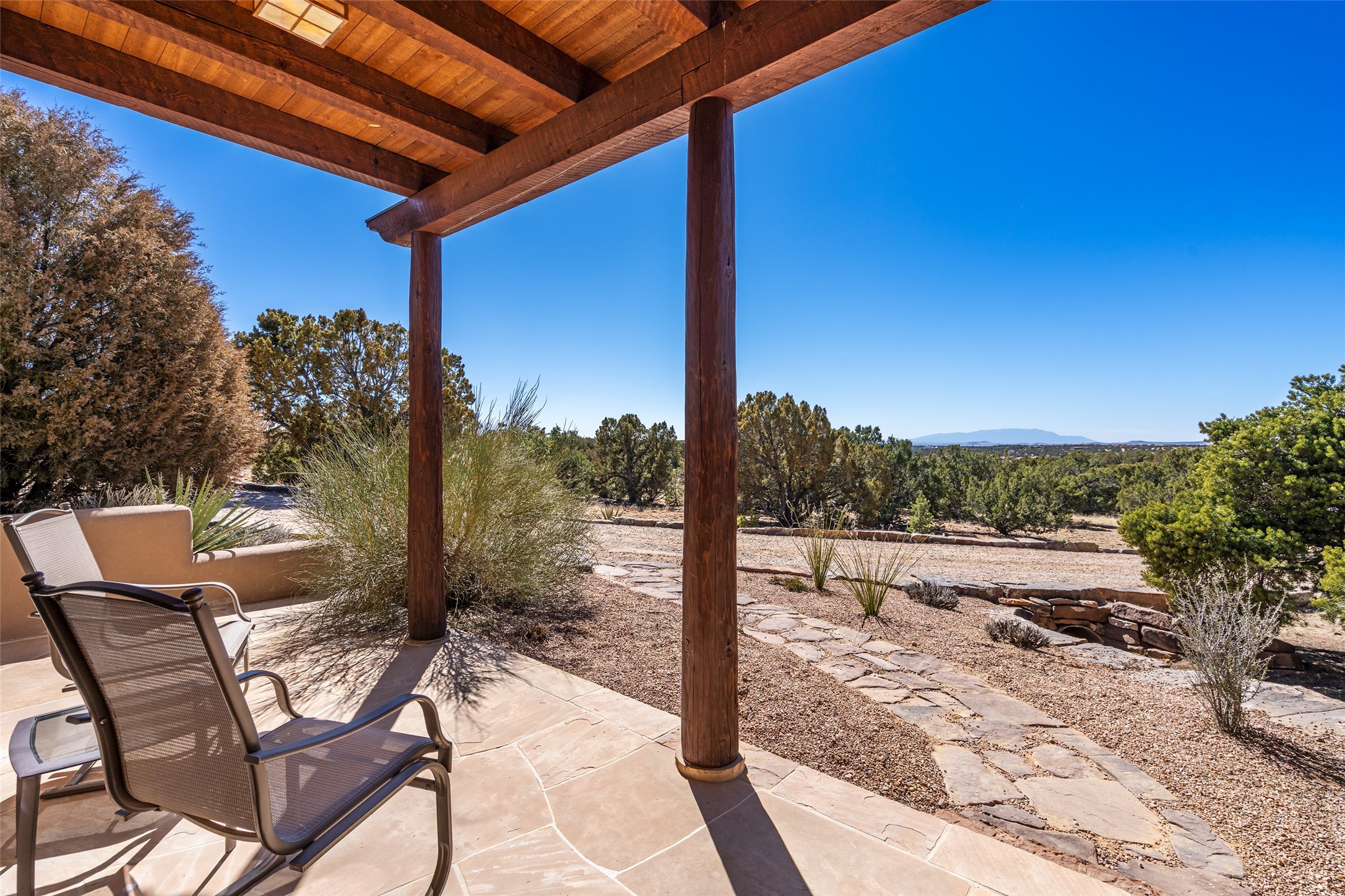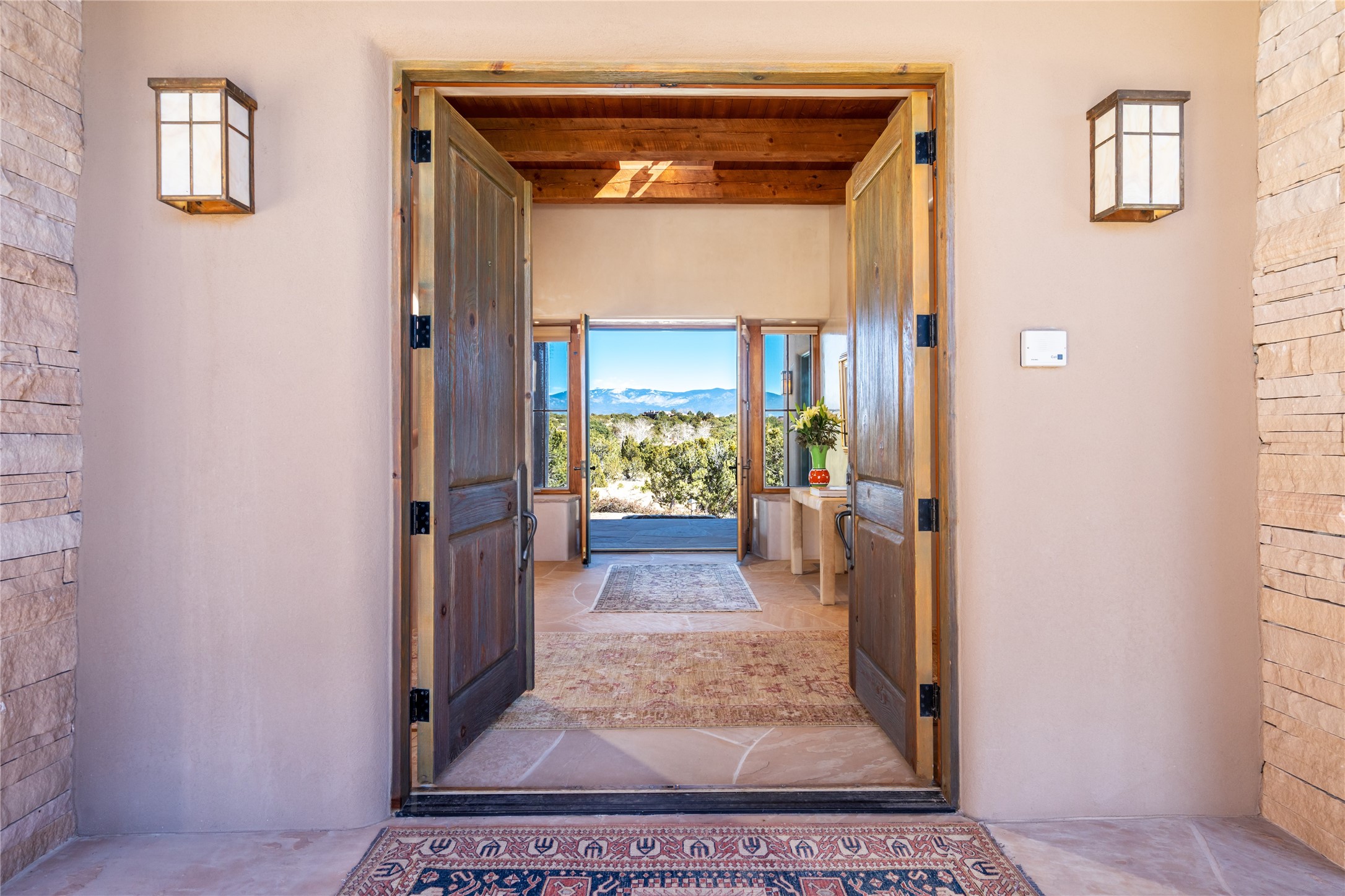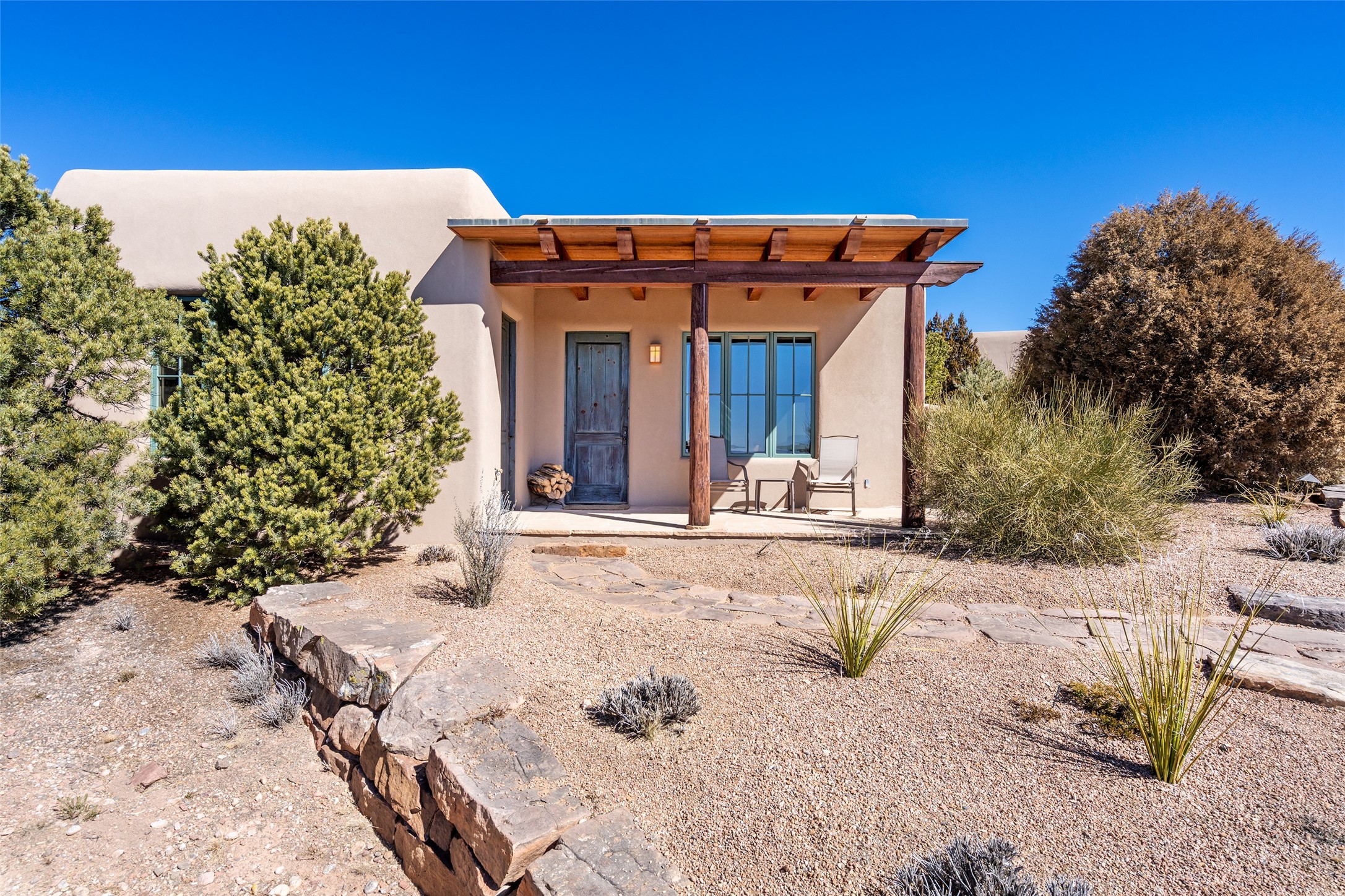 DYNAMIC AND CAPTIVATING MOUNTAIN VIEWS FROM THIS STUNNING LAS CAMPANAS ESTATE SITED HIGH ON A PRIME ELEVATED LOT AT THE END OF A TRANQUIL CUL-DE-SAC. This stunning estate captures the essence of Santa Fe living at its finest. Set on just over three acres, with sweeping views of the Sangre de Cristo mountains from every major room, the property offers a rare sense of privacy and luxe living. A beautifully landscaped courtyard welcomes you, with the soothing sound of water features and striking Anasazi stacked stone columns setting the stage for what awaits you inside. Enter through impressive tall wooden entry doors, and the mountains unfold before you - framed by warm wood and hand-detailed features. Traditional vigas stretch across the ceilings, while soft diamond plaster walls glow in the changing light of the day... With eight fireplaces throughout, the home feels both elegant and deeply comforting. Designed for effortless living and entertaining, the main house features formal and informal living and dining areas, a chef's kitchen with high-end appliances, and expansive counters. The home easily spans inside and outside areas - perfect for soaking in Santa Fe's breathtaking sunsets. The owner's suite is a retreat of its own, opening to the front courtyard and a private covered portal. A cozy sitting room, an oversized spa-like bath, and a custom walk-in closet set the tone for this personal sanctuary. Across the courtyard, the guest house offers a private space with its own bedroom, bath, and all the warmth of the main home. And when the moment calls for something truly special, the rooftop terrace offers a front-row seat to Santa Fe's endless vistas. Tucked just out of sight, the oversized yet discreet three-car garage keeps the home's approach pristine, allowing its timeless beauty to shine. This is more than just a home - it's an experience, a place where traditional Santa Fe charm meets refined comfort in the most effortless way.
