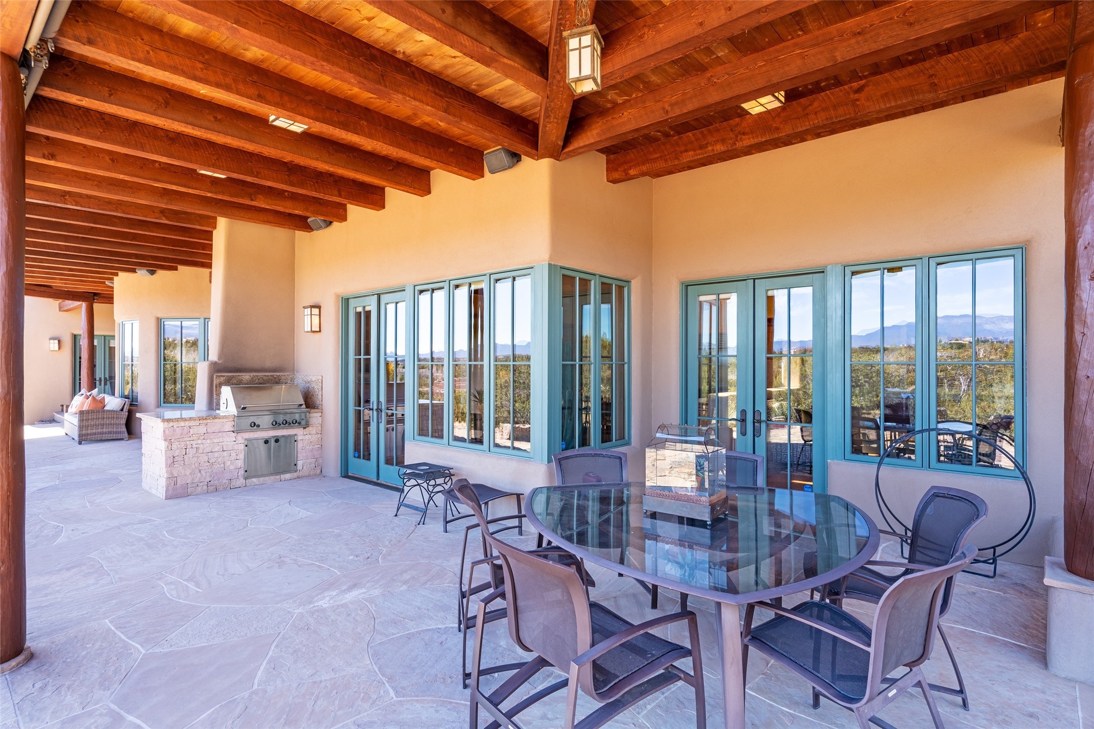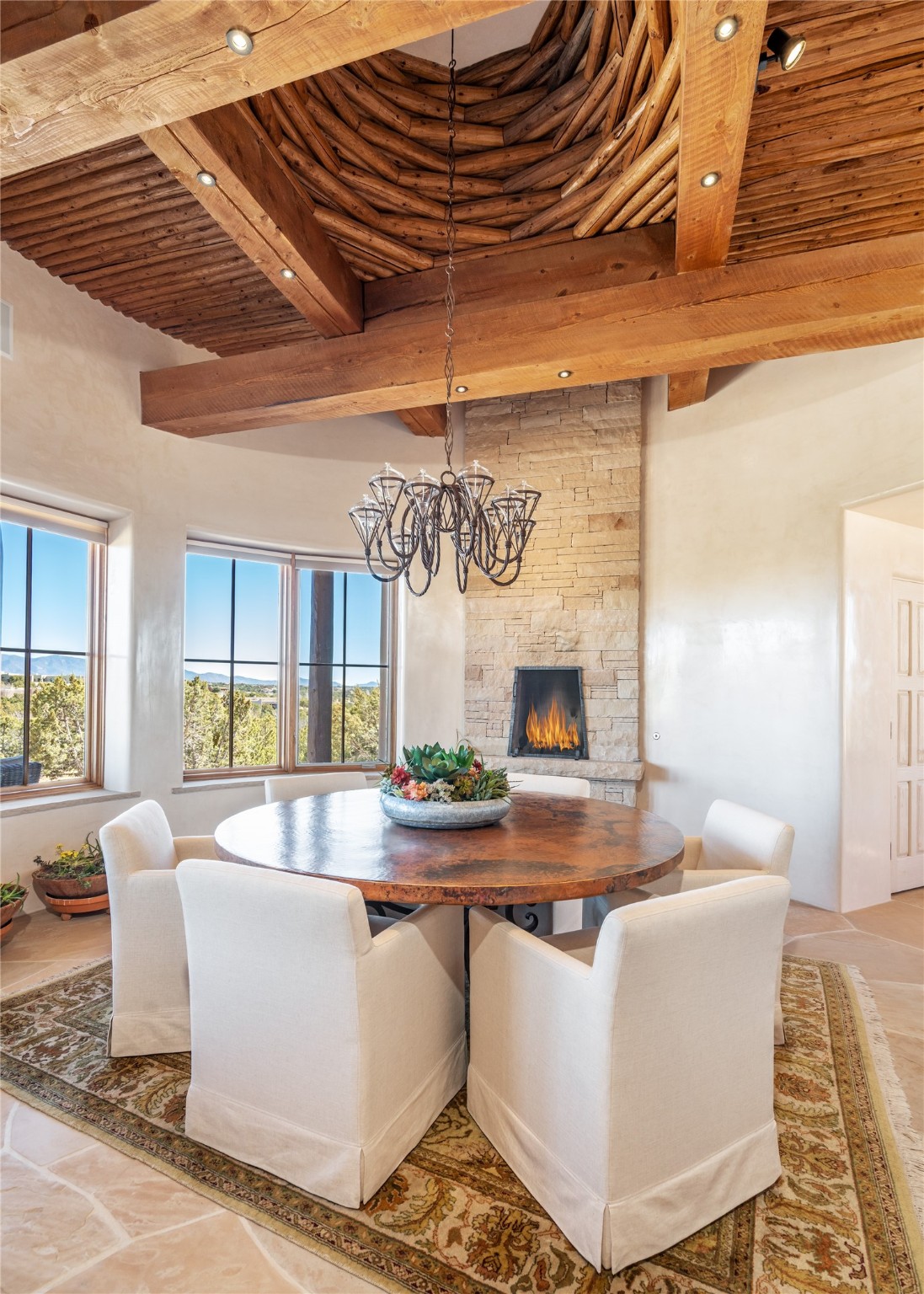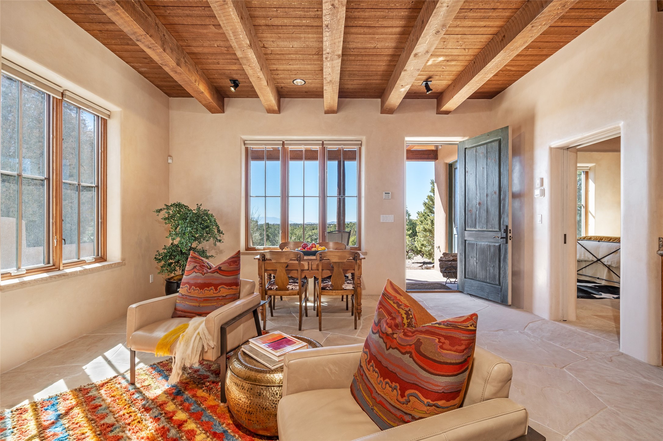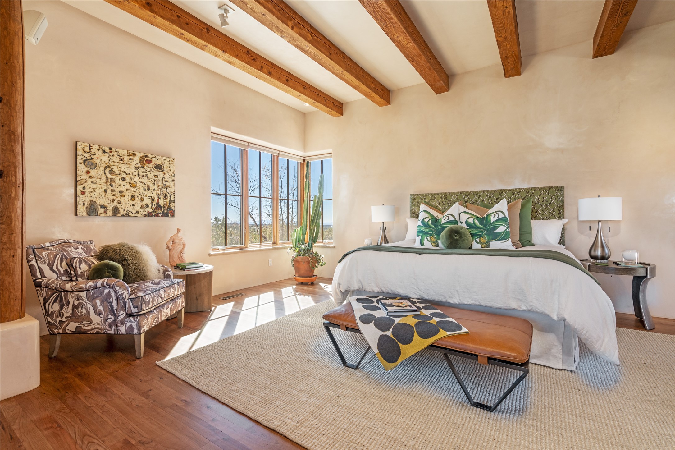 DYNAMIC AND CAPTIVATING MOUNTAIN VIEWS FROM THIS STUNNING LAS CAMPANAS ESTATE SITED HIGH ON A PRIME ELEVATED LOT AT THE END OF A TRANQUIL CUL-DE-SAC. This stunning estate captures the essence of Santa Fe living at its finest. Set on just over three acres, with sweeping views of the Sangre de Cristo mountains from every major room, the property offers a rare sense of privacy and luxe living. A beautifully landscaped courtyard welcomes you, with the soothing sound of water features and striking Anasazi stacked stone columns setting the stage for what awaits you inside. Enter through impressive tall wooden entry doors, and the mountains unfold before you - framed by warm wood and hand-detailed features. Traditional vigas stretch across the ceilings, while soft diamond plaster walls glow in the changing light of the day... With eight fireplaces throughout, the home feels both elegant and deeply comforting. Designed for effortless living and entertaining, the main house features formal and informal living and dining areas, a chef's kitchen with high-end appliances, and expansive counters. The home easily spans inside and outside areas - perfect for soaking in Santa Fe's breathtaking sunsets. The owner's suite is a retreat of its own, opening to the front courtyard and a private covered portal. A cozy sitting room, an oversized spa-like bath, and a custom walk-in closet set the tone for this personal sanctuary. Across the courtyard, the guest house offers a private space with its own bedroom, bath, and all the warmth of the main home. And when the moment calls for something truly special, the rooftop terrace offers a front-row seat to Santa Fe's endless vistas. Tucked just out of sight, the oversized yet discreet three-car garage keeps the home's approach pristine, allowing its timeless beauty to shine. This is more than just a home - it's an experience, a place where traditional Santa Fe charm meets refined comfort in the most effortless way.