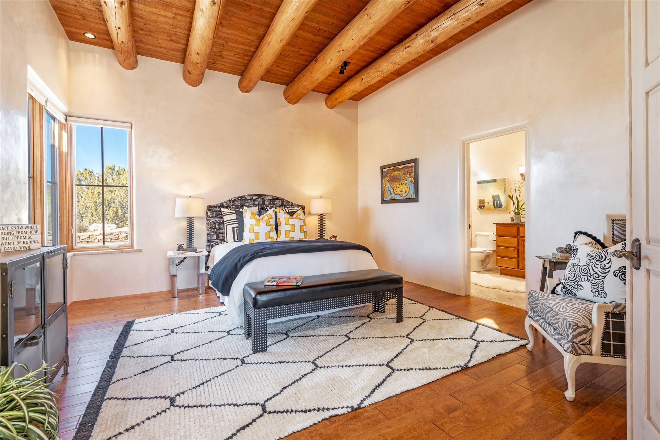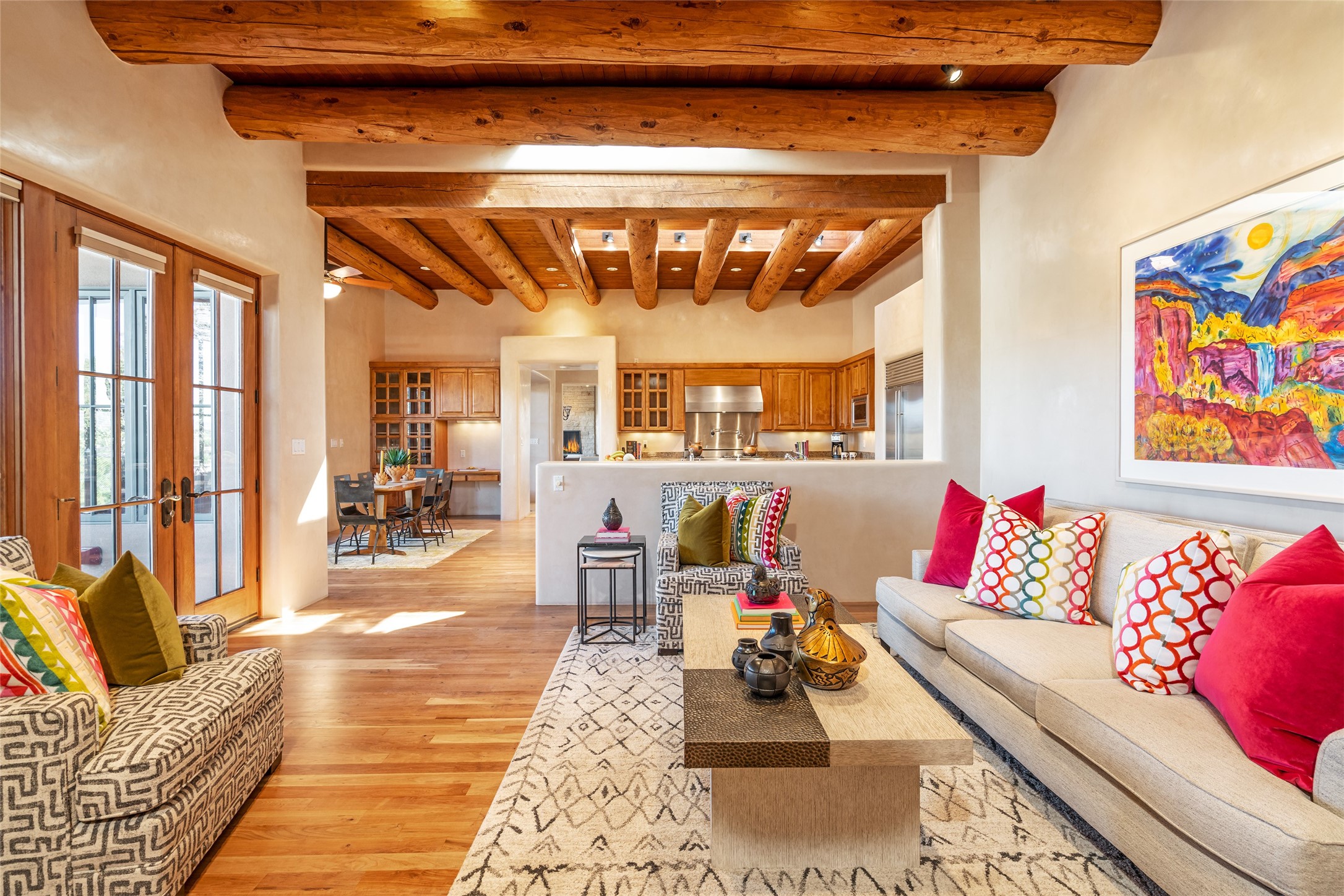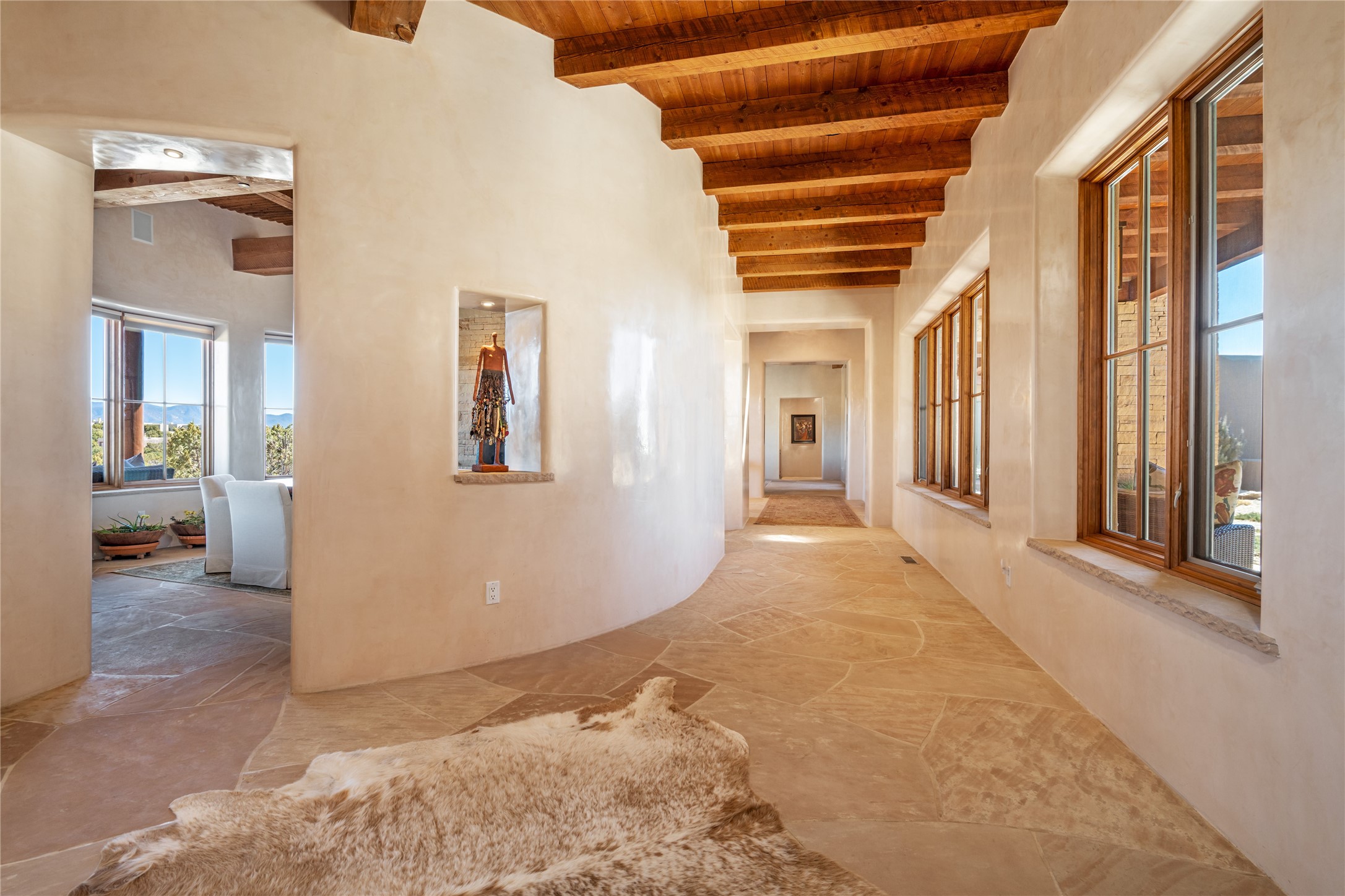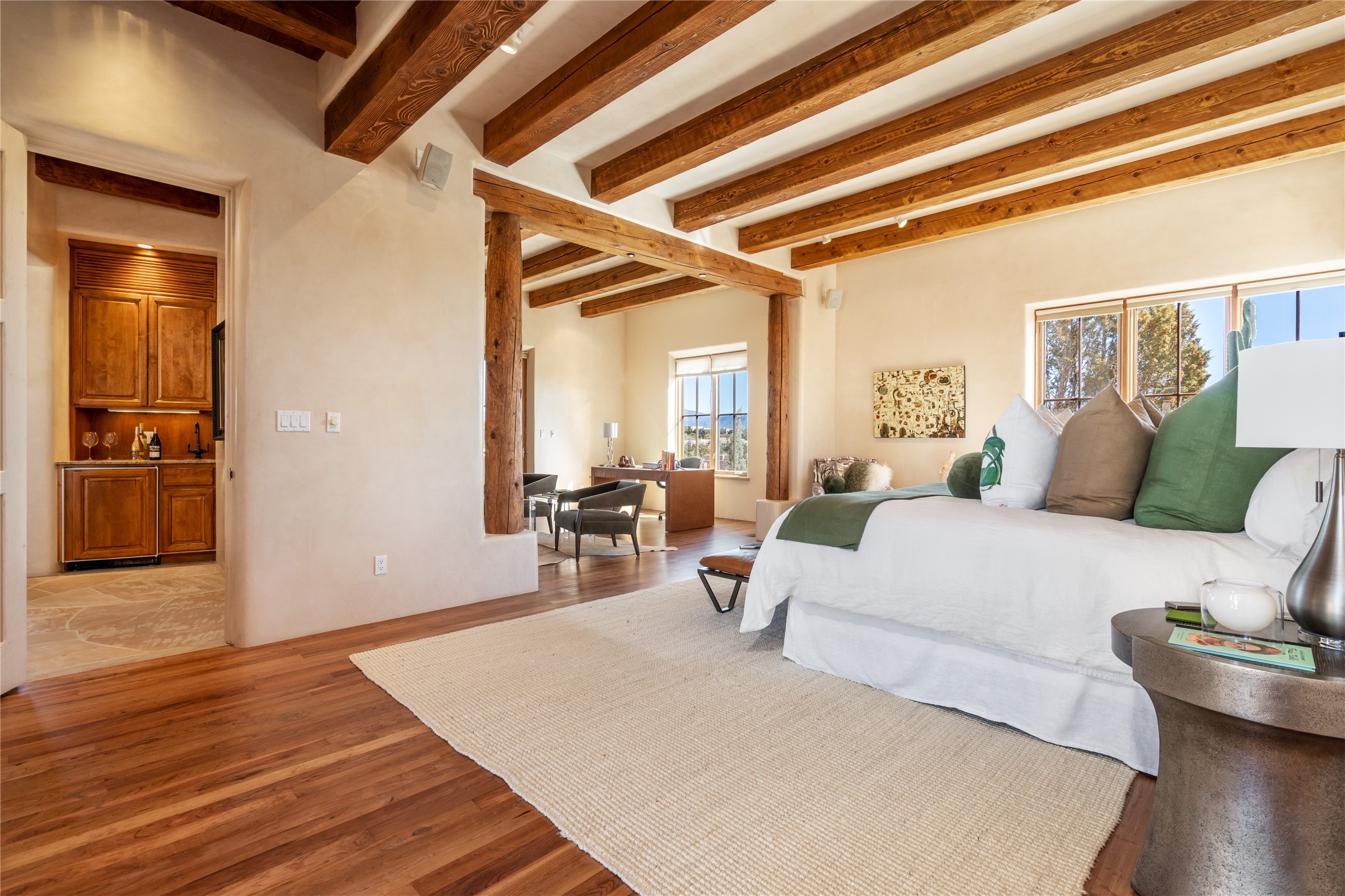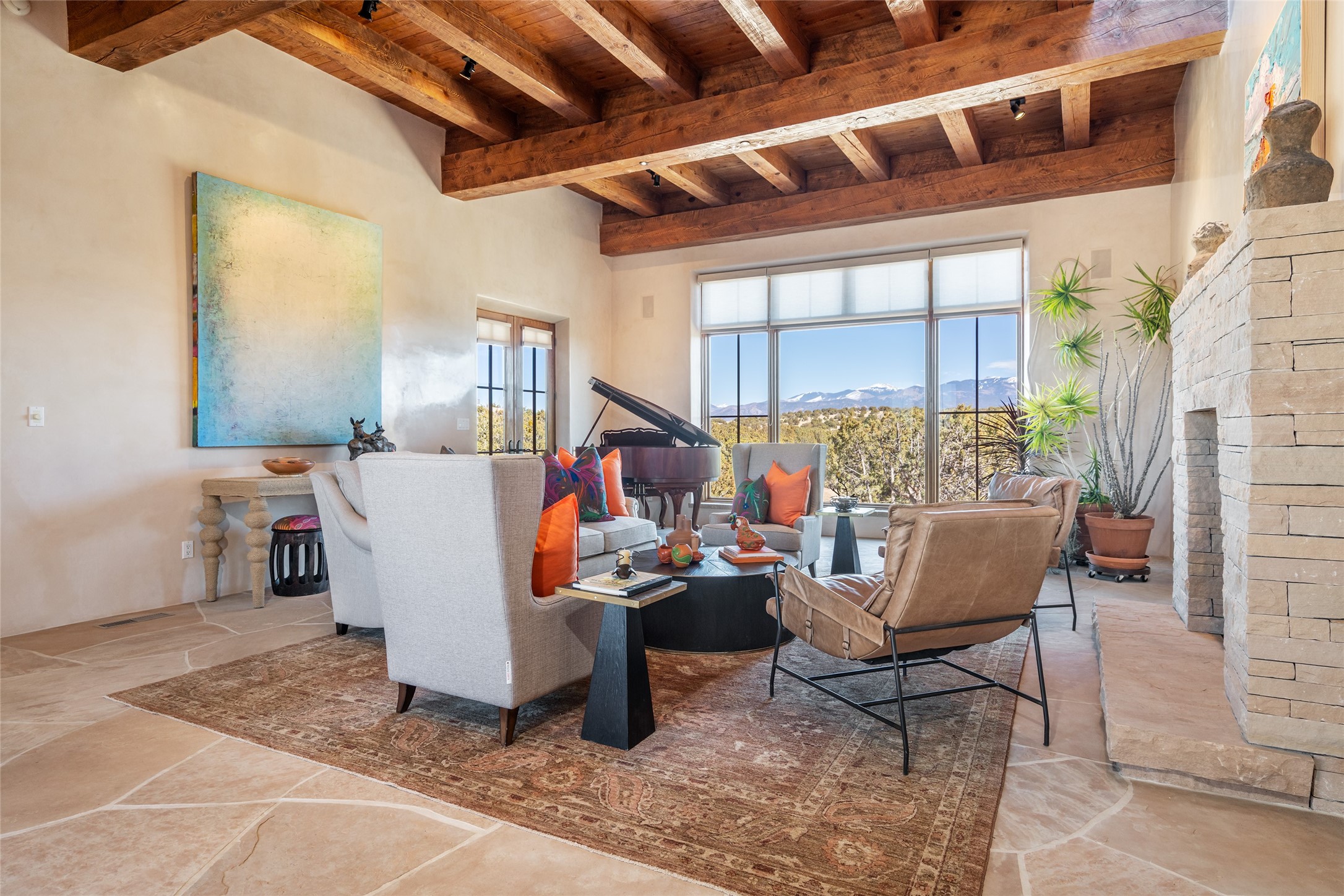 DYNAMIC AND CAPTIVATING MOUNTAIN VIEWS FROM THIS STUNNING LAS CAMPANAS ESTATE SITED HIGH ON A PRIME ELEVATED LOT AT THE END OF A TRANQUIL CUL-DE-SAC. This stunning estate captures the essence of Santa Fe living at its finest. Set on just over three acres, with sweeping views of the Sangre de Cristo mountains from every major room, the property offers a rare sense of privacy and luxe living. A beautifully landscaped courtyard welcomes you, with the soothing sound of water features and striking Anasazi stacked stone columns setting the stage for what awaits you inside. Enter through impressive tall wooden entry doors, and the mountains unfold before you - framed by warm wood and hand-detailed features. Traditional vigas stretch across the ceilings, while soft diamond plaster walls glow in the changing light of the day... With eight fireplaces throughout, the home feels both elegant and deeply comforting. Designed for effortless living and entertaining, the main house features formal and informal living and dining areas, a chef's kitchen with high-end appliances, and expansive counters. The home easily spans inside and outside areas - perfect for soaking in Santa Fe's breathtaking sunsets. The owner's suite is a retreat of its own, opening to the front courtyard and a private covered portal. A cozy sitting room, an oversized spa-like bath, and a custom walk-in closet set the tone for this personal sanctuary. Across the courtyard, the guest house offers a private space with its own bedroom, bath, and all the warmth of the main home. And when the moment calls for something truly special, the rooftop terrace offers a front-row seat to Santa Fe's endless vistas. Tucked just out of sight, the oversized yet discreet three-car garage keeps the home's approach pristine, allowing its timeless beauty to shine. This is more than just a home - it's an experience, a place where traditional Santa Fe charm meets refined comfort in the most effortless way.