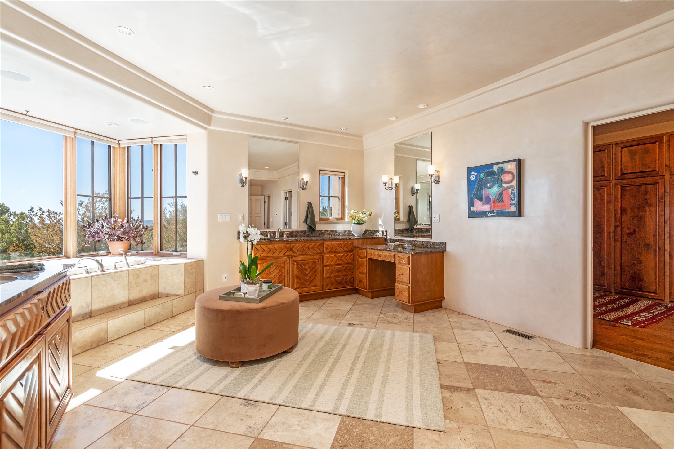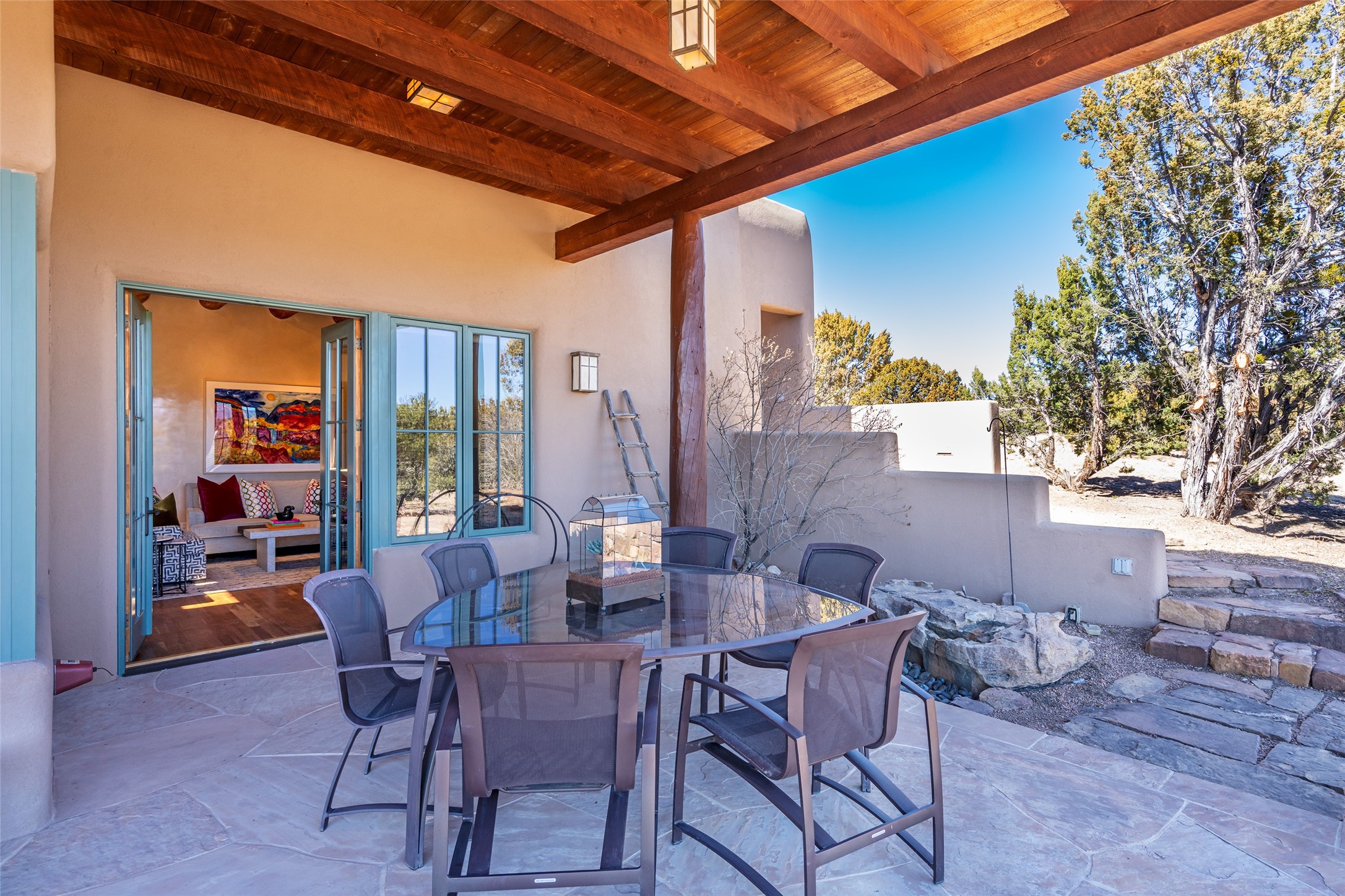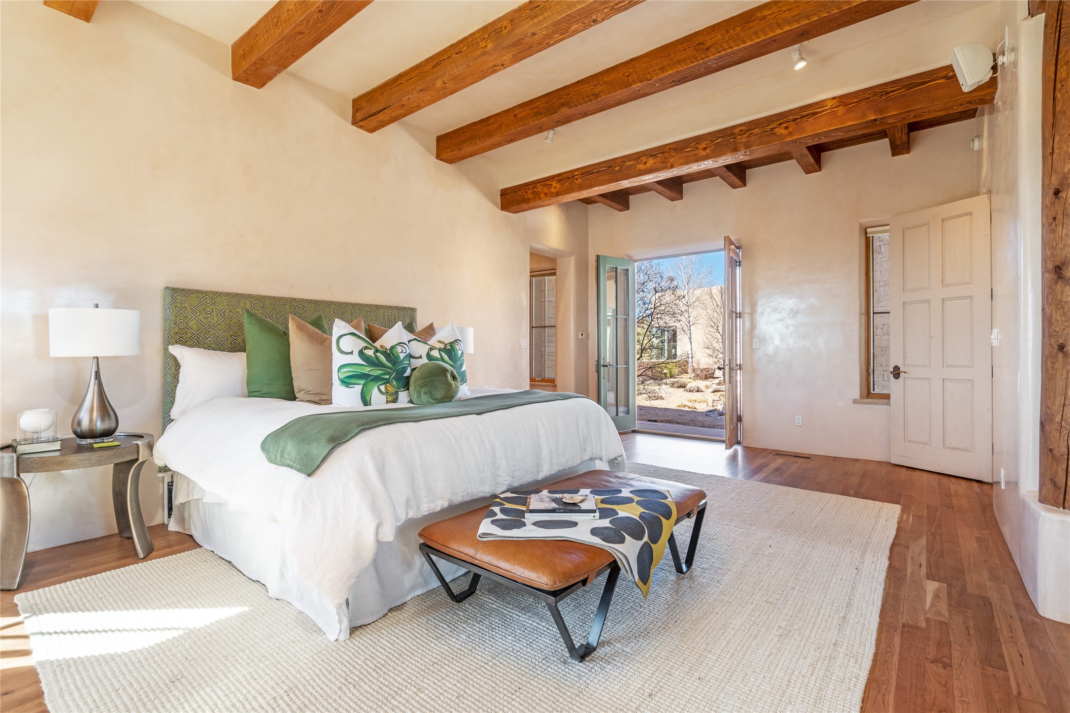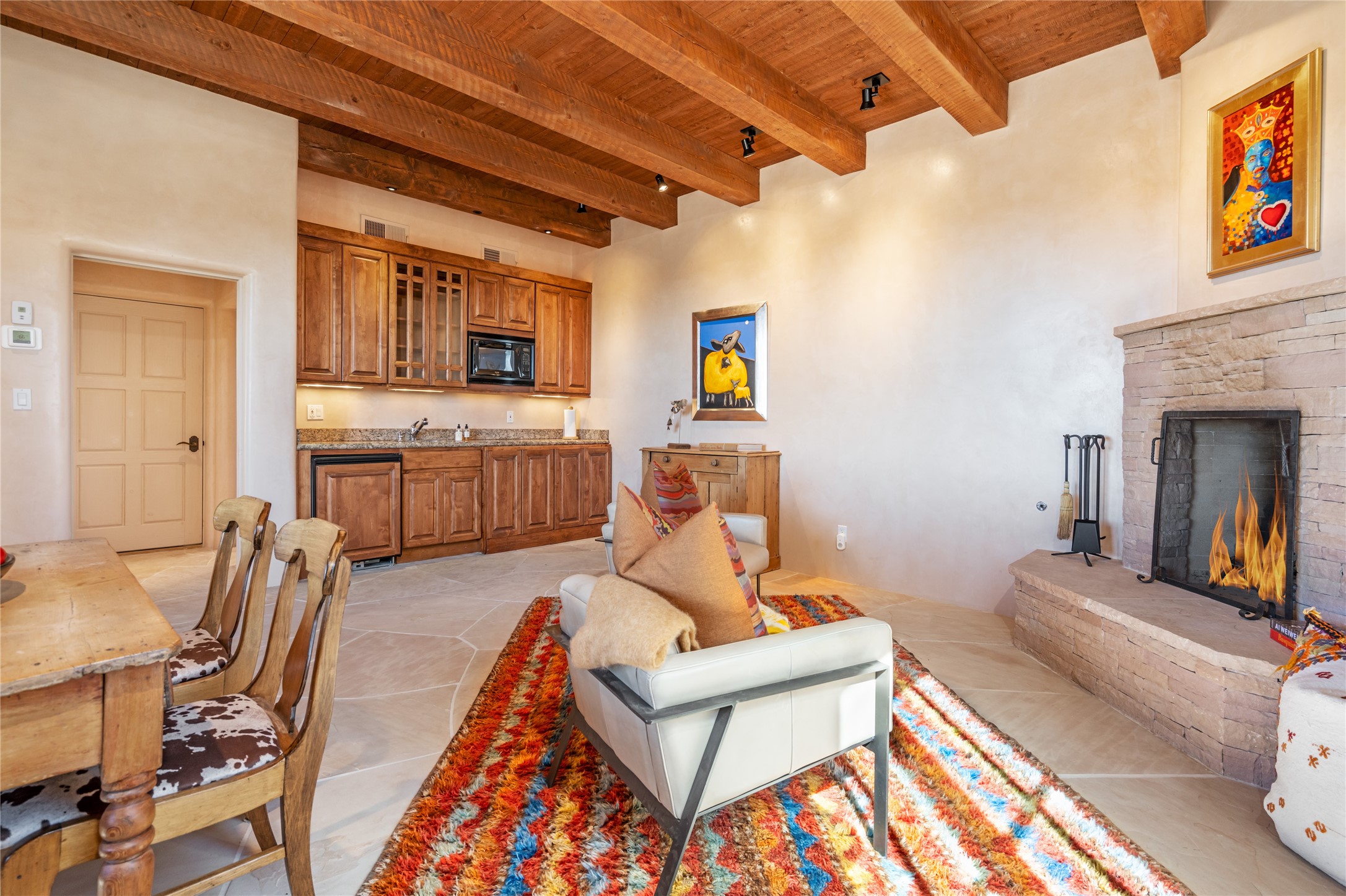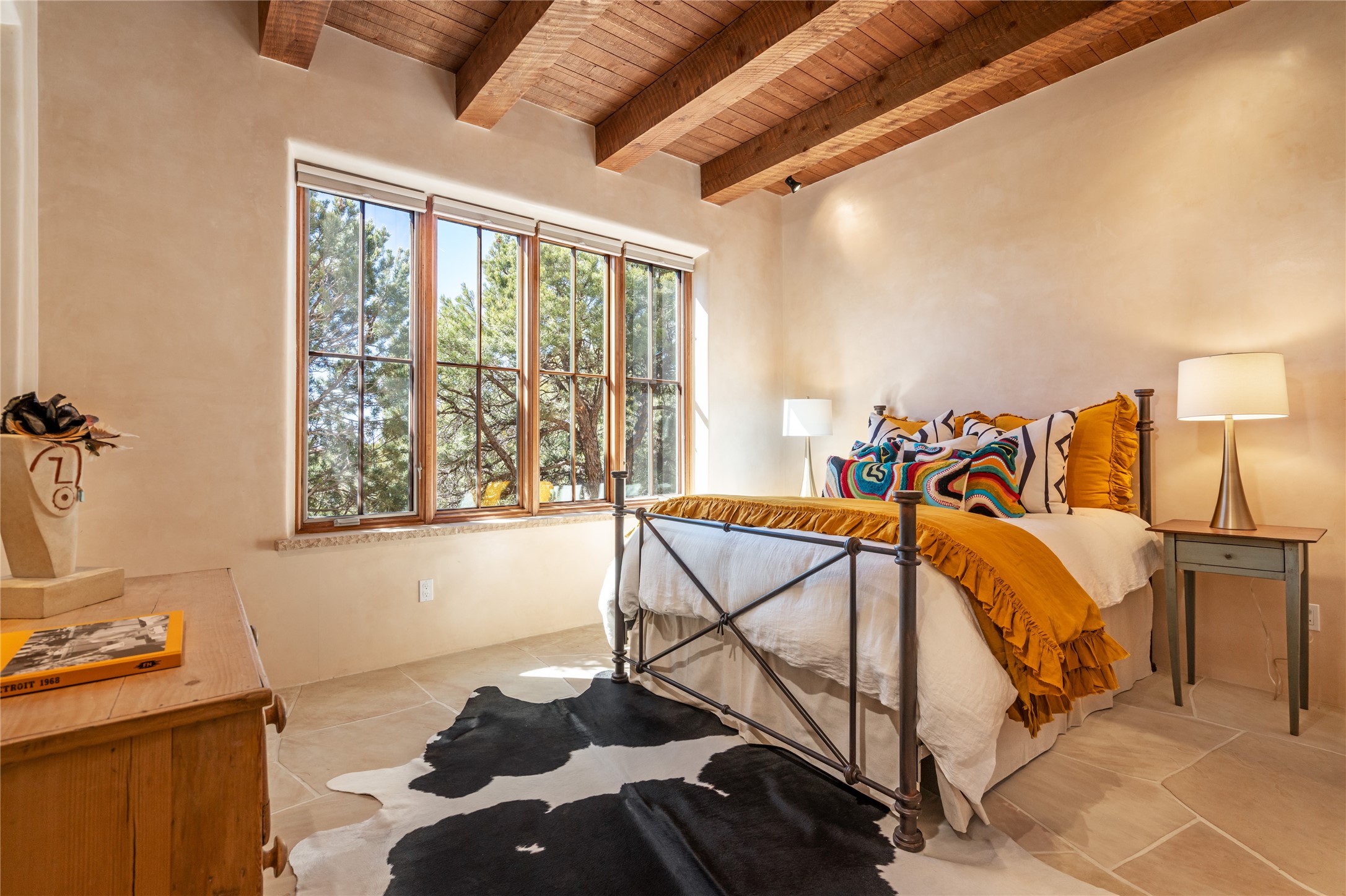 DYNAMIC AND CAPTIVATING MOUNTAIN VIEWS FROM THIS STUNNING LAS CAMPANAS ESTATE SITED HIGH ON A PRIME ELEVATED LOT AT THE END OF A TRANQUIL CUL-DE-SAC. This stunning estate captures the essence of Santa Fe living at its finest. Set on just over three acres, with sweeping views of the Sangre de Cristo mountains from every major room, the property offers a rare sense of privacy and luxe living. A beautifully landscaped courtyard welcomes you, with the soothing sound of water features and striking Anasazi stacked stone columns setting the stage for what awaits you inside. Enter through impressive tall wooden entry doors, and the mountains unfold before you - framed by warm wood and hand-detailed features. Traditional vigas stretch across the ceilings, while soft diamond plaster walls glow in the changing light of the day... With eight fireplaces throughout, the home feels both elegant and deeply comforting. Designed for effortless living and entertaining, the main house features formal and informal living and dining areas, a chef's kitchen with high-end appliances, and expansive counters. The home easily spans inside and outside areas - perfect for soaking in Santa Fe's breathtaking sunsets. The owner's suite is a retreat of its own, opening to the front courtyard and a private covered portal. A cozy sitting room, an oversized spa-like bath, and a custom walk-in closet set the tone for this personal sanctuary. Across the courtyard, the guest house offers a private space with its own bedroom, bath, and all the warmth of the main home. And when the moment calls for something truly special, the rooftop terrace offers a front-row seat to Santa Fe's endless vistas. Tucked just out of sight, the oversized yet discreet three-car garage keeps the home's approach pristine, allowing its timeless beauty to shine. This is more than just a home - it's an experience, a place where traditional Santa Fe charm meets refined comfort in the most effortless way.