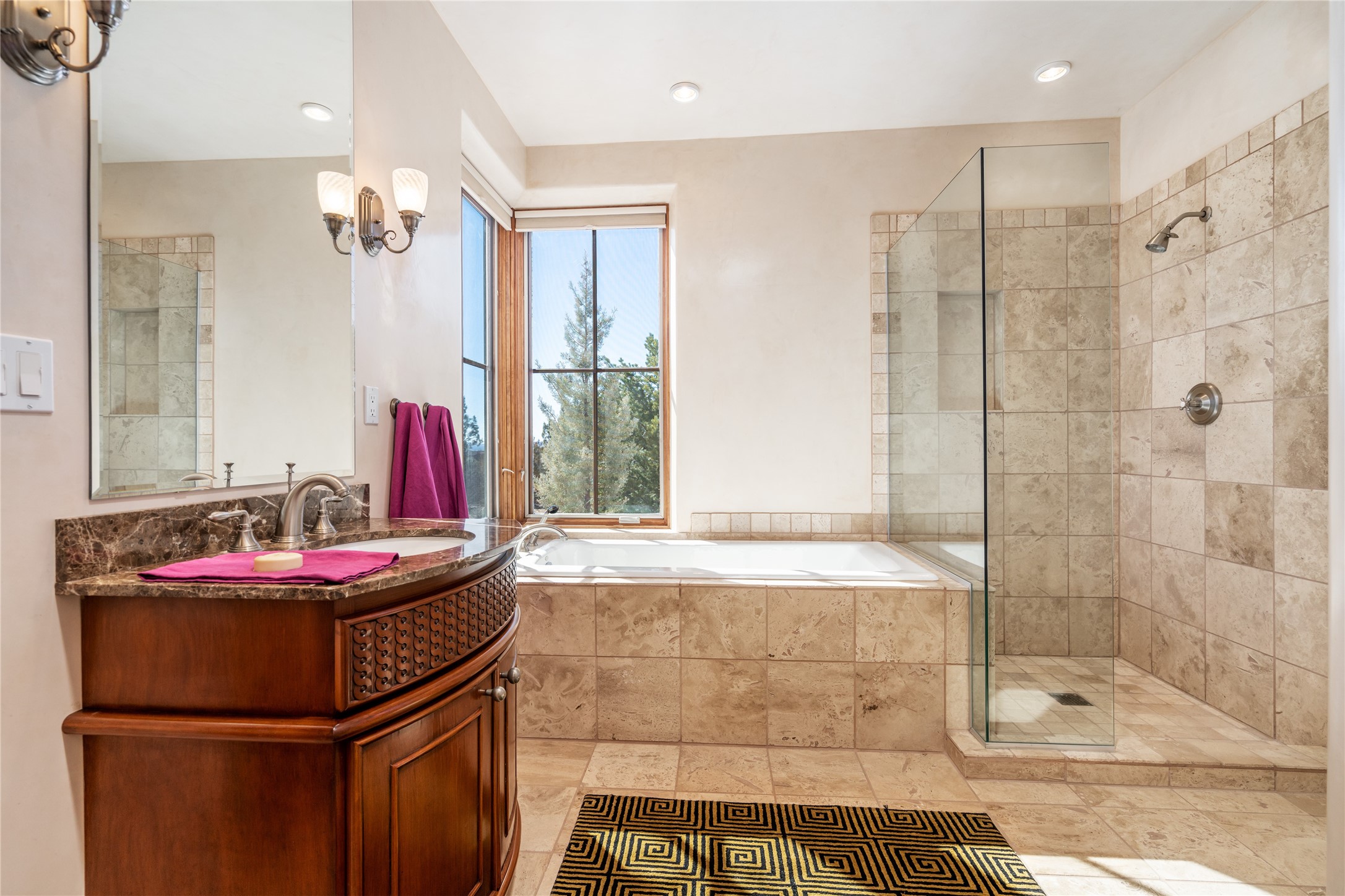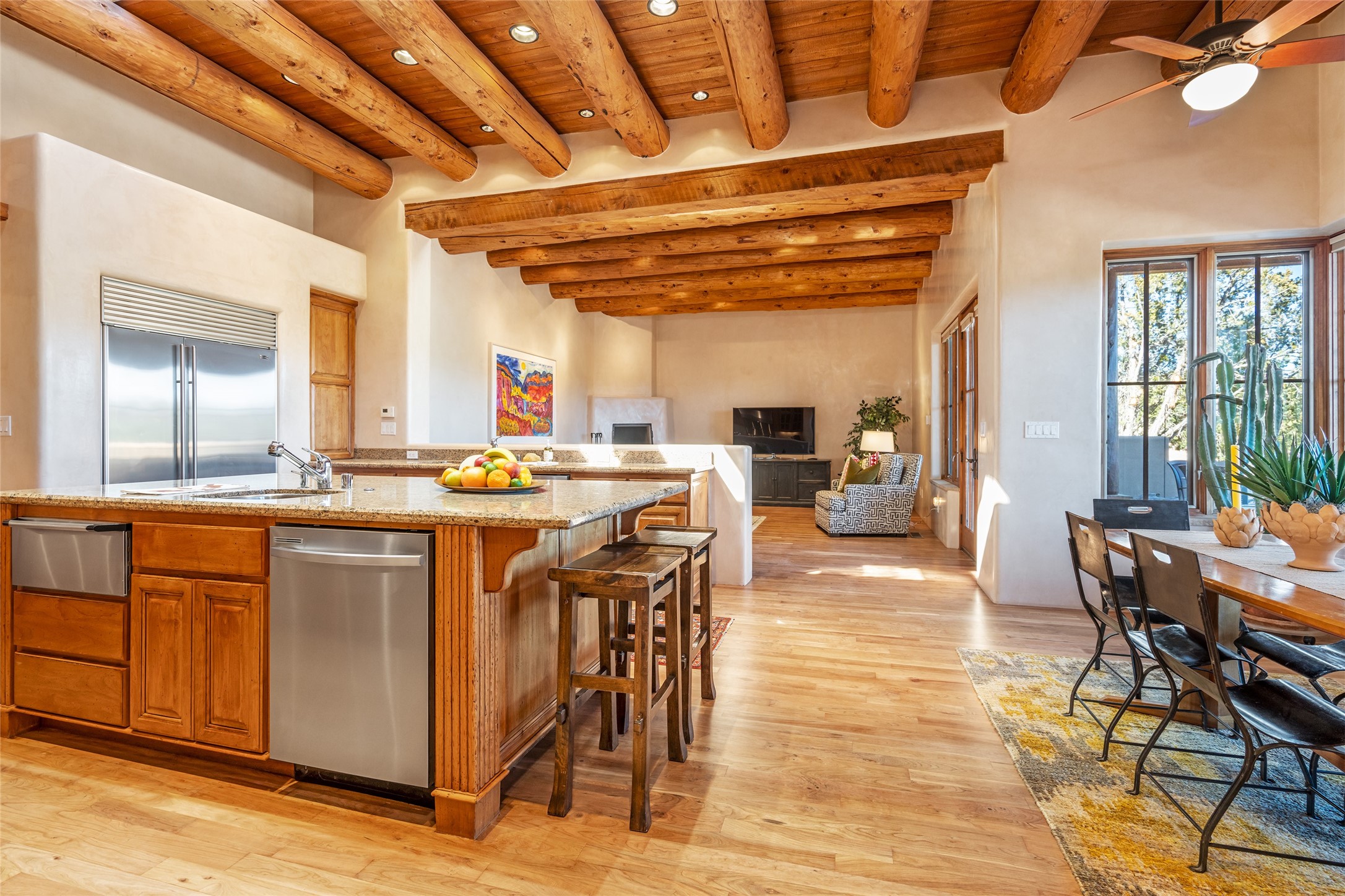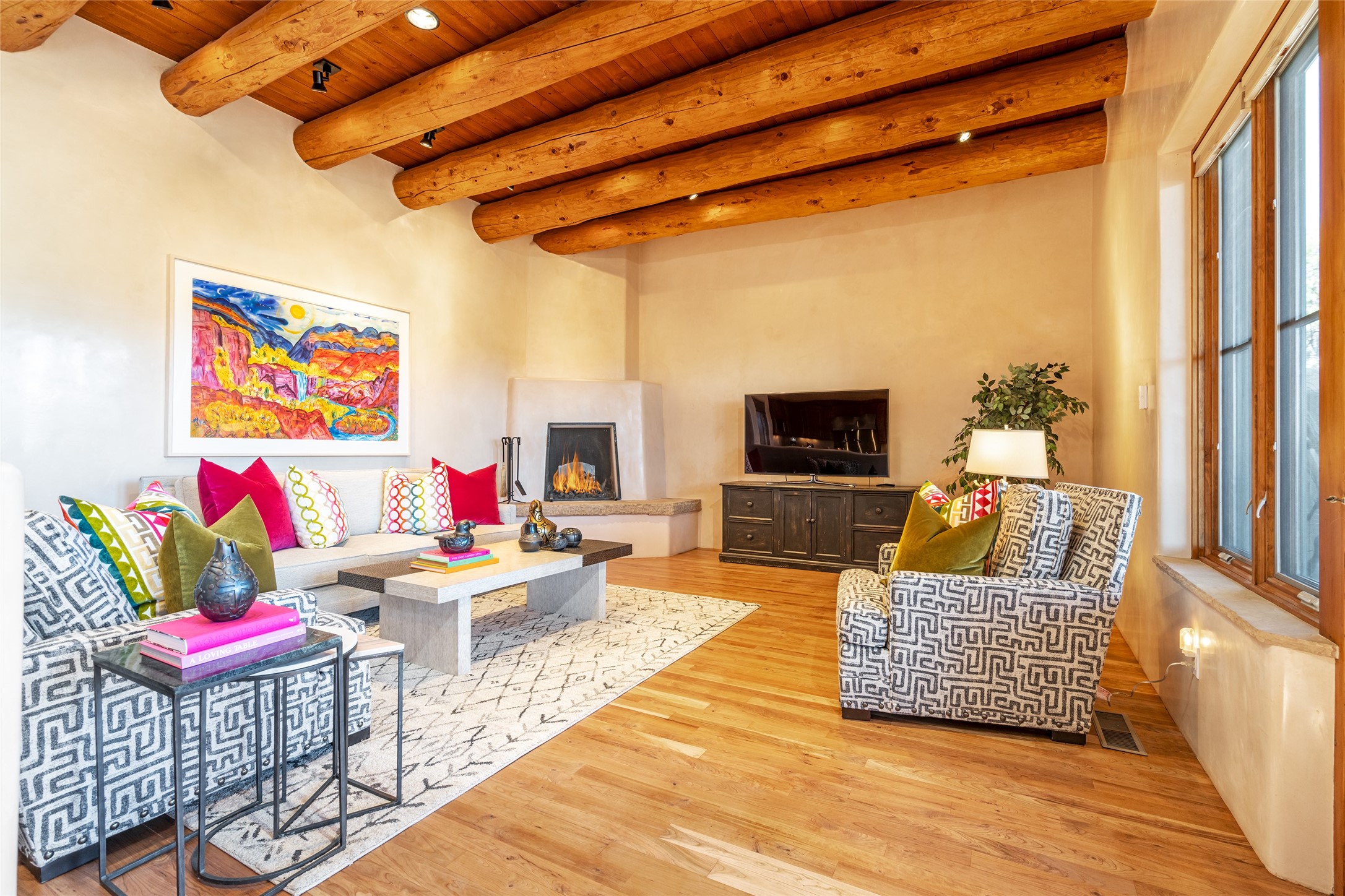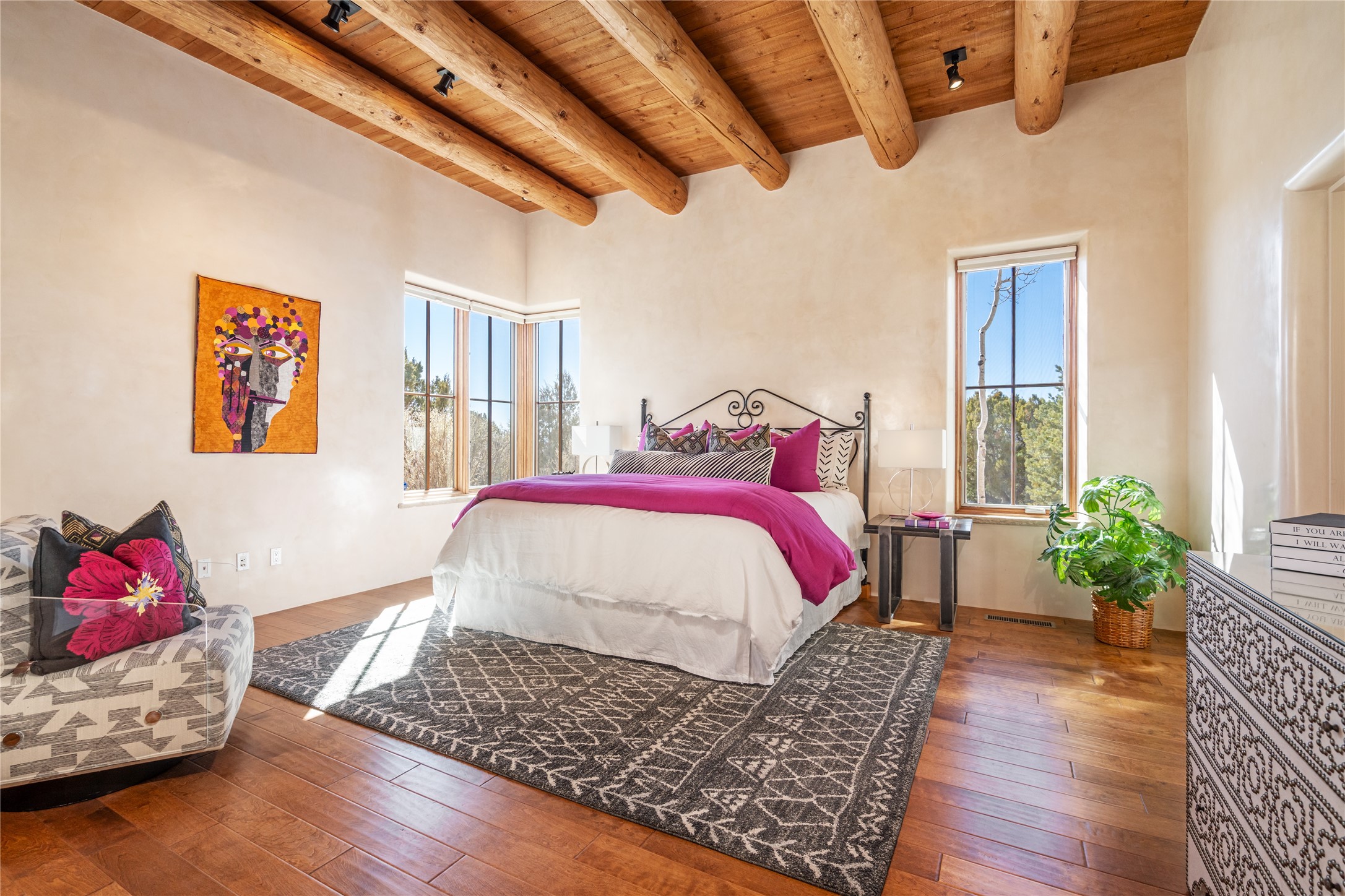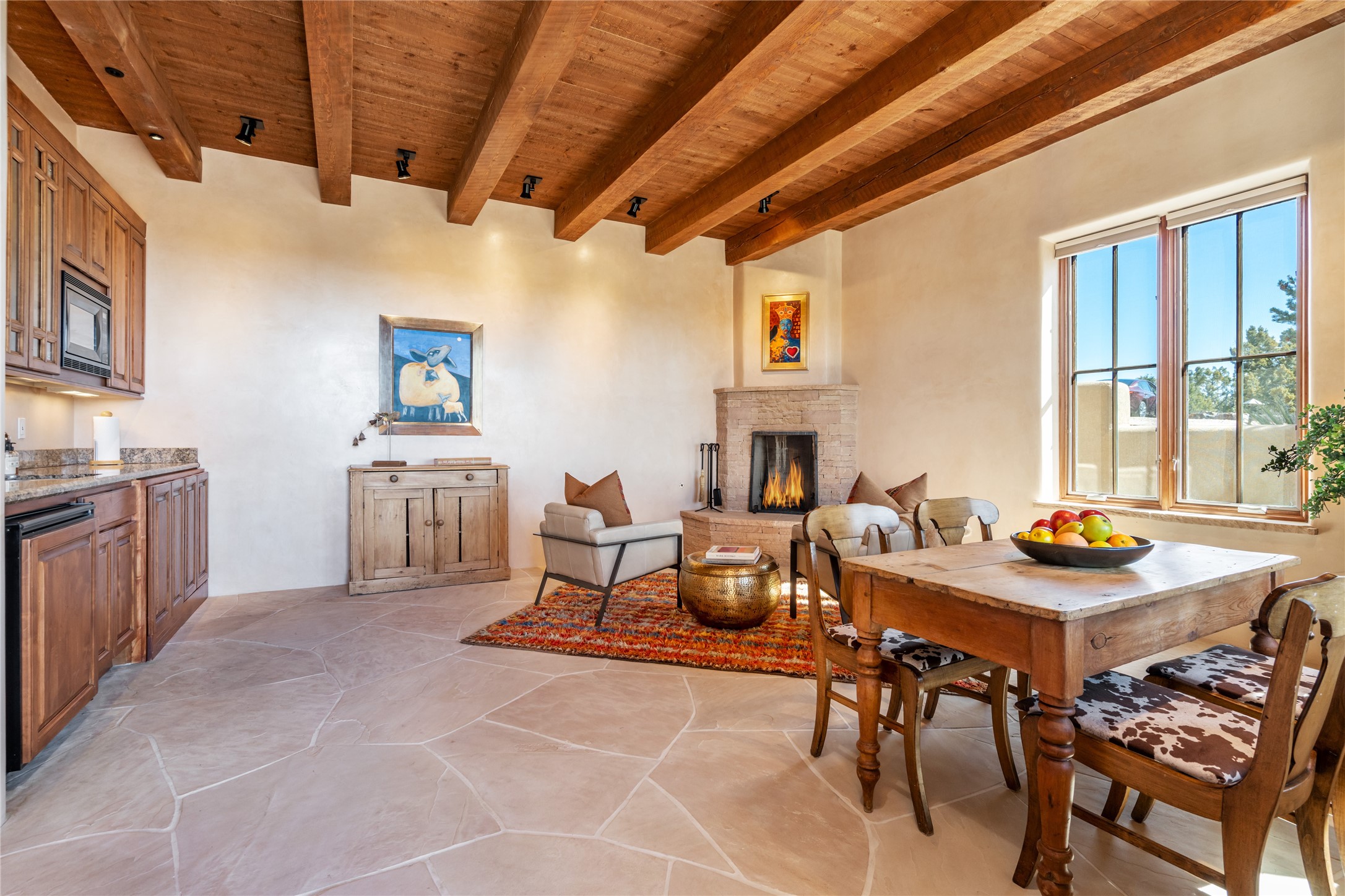 DYNAMIC AND CAPTIVATING MOUNTAIN VIEWS FROM THIS STUNNING LAS CAMPANAS ESTATE SITED HIGH ON A PRIME ELEVATED LOT AT THE END OF A TRANQUIL CUL-DE-SAC. This stunning estate captures the essence of Santa Fe living at its finest. Set on just over three acres, with sweeping views of the Sangre de Cristo mountains from every major room, the property offers a rare sense of privacy and luxe living. A beautifully landscaped courtyard welcomes you, with the soothing sound of water features and striking Anasazi stacked stone columns setting the stage for what awaits you inside. Enter through impressive tall wooden entry doors, and the mountains unfold before you - framed by warm wood and hand-detailed features. Traditional vigas stretch across the ceilings, while soft diamond plaster walls glow in the changing light of the day... With eight fireplaces throughout, the home feels both elegant and deeply comforting. Designed for effortless living and entertaining, the main house features formal and informal living and dining areas, a chef's kitchen with high-end appliances, and expansive counters. The home easily spans inside and outside areas - perfect for soaking in Santa Fe's breathtaking sunsets. The owner's suite is a retreat of its own, opening to the front courtyard and a private covered portal. A cozy sitting room, an oversized spa-like bath, and a custom walk-in closet set the tone for this personal sanctuary. Across the courtyard, the guest house offers a private space with its own bedroom, bath, and all the warmth of the main home. And when the moment calls for something truly special, the rooftop terrace offers a front-row seat to Santa Fe's endless vistas. Tucked just out of sight, the oversized yet discreet three-car garage keeps the home's approach pristine, allowing its timeless beauty to shine. This is more than just a home - it's an experience, a place where traditional Santa Fe charm meets refined comfort in the most effortless way.