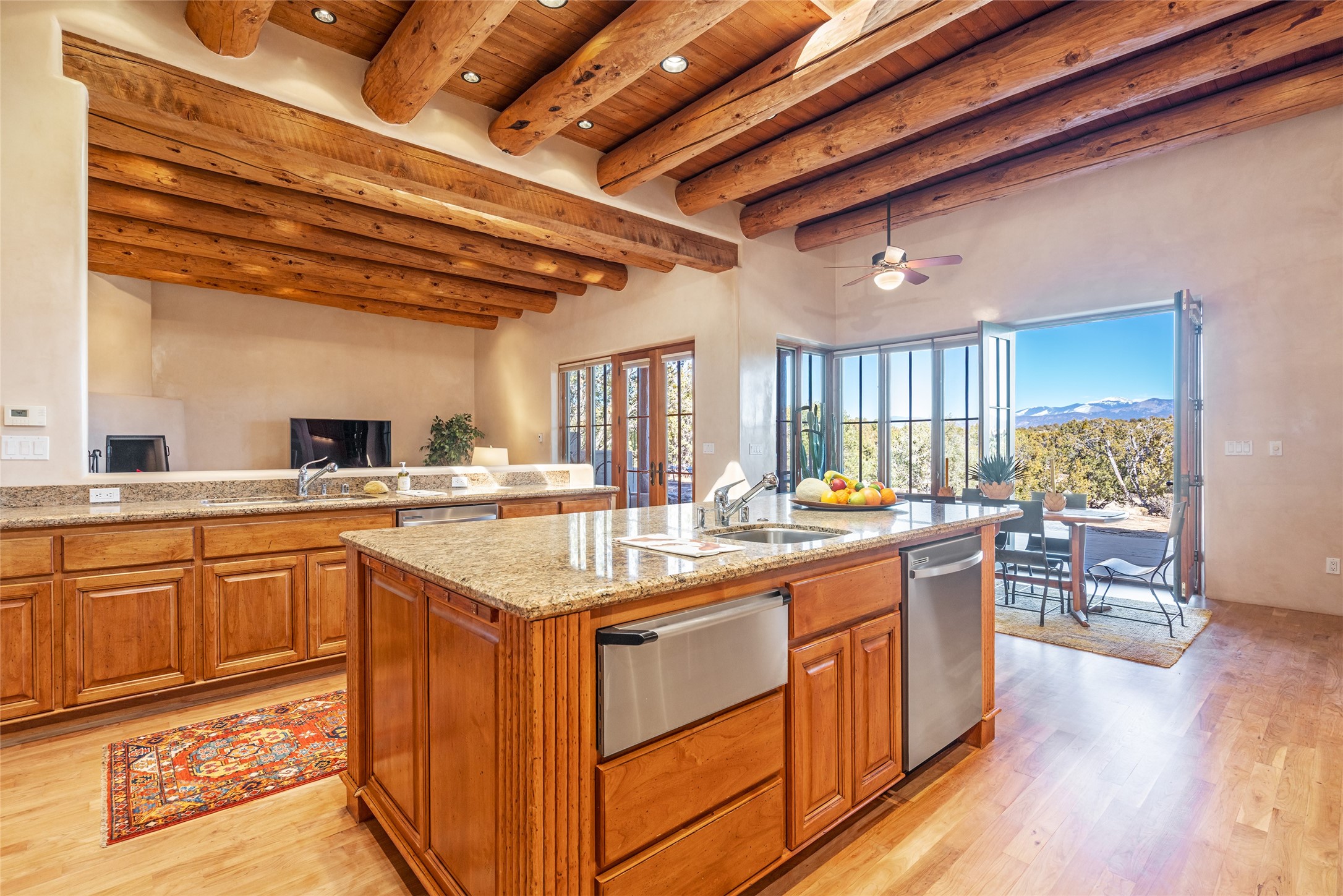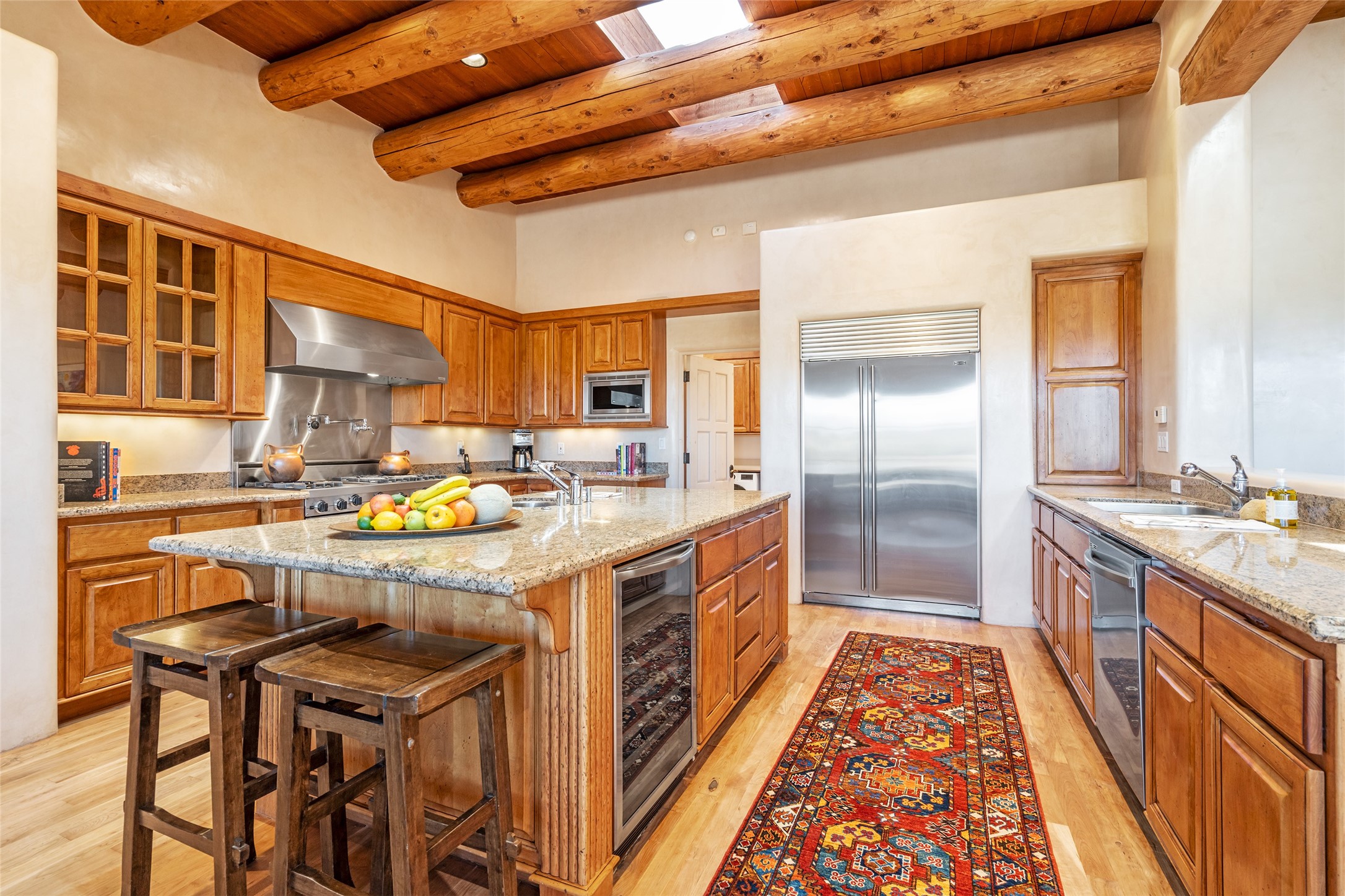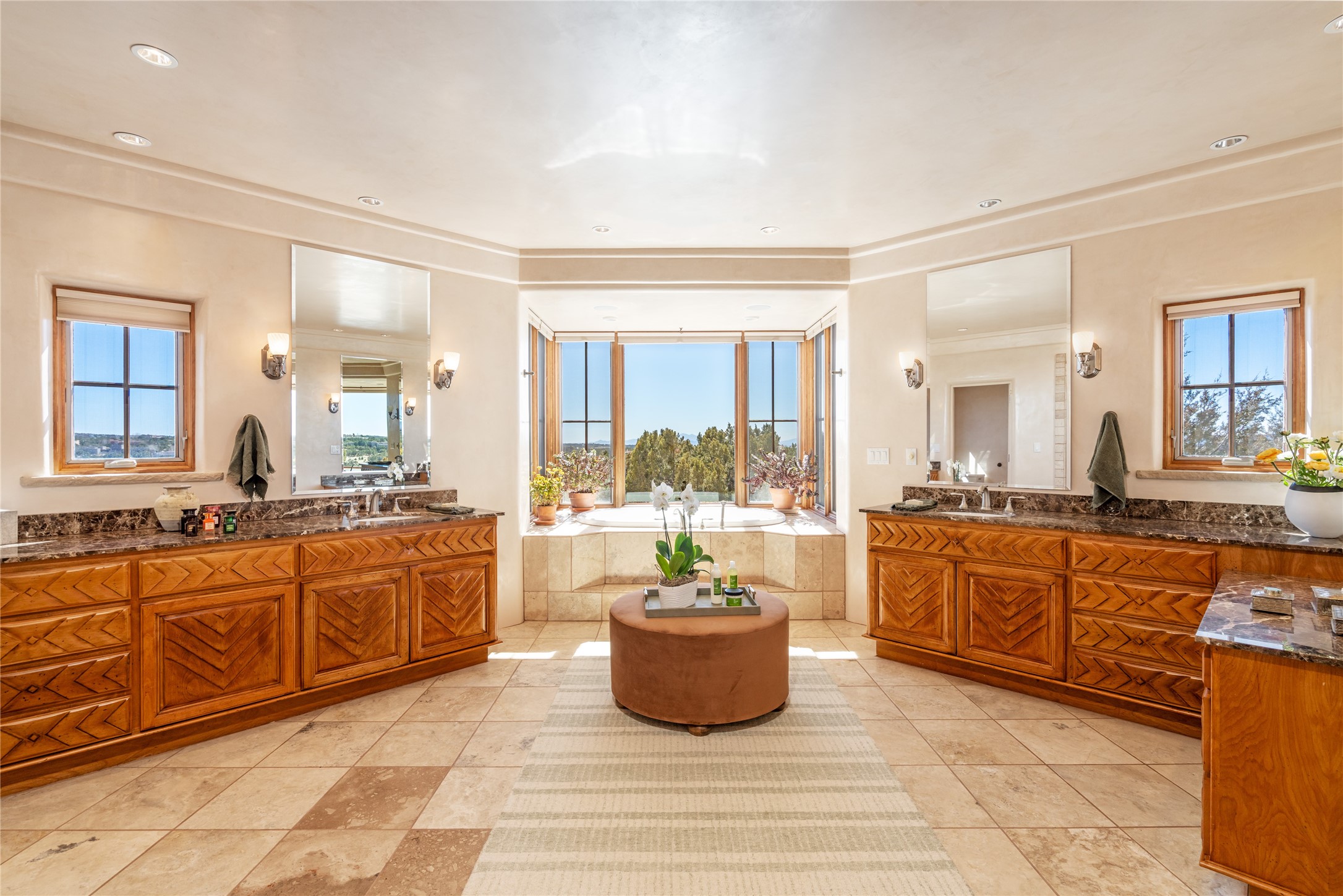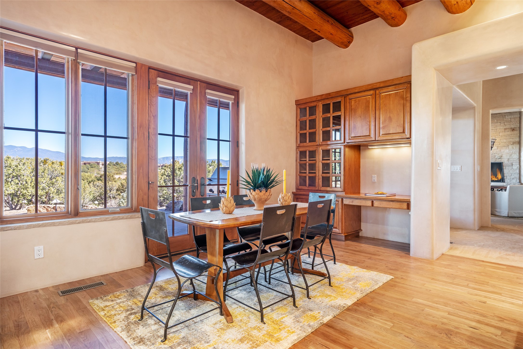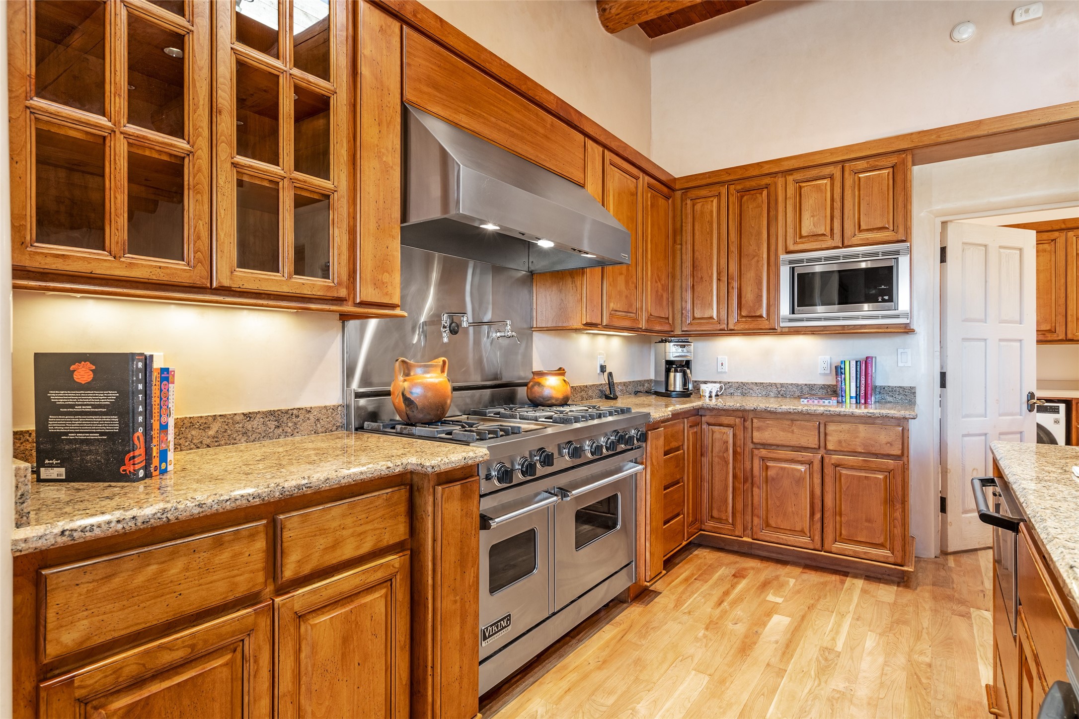 DYNAMIC AND CAPTIVATING MOUNTAIN VIEWS FROM THIS STUNNING LAS CAMPANAS ESTATE SITED HIGH ON A PRIME ELEVATED LOT AT THE END OF A TRANQUIL CUL-DE-SAC. This stunning estate captures the essence of Santa Fe living at its finest. Set on just over three acres, with sweeping views of the Sangre de Cristo mountains from every major room, the property offers a rare sense of privacy and luxe living. A beautifully landscaped courtyard welcomes you, with the soothing sound of water features and striking Anasazi stacked stone columns setting the stage for what awaits you inside. Enter through impressive tall wooden entry doors, and the mountains unfold before you - framed by warm wood and hand-detailed features. Traditional vigas stretch across the ceilings, while soft diamond plaster walls glow in the changing light of the day... With eight fireplaces throughout, the home feels both elegant and deeply comforting. Designed for effortless living and entertaining, the main house features formal and informal living and dining areas, a chef's kitchen with high-end appliances, and expansive counters. The home easily spans inside and outside areas - perfect for soaking in Santa Fe's breathtaking sunsets. The owner's suite is a retreat of its own, opening to the front courtyard and a private covered portal. A cozy sitting room, an oversized spa-like bath, and a custom walk-in closet set the tone for this personal sanctuary. Across the courtyard, the guest house offers a private space with its own bedroom, bath, and all the warmth of the main home. And when the moment calls for something truly special, the rooftop terrace offers a front-row seat to Santa Fe's endless vistas. Tucked just out of sight, the oversized yet discreet three-car garage keeps the home's approach pristine, allowing its timeless beauty to shine. This is more than just a home - it's an experience, a place where traditional Santa Fe charm meets refined comfort in the most effortless way.
